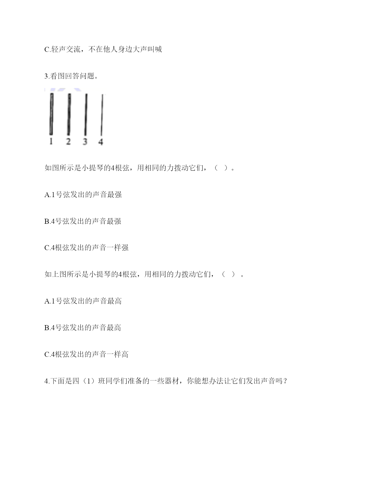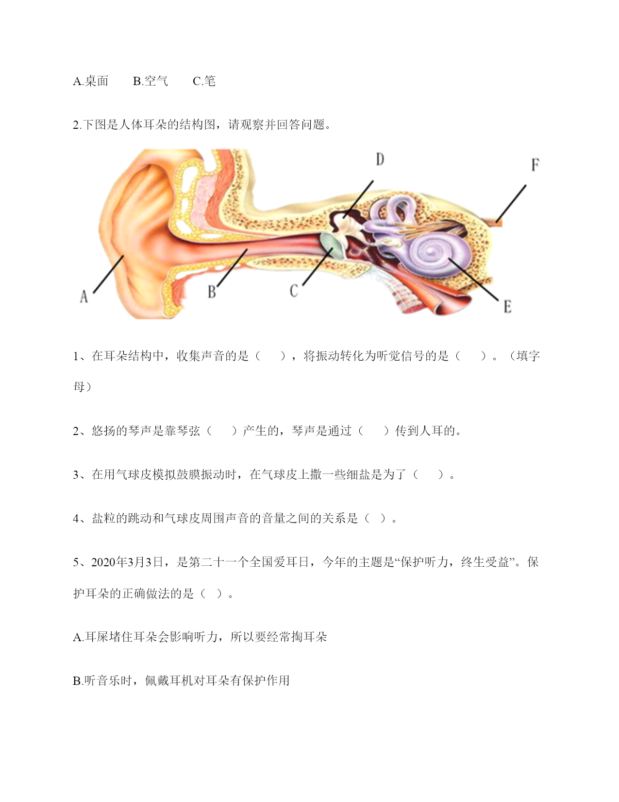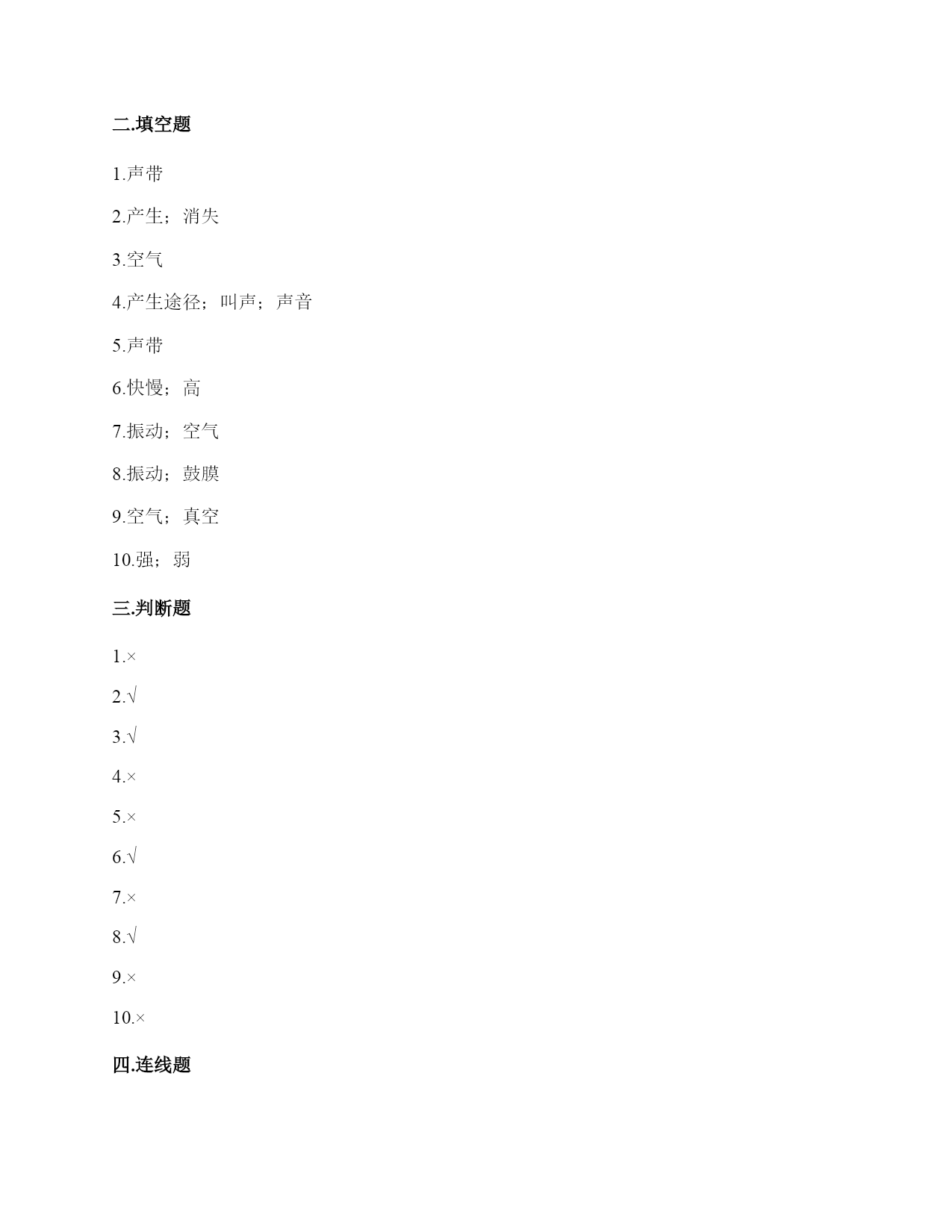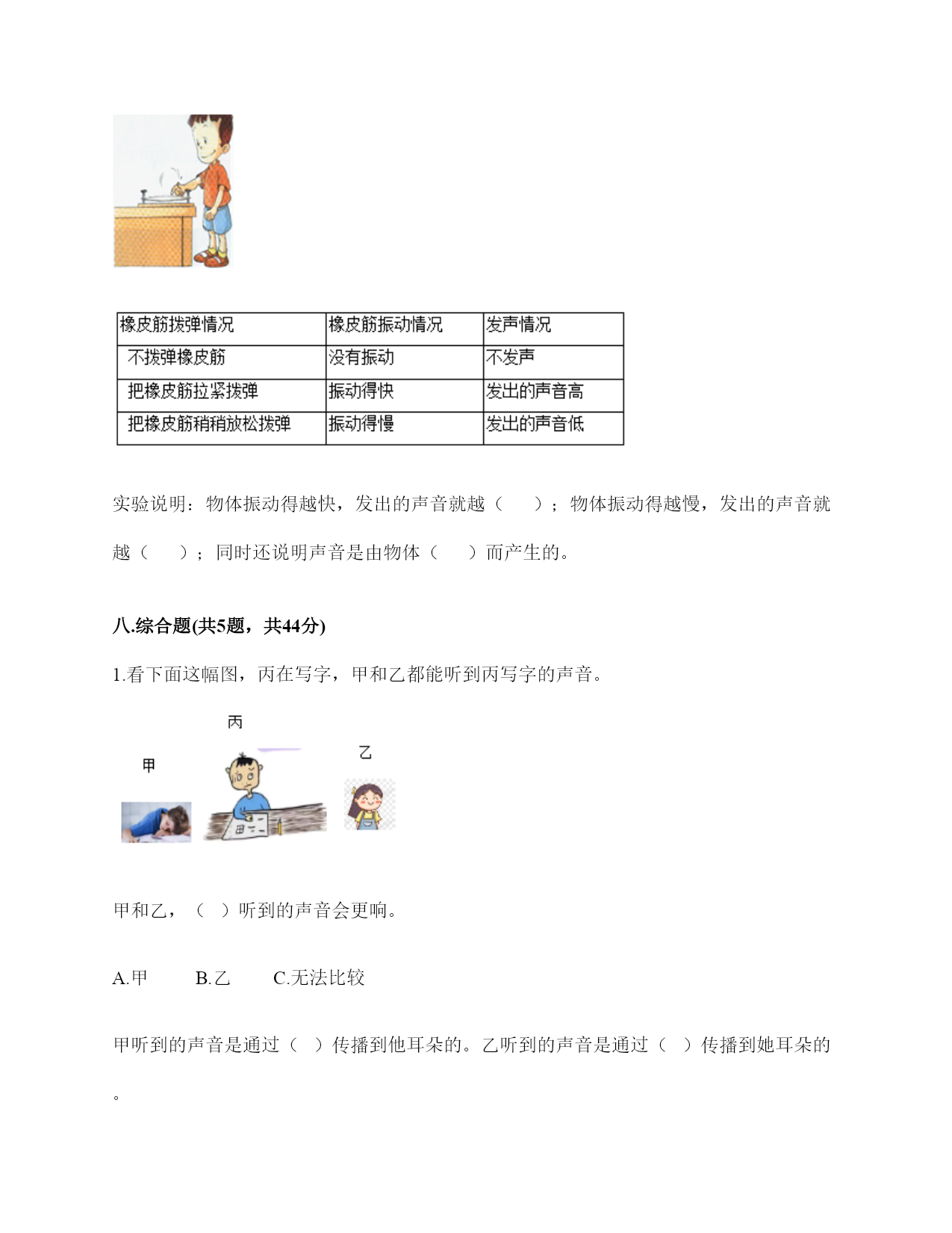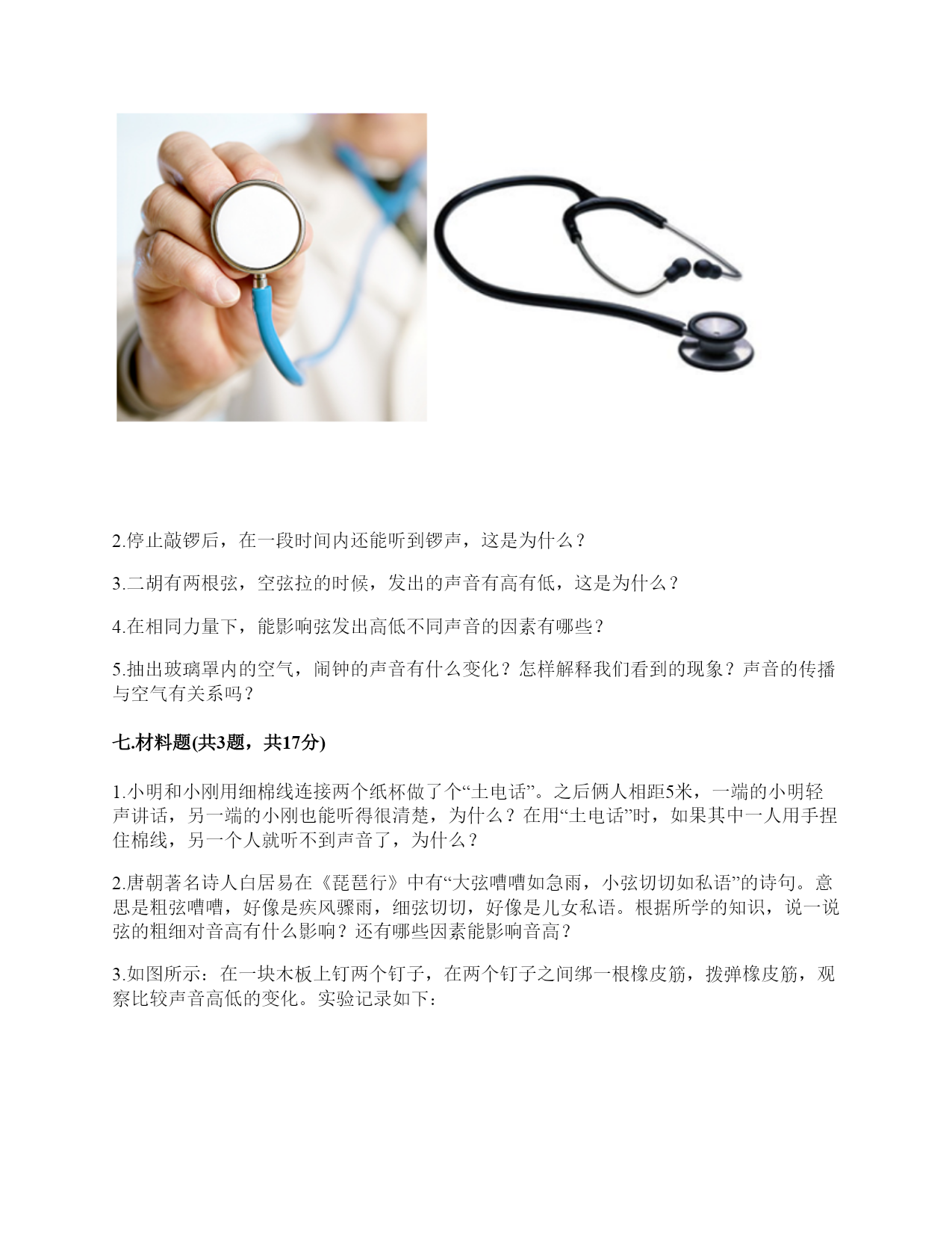 小学科学《声音》练习题一.选择题(共10题,共20分)1.电影《铁道游击队》中的队员们为了抗日,经常将耳朵贴在钢轨上,这样做主要是()。A.卧倒,防止敌人发现自己B.防止敌人的机枪扫射C.因为声音在钢轨中传播比在空气中快,能提前听到日军火车到来2.利用棉线和纸杯制作的“土电话”,声音主要是通过()从话简传到听筒的。A.棉线B.空气C.话筒3.古琴是我国历史悠久的乐器,由7根长短相同、粗细不同的弦组成。小雅弹古琴时,要使它发出的声音更响一些,可以()。A.弹更粗的琴弦B.弹得更用力一些C.轻轻地弹4.下列物质中,声音在()中传播速度最快。A.铁轨B.大海C.空气5.演奏家停止拨琴弦,琴声还能持续产生,主要原因是()。A.琴弦还在振动B.人们还沉浸在音乐中C.空气能传播声音6.下列关于声音说法正确的是()。A.敲鼓时鼓面振动幅度大,声音越高B.乐器振动的越快,声音越强C.蚊子发出的声音比牛发出的声音音量弱7.我们能够发出声音的器官是()。A.舌B.声带C.鳃8.下列关于声音传播的叙述,正确的是()。A.老师讲课的声音传播到我们的耳朵中,没有依靠任何物质B.真空中也能传声C.敲锣时,要使锣停止发声,可用手使劲按住锣面不让其振动9.把击打过的音叉轻轻放在水面上,可以看到水的波纹从振动的音叉开始()传播。A.只向上下B.只向左右C.向四周10.下面几种做法中,()不能发出声音。A.敲击鼓面B.弹奏钢琴C.按压皮筋二.填空题(共10题,共36分)1.我们的发声器官是()。2.大量事实证明:声音因物体振动而()。振动停止,声音()。3.上课时,老师的声音是通过()(填“固体”或“空气”)传入同学们的耳中的。4.周围的声音根据()的不同,可以分为动物的()、自然界的)()、人类生产生活发出的声音。5.在我们的周围,声音无处不在。我们的喉咙有一个能发出声音、控制自如的器官是()。6.音高是由物体的振动的()决定的,物体振动得动的越快音高越()。7.鼓声是由于鼓面的()产生的;我们听见的鼓声是通过()传播的。8.物体的振动带动了周围空气的(),空气的振动又引起()的振动。9.()是传播声音的重要物质,在()中声音不能传播。10.声音的强弱可以用音量来描述。物体振动的幅度越大,声音越();物体振动的幅度越小,声音越()。三.判断题(共10题,共20分)1.敲击过的音叉接触水面,水面出现许多波纹,说明声音以波的形式传播。()2.弦的音高与制作材料有关。()3.同一根橡皮筋,振动幅度大时,发出的声音响,就是发出的声音强。()4.下雨声属于人类生活发出的声音。()5.音高和音量没有什么区别。()6.电视中悦耳动听的钢琴声,钢琴簧片振动发出的声音。()7.我们用击打过的音叉轻轻触及水面时,看到音叉的振动引起了水的直线运动。()8.被敲打后的音叉接触到水面后会水花飞溅,是因为音叉在振动。()9.小张说“昨晚的雷声很大”,这是对雷声音高的描述。()10.外耳包括耳道和鼓膜两个部分。()四.连线题(共1题,共5分)1.把下列方法与它们是否能使物体发声连接。敲击锣面弯曲钢尺拉伸橡皮筋按压鼓面拨动橡皮筋能够发声不能发声五.填表题(共2题,共22分)1.猜想:声音强弱与物体振动幅度有关,振幅越大,声音越();物体振幅越小,声音越()。实验器材:钢尺,桌子改变的条件:()不改变的条件:()填写表格。实验结论是什么?2.根据你对耳朵的了解,完成下表。六.简答题(共5题,共26分)1.图中是一种常见的听诊器。人体内微弱声音为什么能清晰地传递到医生的耳朵中?2.停止敲锣后,在一段时间内还能听到锣声,这是为什么?3.二胡有两根弦,空弦拉的时候,发出的声音有高有低,这是为什么?4.在相同力量下,能影响弦发出高低不同声音的因素有哪些?5.抽出玻璃罩内的空气,闹钟的声音有什么变化?怎样解释我们看到的现象?声音的传播与空气有关系吗?七.材料题(共3题,共17分)1.小明和小刚用细棉线连接两个纸杯做了个“土电话”。之后俩人相距5米,一端的小明轻声讲话,另一端的小刚也能听得很清楚,为什么?在用“土电话”时,如果其中一人用手捏住棉线,另一个人就听不到声音了,为什么?2.唐朝著名诗人白居易在《琵琶行》中有“大弦嘈嘈如急雨,小弦切切如私语”的诗句。意思是粗弦嘈嘈,好像是疾风骤雨,细弦切切,好像是儿女私语。根据所学的知识,说一说弦的粗细对音高有什么影响?还有哪些因素能影响音高?3.如图所示:在一块木板上钉两个钉子,在两个钉子之间绑一根橡皮筋,拨弹橡皮筋,观察比较声音高低的变化。实验记录如下:实验说明:物体振动得越快,发出的声音就越();物体振动得越