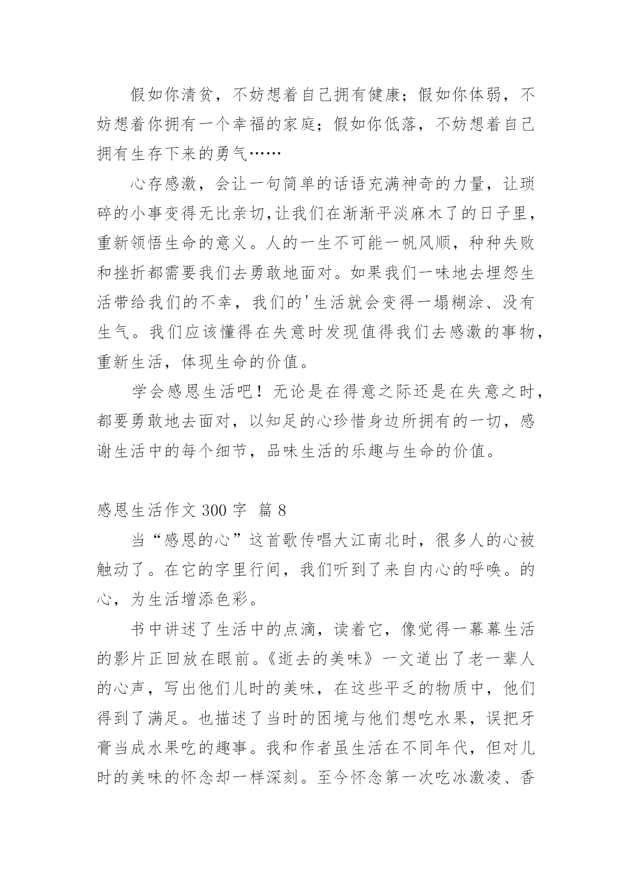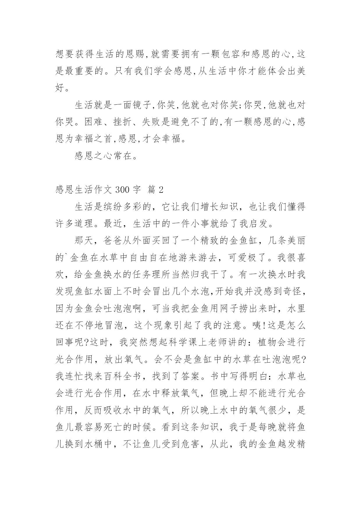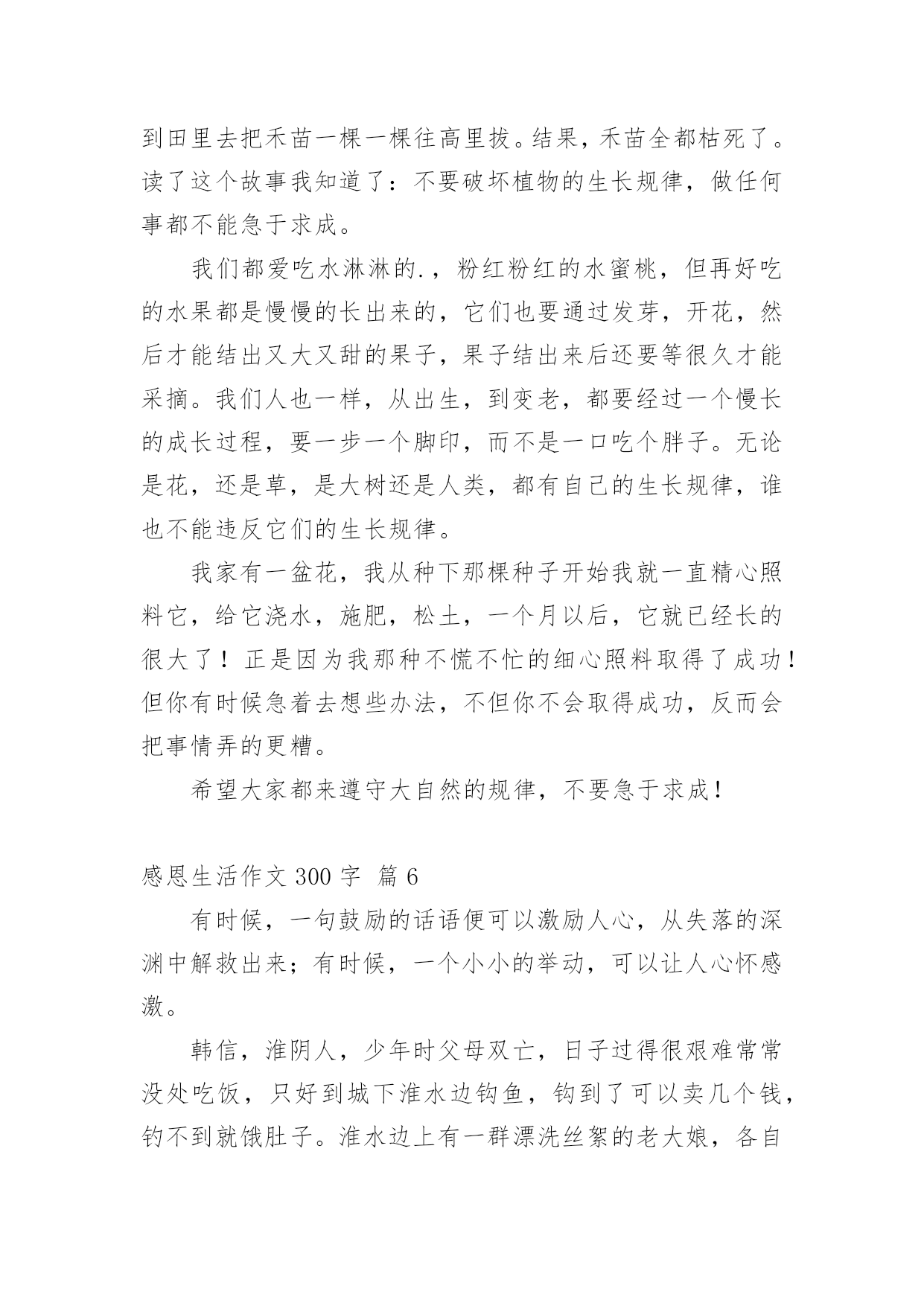 感恩生活作文300字精选感恩生活作文300字9篇在平平淡淡的日常中,大家总少不了接触作文吧,作文是由文字组成,经过人的思想考虑,通过语言组织来表达一个主题意义的文体。那要怎么写好作文呢?下面是小编整理的感恩生活作文300字9篇,仅供参考,希望能够帮助到大家。感恩生活作文300字篇1人生的路不好走,一路上长满荆棘,但即使是再艰难的人生,都充满着感动,有母爱、父爱、友爱······——题记生活,是美好的,却又是艰难的,他给了我们很多无奈,很多泪水,在你伤心落魄的时候你是否会想到——感恩。花儿的生命来源于一粒小小的种子,有了雨水、阳光,他才能开出艳丽的鲜花,同时,他们是缺一不可的。我们的生命是母亲给的,父亲就像雨水和阳光,滋润着我们成长。在我们成长的途中,他们同样也是缺一不可的.,从牙牙学语到现在,他们手把手的把我们拉扯大,我们应该懂得感恩。父爱、母爱,幸福的源泉。生活对于热爱他的人从来不会吝啬,他在给予我们挫折的同时,也赐予了我们坚强,困难,我们需要用坚强去面对。想要获得生活的恩赐,就需要拥有一颗包容和感恩的心,这是最重要的。只有我们学会感恩,从生活中你才能体会出美好。生活就是一面镜子,你笑,他就也对你笑;你哭,他就也对你哭。困难、挫折、失败是避免不了的,有一颗感恩的心,感恩为幸福之首,感恩,才会幸福。感恩之心常在。感恩生活作文300字篇2生活是缤纷多彩的,它让我们增长知识,也让我们懂得许多道理。最近,生活中的一件小事就给了我启发。那天,爸爸从外面买回了一个精致的金鱼缸,几条美丽的`金鱼在水草中自由自在地游来游去,可爱极了。我很喜欢,给金鱼换水的任务理所当然归我干了。有一次换水时我发现鱼缸水面上不时会冒出几个水泡,开始我并没感到奇怪,因为金鱼会吐泡泡啊,可当我把金鱼用网子捞出来时,水里还在不停地冒泡,这个现象引起了我的注意。咦!这是怎么回事呢?这时,我突然想起科学课上老师讲的:植物会进行光合作用,放出氧气。会不会是鱼缸中的水草在吐泡泡呢?我连忙找来百科全书,找到了答案。书中写得明白:水草也会进行光合作用,在水中释放氧气,但晚上却不能进行光合作用,反而吸收水中的氧气,所以晚上水中的氧气很少,是鱼儿最容易死亡的时候。看到这条知识,我于是每晚就将鱼儿换到水桶中,不让鱼儿受到危害,从此,我的金鱼越发精神,而我也因此生活愉快,并且从中学到了知识。生活真是一个优秀的教师啊!她教给了我们知识,让我们学会用眼睛去观察身边的事物,使我们的生活丰富多彩。感谢生活,她让我们在快乐中去发现,去解决,让我的生活变得更充实有趣了。感恩生活作文300字篇3人生在世上应该学习的东西有很多,但首先要先学会感恩,这是做人做事的基本。“羔羊有跪乳之情,乌鸦有反抚之情。”作为自然界万物之灵长的人,更应该有情有义,知恩图报。我们国家历来就是主张讲道德,重情义的礼仪之邦,几千年来流传的之恩感恩的佳话不胜枚举。伟大的思想家罗曼。罗兰说过:“世界上不是缺少美,而是缺少发现。”由此我想说:“生活中不是缺乏让人感动的人和事,而是缺乏有一颗感恩的心。”感恩,我认为就要从身边做亲近的人做起,我们的`父母,是我们身边最值得感恩的人!从小到大,我们的成长浸透了父母多少的心血和爱心啊;一年365天,一日三餐为我们精心准备,在我们生病时,常常一夜不眠的照顾着我们;在我们学习时,常常为我们一点点的进步而喜悦……是父母把世界上最无私的爱奉献给了我们,平凡而伟大!除了父母,我还有很多需要感恩的人,我长大了,也将回报社会,我会怀着一颗感恩的心,从小事做起,将感恩进行到底。感恩生活作文300字篇4一个人从出生到长大,经历了多少,收获了多少,或许谁也不清楚。其实我们本身的存在,就是一种收获,所以不要抱怨生活多么多么不公平,其实我们拥有一颗心,一个独立思考的大脑,就是最大的幸福。上帝为我们关上了一扇门,同时他也为我们打开了一扇窗。活在世界上,享受每天清晨的太阳,就是一种恩赐……人活在世,就是一个从生到死的过程,中间重要的不是得到什么,而是经历过什么。笑着过是一天,哭着过也是一天。何不给自己一个好一点的心情呢?每天即使过着同样的生活,但也有不同的收获。过去的回不来,现在的赶不走,何不把握,让自己没有后悔。让自己每天过得好就是幸福。何必在乎那些虚渺的.呢?一天中经历很多事,或许没有太在意,但某天回忆起时,便会觉得很美好,即使这件事很渺小。喜怒哀乐都是生命这篇文章的标点,它们写出我们的一切情绪。好好的写生命的文章,让我们愉快的享受阳光照耀在身上,那种温暖的感受。感恩生活所给予的一切,会让自己活得更开心,让自己的生命里充满阳光。感恩生活作文300字篇5《揠苗助长》这个故事讲的是:古时候有个人,他想让自己的禾苗长的快些,于是他就想了个办法。第二天,他就到田里去把禾苗一棵一棵往高里拔。结果,禾苗全都枯死了。读了这个