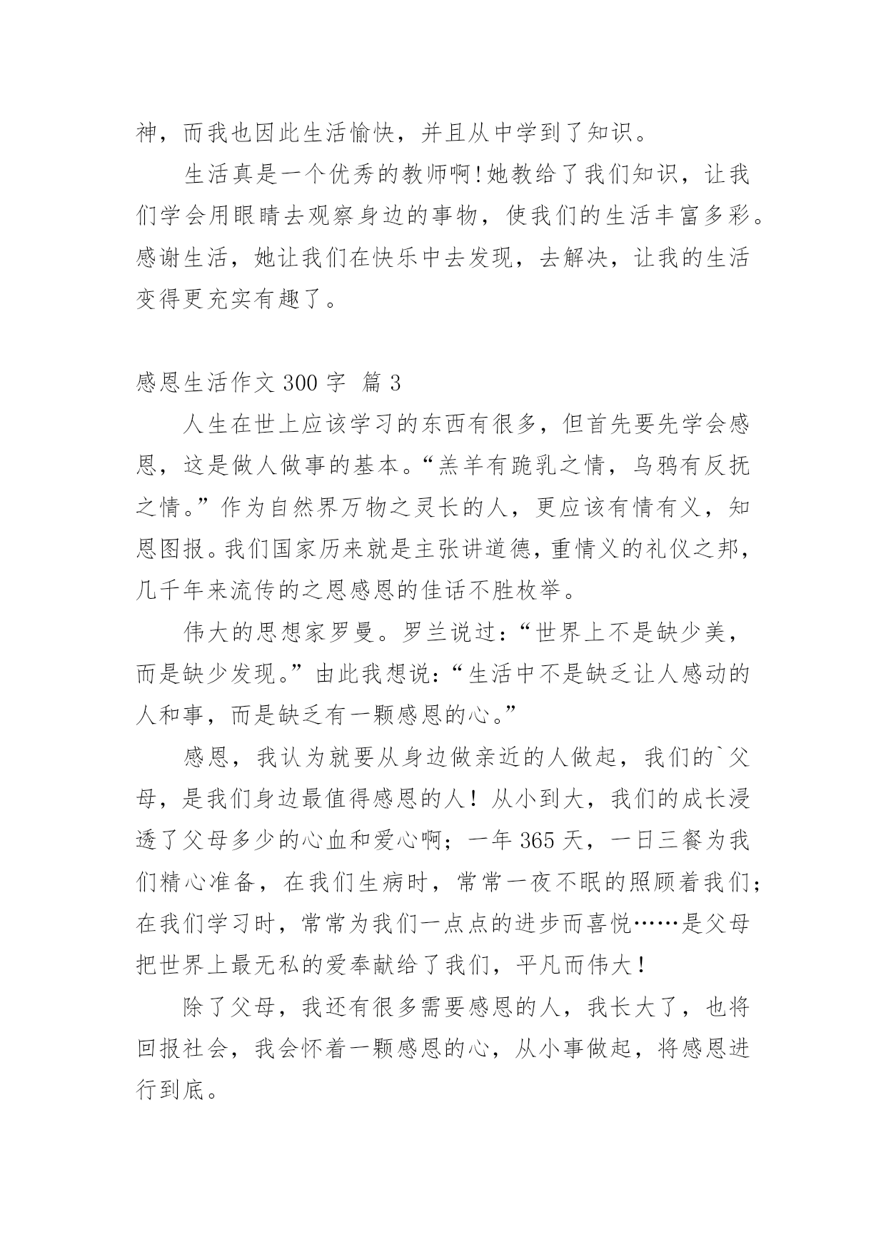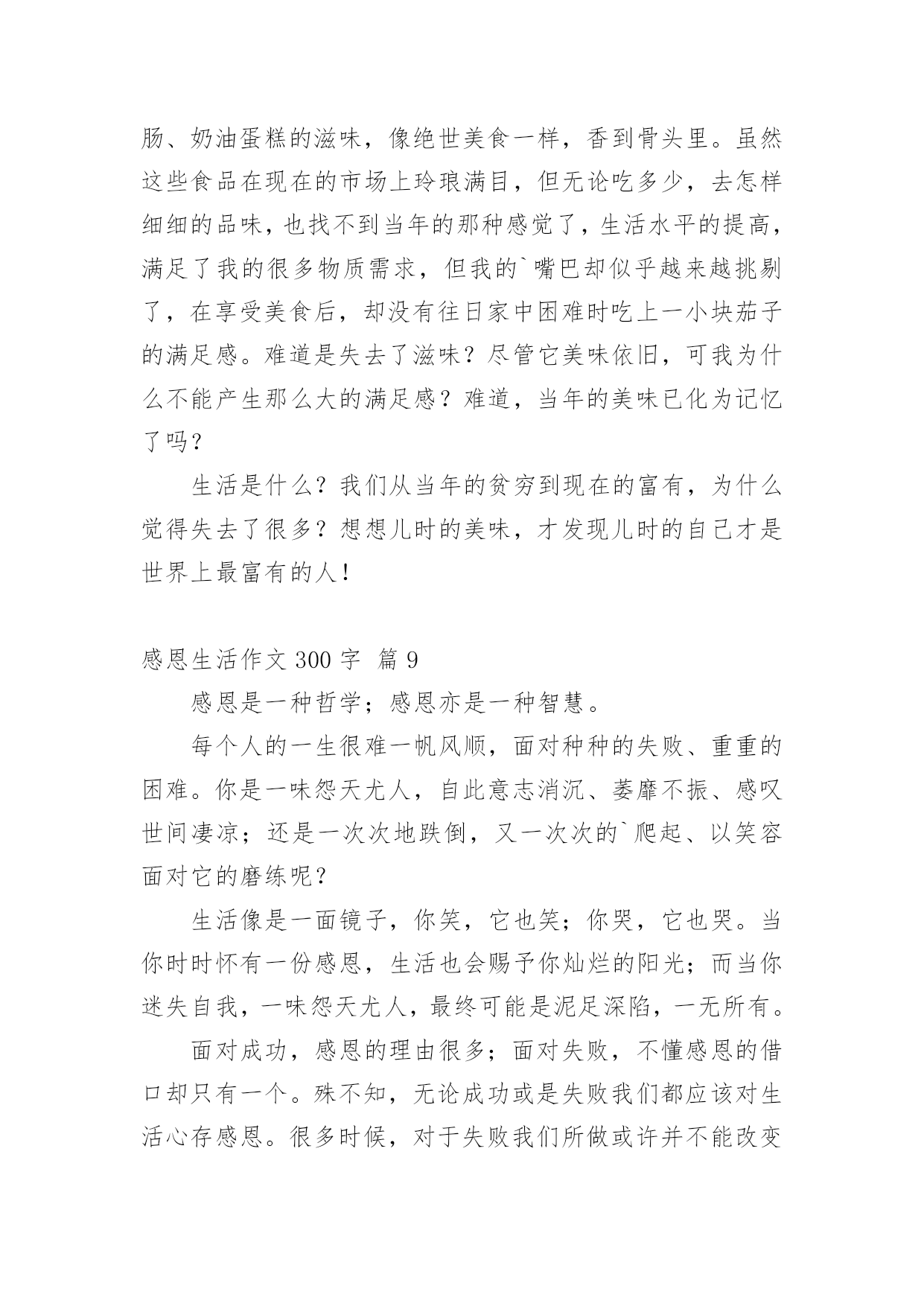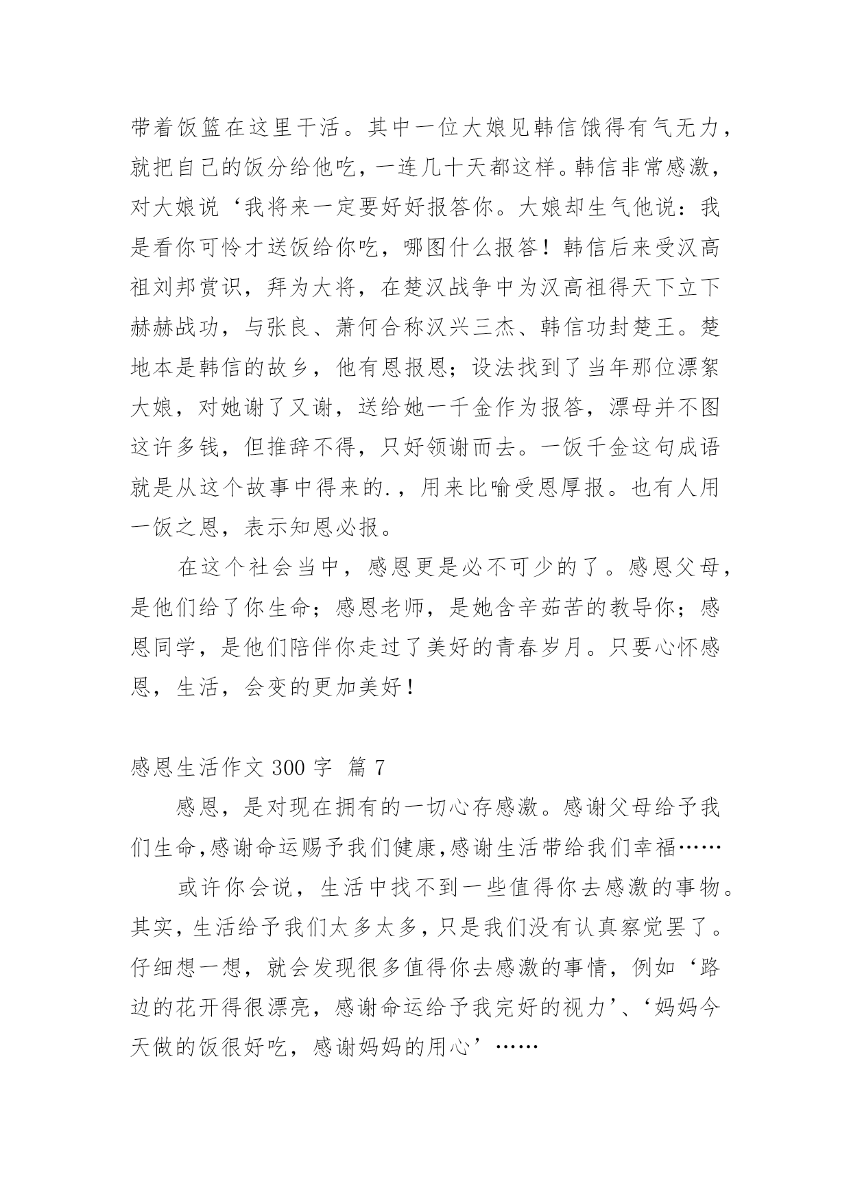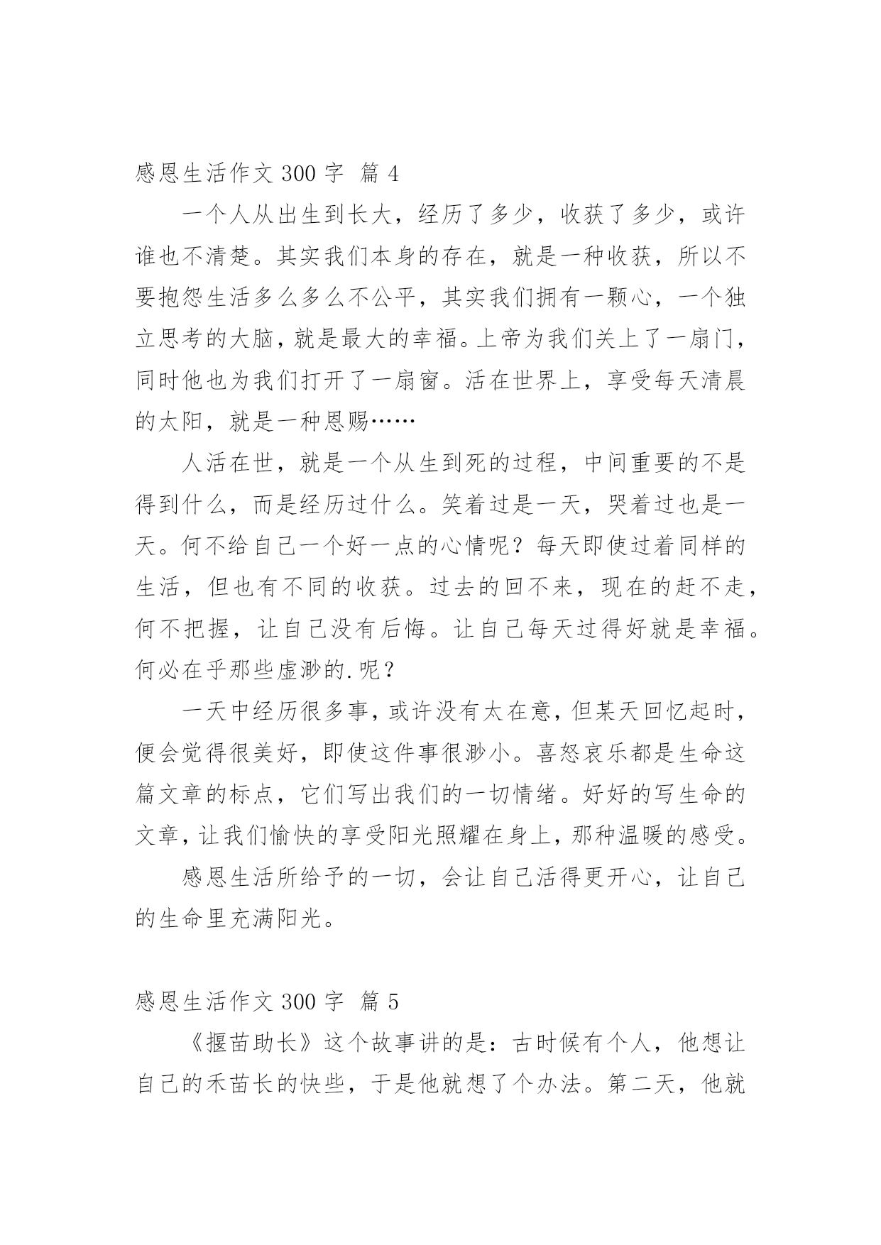 感恩生活作文300字精选感恩生活作文300字9篇在平平淡淡的日常中,大家总少不了接触作文吧,作文是由文字组成,经过人的思想考虑,通过语言组织来表达一个主题意义的文体。那要怎么写好作文呢?下面是小编整理的感恩生活作文300字9篇,仅供参考,希望能够帮助到大家。感恩生活作文300字篇1人生的路不好走,一路上长满荆棘,但即使是再艰难的人生,都充满着感动,有母爱、父爱、友爱······——题记生活,是美好的,却又是艰难的,他给了我们很多无奈,很多泪水,在你伤心落魄的时候你是否会想到——感恩。花儿的生命来源于一粒小小的种子,有了雨水、阳光,他才能开出艳丽的鲜花,同时,他们是缺一不可的。我们的生命是母亲给的,父亲就像雨水和阳光,滋润着我们成长。在我们成长的途中,他们同样也是缺一不可的.,从牙牙学语到现在,他们手把手的把我们拉扯大,我们应该懂得感恩。父爱、母爱,幸福的源泉。生活对于热爱他的人从来不会吝啬,他在给予我们挫折的同时,也赐予了我们坚强,困难,我们需要用坚强去面对。想要获得生活的恩赐,就需要拥有一颗包容和感恩的心,这是最重要的。只有我们学会感恩,从生活中你才能体会出美好。生活就是一面镜子,你笑,他就也对你笑;你哭,他就也对你哭。困难、挫折、失败是避免不了的,有一颗感恩的心,感恩为幸福之首,感恩,才会幸福。感恩之心常在。感恩生活作文300字篇2生活是缤纷多彩的,它让我们增长知识,也让我们懂得许多道理。最近,生活中的一件小事就给了我启发。那天,爸爸从外面买回了一个精致的金鱼缸,几条美丽的`金鱼在水草中自由自在地游来游去,可爱极了。我很喜欢,给金鱼换水的任务理所当然归我干了。有一次换水时我发现鱼缸水面上不时会冒出几个水泡,开始我并没感到奇怪,因为金鱼会吐泡泡啊,可当我把金鱼用网子捞出来时,水里还在不停地冒泡,这个现象引起了我的注意。咦!这是怎么回事呢?这时,我突然想起科学课上老师讲的:植物会进行光合作用,放出氧气。会不会是鱼缸中的水草在吐泡泡呢?我连忙找来百科全书,找到了答案。书中写得明白:水草也会进行光合作用,在水中释放氧气,但晚上却不能进行光合作用,反而吸收水中的氧气,所以晚上水中的氧气很少,是鱼儿最容易死亡的时候。看到这条知识,我于是每晚就将鱼儿换到水桶中,不让鱼儿受到危害,从此,我的金鱼越发精神,而我也因此生活愉快,并且从中学到了知识。生活真是一个优秀的教师啊!她教给了我们知识,让我们学会用眼睛去观察身边的事物,使我们的生活丰富多彩。感谢生活,她让我们在快乐中去发现,去解决,让我的生活变得更充实有趣了。感恩生活作文300字篇3人生在世上应该学习的东西有很多,但首先要先学会感恩,这是做人做事的基本。“羔羊有跪乳之情,乌鸦有反抚之情。”作为自然界万物之灵长的人,更应该有情有义,知恩图报。我们国家历来就是主张讲道德,重情义的礼仪之邦,几千年来流传的之恩感恩的佳话不胜枚举。伟大的思想家罗曼。罗兰说过:“世界上不是缺少美,而是缺少发现。”由此我想说:“生活中不是缺乏让人感动的人和事,而是缺乏有一颗感恩的心。”感恩,我认为就要从身边做亲近的人做起,我们的`父母,是我们身边最值得感恩的人!从小到大,我们的成长浸透了父母多少的心血和爱心啊;一年365天,一日三餐为我们精心准备,在我们生病时,常常一夜不眠的照顾着我们;在我们学习时,常常为我们一点点的进步而喜悦……是父母把世界上最无私的爱奉献给了我们,平凡而伟大!除了父母,我还有很多需要感恩的人,我长大了,也将回报社会,我会怀着一颗感恩的心,从小事做起,将感恩进行到底。感恩生活作文300字篇4一个人从出生到长大,经历了多少,收获了多少,或许谁也不清楚。其实我们本身的存在,就是一种收获,所以不要抱怨生活多么多么不公平,其实我们拥有一颗心,一个独立思考的大脑,就是最大的幸福。上帝为我们关上了一扇门,同时他也为我们打开了一扇窗。活在世界上,享受每天清晨的太阳,就是一种恩赐……人活在世,就是一个从生到死的过程,中间重要的不是得到什么,而是经历过什么。笑着过是一天,哭着过也是一天。何不给自己一个好一点的心情呢?每天即使过着同样的生活,但也有不同的收获。过去的回不来,现在的赶不走,何不把握,让自己没有后悔。让自己每天过得好就是幸福。何必在乎那些虚渺的.呢?一天中经历很多事,或许没有太在意,但某天回忆起时,便会觉得很美好,即使这件事很渺小。喜怒哀乐都是生命这篇文章的标点,它们写出我们的一切情绪。好好的写生命的文章,让我们愉快的享受阳光照耀在身上,那种温暖的感受。感恩生活所给予的一切,会让自己活得更开心,让自己的生命里充满阳光。感恩生活作文300字篇5《揠苗助长》这个故事讲的是:古时候有个人,他想让自己的禾苗长的快些,于是他就想了个办法。第二天,他就到田里去把禾苗一棵一棵往高里拔。结果,禾苗全都枯死了。读了这个