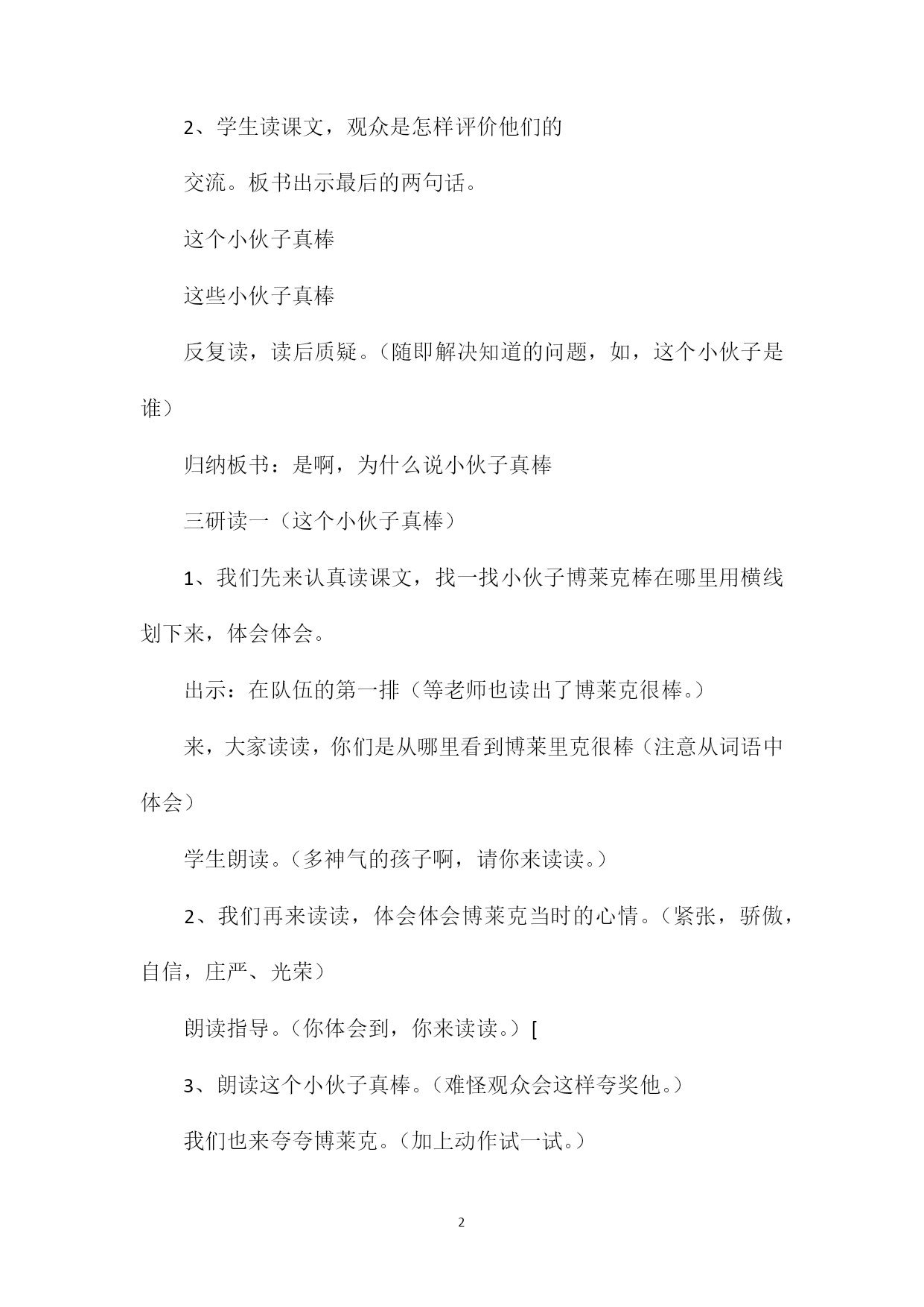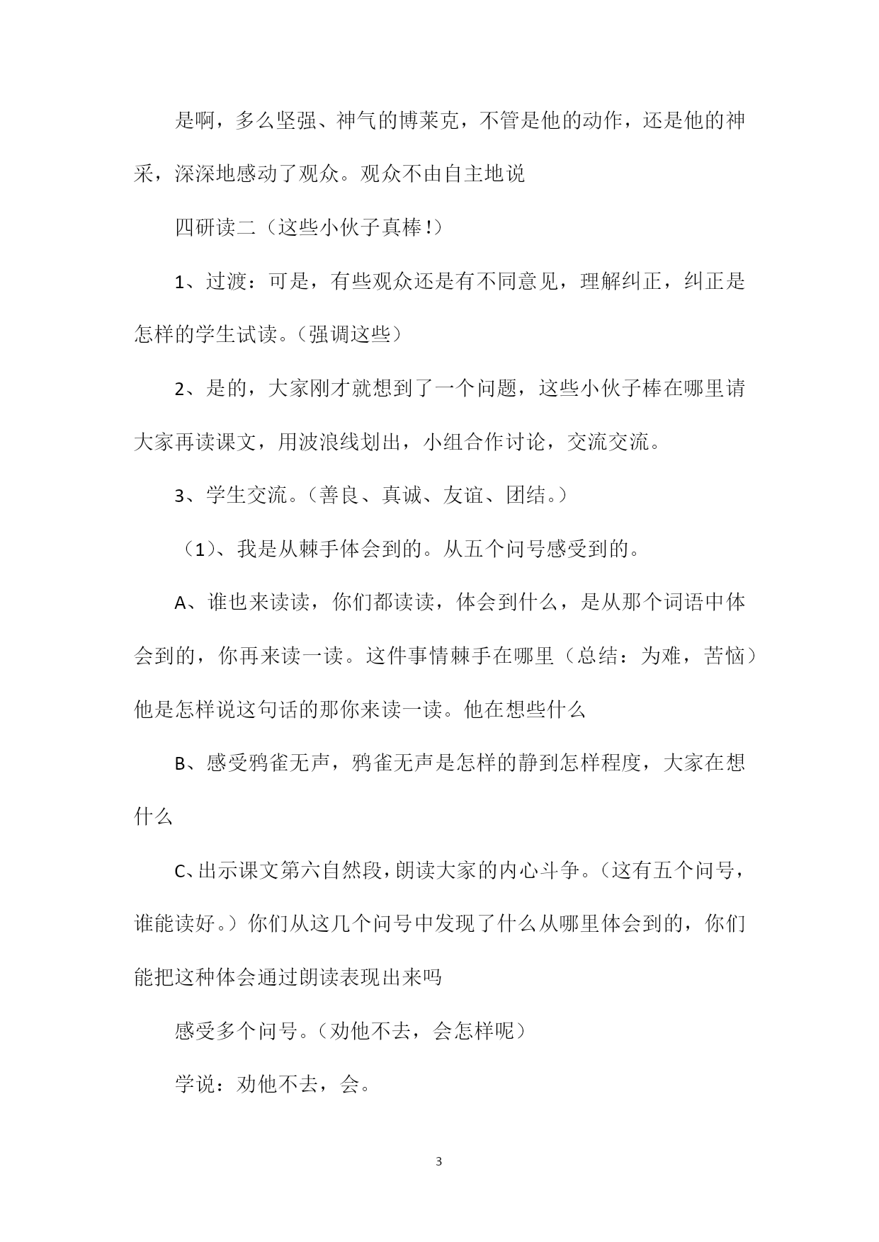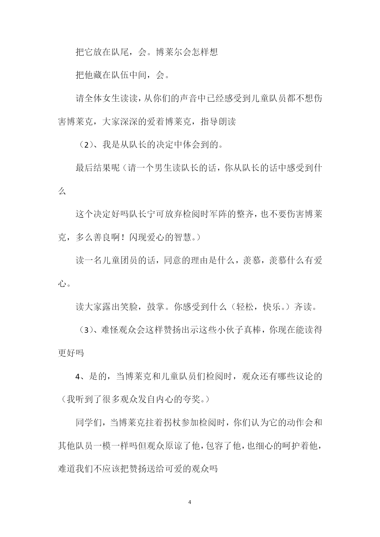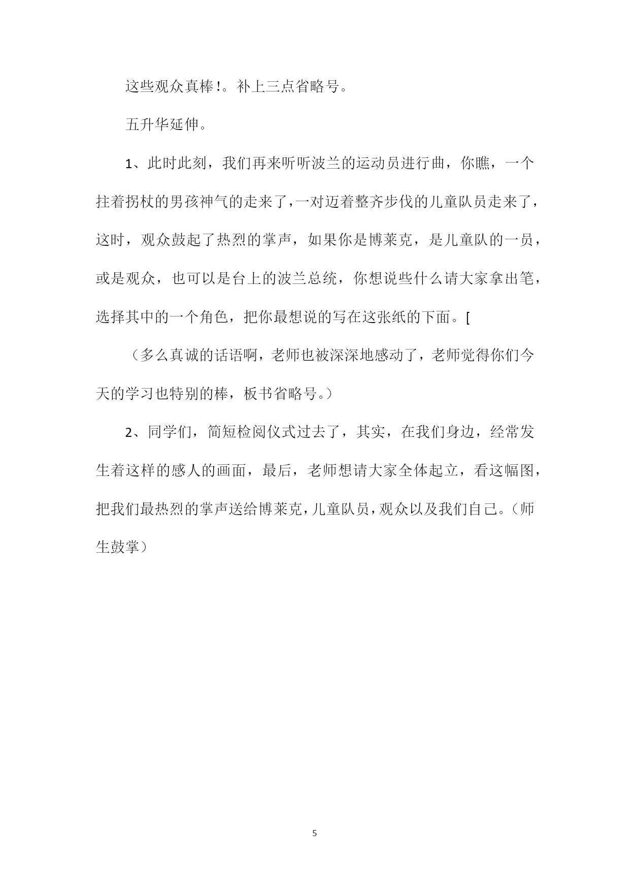 PAGEPAGE5《检阅》教学设计一教学目标:1、学会课文中的生字和新词,会正确流利、有感情地读课文。2、能够揣摩人物的内心世界,感受人物的内心斗争。领悟体验部分词句。3、感受博莱克坚强神气,儿童团员的宽容友爱、真诚善良,以及观众博爱的胸怀。教学准备:课件,观看或向大人了解国庆阅兵。教学过程:一谈话导入,交流入题。1、出示课题,学生交流对课题的理解。2、观看建国五十周年国庆阅兵仪式,学生说感受,评评参加检阅的人。二初读课文,交流感受。1、过渡:同学们用最美好的词语评价了参加检阅的人,今天我们将来到波兰首都华沙,参加那儿的国庆检阅活动。看看波兰观众是怎样评价这次检阅的。请大家打开书本,正确流利的朗读课文。找到后,多读几遍。2、学生读课文,观众是怎样评价他们的交流。板书出示最后的两句话。这个小伙子真棒这些小伙子真棒反复读,读后质疑。(随即解决知道的问题,如,这个小伙子是谁)归纳板书:是啊,为什么说小伙子真棒三研读一(这个小伙子真棒)1、我们先来认真读课文,找一找小伙子博莱克棒在哪里用横线划下来,体会体会。出示:在队伍的第一排(等老师也读出了博莱克很棒。)来,大家读读,你们是从哪里看到博莱里克很棒(注意从词语中体会)学生朗读。(多神气的孩子啊,请你来读读。)2、我们再来读读,体会体会博莱克当时的心情。(紧张,骄傲,自信,庄严、光荣)朗读指导。(你体会到,你来读读。)[3、朗读这个小伙子真棒。(难怪观众会这样夸奖他。)我们也来夸夸博莱克。(加上动作试一试。)是啊,多么坚强、神气的博莱克,不管是他的动作,还是他的神采,深深地感动了观众。观众不由自主地说四研读二(这些小伙子真棒!)1、过渡:可是,有些观众还是有不同意见,理解纠正,纠正是怎样的学生试读。(强调这些)2、是的,大家刚才就想到了一个问题,这些小伙子棒在哪里请大家再读课文,用波浪线划出,小组合作讨论,交流交流。3、学生交流。(善良、真诚、友谊、团结。)(1)、我是从棘手体会到的。从五个问号感受到的。A、谁也来读读,你们都读读,体会到什么,是从那个词语中体会到的,你再来读一读。这件事情棘手在哪里(总结:为难,苦恼)他是怎样说这句话的那你来读一读。他在想些什么B、感受鸦雀无声,鸦雀无声是怎样的静到怎样程度,大家在想什么C、出示课文第六自然段,朗读大家的内心斗争。(这有五个问号,谁能读好。)你们从这几个问号中发现了什么从哪里体会到的,你们能把这种体会通过朗读表现出来吗感受多个问号。(劝他不去,会怎样呢)学说:劝他不去,会。把它放在队尾,会。博莱尔会怎样想把他藏在队伍中间,会。请全体女生读读,从你们的声音中已经感受到儿童队员都不想伤害博莱克,大家深深的爱着博莱克,指导朗读(2)、我是从队长的决定中体会到的。最后结果呢(请一个男生读队长的话,你从队长的话中感受到什么这个决定好吗队长宁可放弃检阅时军阵的整齐,也不要伤害博莱克,多么善良啊!闪现爱心的智慧。)读一名儿童团员的话,同意的理由是什么,羡慕,羡慕什么有爱心。读大家露出笑脸,鼓掌。你感受到什么(轻松,快乐。)齐读。(3)、难怪观众会这样赞扬出示这些小伙子真棒,你现在能读得更好吗4、是的,当博莱克和儿童队员们检阅时,观众还有哪些议论的(我听到了很多观众发自内心的夸奖。)同学们,当博莱克拄着拐杖参加检阅时,你们认为它的动作会和其他队员一模一样吗但观众原谅了他,包容了他,也细心的呵护着他,难道我们不应该把赞扬送给可爱的观众吗这些观众真棒!。补上三点省略号。五升华延伸。1、此时此刻,我们再来听听波兰的运动员进行曲,你瞧,一个拄着拐杖的男孩神气的走来了,一对迈着整齐步伐的儿童队员走来了,这时,观众鼓起了热烈的掌声,如果你是博莱克,是儿童队的一员,或是观众,也可以是台上的波兰总统,你想说些什么请大家拿出笔,选择其中的一个角色,把你最想说的写在这张纸的下面。[(多么真诚的话语啊,老师也被深深地感动了,老师觉得你们今天的学习也特别的棒,板书省略号。)2、同学们,简短检阅仪式过去了,其实,在我们身边,经常发生着这样的感人的画面,最后,老师想请大家全体起立,看这幅图,把我们最热烈的掌声送给博莱克,儿童队员,观众以及我们自己。(师生鼓掌)