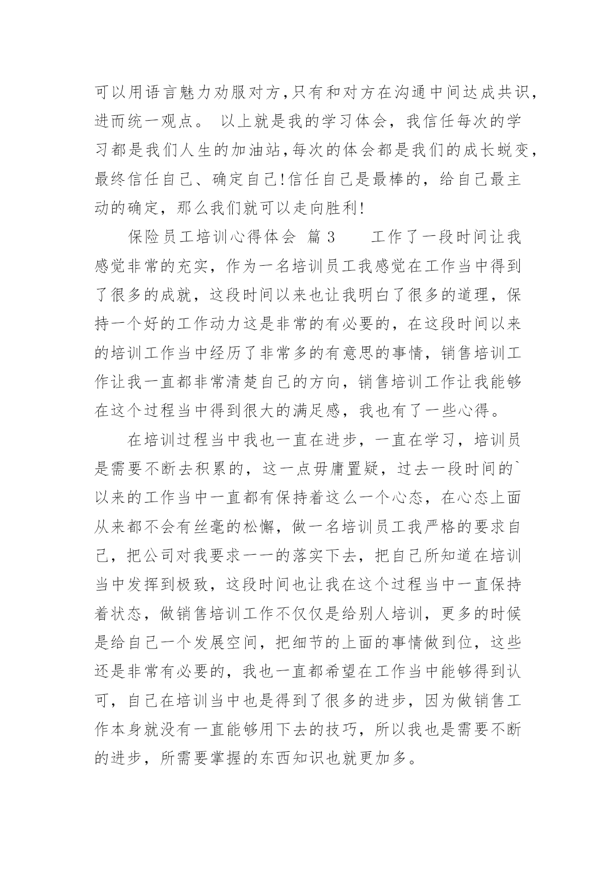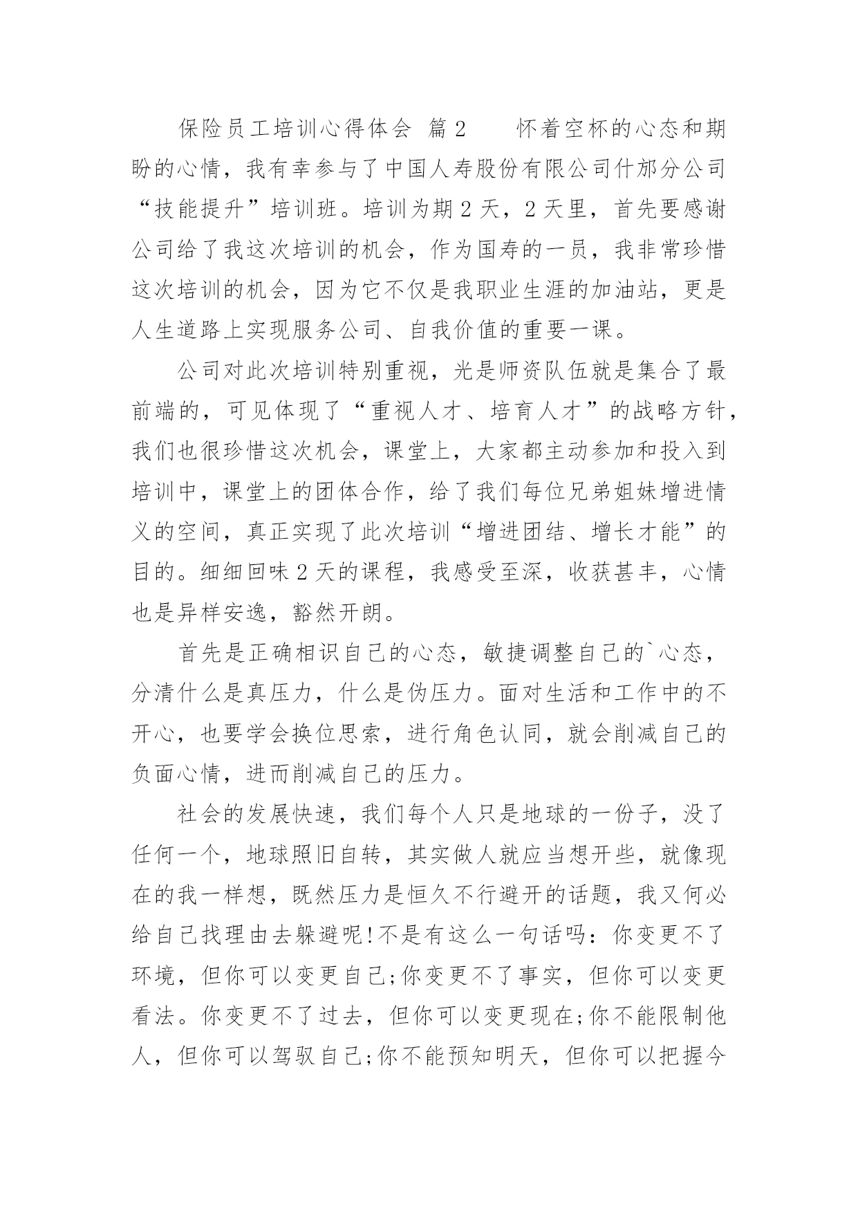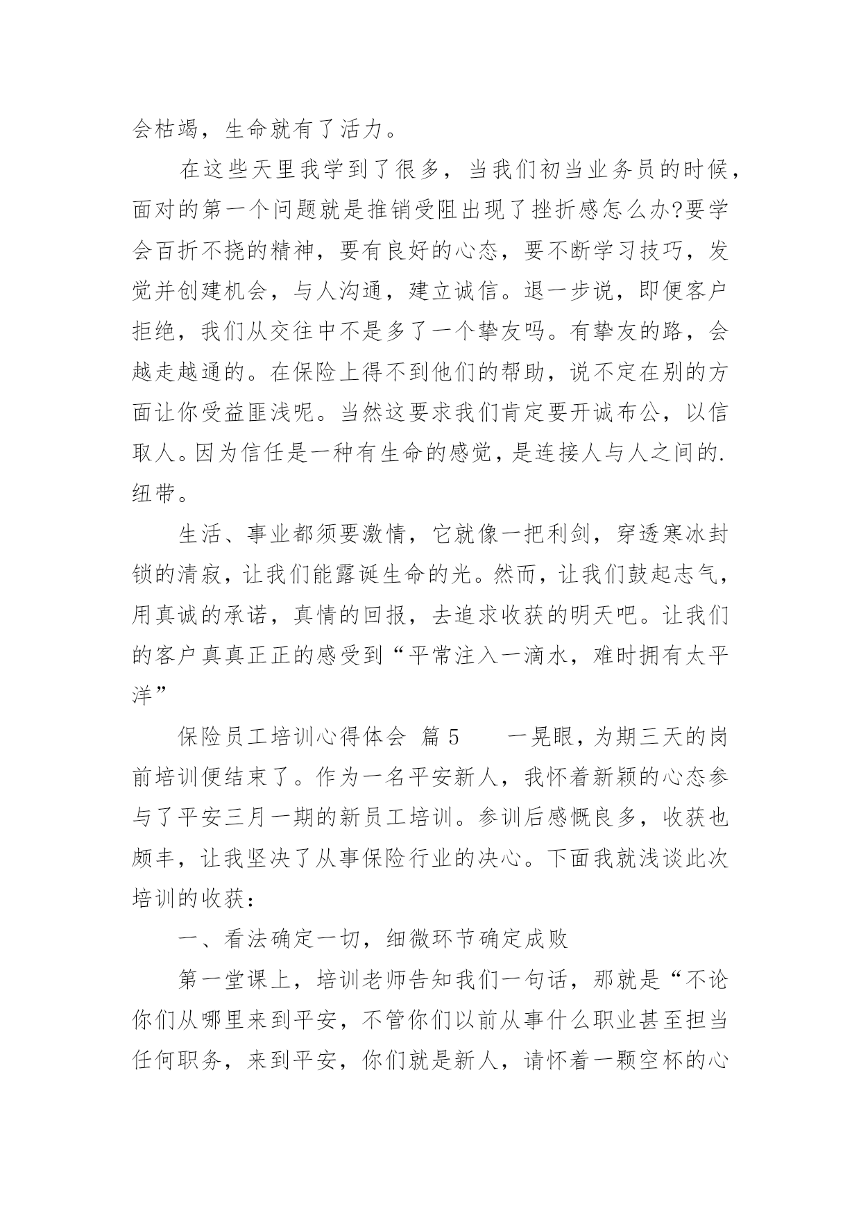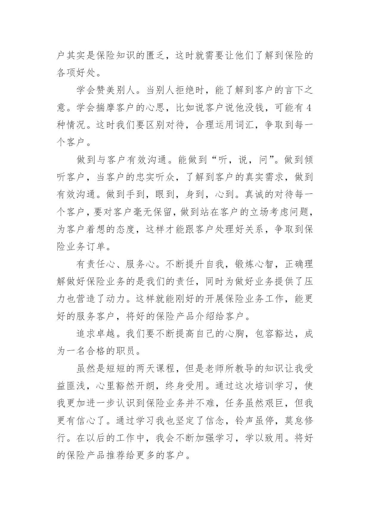 保险员工培训心得体会保险员工培训心得体会当我们经过反思,对生活有了新的看法时,写心得体会是一个不错的选择,通过写心得体会,可以帮助我们总结积累经验。应该怎么写才合适呢?以下是小编整理的保险员工培训心得体会,希望对大家有所帮助。保险员工培训心得体会篇1非常荣幸参加了xx保险培训,首先要感谢局里给了我这次培训的机会,我十分珍惜这次培训的机会,因为这次培训不仅增长业务知识,更锻炼我业务能力。更为以后的工作打下坚实的基础。参加此次培训的同事都怀着增长自己的业务能力的目的。通过两天的课程,对xx人保公司有了深入了解,对保险产品也有了更深彻的认识,这也是我们在日常的工作中最需要学习最需要掌握最需要提高的知识,这将有助于我们日后的工作,更需要的是我们每一天的努力、学习和积累提高。在日常的工作中,我不断总结经验和教训、不断自我学习和提高,这两天的培训我一直在思考和领悟一个问题:我们如何才能发掘潜在客户购买保险。通过学习,不仅让我学习到新的知识,更让我信心倍增。结合自己工作过程中遇到的'问题总结学习到的经验,我认为要想做好保险业务工作,我必须努力争取做到以下几点:学会主动开口。遇到客户主动介绍产品。很多想买的客户其实是保险知识的匮乏,这时就需要让他们了解到保险的各项好处。学会赞美别人。当别人拒绝时,能了解到客户的言下之意。学会揣摩客户的心思,比如说客户说他没钱,可能有4种情况。这时我们要区别对待,合理运用词汇,争取到每一个客户。做到与客户有效沟通。能做到“听,说,问”。做到倾听客户,当客户的忠实听众,了解到客户的真实需求,做到有效沟通。做到手到,眼到,身到,心到。真诚的对待每一个客户,要对客户毫无保留,做到站在客户的立场考虑问题,为客户着想的态度,这样才能跟客户处理好关系,争取到保险业务订单。有责任心、服务心。不断提升自我,锻炼心智,正确理解做好保险业务的是我们的责任,同时为做好业务提供了压力也营造了动力。这样就能刚好的开展保险业务工作,能更好的服务客户,将好的保险产品介绍给客户。追求卓越。我们要不断提高自己的心胸,包容豁达,成为一名合格的职员。虽然是短短的两天课程,但是老师所教导的知识让我受益匪浅,心里豁然开朗,终身受用。通过这次培训学习,使我更加进一步认识到保险业务并不难,任务虽然艰巨,但我更有信心了。通过学习我也坚定了信念,铃声虽停,莫怠修行。在以后的工作中,我会不断加强学习,学以致用。将好的保险产品推荐给更多的客户。保险员工培训心得体会篇2怀着空杯的心态和期盼的心情,我有幸参与了中国人寿股份有限公司什邡分公司“技能提升”培训班。培训为期2天,2天里,首先要感谢公司给了我这次培训的机会,作为国寿的一员,我非常珍惜这次培训的机会,因为它不仅是我职业生涯的加油站,更是人生道路上实现服务公司、自我价值的重要一课。公司对此次培训特别重视,光是师资队伍就是集合了最前端的,可见体现了“重视人才、培育人才”的战略方针,我们也很珍惜这次机会,课堂上,大家都主动参加和投入到培训中,课堂上的团体合作,给了我们每位兄弟姐妹增进情义的空间,真正实现了此次培训“增进团结、增长才能”的目的。细细回味2天的课程,我感受至深,收获甚丰,心情也是异样安逸,豁然开朗。首先是正确相识自己的心态,敏捷调整自己的`心态,分清什么是真压力,什么是伪压力。面对生活和工作中的不开心,也要学会换位思索,进行角色认同,就会削减自己的负面心情,进而削减自己的压力。社会的发展快速,我们每个人只是地球的一份子,没了任何一个,地球照旧自转,其实做人就应当想开些,就像现在的我一样想,既然压力是恒久不行避开的话题,我又何必给自己找理由去躲避呢!不是有这么一句话吗:你变更不了环境,但你可以变更自己;你变更不了事实,但你可以变更看法。你变更不了过去,但你可以变更现在;你不能限制他人,但你可以驾驭自己;你不能预知明天,但你可以把握今日;你不能样样顺当,但你可以事事尽心;你不能左右天气,但你可以变更心情;你不能选择容貌,但你可以呈现笑容;你不能延长生命的长度,但你可以确定生命的宽度。所以,换一副“眼镜”看世界,我们就会少些忧愁与苦恼,多些快乐与欢乐,人,简洁就好!学习了怎样给自己减压,那么就是怎样塑造一个健康向上的心态!良好的心态是做好一切工作的良好开端。一个人是否拥有阳光般的心态,干脆或间接地影响到他学习、工作、生活的方方面面。我们在忙于日常繁杂事务时,往往忽视调整心态。由此,我想到我们的工作,假如心态不平衡的话,干工作时就会一味地埋怨,发牢骚,找各种理由不去完成,并且时常会觉得自己得不偿失,贡献大回报少,久而久之就会产生“端起碗吃肉,放下筷子骂娘”的不良工作作风。“工作本身不重要,重要的是你对这个工作的看法”,既然我们变更不了工作,就要变更对工作看法,学会欢乐的工作,这不仅能提高工作效率,而且还能给每