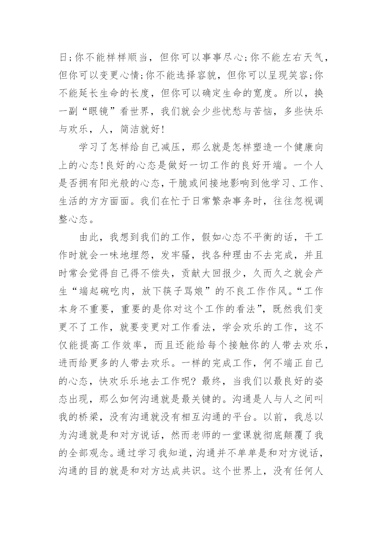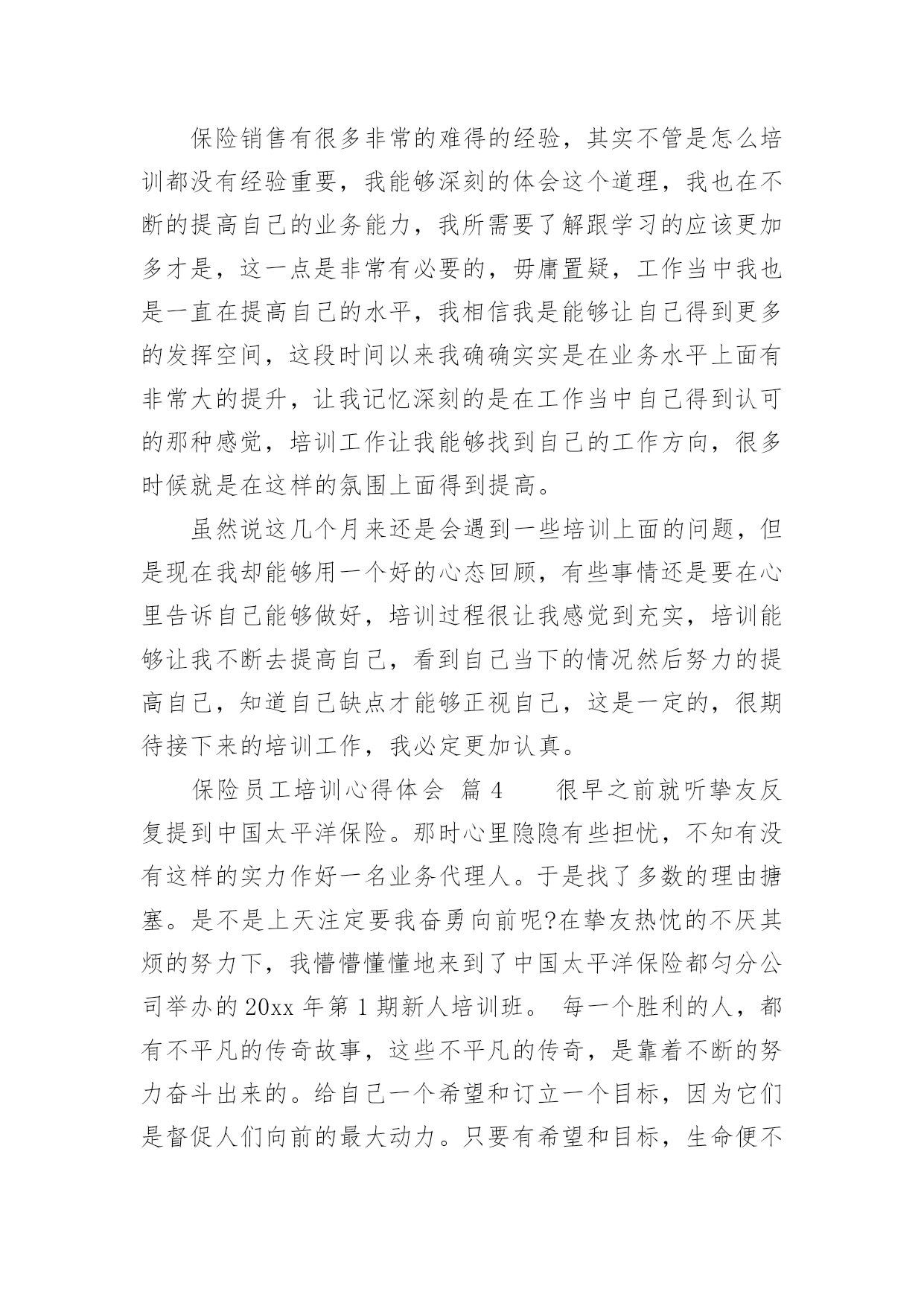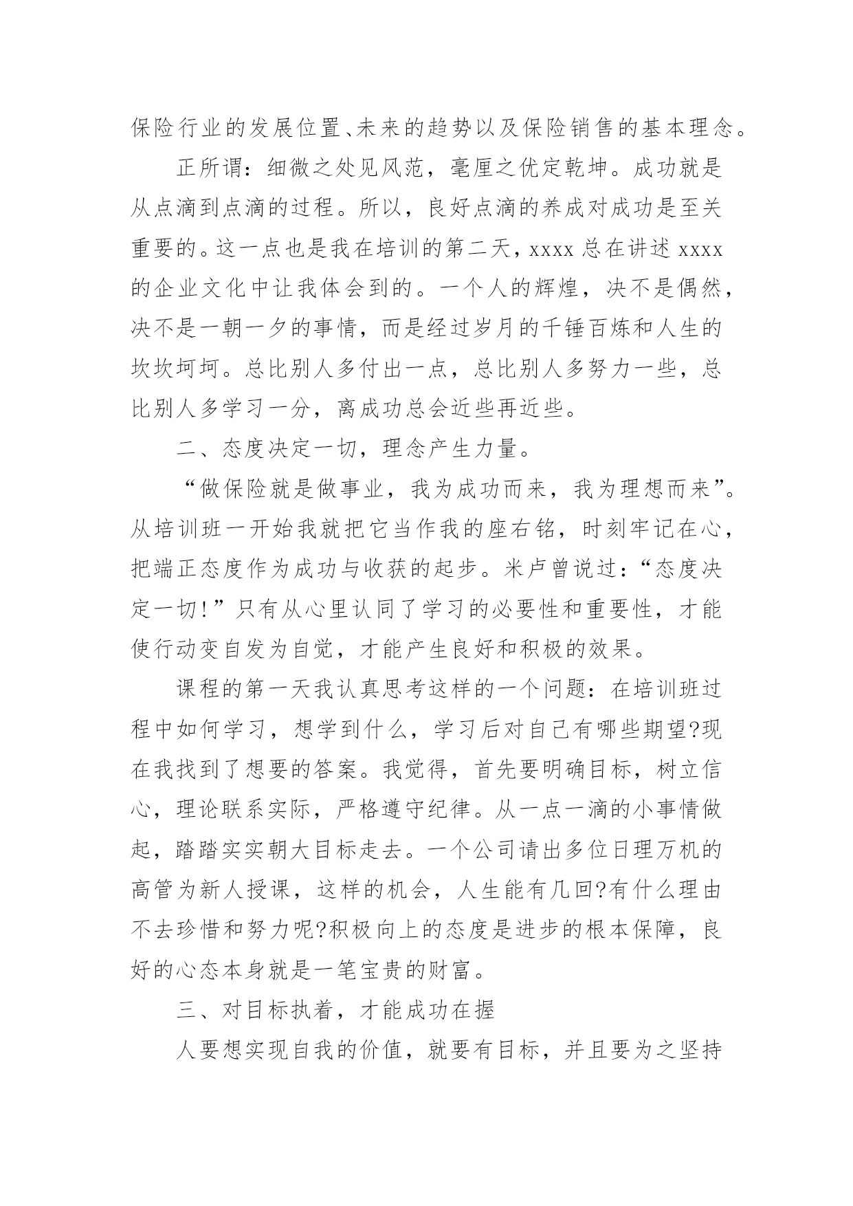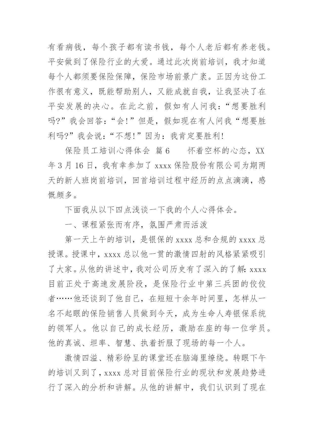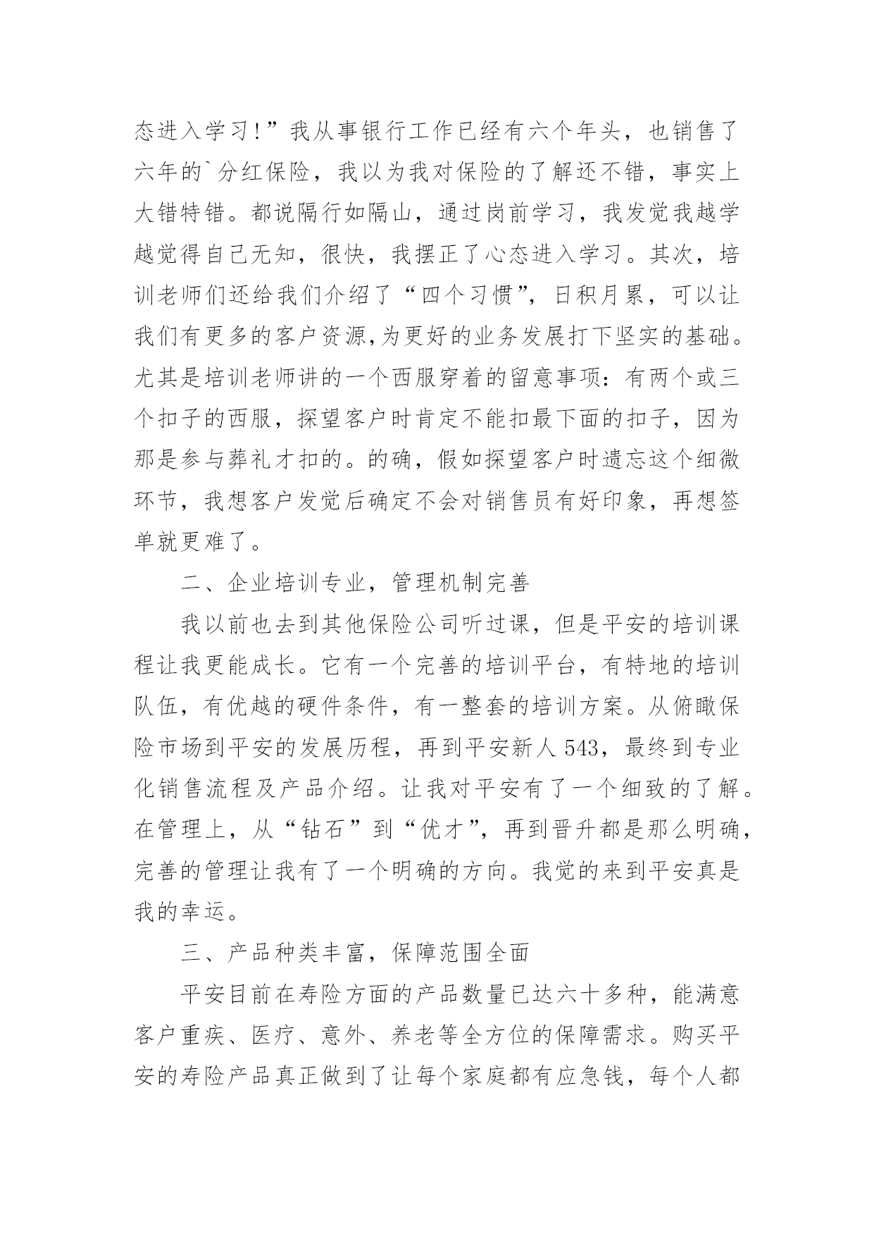 保险员工培训心得体会保险员工培训心得体会当我们经过反思,对生活有了新的看法时,写心得体会是一个不错的选择,通过写心得体会,可以帮助我们总结积累经验。应该怎么写才合适呢?以下是小编整理的保险员工培训心得体会,希望对大家有所帮助。保险员工培训心得体会篇1非常荣幸参加了xx保险培训,首先要感谢局里给了我这次培训的机会,我十分珍惜这次培训的机会,因为这次培训不仅增长业务知识,更锻炼我业务能力。更为以后的工作打下坚实的基础。参加此次培训的同事都怀着增长自己的业务能力的目的。通过两天的课程,对xx人保公司有了深入了解,对保险产品也有了更深彻的认识,这也是我们在日常的工作中最需要学习最需要掌握最需要提高的知识,这将有助于我们日后的工作,更需要的是我们每一天的努力、学习和积累提高。在日常的工作中,我不断总结经验和教训、不断自我学习和提高,这两天的培训我一直在思考和领悟一个问题:我们如何才能发掘潜在客户购买保险。通过学习,不仅让我学习到新的知识,更让我信心倍增。结合自己工作过程中遇到的'问题总结学习到的经验,我认为要想做好保险业务工作,我必须努力争取做到以下几点:学会主动开口。遇到客户主动介绍产品。很多想买的客户其实是保险知识的匮乏,这时就需要让他们了解到保险的各项好处。学会赞美别人。当别人拒绝时,能了解到客户的言下之意。学会揣摩客户的心思,比如说客户说他没钱,可能有4种情况。这时我们要区别对待,合理运用词汇,争取到每一个客户。做到与客户有效沟通。能做到“听,说,问”。做到倾听客户,当客户的忠实听众,了解到客户的真实需求,做到有效沟通。做到手到,眼到,身到,心到。真诚的对待每一个客户,要对客户毫无保留,做到站在客户的立场考虑问题,为客户着想的态度,这样才能跟客户处理好关系,争取到保险业务订单。有责任心、服务心。不断提升自我,锻炼心智,正确理解做好保险业务的是我们的责任,同时为做好业务提供了压力也营造了动力。这样就能刚好的开展保险业务工作,能更好的服务客户,将好的保险产品介绍给客户。追求卓越。我们要不断提高自己的心胸,包容豁达,成为一名合格的职员。虽然是短短的两天课程,但是老师所教导的知识让我受益匪浅,心里豁然开朗,终身受用。通过这次培训学习,使我更加进一步认识到保险业务并不难,任务虽然艰巨,但我更有信心了。通过学习我也坚定了信念,铃声虽停,莫怠修行。在以后的工作中,我会不断加强学习,学以致用。将好的保险产品推荐给更多的客户。保险员工培训心得体会篇2怀着空杯的心态和期盼的心情,我有幸参与了中国人寿股份有限公司什邡分公司“技能提升”培训班。培训为期2天,2天里,首先要感谢公司给了我这次培训的机会,作为国寿的一员,我非常珍惜这次培训的机会,因为它不仅是我职业生涯的加油站,更是人生道路上实现服务公司、自我价值的重要一课。公司对此次培训特别重视,光是师资队伍就是集合了最前端的,可见体现了“重视人才、培育人才”的战略方针,我们也很珍惜这次机会,课堂上,大家都主动参加和投入到培训中,课堂上的团体合作,给了我们每位兄弟姐妹增进情义的空间,真正实现了此次培训“增进团结、增长才能”的目的。细细回味2天的课程,我感受至深,收获甚丰,心情也是异样安逸,豁然开朗。首先是正确相识自己的心态,敏捷调整自己的`心态,分清什么是真压力,什么是伪压力。面对生活和工作中的不开心,也要学会换位思索,进行角色认同,就会削减自己的负面心情,进而削减自己的压力。社会的发展快速,我们每个人只是地球的一份子,没了任何一个,地球照旧自转,其实做人就应当想开些,就像现在的我一样想,既然压力是恒久不行避开的话题,我又何必给自己找理由去躲避呢!不是有这么一句话吗:你变更不了环境,但你可以变更自己;你变更不了事实,但你可以变更看法。你变更不了过去,但你可以变更现在;你不能限制他人,但你可以驾驭自己;你不能预知明天,但你可以把握今日;你不能样样顺当,但你可以事事尽心;你不能左右天气,但你可以变更心情;你不能选择容貌,但你可以呈现笑容;你不能延长生命的长度,但你可以确定生命的宽度。所以,换一副“眼镜”看世界,我们就会少些忧愁与苦恼,多些快乐与欢乐,人,简洁就好!学习了怎样给自己减压,那么就是怎样塑造一个健康向上的心态!良好的心态是做好一切工作的良好开端。一个人是否拥有阳光般的心态,干脆或间接地影响到他学习、工作、生活的方方面面。我们在忙于日常繁杂事务时,往往忽视调整心态。由此,我想到我们的工作,假如心态不平衡的话,干工作时就会一味地埋怨,发牢骚,找各种理由不去完成,并且时常会觉得自己得不偿失,贡献大回报少,久而久之就会产生“端起碗吃肉,放下筷子骂娘”的不良工作作风。“工作本身不重要,重要的是你对这个工作的看法”,既然我们变更不了工作,就要变更对工作看法,学会欢乐的工作,这不仅能提高工作效率,而且还能给每