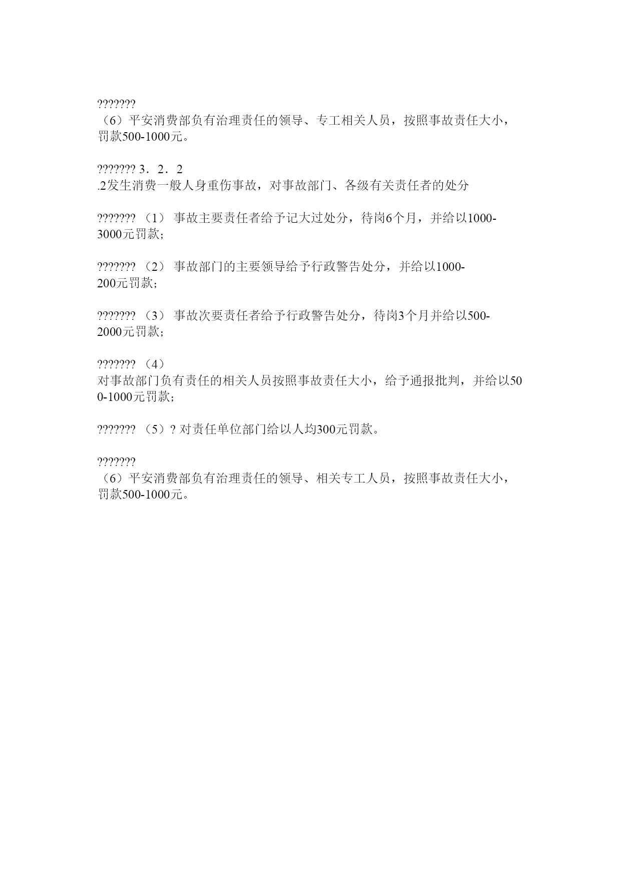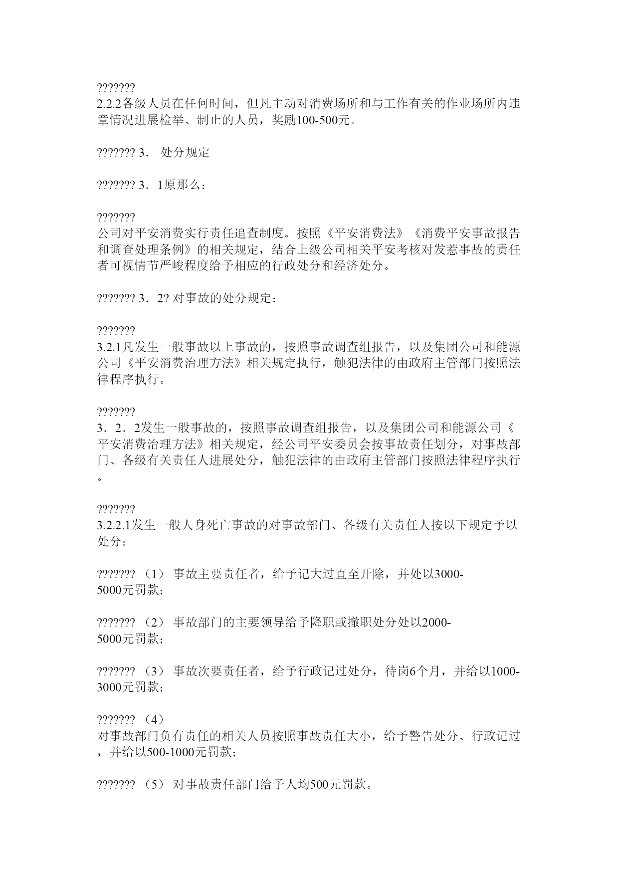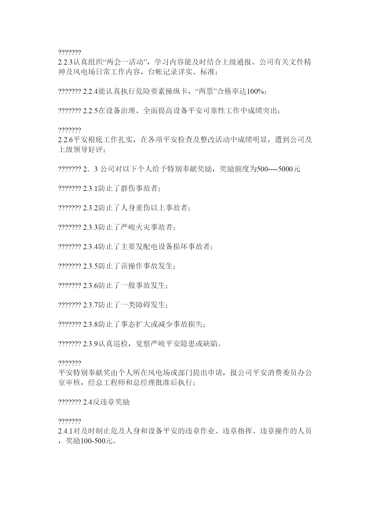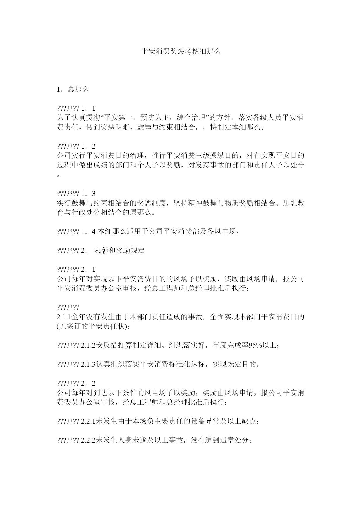 平安消费奖惩考核细那么1.总那么???????1.1为了认真贯彻“平安第一,预防为主,综合治理”的方针,落实各级人员平安消费责任,做到奖惩明晰、鼓舞与约束相结合,,特制定本细那么。???????1.2公司实行平安消费目的治理,推行平安消费三级操纵目的,对在实现平安目的过程中做出成绩的部门和个人予以奖励,对发惹事故的部门和责任人予以处分。???????1.3实行鼓舞与约束相结合的奖惩制度,坚持精神鼓舞与物质奖励相结合、思想教育与行政处分相结合的原那么。???????1.4本细那么适用于公司平安消费部及各风电场。???????2.表彰和奖励规定???????2.1公司每年对实现以下平安消费目的的风场予以奖励,奖励由风场申请,报公司平安消费委员办公室审核,经总工程师和总经理批准后执行;???????2.1.1全年没有发生由于本部门责任造成的事故,全面实现本部门平安消费目的(见签订的平安责任状);???????2.1.2安反措打算制定详细、组织落实好,年度完成率95%以上;???????2.1.3认真组织落实平安消费标准化达标,实现既定目的。???????2.2公司每年对到达以下条件的风电场予以奖励,奖励由风场申请,报公司平安消费委员办公室审核,经总工程师和总经理批准后执行;???????2.2.1未发生由于本场负主要责任的设备异常及以上缺点;???????2.2.2未发生人身未遂及以上事故,没有遭到违章处分;???????2.2.3认真组织“两会一活动”,学习内容能及时结合上级通报、公司有关文件精神及风电场日常工作内容,台帐记录详实、标准;???????2.2.4能认真执行危险要素操纵卡,“两票”合格率达100%;???????2.2.5在设备治理、全面提高设备平安可靠性工作中成绩突出;???????2.2.6平安根底工作扎实,在各项平安检查及整改活动中成绩明显,遭到公司及上级领导好评;???????2.3公司对以下个人给予特别奉献奖励,奖励额度为500----5000元???????2.3.1防止了群伤事故者;???????2.3.2防止了人身重伤以上事故者;???????2.3.3防止了严峻火灾事故者;???????2.3.4防止了主要发配电设备损坏事故者;???????2.3.5防止了误操作事故发生;???????2.3.6防止了一般事故发生;???????2.3.7防止了一类障碍发生;???????2.3.8防止了事态扩大或减少事故损失;???????2.3.9认真巡检,觉察严峻平安隐患或缺陷。???????平安特别奉献奖由个人所在风电场或部门提出申请,报公司平安消费委员办公室审核,经总工程师和总经理批准后执行;???????2.4反违章奖励???????2.4.1对及时制止危及人身和设备平安的违章作业、违章指挥、违章操作的人员,奖励100-500元。???????2.2.2各级人员在任何时间,但凡主动对消费场所和与工作有关的作业场所内违章情况进展检举、制止的人员,奖励100-500元。???????3.处分规定???????3.1原那么:???????公司对平安消费实行责任追查制度。按照《平安消费法》《消费平安事故报告和调查处理条例》的相关规定,结合上级公司相关平安考核对发惹事故的责任者可视情节严峻程度给予相应的行政处分和经济处分。???????3.2?对事故的处分规定:???????3.2.1凡发生一般事故以上事故的,按照事故调查组报告,以及集团公司和能源公司《平安消费治理方法》相关规定执行,触犯法律的由政府主管部门按照法律程序执行。???????3.2.2发生一般事故的,按照事故调查组报告,以及集团公司和能源公司《平安消费治理方法》相关规定,经公司平安委员会按事故责任划分,对事故部门、各级有关责任人进展处分,触犯法律的由政府主管部门按照法律程序执行。???????3.2.2.1发生一般人身死亡事故的对事故部门、各级有关责任人按以下规定予以处分:???????(1)事故主要责任者,给予记大过直至开除,并处以3000-5000元罚款;???????(2)事故部门的主要领导给予降职或撤职处分处以2000-5000元罚款;???????(3)事故次要责任者,给予行政记过处分,待岗6个月,并给以1000-3000元罚款;???????(4)对事故部门负有责任的相关人员按照事故责任大小,给予警告处分、行政记过,并给以500-1000元罚款;???????(5)对事故责任部门给予人均500元罚款。???????(6)平安消费部负有治理责任的领导、专工相关人
