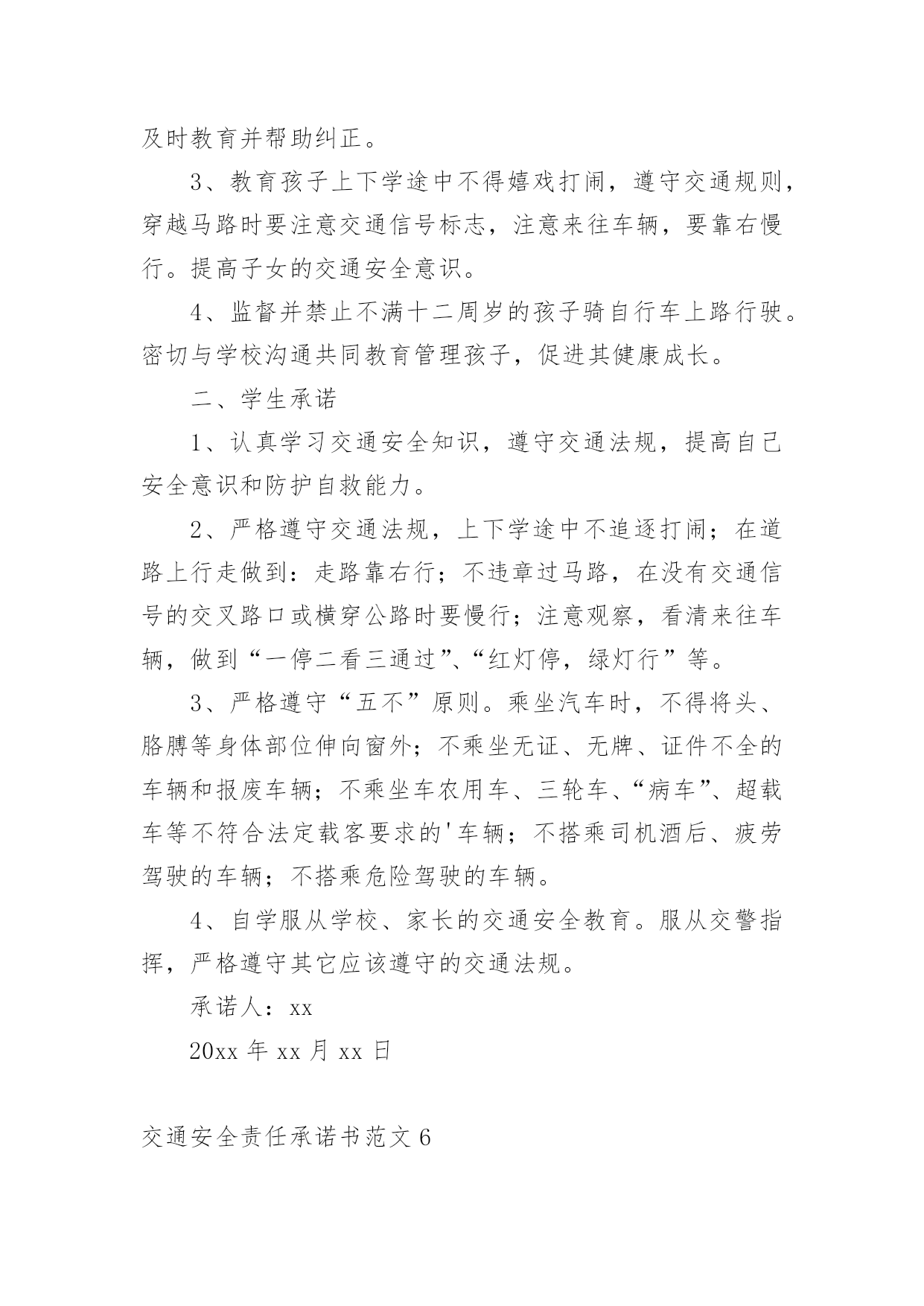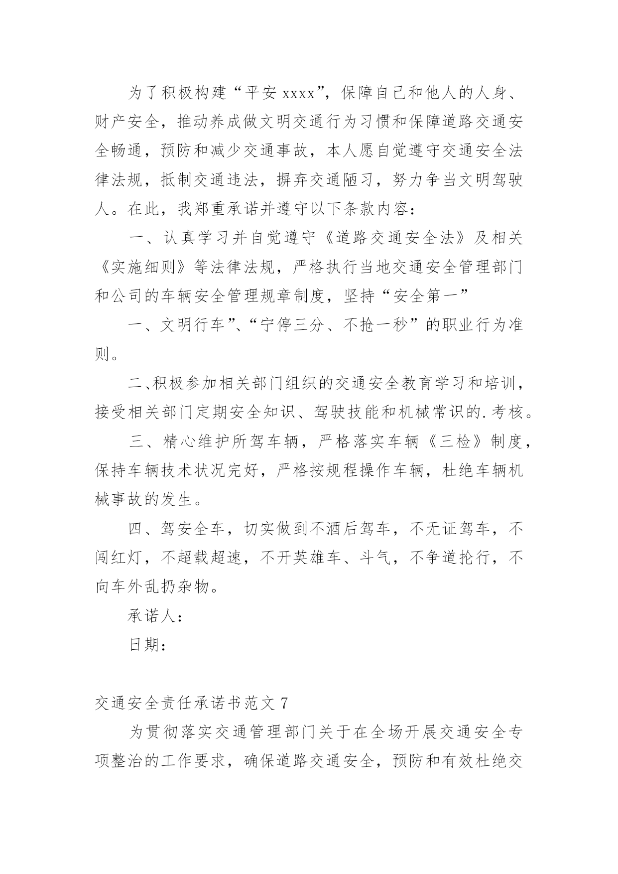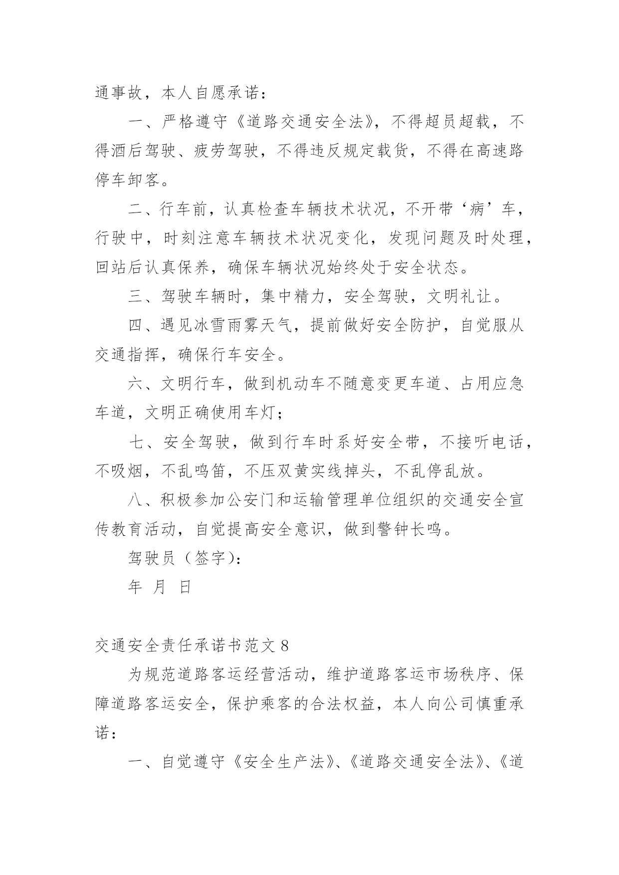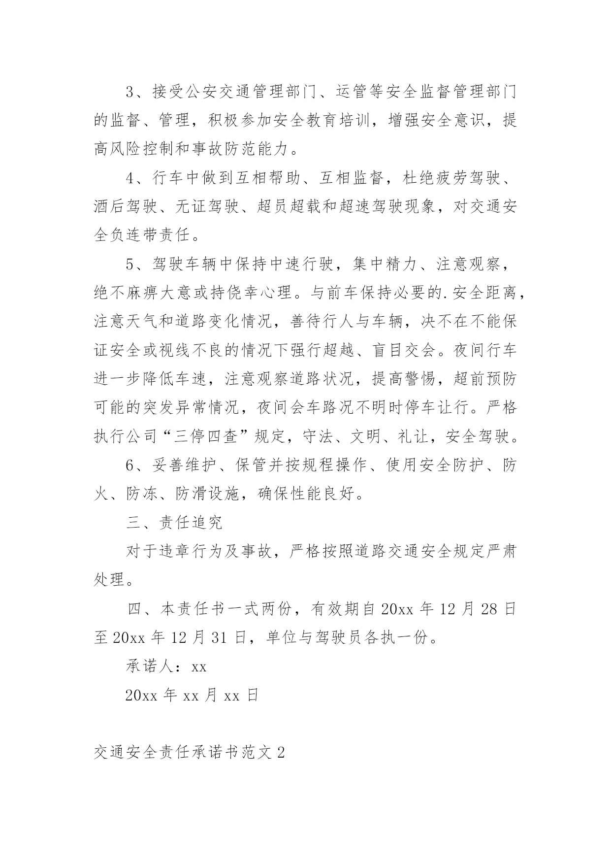 交通安全责任承诺书交通安全责任承诺书范文在充满活力,日益开放的今天,我们使用上承诺书的情况与日俱增,承诺书是承诺人对要约人的要约完全同意的意思,表示以书面形式。相信写承诺书是一个让许多人都头痛的问题,下面是小编精心整理的交通安全责任承诺书范文,欢迎阅读,希望大家能够喜欢。交通安全责任承诺书范文1为贯彻执行《道路交通安全法》及其《实施条例》等安全相关法律、法规和规章制度,落实驾驶员交通安全责任,做好交通安全工作,保障人民生命、健康安全,依据特制定本责任书。一、责任目标:坚持“以人为本”、“安全第一预防为主”的理念和方针,实现零违章、零事故、零伤亡、零损失、零投诉的目标,保障交通安全。二、责任内容:1、严格遵守国家交通安全有关法律、法规和规章制度,自觉抵制“三违”,规范操作行为。2、落实安全承诺,以身作则、率先垂范、安全带头,规范操作、做好交通安全工作;做到本人驾驶的车辆安全运行无事故。3、接受公安交通管理部门、运管等安全监督管理部门的监督、管理,积极参加安全教育培训,增强安全意识,提高风险控制和事故防范能力。4、行车中做到互相帮助、互相监督,杜绝疲劳驾驶、酒后驾驶、无证驾驶、超员超载和超速驾驶现象,对交通安全负连带责任。5、驾驶车辆中保持中速行驶,集中精力、注意观察,绝不麻痹大意或持侥幸心理。与前车保持必要的.安全距离,注意天气和道路变化情况,善待行人与车辆,决不在不能保证安全或视线不良的情况下强行超越、盲目交会。夜间行车进一步降低车速,注意观察道路状况,提高警惕,超前预防可能的突发异常情况,夜间会车路况不明时停车让行。严格执行公司“三停四查”规定,守法、文明、礼让,安全驾驶。6、妥善维护、保管并按规程操作、使用安全防护、防火、防冻、防滑设施,确保性能良好。三、责任追究对于违章行为及事故,严格按照道路交通安全规定严肃处理。四、本责任书一式两份,有效期自20xx年12月28日至20xx年12月31日,单位与驾驶员各执一份。承诺人:xx20xx年xx月xx日交通安全责任承诺书范文2为了贯彻《交通安全法》,切实搞好我村道路交通安全管理工作,防止交通事故的'发生,特制定本《车主交通安全管理目标责任书》。一、所有车辆必须手续齐全,手续不齐全的车辆禁止上路行驶。二、驾驶员必须驾驶证明齐全,准驾的车辆不能无证驾驶、违章操作。三、客车、大货车、农用车、摩托车不准超载、超重,不能客货混装,违章载人。四、严禁未经年审、年审不合格或已报废的车辆在公路上行驶。五、严禁驾驶员酒后驾车。六、驾驶车辆必须注意安全,严禁超速行驶。以上管理责任书自签订之日起必须严格执行,若有违反,将由管理机关按照《交通安全法》有关规定给予处罚。本责任书一式二份,乡政府和车主各执一份。承诺人:xx20xx年xx月xx日交通安全责任承诺书范文3交通文明关系到每一个学生和家庭的幸福,也是现代学生必备的基本素质。为了创建平安、文明寮步,共建有序、安全、畅通的交通环境,我愿意在遵守交通安全方面作出如下郑重承诺:一、认真学习有关交通法规和安全知识,提高自己的安全意识和防护自救能力,时刻提醒自己注意维护自己和他人的交通安全。二、严格遵守行人应该遵守的.交通法规和交通信号,做到“一停二看三通过”,红灯停、绿灯行,杜绝闯红灯、不随意横过马路,走人行横道或过街天桥,不翻越护栏,不横穿绿化带等。三、严格遵守乘车时应该遵守的交通法规,不将头手伸出窗外,上车时不拥挤,遵守“先下后上”规则,文明让座,下车时不急于横过马路。同时,不搭乘超载的车辆,不搭乘车况不好的车辆,不搭乘驾驶员有问题(酒后、疲劳等)的车辆,不搭乘无牌照、报废车辆。四、在公路上行走,要走人行道(离路边不能超1米);没有人行道的要靠右边行走,要注意周围情况,不要东张西望、边走边看书报或做其他事情,不相互追逐、打闹、嬉戏。五、为了自己的安全,家庭的幸福,做到不驾乘电动车自行车上公路。六、积极参加学校、公安开展的交通文明志愿者劝导活动,并监督家长遵守交通法规,做一个讲文明、守交通的现代学生。请各位交警、老师、家长监督。承诺学生(签字):XX承诺家长(签字):XX监督学校:XX幼儿园监督部门:XX交警大队日期:20xx年xx月xx日交通安全责任承诺书范文4为加强公司车辆及驾驶员的管理,使公司车辆高效、安全、有效运行,公司对驾驶员进行了有针对性的驾驶技术与知识培训,进一步提高驾驶员的驾驶技能水平。为保障公共交通安全和公司车辆完好,特制定本责任书。一、责任内容1、驾驶员应树立“安全第一”的思想,严格遵守交通规则,服从交通管理人员指挥,做到文明行车、安全礼让、无违章、无事故。2、公司车辆由公司指定的驾驶员驾驶并统一管理调度,驾驶员必须服从管理,牢固树立服务思想,坚守岗位,不擅离职守,遵守劳动纪律,不搞特殊化。3、积极参加业务学习和安全学习,不断提高