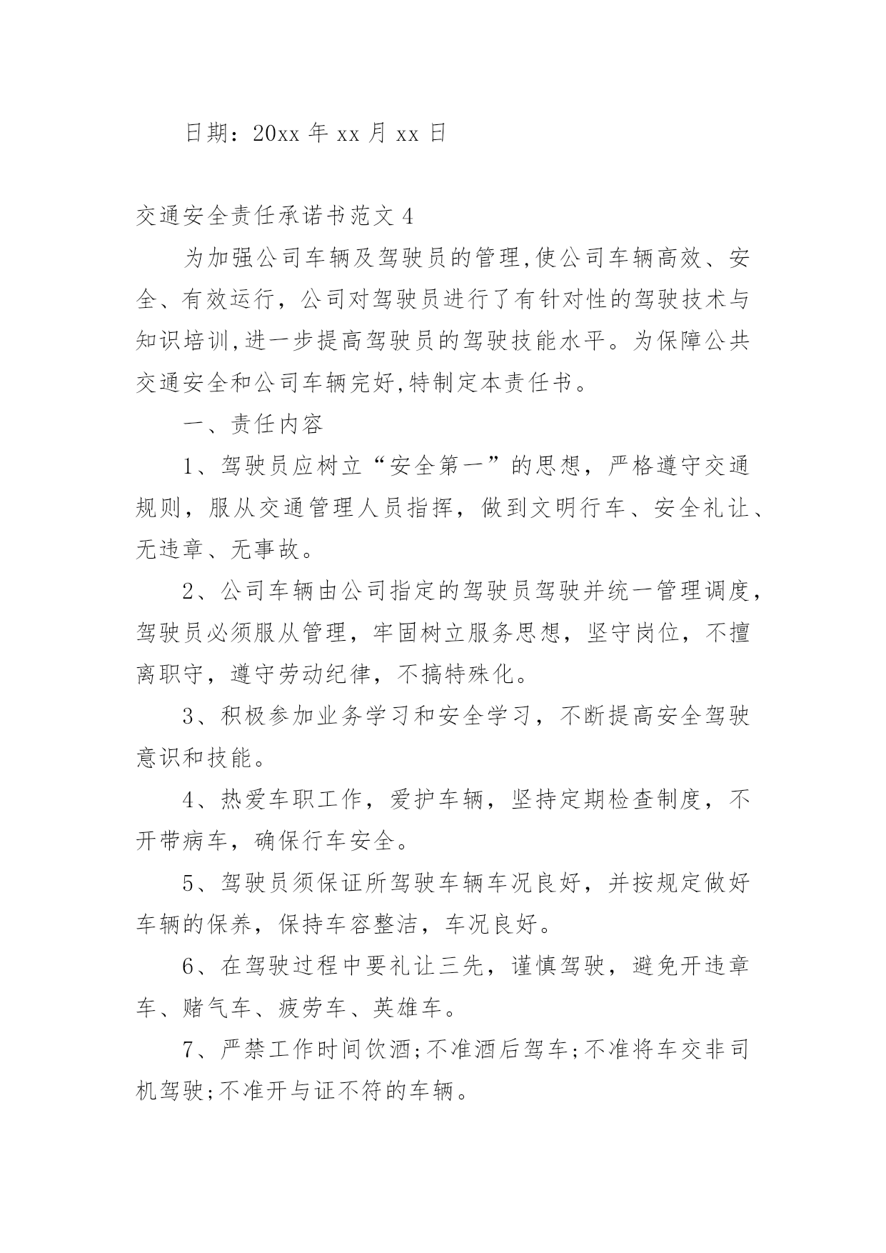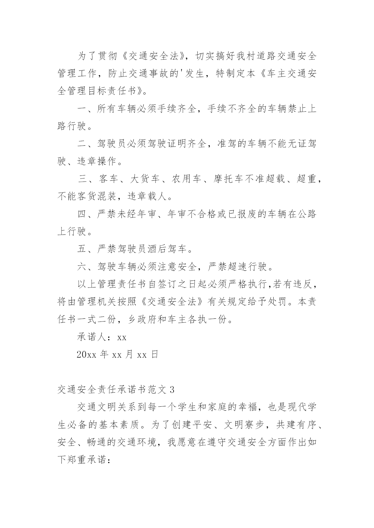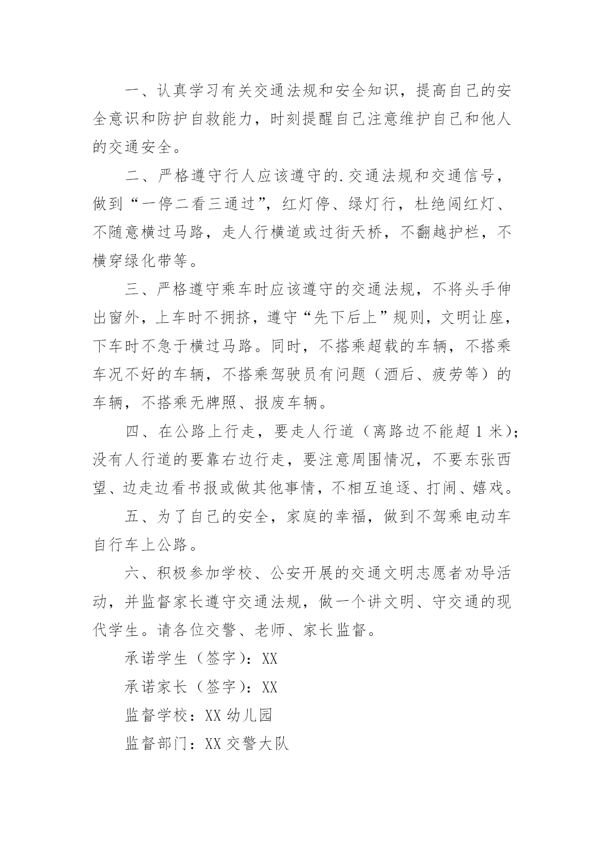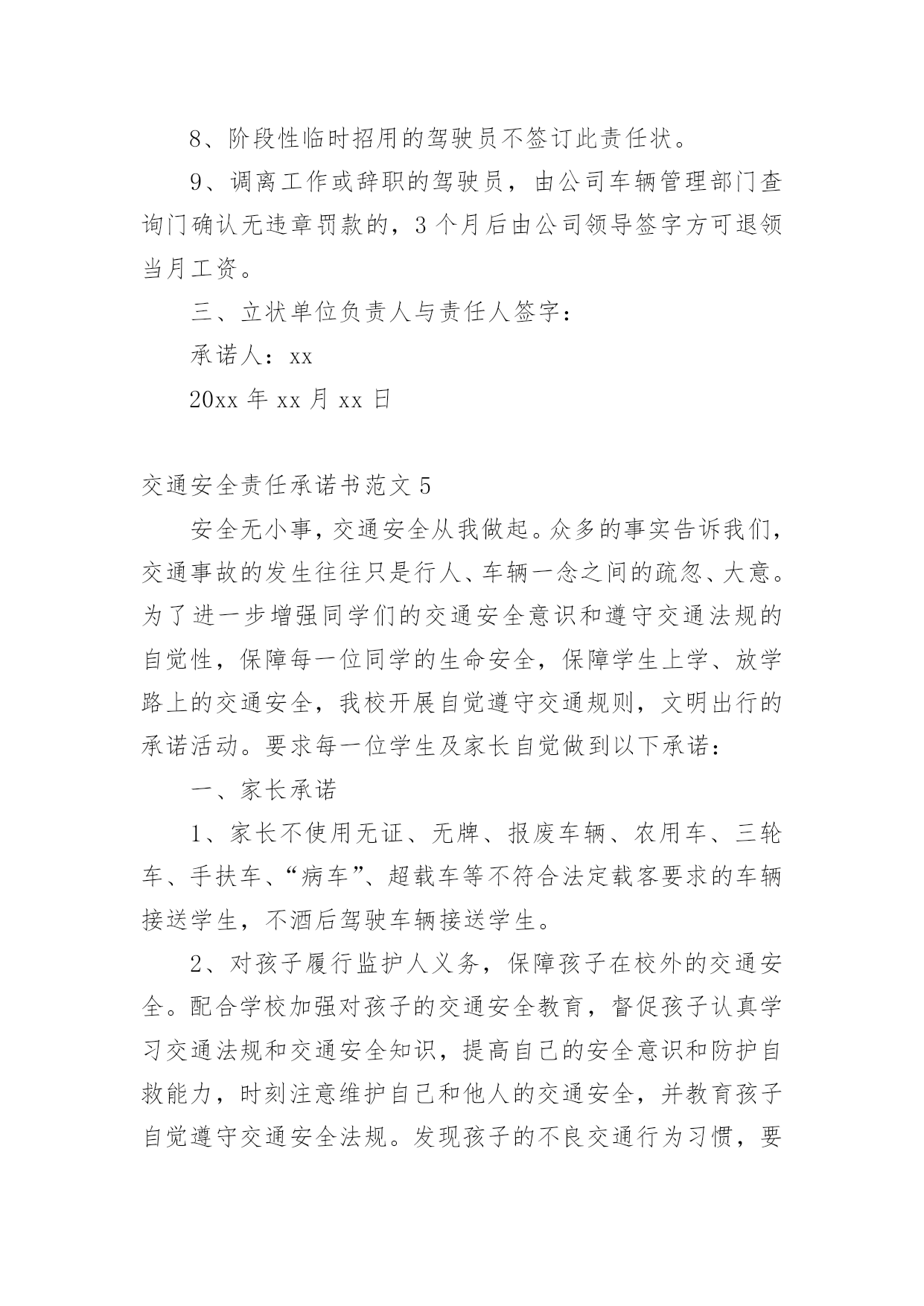 交通安全责任承诺书交通安全责任承诺书范文在充满活力,日益开放的今天,我们使用上承诺书的情况与日俱增,承诺书是承诺人对要约人的要约完全同意的意思,表示以书面形式。相信写承诺书是一个让许多人都头痛的问题,下面是小编精心整理的交通安全责任承诺书范文,欢迎阅读,希望大家能够喜欢。交通安全责任承诺书范文1为贯彻执行《道路交通安全法》及其《实施条例》等安全相关法律、法规和规章制度,落实驾驶员交通安全责任,做好交通安全工作,保障人民生命、健康安全,依据特制定本责任书。一、责任目标:坚持“以人为本”、“安全第一预防为主”的理念和方针,实现零违章、零事故、零伤亡、零损失、零投诉的目标,保障交通安全。二、责任内容:1、严格遵守国家交通安全有关法律、法规和规章制度,自觉抵制“三违”,规范操作行为。2、落实安全承诺,以身作则、率先垂范、安全带头,规范操作、做好交通安全工作;做到本人驾驶的车辆安全运行无事故。3、接受公安交通管理部门、运管等安全监督管理部门的监督、管理,积极参加安全教育培训,增强安全意识,提高风险控制和事故防范能力。4、行车中做到互相帮助、互相监督,杜绝疲劳驾驶、酒后驾驶、无证驾驶、超员超载和超速驾驶现象,对交通安全负连带责任。5、驾驶车辆中保持中速行驶,集中精力、注意观察,绝不麻痹大意或持侥幸心理。与前车保持必要的.安全距离,注意天气和道路变化情况,善待行人与车辆,决不在不能保证安全或视线不良的情况下强行超越、盲目交会。夜间行车进一步降低车速,注意观察道路状况,提高警惕,超前预防可能的突发异常情况,夜间会车路况不明时停车让行。严格执行公司“三停四查”规定,守法、文明、礼让,安全驾驶。6、妥善维护、保管并按规程操作、使用安全防护、防火、防冻、防滑设施,确保性能良好。三、责任追究对于违章行为及事故,严格按照道路交通安全规定严肃处理。四、本责任书一式两份,有效期自20xx年12月28日至20xx年12月31日,单位与驾驶员各执一份。承诺人:xx20xx年xx月xx日交通安全责任承诺书范文2为了贯彻《交通安全法》,切实搞好我村道路交通安全管理工作,防止交通事故的'发生,特制定本《车主交通安全管理目标责任书》。一、所有车辆必须手续齐全,手续不齐全的车辆禁止上路行驶。二、驾驶员必须驾驶证明齐全,准驾的车辆不能无证驾驶、违章操作。三、客车、大货车、农用车、摩托车不准超载、超重,不能客货混装,违章载人。四、严禁未经年审、年审不合格或已报废的车辆在公路上行驶。五、严禁驾驶员酒后驾车。六、驾驶车辆必须注意安全,严禁超速行驶。以上管理责任书自签订之日起必须严格执行,若有违反,将由管理机关按照《交通安全法》有关规定给予处罚。本责任书一式二份,乡政府和车主各执一份。承诺人:xx20xx年xx月xx日交通安全责任承诺书范文3交通文明关系到每一个学生和家庭的幸福,也是现代学生必备的基本素质。为了创建平安、文明寮步,共建有序、安全、畅通的交通环境,我愿意在遵守交通安全方面作出如下郑重承诺:一、认真学习有关交通法规和安全知识,提高自己的安全意识和防护自救能力,时刻提醒自己注意维护自己和他人的交通安全。二、严格遵守行人应该遵守的.交通法规和交通信号,做到“一停二看三通过”,红灯停、绿灯行,杜绝闯红灯、不随意横过马路,走人行横道或过街天桥,不翻越护栏,不横穿绿化带等。三、严格遵守乘车时应该遵守的交通法规,不将头手伸出窗外,上车时不拥挤,遵守“先下后上”规则,文明让座,下车时不急于横过马路。同时,不搭乘超载的车辆,不搭乘车况不好的车辆,不搭乘驾驶员有问题(酒后、疲劳等)的车辆,不搭乘无牌照、报废车辆。四、在公路上行走,要走人行道(离路边不能超1米);没有人行道的要靠右边行走,要注意周围情况,不要东张西望、边走边看书报或做其他事情,不相互追逐、打闹、嬉戏。五、为了自己的安全,家庭的幸福,做到不驾乘电动车自行车上公路。六、积极参加学校、公安开展的交通文明志愿者劝导活动,并监督家长遵守交通法规,做一个讲文明、守交通的现代学生。请各位交警、老师、家长监督。承诺学生(签字):XX承诺家长(签字):XX监督学校:XX幼儿园监督部门:XX交警大队日期:20xx年xx月xx日交通安全责任承诺书范文4为加强公司车辆及驾驶员的管理,使公司车辆高效、安全、有效运行,公司对驾驶员进行了有针对性的驾驶技术与知识培训,进一步提高驾驶员的驾驶技能水平。为保障公共交通安全和公司车辆完好,特制定本责任书。一、责任内容1、驾驶员应树立“安全第一”的思想,严格遵守交通规则,服从交通管理人员指挥,做到文明行车、安全礼让、无违章、无事故。2、公司车辆由公司指定的驾驶员驾驶并统一管理调度,驾驶员必须服从管理,牢固树立服务思想,坚守岗位,不擅离职守,遵守劳动纪律,不搞特殊化。3、积极参加业务学习和安全学习,不断提高