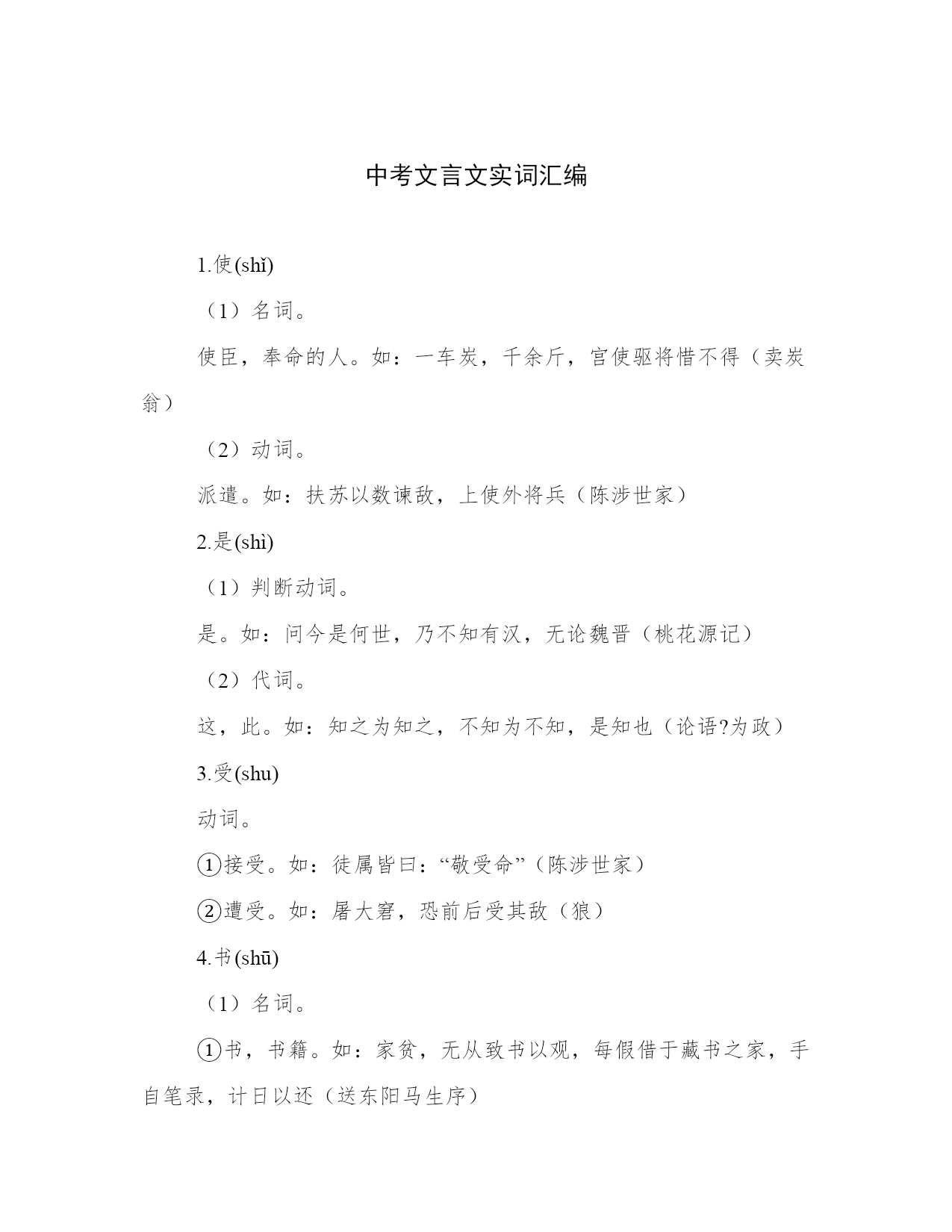 中考文言文实词汇编1.使(shǐ)(1)名词。使臣,奉命的人。如:一车炭,千余斤,宫使驱将惜不得(卖炭翁)(2)动词。派遣。如:扶苏以数谏敌,上使外将兵(陈涉世家)2.是(shì)(1)判断动词。是。如:问今是何世,乃不知有汉,无论魏晋(桃花源记)(2)代词。这,此。如:知之为知之,不知为不知,是知也(论语?为政)3.受(shu)动词。①接受。如:徒属皆曰:“敬受命”(陈涉世家)②遭受。如:屠大窘,恐前后受其敌(狼)4.书(shū)(1)名词。①书,书籍。如:家贫,无从致书以观,每假借于藏书之家,手自笔录,计日以还(送东阳马生序)②书信。如:烽火连三月,家书抵万金(春望)③公文。如:军书十二卷,卷卷有爷名(木兰诗)