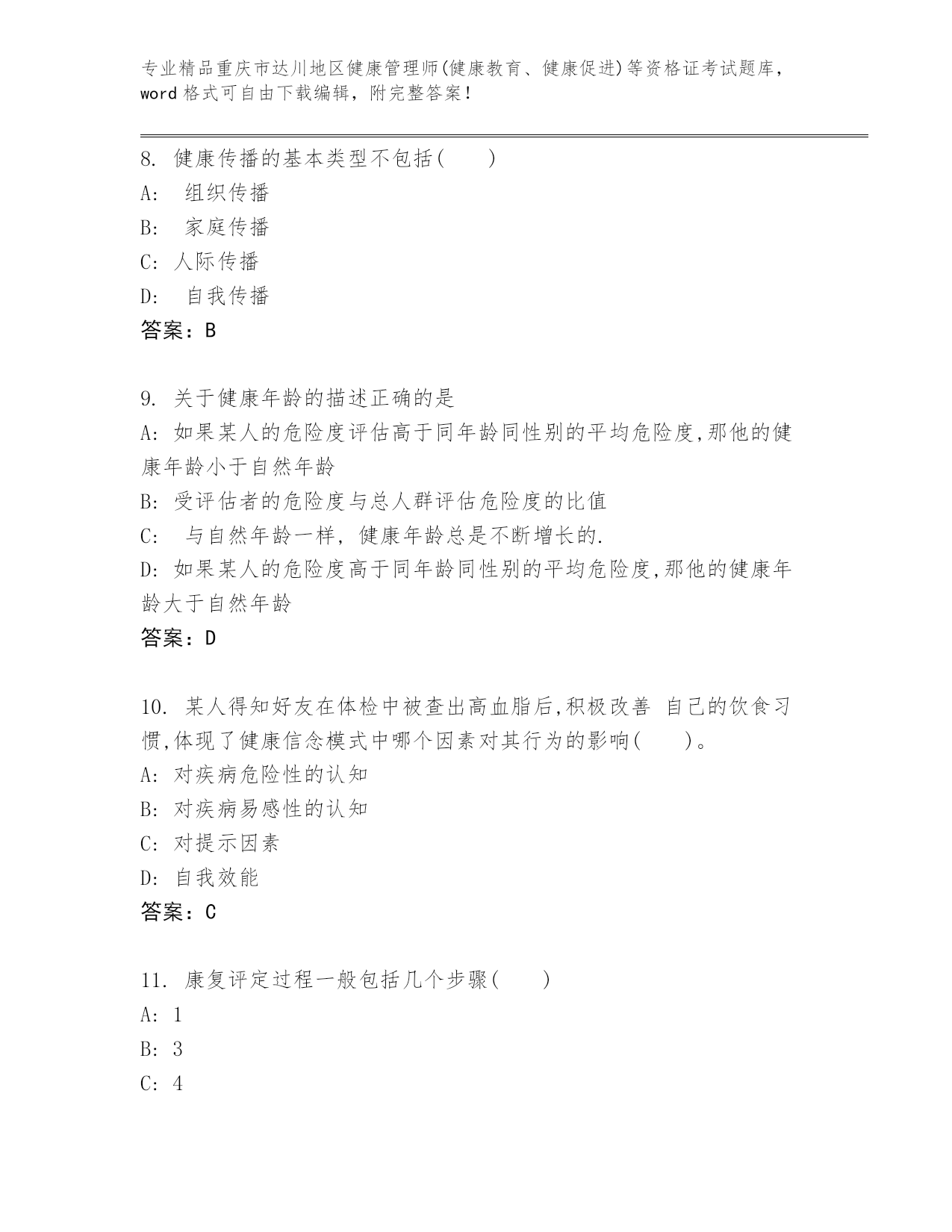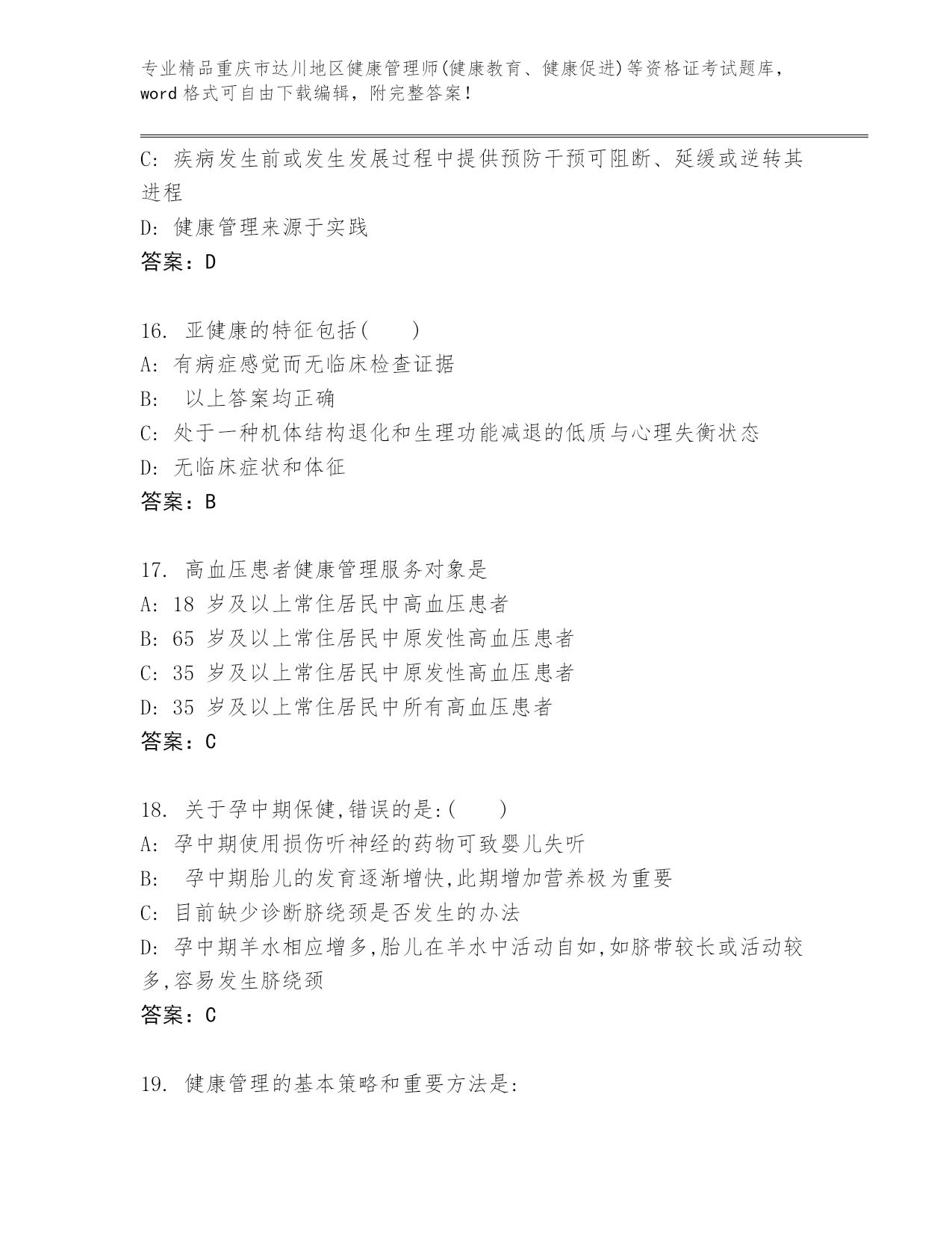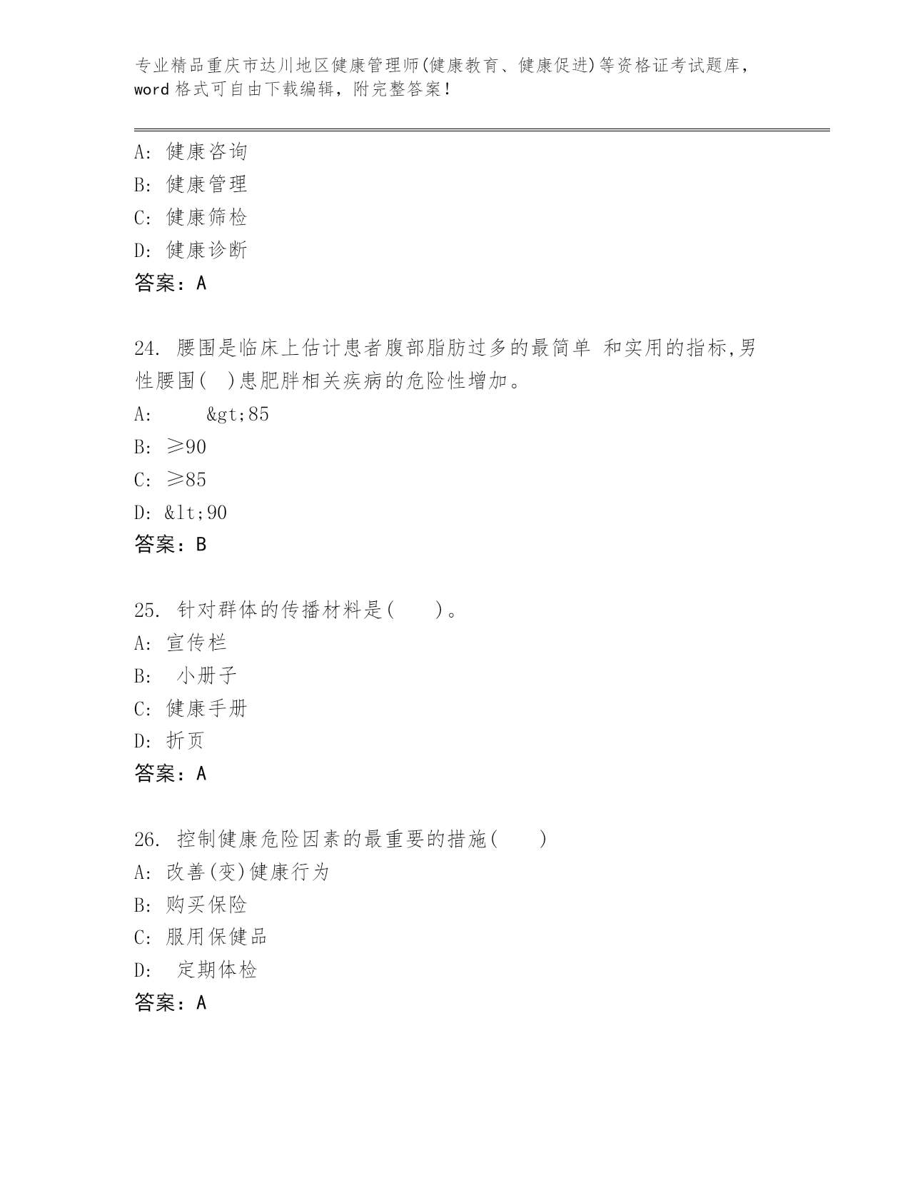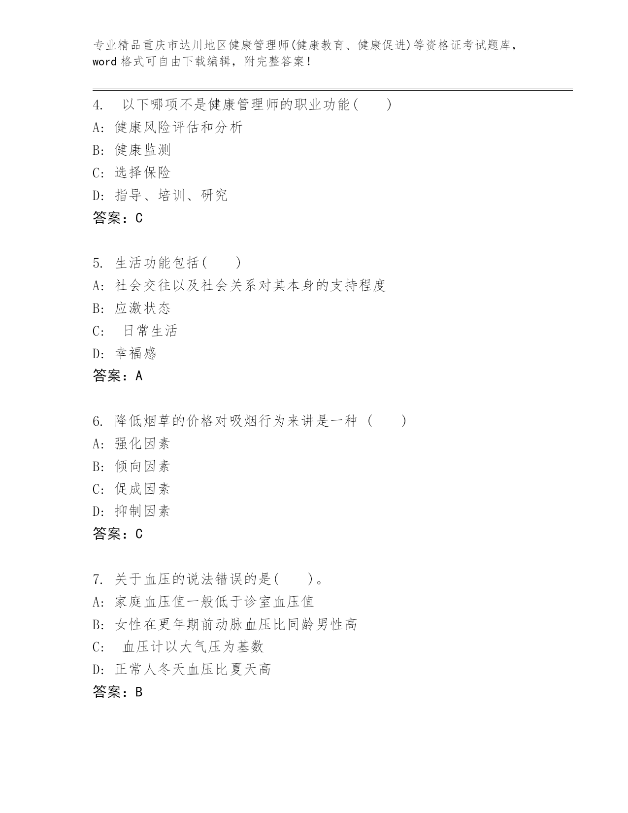 历年重庆市达川地区健康管理师(健康教育、健康促进)等资格证考试完整题库(培优A卷).docx