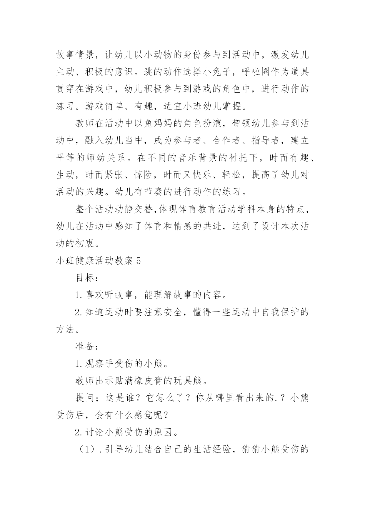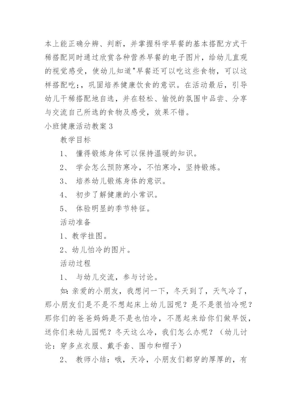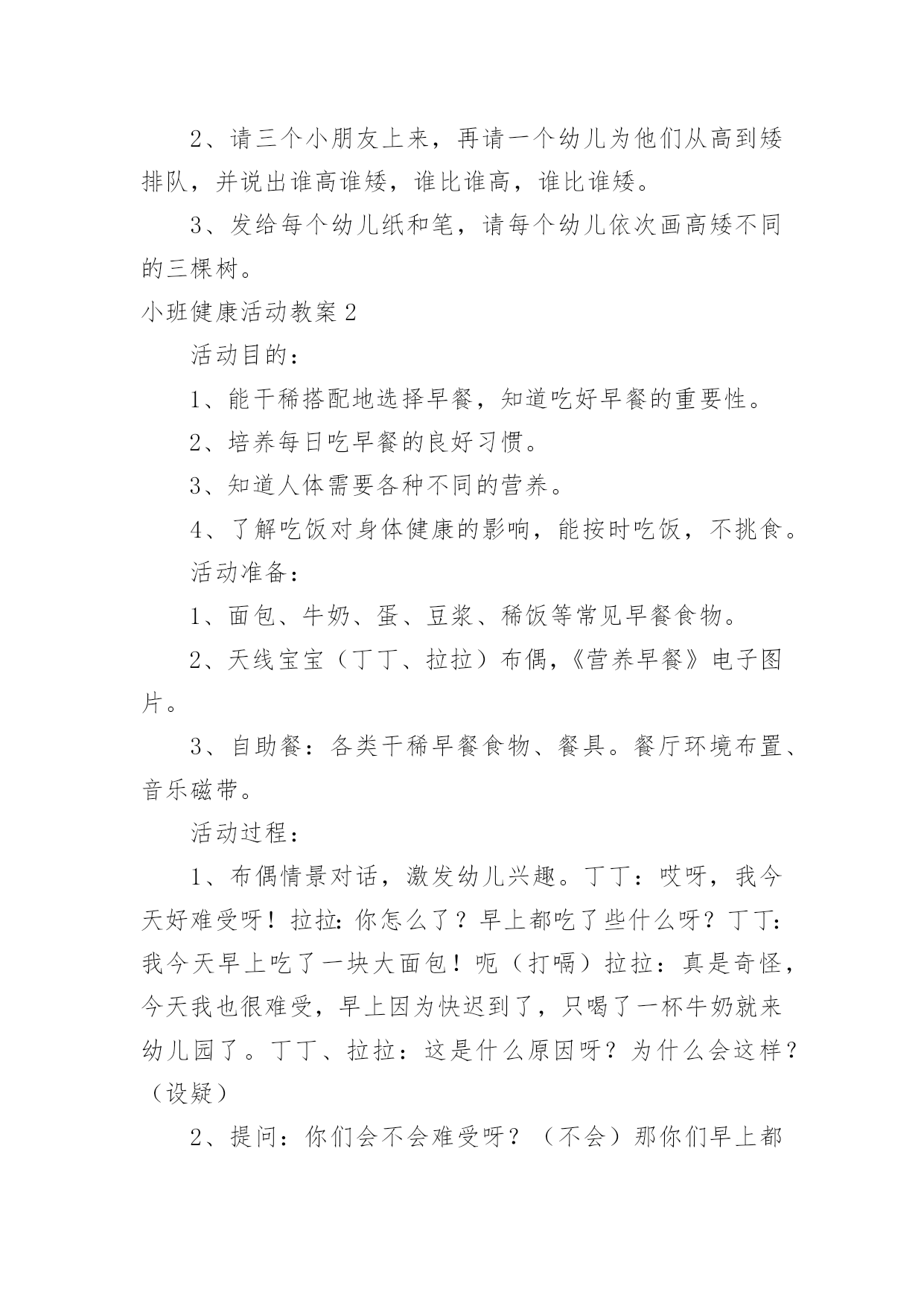小班健康活动教案小班健康活动教案作为一名辛苦耕耘的教育工作者,时常需要用到教案,借助教案可以提高教学质量,收到预期的教学效果。那么优秀的教案是什么样的呢?下面是小编为大家收集的小班健康活动教案,欢迎阅读,希望大家能够喜欢。小班健康活动教案1教学目的:1、教会幼儿区别高矮,初步掌握高矮的相对关系。2、教幼儿一些简单的比较方法,发展幼儿观察、比较、判断能力。重点:区别高矮和一样高及学习比较高矮的方法。难点:理解高矮的相对关系。准备:课件三副、布一块、日常生活中能比较高矮的实物若干过程:一、教幼儿区别高矮和一样高1、出示课件一,图为由于生活习惯不同,健康情况不同,长得高矮不同的两个娈生姐妹,让幼儿通过观察比较,找出她们的不同点(结合卫生习惯教育引入高和矮)。2、逐一出示实物,让幼儿比一比,谁高谁矮,还是一样高。3、请两个小朋友上来比比谁高谁矮,还是一样高,再请全体幼儿互相比比,谁高谁矮,还是一样高。4、请幼儿说说自己熟悉的东西中什么是可以比较高矮的。二、教幼儿一些比较高矮的方法1、请一高一矮两个小朋友,矮的站在凳子上,前面用一块布遮住,让幼儿判断,谁高谁矮。当幼儿发生错觉时,揭开谜底,并告诉幼儿比较高矮时要把物体放在同一高度。2、出示课件二,图上有一棵树距离近,一棵树距离远,让幼儿判断树的高矮,当幼儿发生争论时,拉回较远的那棵树,让幼儿再次进行比较,然后告诉幼儿比较高矮时,要把物体放在相近的地方,否则不确。3、出示课件三,一只长颈鹿在地上,一只猴子爬到树顶,猴子低下头对长颈鹿说:瞧!我长得比你高。提问:猴子的话对吗?为什么?三、告诉幼儿简单的高矮的.相对关系1、请一高一矮两个小朋友比较,再让高的小朋友跟老师比较或让矮的跟更矮的小朋友比较,使幼儿知道:高的小朋友跟矮的小朋友比是高的,跟老师比是矮的,矮的小朋友跟高的小朋友比是矮的,但跟更矮的小朋友比是高的。告诉幼儿单独的某样东西是不能定高矮的,要看它跟什么比较。2、请三个小朋友上来,再请一个幼儿为他们从高到矮排队,并说出谁高谁矮,谁比谁高,谁比谁矮。3、发给每个幼儿纸和笔,请每个幼儿依次画高矮不同的三棵树。小班健康活动教案2活动目的:1、能干稀搭配地选择早餐,知道吃好早餐的重要性。2、培养每日吃早餐的良好习惯。3、知道人体需要各种不同的营养。4、了解吃饭对身体健康的影响,能按时吃饭,不挑食。活动准备:1、面包、牛奶、蛋、豆浆、稀饭等常见早餐食物。2、天线宝宝(丁丁、拉拉)布偶,《营养早餐》电子图片。3、自助餐:各类干稀早餐食物、餐具。餐厅环境布置、音乐磁带。活动过程:1、布偶情景对话,激发幼儿兴趣。丁丁:哎呀,我今天好难受呀!拉拉:你怎么了?早上都吃了些什么呀?丁丁:我今天早上吃了一块大面包!呃(打嗝)拉拉:真是奇怪,今天我也很难受,早上因为快迟到了,只喝了一杯牛奶就来幼儿园了。丁丁、拉拉:这是什么原因呀?为什么会这样?(设疑)2、提问:你们会不会难受呀?(不会)那你们早上都吃了些什么呢?3、幼儿回答,教师一一出示幼儿所说的食物。4、引导幼儿将出示的各种食物按干稀分类。通过观察、比较、分类,发现食物这些可以分成干稀两类。5、讨论解疑:为什么丁丁和拉拉会难受呢?结合生活经验理解科学早餐的基本搭配方法――干稀搭配。6、欣赏活动:营养早餐。(1)知道早餐的食物很丰富,可以有许多种的搭配方法,还可以在早餐后吃一点水果,均衡营养。(2)师生讨论、总结:知道吃早餐的重要性,每天都要吃早餐才会身体健康。7、品尝、交流:自助餐。在柔和的音乐声中,幼儿根据干稀搭配原则,自由选择8、活动延伸:家园配合,在日常生活中,帮助幼儿形成每天吃早餐的'健康意识,并与幼儿一起合理搭配营养早餐。观察反思:最近,我们发现有一部分幼儿早上起床晚了,随便吃点东西填饱肚子(甚至不吃早餐)就来上幼儿园了,这严重地影响了幼儿的身体健康。为了帮助幼儿了解早餐的重要性,养成每天吃早餐的良好习惯,我通过健康领域与科学领域的有效整合,开展了这一活动。这个活动,根据小班幼儿的年龄特点,选择以能干稀搭配地选择早餐;为活动重点,开展活动。在活动中,通过直观地对各种早餐食物进行干稀分类,幼儿对;这两个类别的概念有了较好的认识,基本上能正确分辨、判断,并掌握科学早餐的基本搭配方式干稀搭配同时通过欣赏各种营养早餐的电子图片,给幼儿直观的视觉感受,使幼儿知道"早餐还可以吃这些食物,可以这样搭配吃;,巩固培养健康饮食的意识。在活动最后,引导幼儿干稀搭配地自选,并在轻松、愉悦的氛围中品尝、分享与交流自己所选的食物及感受,效果不错。小班健康活动教案3教学目标1、懂得锻炼身体可以保持温暖的知识。2、学会怎么预防寒冷,不怕寒冷,坚持锻炼。3、培养幼儿锻炼身体的意识。4、初步了解健康的小常识。5、体验明显的季节特征。活动准备1、教学挂图。2、幼儿怕冷的图片。活
