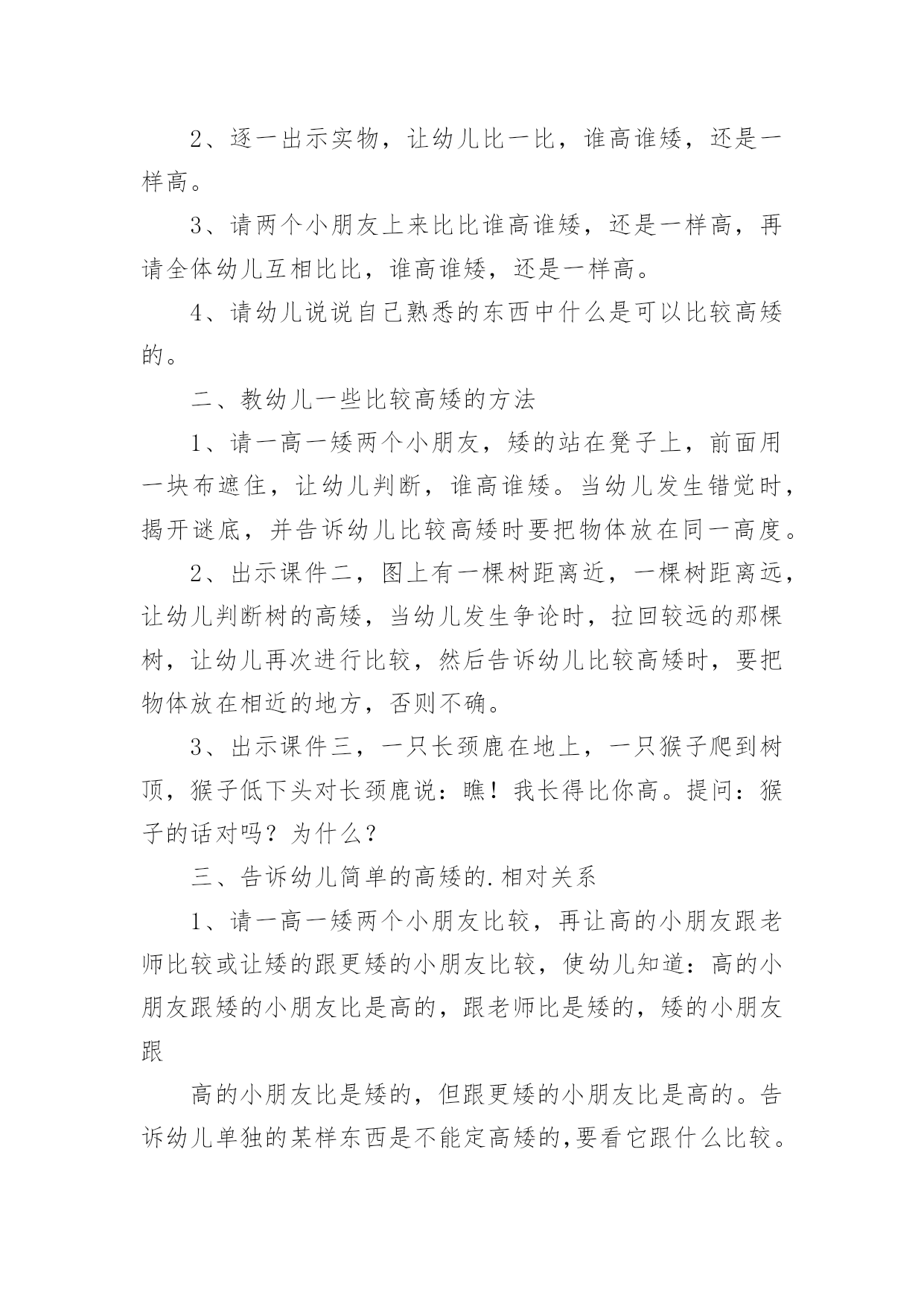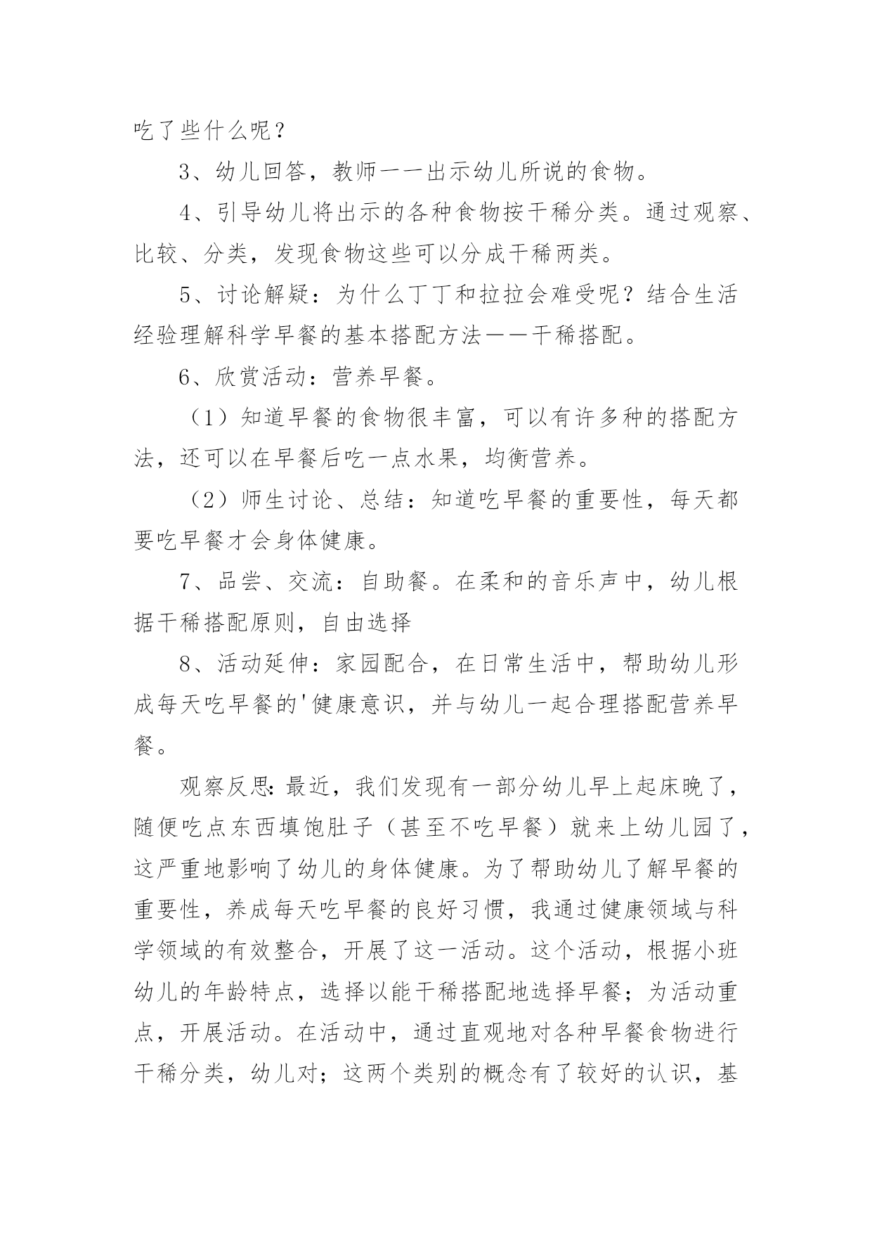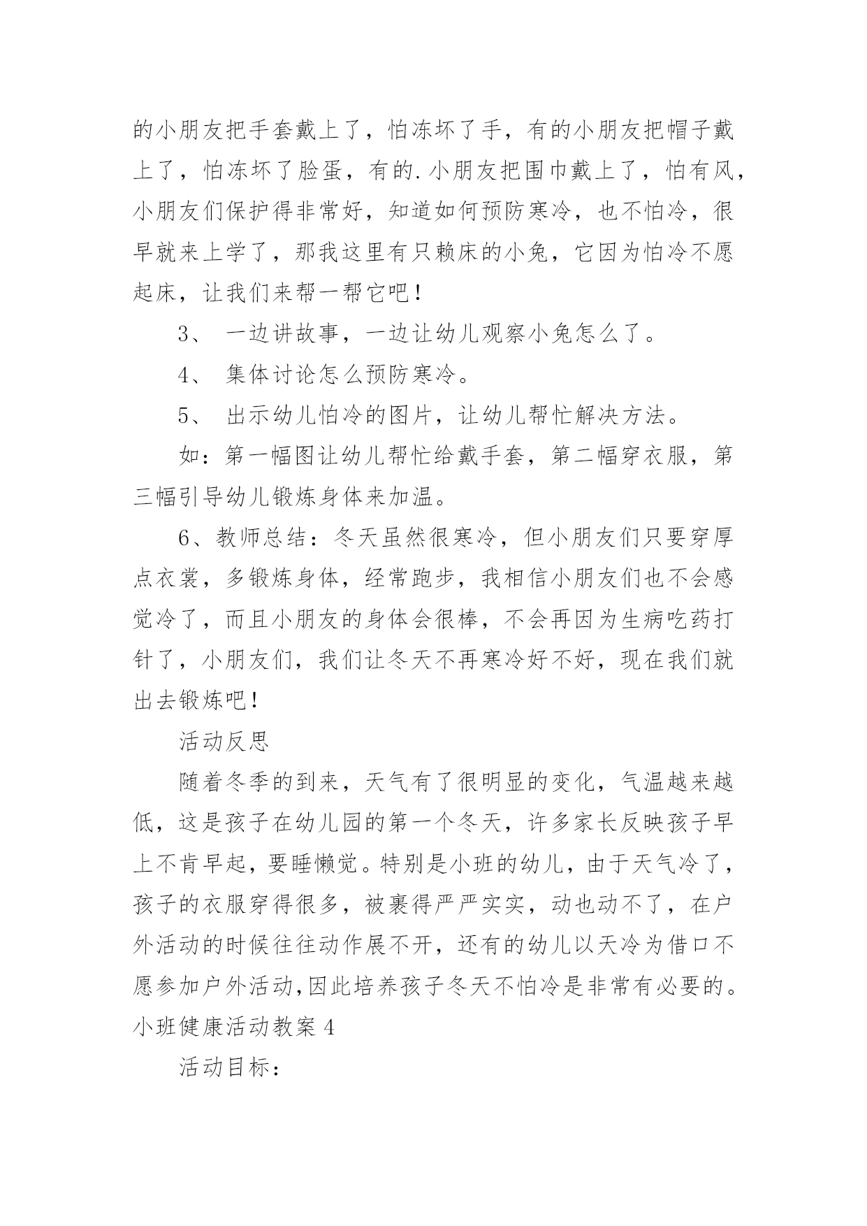 小班健康活动教案小班健康活动教案作为一名辛苦耕耘的教育工作者,时常需要用到教案,借助教案可以提高教学质量,收到预期的教学效果。那么优秀的教案是什么样的呢?下面是小编为大家收集的小班健康活动教案,欢迎阅读,希望大家能够喜欢。小班健康活动教案1教学目的:1、教会幼儿区别高矮,初步掌握高矮的相对关系。2、教幼儿一些简单的比较方法,发展幼儿观察、比较、判断能力。重点:区别高矮和一样高及学习比较高矮的方法。难点:理解高矮的相对关系。准备:课件三副、布一块、日常生活中能比较高矮的实物若干过程:一、教幼儿区别高矮和一样高1、出示课件一,图为由于生活习惯不同,健康情况不同,长得高矮不同的两个娈生姐妹,让幼儿通过观察比较,找出她们的不同点(结合卫生习惯教育引入高和矮)。2、逐一出示实物,让幼儿比一比,谁高谁矮,还是一样高。3、请两个小朋友上来比比谁高谁矮,还是一样高,再请全体幼儿互相比比,谁高谁矮,还是一样高。4、请幼儿说说自己熟悉的东西中什么是可以比较高矮的。二、教幼儿一些比较高矮的方法1、请一高一矮两个小朋友,矮的站在凳子上,前面用一块布遮住,让幼儿判断,谁高谁矮。当幼儿发生错觉时,揭开谜底,并告诉幼儿比较高矮时要把物体放在同一高度。2、出示课件二,图上有一棵树距离近,一棵树距离远,让幼儿判断树的高矮,当幼儿发生争论时,拉回较远的那棵树,让幼儿再次进行比较,然后告诉幼儿比较高矮时,要把物体放在相近的地方,否则不确。3、出示课件三,一只长颈鹿在地上,一只猴子爬到树顶,猴子低下头对长颈鹿说:瞧!我长得比你高。提问:猴子的话对吗?为什么?三、告诉幼儿简单的高矮的.相对关系1、请一高一矮两个小朋友比较,再让高的小朋友跟老师比较或让矮的跟更矮的小朋友比较,使幼儿知道:高的小朋友跟矮的小朋友比是高的,跟老师比是矮的,矮的小朋友跟高的小朋友比是矮的,但跟更矮的小朋友比是高的。告诉幼儿单独的某样东西是不能定高矮的,要看它跟什么比较。2、请三个小朋友上来,再请一个幼儿为他们从高到矮排队,并说出谁高谁矮,谁比谁高,谁比谁矮。3、发给每个幼儿纸和笔,请每个幼儿依次画高矮不同的三棵树。小班健康活动教案2活动目的:1、能干稀搭配地选择早餐,知道吃好早餐的重要性。2、培养每日吃早餐的良好习惯。3、知道人体需要各种不同的营养。4、了解吃饭对身体健康的影响,能按时吃饭,不挑食。活动准备:1、面包、牛奶、蛋、豆浆、稀饭等常见早餐食物。2、天线宝宝(丁丁、拉拉)布偶,《营养早餐》电子图片。3、自助餐:各类干稀早餐食物、餐具。餐厅环境布置、音乐磁带。活动过程:1、布偶情景对话,激发幼儿兴趣。丁丁:哎呀,我今天好难受呀!拉拉:你怎么了?早上都吃了些什么呀?丁丁:我今天早上吃了一块大面包!呃(打嗝)拉拉:真是奇怪,今天我也很难受,早上因为快迟到了,只喝了一杯牛奶就来幼儿园了。丁丁、拉拉:这是什么原因呀?为什么会这样?(设疑)2、提问:你们会不会难受呀?(不会)那你们早上都吃了些什么呢?3、幼儿回答,教师一一出示幼儿所说的食物。4、引导幼儿将出示的各种食物按干稀分类。通过观察、比较、分类,发现食物这些可以分成干稀两类。5、讨论解疑:为什么丁丁和拉拉会难受呢?结合生活经验理解科学早餐的基本搭配方法――干稀搭配。6、欣赏活动:营养早餐。(1)知道早餐的食物很丰富,可以有许多种的搭配方法,还可以在早餐后吃一点水果,均衡营养。(2)师生讨论、总结:知道吃早餐的重要性,每天都要吃早餐才会身体健康。7、品尝、交流:自助餐。在柔和的音乐声中,幼儿根据干稀搭配原则,自由选择8、活动延伸:家园配合,在日常生活中,帮助幼儿形成每天吃早餐的'健康意识,并与幼儿一起合理搭配营养早餐。观察反思:最近,我们发现有一部分幼儿早上起床晚了,随便吃点东西填饱肚子(甚至不吃早餐)就来上幼儿园了,这严重地影响了幼儿的身体健康。为了帮助幼儿了解早餐的重要性,养成每天吃早餐的良好习惯,我通过健康领域与科学领域的有效整合,开展了这一活动。这个活动,根据小班幼儿的年龄特点,选择以能干稀搭配地选择早餐;为活动重点,开展活动。在活动中,通过直观地对各种早餐食物进行干稀分类,幼儿对;这两个类别的概念有了较好的认识,基本上能正确分辨、判断,并掌握科学早餐的基本搭配方式干稀搭配同时通过欣赏各种营养早餐的电子图片,给幼儿直观的视觉感受,使幼儿知道"早餐还可以吃这些食物,可以这样搭配吃;,巩固培养健康饮食的意识。在活动最后,引导幼儿干稀搭配地自选,并在轻松、愉悦的氛围中品尝、分享与交流自己所选的食物及感受,效果不错。小班健康活动教案3教学目标1、懂得锻炼身体可以保持温暖的知识。2、学会怎么预防寒冷,不怕寒冷,坚持锻炼。3、培养幼儿锻炼身体的意识。4、初步了解健康的小常识。5、体验明显的季节特征。活动准备1、教学挂图。2、幼儿怕冷的图片。活