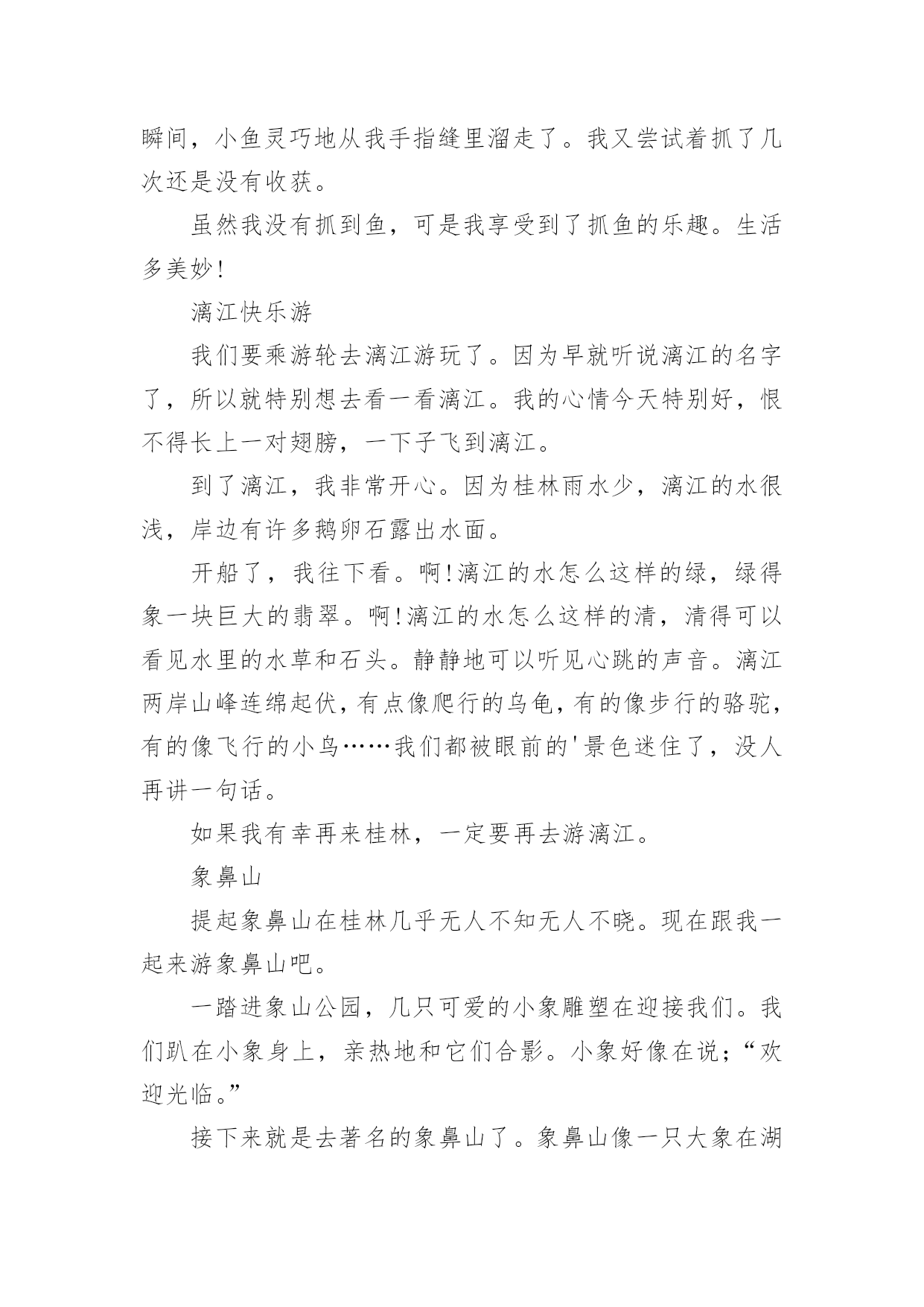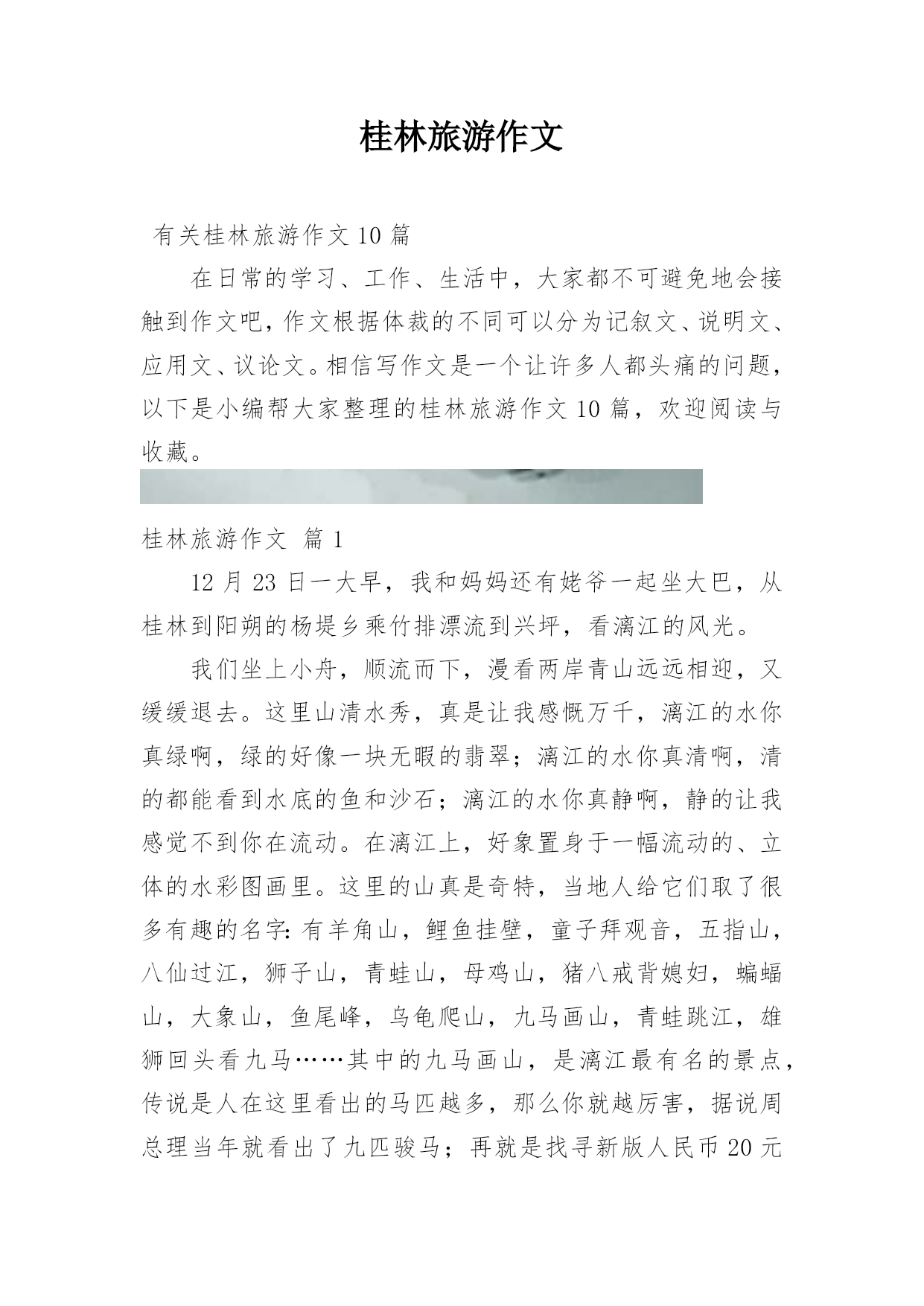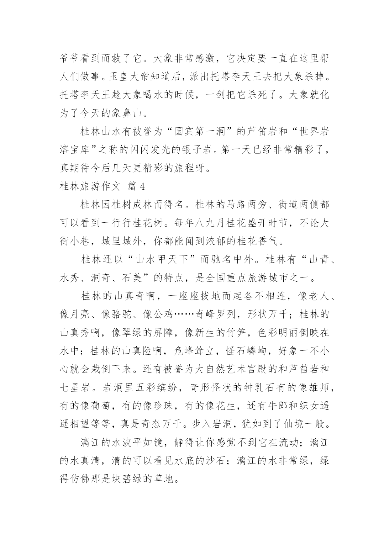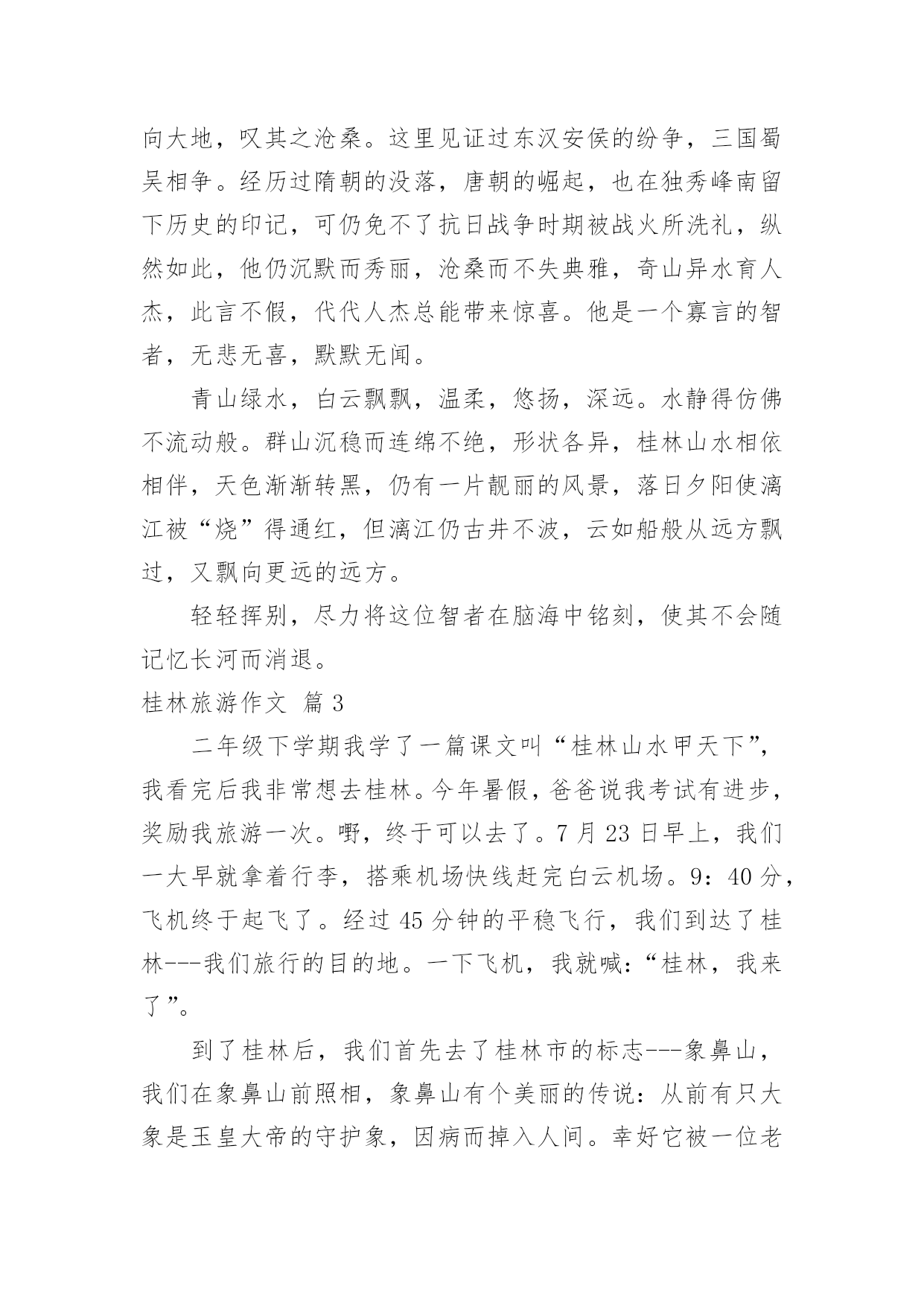 桂林旅游作文有关桂林旅游作文10篇在日常的学习、工作、生活中,大家都不可避免地会接触到作文吧,作文根据体裁的不同可以分为记叙文、说明文、应用文、议论文。相信写作文是一个让许多人都头痛的问题,以下是小编帮大家整理的桂林旅游作文10篇,欢迎阅读与收藏。桂林旅游作文篇112月23日一大早,我和妈妈还有姥爷一起坐大巴,从桂林到阳朔的杨堤乡乘竹排漂流到兴坪,看漓江的风光。我们坐上小舟,顺流而下,漫看两岸青山远远相迎,又缓缓退去。这里山清水秀,真是让我感慨万千,漓江的水你真绿啊,绿的好像一块无暇的翡翠;漓江的水你真清啊,清的都能看到水底的鱼和沙石;漓江的水你真静啊,静的让我感觉不到你在流动。在漓江上,好象置身于一幅流动的、立体的水彩图画里。这里的山真是奇特,当地人给它们取了很多有趣的名字:有羊角山,鲤鱼挂壁,童子拜观音,五指山,八仙过江,狮子山,青蛙山,母鸡山,猪八戒背媳妇,蝙蝠山,大象山,鱼尾峰,乌龟爬山,九马画山,青蛙跳江,雄狮回头看九马……其中的九马画山,是漓江最有名的景点,传说是人在这里看出的马匹越多,那么你就越厉害,据说周总理当年就看出了九匹骏马;再就是找寻新版人民币20元的背面的那段漓江风景,我们来的这天,水雾比较大,很遗憾,我没有看出来,不过,这么美的地方我以后还会再来游玩的。桂林山水甲天下,桂林真是名不虚传啊!桂林旅游作文篇2清风徐徐,清秀群山,我站在码头,感受清风所带来的和煦,漓江岸边,微波点点,几处莺燕轻展羽翼,带着几丛野草跟随风的旋律,丛丛野草在明镜中摇曳,处处莺燕在天际间洒下点点波澜。桂林,广西之东北。在这里,注视着秀丽的水,仰望这清秀的山。将目光投向宛如碧色宝石的天,为其而惊叹。桂林,南岭之西南。在这里,漓江有了归属,只有如此清秀的群山,才能配的上出漓江之秀丽。在这里,群山体现了应有的价值,只有如此清澈的水才能与其而共存于如此景色中。这样的水照映着这样的山,这样的山又围绕着这样的水。无数匆匆过客在此停下忙碌的脚步,无需庸庸碌碌,只需驻足静静欣赏。这样的桂林,注定有“桂林山水甲天下”的美誉。于是,遥想几十年前的这里,有过出自百越人之手的青铜器浑厚凝重,繁缛富丽,这片土地见证过无数青铜器由诞生到隐匿而不知下落。后又有秦始皇置其与象和南海为三郡,无数旅人怀揣着各自的梦想而来到这里,在如此秀丽的景象中为之拼搏,将脚印留在身后。也有无数旅人,经历风尘,漫漫跋涉,看到了葱郁景色后,止步于此,播种希望。这里,就是桂林,抬头仰望天空,看其之碧蓝,低头瞭向大地,叹其之沧桑。这里见证过东汉安侯的纷争,三国蜀吴相争。经历过隋朝的没落,唐朝的崛起,也在独秀峰南留下历史的印记,可仍免不了抗日战争时期被战火所洗礼,纵然如此,他仍沉默而秀丽,沧桑而不失典雅,奇山异水育人杰,此言不假,代代人杰总能带来惊喜。他是一个寡言的智者,无悲无喜,默默无闻。青山绿水,白云飘飘,温柔,悠扬,深远。水静得仿佛不流动般。群山沉稳而连绵不绝,形状各异,桂林山水相依相伴,天色渐渐转黑,仍有一片靓丽的风景,落日夕阳使漓江被“烧”得通红,但漓江仍古井不波,云如船般从远方飘过,又飘向更远的远方。轻轻挥别,尽力将这位智者在脑海中铭刻,使其不会随记忆长河而消退。桂林旅游作文篇3二年级下学期我学了一篇课文叫“桂林山水甲天下”,我看完后我非常想去桂林。今年暑假,爸爸说我考试有进步,奖励我旅游一次。嘢,终于可以去了。7月23日早上,我们一大早就拿着行李,搭乘机场快线赶完白云机场。9:40分,飞机终于起飞了。经过45分钟的平稳飞行,我们到达了桂林---我们旅行的目的地。一下飞机,我就喊:“桂林,我来了”。到了桂林后,我们首先去了桂林市的标志---象鼻山,我们在象鼻山前照相,象鼻山有个美丽的传说:从前有只大象是玉皇大帝的守护象,因病而掉入人间。幸好它被一位老爷爷看到而救了它。大象非常感激,它决定要一直在这里帮人们做事。玉皇大帝知道后,派出托塔李天王去把大象杀掉。托塔李天王趁大象喝水的时候,一剑把它杀死了。大象就化为了今天的象鼻山。桂林山水有被誉为“国宾第一洞”的芦笛岩和“世界岩溶宝库”之称的闪闪发光的银子岩。第一天已经非常精彩了,真期待今后几天更精彩的旅程呀。桂林旅游作文篇4桂林因桂树成林而得名。桂林的马路两旁、街道两侧都可以看到一行行桂花树。每年八九月桂花盛开时节,不论大街小巷,城里城外,你都能闻到浓郁的桂花香气。桂林还以“山水甲天下”而驰名中外。桂林有“山青、水秀、洞奇、石美”的特点,是全国重点旅游城市之一。桂林的山真奇啊,一座座拔地而起各不相连,像老人、像月亮、像骆驼、像公鸡……奇峰罗列,形状万千;桂林的山真秀啊,像翠绿的屏障,像新生的竹笋,色彩明丽倒映在水中;桂林的山真险啊,危峰耸立,怪石嶙峋,好象一不小心就会栽倒下来。还有被誉为大自然艺术宫殿的和芦笛岩和七星岩。岩洞里五彩