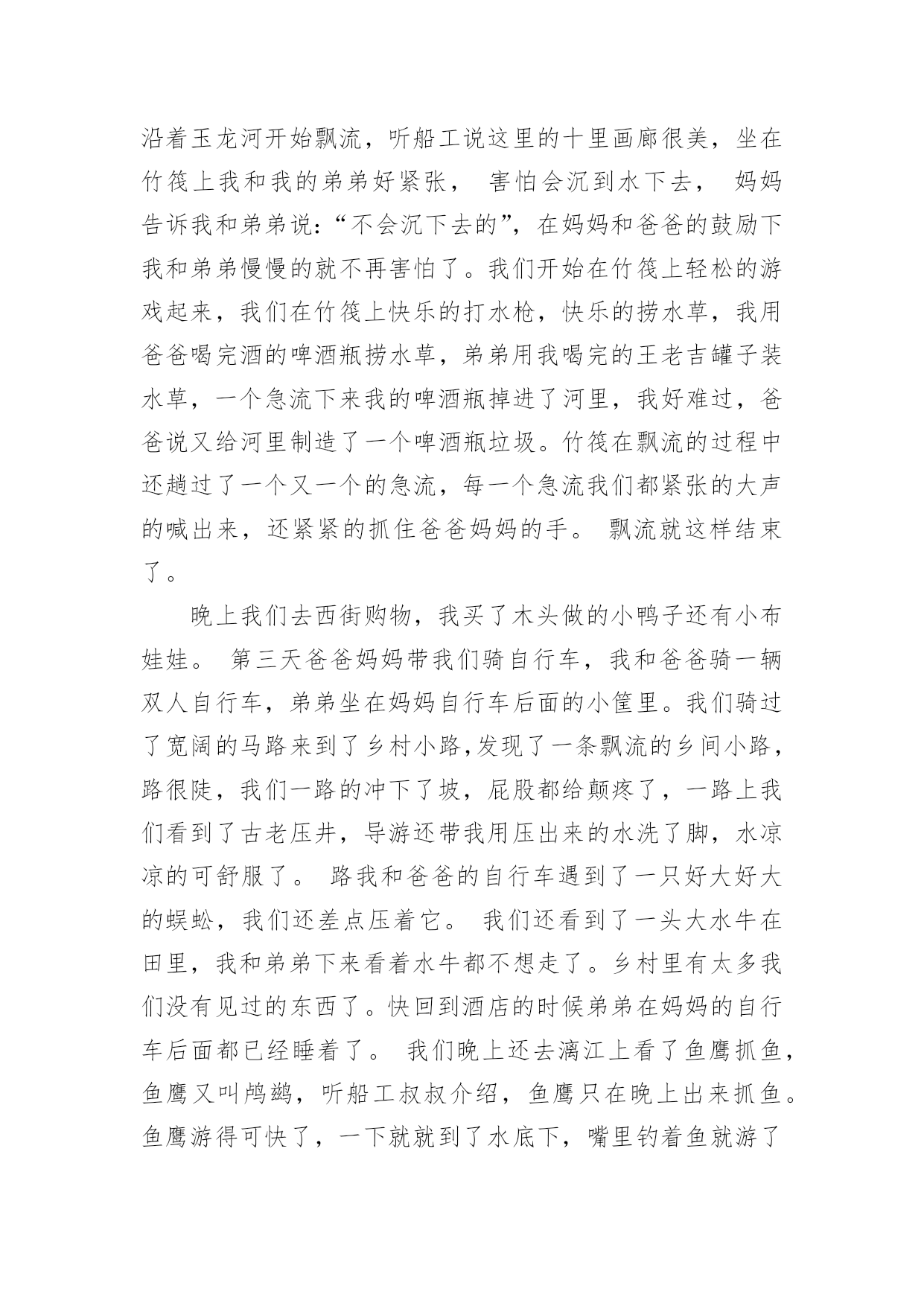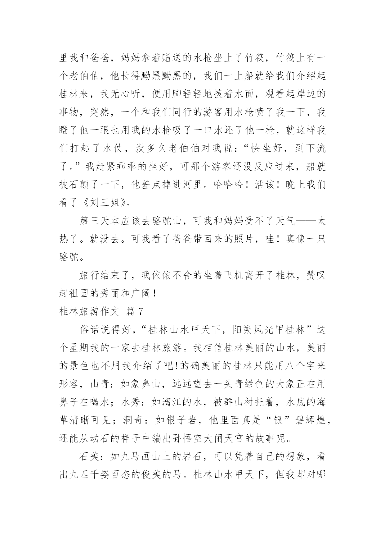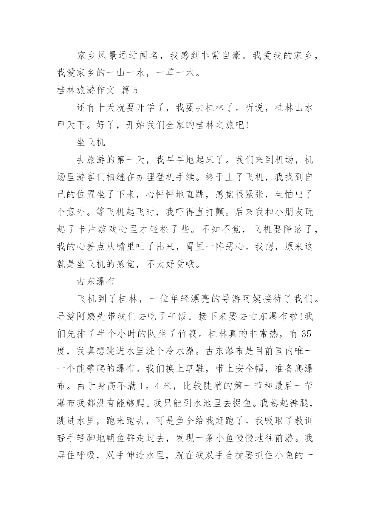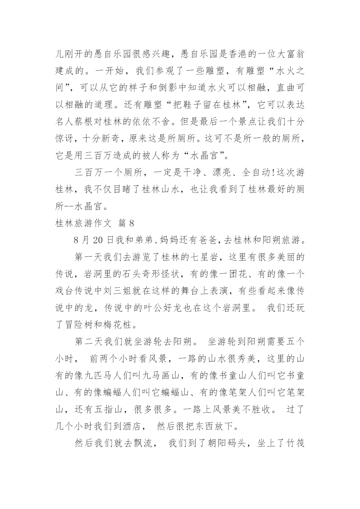 桂林旅游作文有关桂林旅游作文10篇在日常的学习、工作、生活中,大家都不可避免地会接触到作文吧,作文根据体裁的不同可以分为记叙文、说明文、应用文、议论文。相信写作文是一个让许多人都头痛的问题,以下是小编帮大家整理的桂林旅游作文10篇,欢迎阅读与收藏。桂林旅游作文篇112月23日一大早,我和妈妈还有姥爷一起坐大巴,从桂林到阳朔的杨堤乡乘竹排漂流到兴坪,看漓江的风光。我们坐上小舟,顺流而下,漫看两岸青山远远相迎,又缓缓退去。这里山清水秀,真是让我感慨万千,漓江的水你真绿啊,绿的好像一块无暇的翡翠;漓江的水你真清啊,清的都能看到水底的鱼和沙石;漓江的水你真静啊,静的让我感觉不到你在流动。在漓江上,好象置身于一幅流动的、立体的水彩图画里。这里的山真是奇特,当地人给它们取了很多有趣的名字:有羊角山,鲤鱼挂壁,童子拜观音,五指山,八仙过江,狮子山,青蛙山,母鸡山,猪八戒背媳妇,蝙蝠山,大象山,鱼尾峰,乌龟爬山,九马画山,青蛙跳江,雄狮回头看九马……其中的九马画山,是漓江最有名的景点,传说是人在这里看出的马匹越多,那么你就越厉害,据说周总理当年就看出了九匹骏马;再就是找寻新版人民币20元的背面的那段漓江风景,我们来的这天,水雾比较大,很遗憾,我没有看出来,不过,这么美的地方我以后还会再来游玩的。桂林山水甲天下,桂林真是名不虚传啊!桂林旅游作文篇2清风徐徐,清秀群山,我站在码头,感受清风所带来的和煦,漓江岸边,微波点点,几处莺燕轻展羽翼,带着几丛野草跟随风的旋律,丛丛野草在明镜中摇曳,处处莺燕在天际间洒下点点波澜。桂林,广西之东北。在这里,注视着秀丽的水,仰望这清秀的山。将目光投向宛如碧色宝石的天,为其而惊叹。桂林,南岭之西南。在这里,漓江有了归属,只有如此清秀的群山,才能配的上出漓江之秀丽。在这里,群山体现了应有的价值,只有如此清澈的水才能与其而共存于如此景色中。这样的水照映着这样的山,这样的山又围绕着这样的水。无数匆匆过客在此停下忙碌的脚步,无需庸庸碌碌,只需驻足静静欣赏。这样的桂林,注定有“桂林山水甲天下”的美誉。于是,遥想几十年前的这里,有过出自百越人之手的青铜器浑厚凝重,繁缛富丽,这片土地见证过无数青铜器由诞生到隐匿而不知下落。后又有秦始皇置其与象和南海为三郡,无数旅人怀揣着各自的梦想而来到这里,在如此秀丽的景象中为之拼搏,将脚印留在身后。也有无数旅人,经历风尘,漫漫跋涉,看到了葱郁景色后,止步于此,播种希望。这里,就是桂林,抬头仰望天空,看其之碧蓝,低头瞭向大地,叹其之沧桑。这里见证过东汉安侯的纷争,三国蜀吴相争。经历过隋朝的没落,唐朝的崛起,也在独秀峰南留下历史的印记,可仍免不了抗日战争时期被战火所洗礼,纵然如此,他仍沉默而秀丽,沧桑而不失典雅,奇山异水育人杰,此言不假,代代人杰总能带来惊喜。他是一个寡言的智者,无悲无喜,默默无闻。青山绿水,白云飘飘,温柔,悠扬,深远。水静得仿佛不流动般。群山沉稳而连绵不绝,形状各异,桂林山水相依相伴,天色渐渐转黑,仍有一片靓丽的风景,落日夕阳使漓江被“烧”得通红,但漓江仍古井不波,云如船般从远方飘过,又飘向更远的远方。轻轻挥别,尽力将这位智者在脑海中铭刻,使其不会随记忆长河而消退。桂林旅游作文篇3二年级下学期我学了一篇课文叫“桂林山水甲天下”,我看完后我非常想去桂林。今年暑假,爸爸说我考试有进步,奖励我旅游一次。嘢,终于可以去了。7月23日早上,我们一大早就拿着行李,搭乘机场快线赶完白云机场。9:40分,飞机终于起飞了。经过45分钟的平稳飞行,我们到达了桂林---我们旅行的目的地。一下飞机,我就喊:“桂林,我来了”。到了桂林后,我们首先去了桂林市的标志---象鼻山,我们在象鼻山前照相,象鼻山有个美丽的传说:从前有只大象是玉皇大帝的守护象,因病而掉入人间。幸好它被一位老爷爷看到而救了它。大象非常感激,它决定要一直在这里帮人们做事。玉皇大帝知道后,派出托塔李天王去把大象杀掉。托塔李天王趁大象喝水的时候,一剑把它杀死了。大象就化为了今天的象鼻山。桂林山水有被誉为“国宾第一洞”的芦笛岩和“世界岩溶宝库”之称的闪闪发光的银子岩。第一天已经非常精彩了,真期待今后几天更精彩的旅程呀。桂林旅游作文篇4桂林因桂树成林而得名。桂林的马路两旁、街道两侧都可以看到一行行桂花树。每年八九月桂花盛开时节,不论大街小巷,城里城外,你都能闻到浓郁的桂花香气。桂林还以“山水甲天下”而驰名中外。桂林有“山青、水秀、洞奇、石美”的特点,是全国重点旅游城市之一。桂林的山真奇啊,一座座拔地而起各不相连,像老人、像月亮、像骆驼、像公鸡……奇峰罗列,形状万千;桂林的山真秀啊,像翠绿的屏障,像新生的竹笋,色彩明丽倒映在水中;桂林的山真险啊,危峰耸立,怪石嶙峋,好象一不小心就会栽倒下来。还有被誉为大自然艺术宫殿的和芦笛岩和七星岩。岩洞里五彩