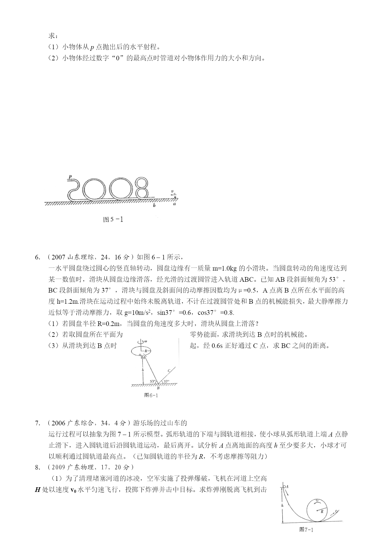 2010届高考考点知识训练(6)圆周运动1.(2007广东理科基础,8,2分)游客乘坐过山车,在圆弧轨道最低点处获得的向心加速率达到20m/s2,g取10m/s2,那么此位置座椅对游客的作用力相当于游客重力的()A.1倍B.2倍C.3倍D.4倍2.(2008广东理科基础,7,2分)汽车甲和汽车乙质量相等,以相等的速率沿同一水平弯道做匀速圆周运动,甲车在乙车的外侧。两车沿半径方向受到的摩擦力分别为以下说法正确的是()A.B.C.D.大小均与汽车速率无关3.(2009上海春招,4,2分)如图3–1所示,机器人的机械传动装置中,由电动机直接带动轮子转动,电动机转速恒为2转/秒。若轮子半径为0.05m,则机器人的速度v1为m/s;若电动机直接带动半径为0.03m的轮子时,机器人的速率v2为v1的倍。4.(2008广东单科,17,18分)(1)为了响应国家的“节能减排”号召,某同学采用了一个家用汽车的节能方法。在符合安全行驶要求的情况下,通过减少汽车后备箱中放置的不常用物品和控制加油量等措施。使汽车负载减少,假设汽车以72km/h的速度匀速行驶时,负载改变前、后汽车受到的阻力分别为2000N和1950N。请计算该方法使汽车发动机输出功率减少了多少?(4)在一种叫“飞椅”的游乐项目,示意图如图4–1所示,长为L的钢绳一端系着座椅,另一端固定在半径为r的水平转盘边缘。转盘可绕穿过其中心的竖直轴转动。当转盘以角速度匀速转动时,钢绳与转轴在同一竖直平面内,与竖直方向的夹角为θ。不计钢绳的重力,求转盘转动的角速度与夹角θ的关系。5.(2008山东理综,24,15分)某兴趣小组设计了如图5–1所示的玩具轨道,其中“2008”四个等高数字用内壁光滑的薄壁细圆管弯成,固定在竖直平面内(所有数字均由圆或半圆组成,圆半径比细管的内径大得多),底端与水平地面相切,弹射装置将一个小物体(可视为质点)以v0=5m/s的水平初速度由a点弹出,从b点进入轨道,依次经过“8002”后从p点水平抛出。小物体与地面ab段间的动摩擦因数μ=0.3,不计其他机械能损失。已知ab段长L=1.5m,数字“0”的半径R=0.2m,小物体质量m=0.01kg,g=10m/s2。求:(1)小物体从p点抛出后的水平射程。(2)小物体经过数字“0”的最高点时管道对小物体作用力的大小和方向。6.(2007山东理综,24,16分)如图6–1所示,一水平圆盘绕过圆心的竖直轴转动,圆盘边缘有一质量m=1.0kg的小滑块。当圆盘转动的角速度达到某一数值时,滑块从圆盘边缘滑落,经光滑的过渡圆管进入轨道ABC。已知AB段斜面倾角为53°,BC段斜面倾角为37°,滑块与圆盘及斜面间的动摩擦因数均为μ=0.5,A点离B点所在水平面的高度h=1.2m.滑块在运动过程中始终未脱离轨道,不计在过渡圆管处和B点的机械能损失,最大静摩擦力近似等于滑动摩擦力,取g=10m/s2,sin37°=0.6,cos37°=0.8.(1)若圆盘半径R=0.2m,当圆盘的角速度多大时,滑块从圆盘上滑落?(2)若取圆盘所在平面为零势能面,求滑块到达B点时的机械能。(3)从滑块到达B点时起,经0.6s正好通过C点,求BC之间的距离。7.(2006广东综合,34,4分)游乐场的过山车的运行过程可以抽象为图7–1所示模型。弧形轨道的下端与圆轨道相接,使小球从弧形轨道上端A点静止滑下,进入圆轨道后沿圆轨道运动,最后离开。试分析A点离地面的高度h至少要多大,小球才可以顺利通过圆轨道最高点。(已知圆轨道的半径为R,不考虑摩擦等阻力)8.(2009广东物理,17,20分)(1)为了清理堵塞河道的冰凌,空军实施了投弹爆破,飞机在河道上空高H处以速度v0水平匀速飞行,投掷下炸弹并击中目标。求炸弹刚脱离飞机到击中目标所飞行的水平距离及击中目标时的速度大小。(不计空气阻力)(2)如图17所示,一个竖直放置的圆锥筒可绕其中心OO′转动,筒内壁粗糙,筒口半径和筒高分别为R和H,筒内壁A点的高度为筒高的一半。内壁上有一质量为m的小物块。求①当筒不转动时,物块静止在筒壁A点受到的摩擦力和支持力的大小;②当物块在A点随筒做匀速转动,且其受到的摩擦力为零时,筒转动的角速度。