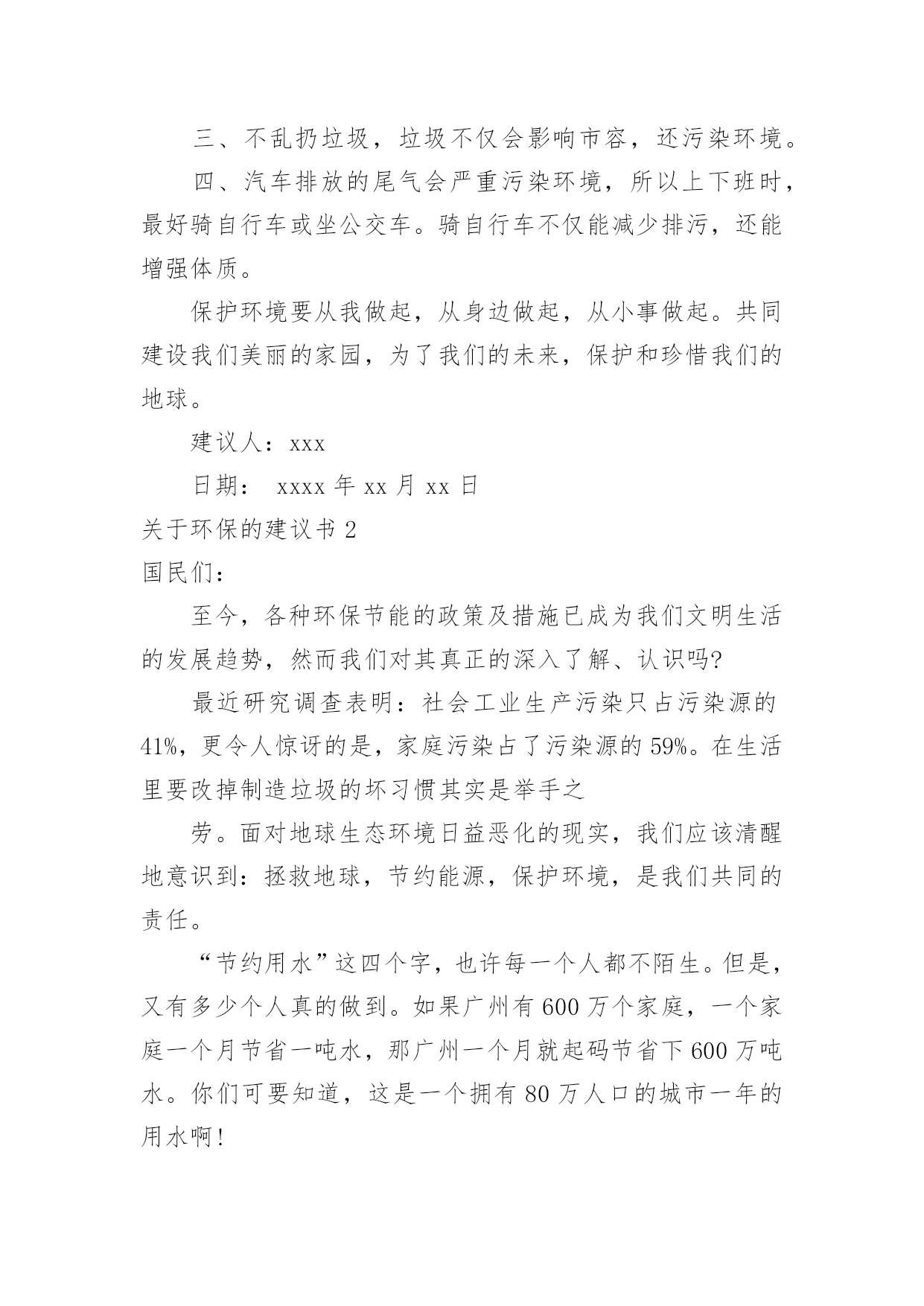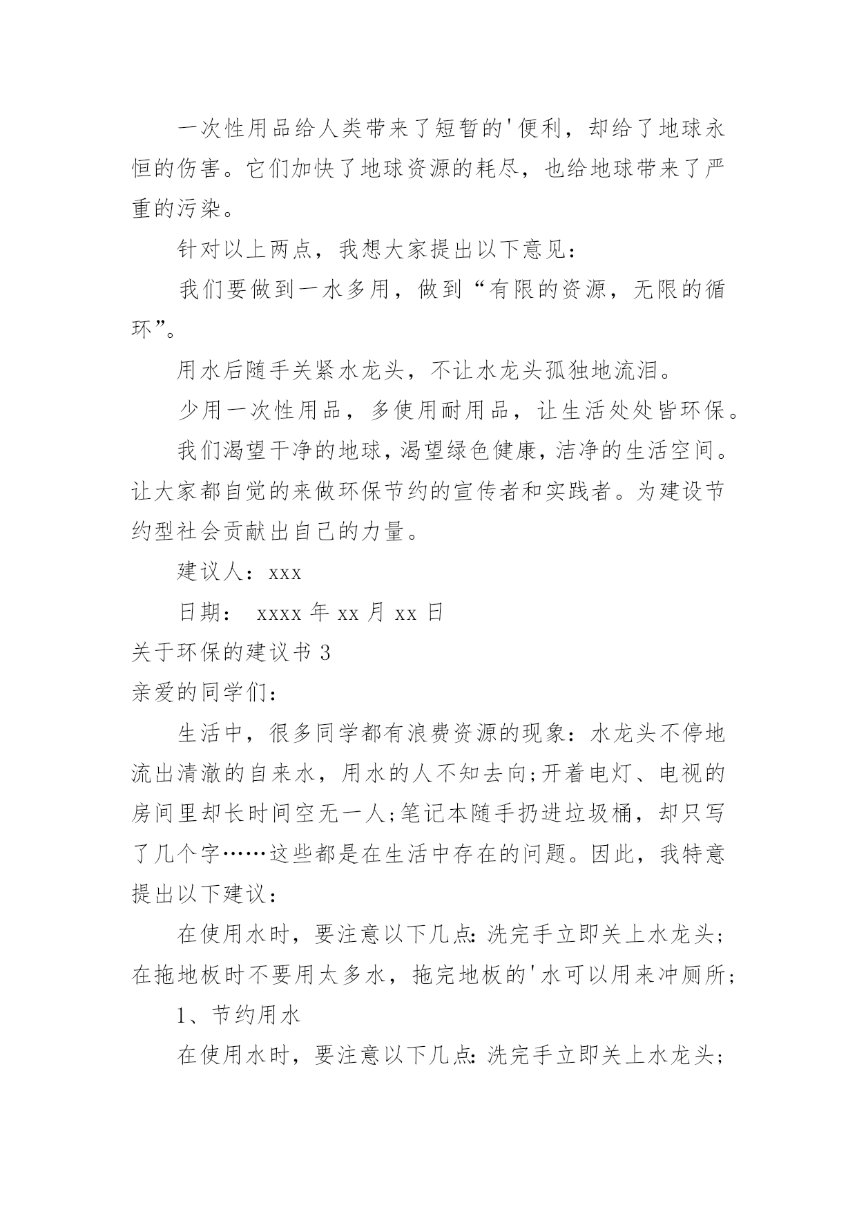 环保的建议书关于环保的建议书(汇总3篇)在我们平凡的日常里,建议书与我们的生活息息相关,建议书的写作格式一般由标题、称呼、正文、署名、日期等几部分组成。那么一般建议书是怎么写的呢?下面是小编为大家整理的关于环保的建议书,欢迎大家分享。关于环保的建议书1我们都有一个共同的家,名字叫地球。地球,这位人类的母亲,这个生命的摇篮,是那样的美丽壮观,和蔼可亲。地球是无私的,它向人类慷慨的提供矿产资源。但地球的资源是有限的。拿矿物资源来说,他不是上帝的恩赐,而是经过几百万年,甚至几亿年的地质变化才形成的。如果不加节制的.开采,必将加速地球上的矿场资源的枯竭。旱灾、洪灾、污水四溢、沙尘暴,甚至是沙漠化这些都是我们平时不起眼的恶习造成的。像随地吐痰、乱扔垃圾如果,我们要真正做到保护环境、达到珍惜资源的目的,就要遵守以下几点要求。一、不乱砍伐树木,不使用一次性用品,要多植树造林。树林不仅能制造空气,还能净化空气,使我们能呼吸到新鲜空气。不在树上乱刻,要护花护草。二、水是生命的泉源,它不是取之不尽用之不竭的,如果没有了水,那么最后一滴水就是人类的眼泪。三、不乱扔垃圾,垃圾不仅会影响市容,还污染环境。四、汽车排放的尾气会严重污染环境,所以上下班时,最好骑自行车或坐公交车。骑自行车不仅能减少排污,还能增强体质。保护环境要从我做起,从身边做起,从小事做起。共同建设我们美丽的家园,为了我们的未来,保护和珍惜我们的地球。建议人:xxx日期:xxxx年xx月xx日关于环保的建议书2国民们:至今,各种环保节能的政策及措施已成为我们文明生活的发展趋势,然而我们对其真正的深入了解、认识吗?最近研究调查表明:社会工业生产污染只占污染源的41%,更令人惊讶的是,家庭污染占了污染源的59%。在生活里要改掉制造垃圾的坏习惯其实是举手之劳。面对地球生态环境日益恶化的现实,我们应该清醒地意识到:拯救地球,节约能源,保护环境,是我们共同的责任。“节约用水”这四个字,也许每一个人都不陌生。但是,又有多少个人真的做到。如果广州有600万个家庭,一个家庭一个月节省一吨水,那广州一个月就起码节省下600万吨水。你们可要知道,这是一个拥有80万人口的城市一年的用水啊!一次性用品给人类带来了短暂的'便利,却给了地球永恒的伤害。它们加快了地球资源的耗尽,也给地球带来了严重的污染。针对以上两点,我想大家提出以下意见:我们要做到一水多用,做到“有限的资源,无限的循环”。用水后随手关紧水龙头,不让水龙头孤独地流泪。少用一次性用品,多使用耐用品,让生活处处皆环保。我们渴望干净的地球,渴望绿色健康,洁净的生活空间。让大家都自觉的来做环保节约的宣传者和实践者。为建设节约型社会贡献出自己的力量。建议人:xxx日期:xxxx年xx月xx日关于环保的建议书3亲爱的同学们:生活中,很多同学都有浪费资源的现象:水龙头不停地流出清澈的自来水,用水的人不知去向;开着电灯、电视的房间里却长时间空无一人;笔记本随手扔进垃圾桶,却只写了几个字……这些都是在生活中存在的问题。因此,我特意提出以下建议:在使用水时,要注意以下几点:洗完手立即关上水龙头;在拖地板时不要用太多水,拖完地板的'水可以用来冲厕所;1、节约用水在使用水时,要注意以下几点:洗完手立即关上水龙头;在拖地板时不要用太多水,拖完地板的水可以用来冲厕所;2、爱护公物大家在用纸的时候不能浪费,没用完的纸张可以撕起来装订成草稿本。既环保又不浪费。3、节约用纸地球是我们的家园,是人类的摇篮。我们应该行动起来,珍惜资源、保护环境,共创美好家园!大家在用纸的时候不能浪费,没用完的纸张可以撕起来装订成草稿本。既环保又不浪费。地球是我们的家园,是人类的摇篮。我们应该行动起来,珍惜资源、保护环境,共创美好家园!建议人:xxx日期:xxxx年xx月xx日