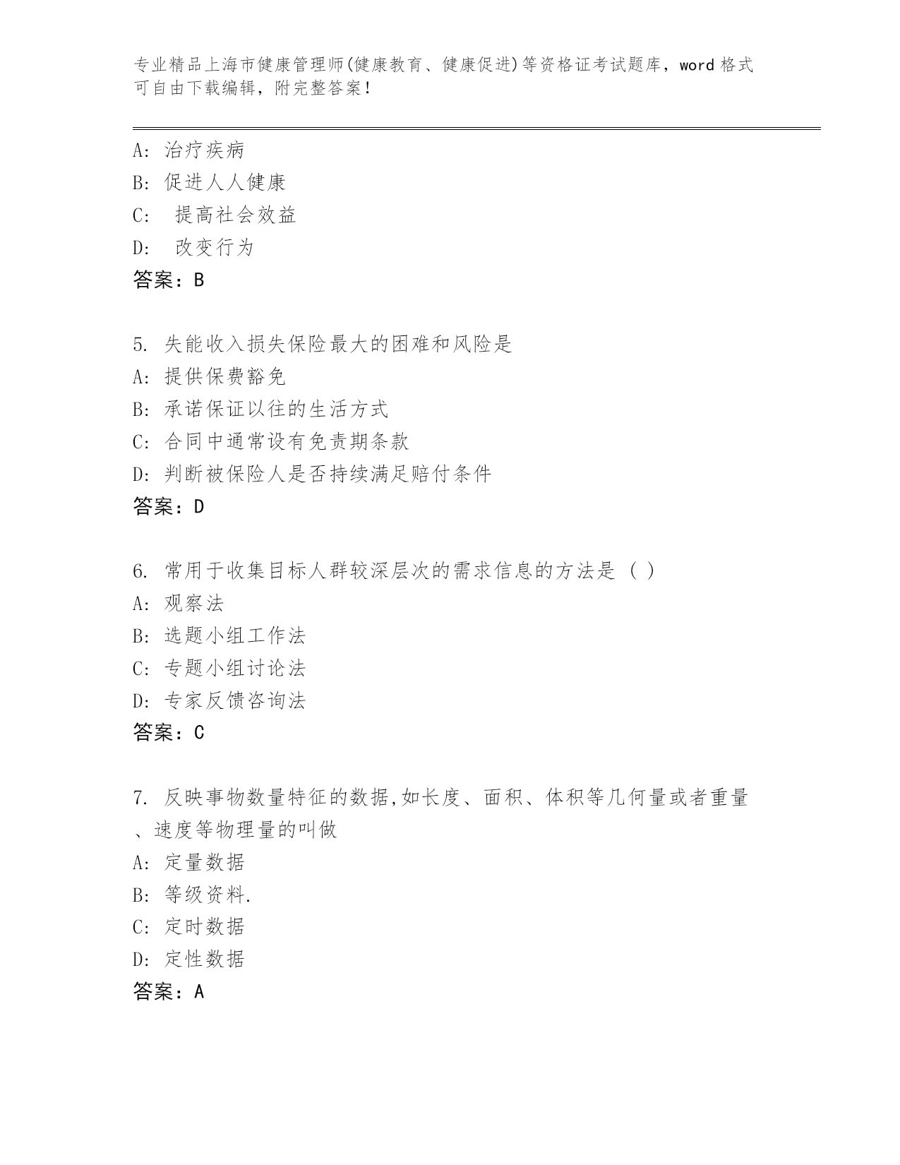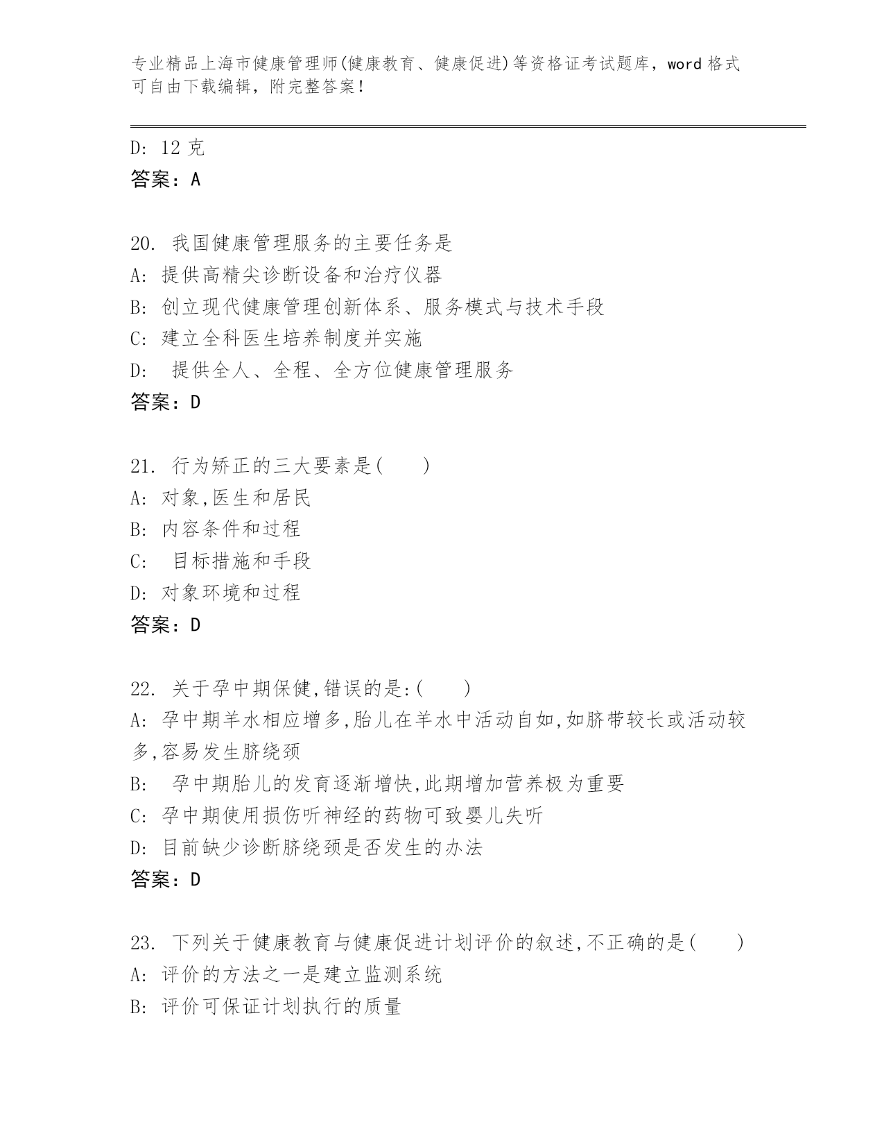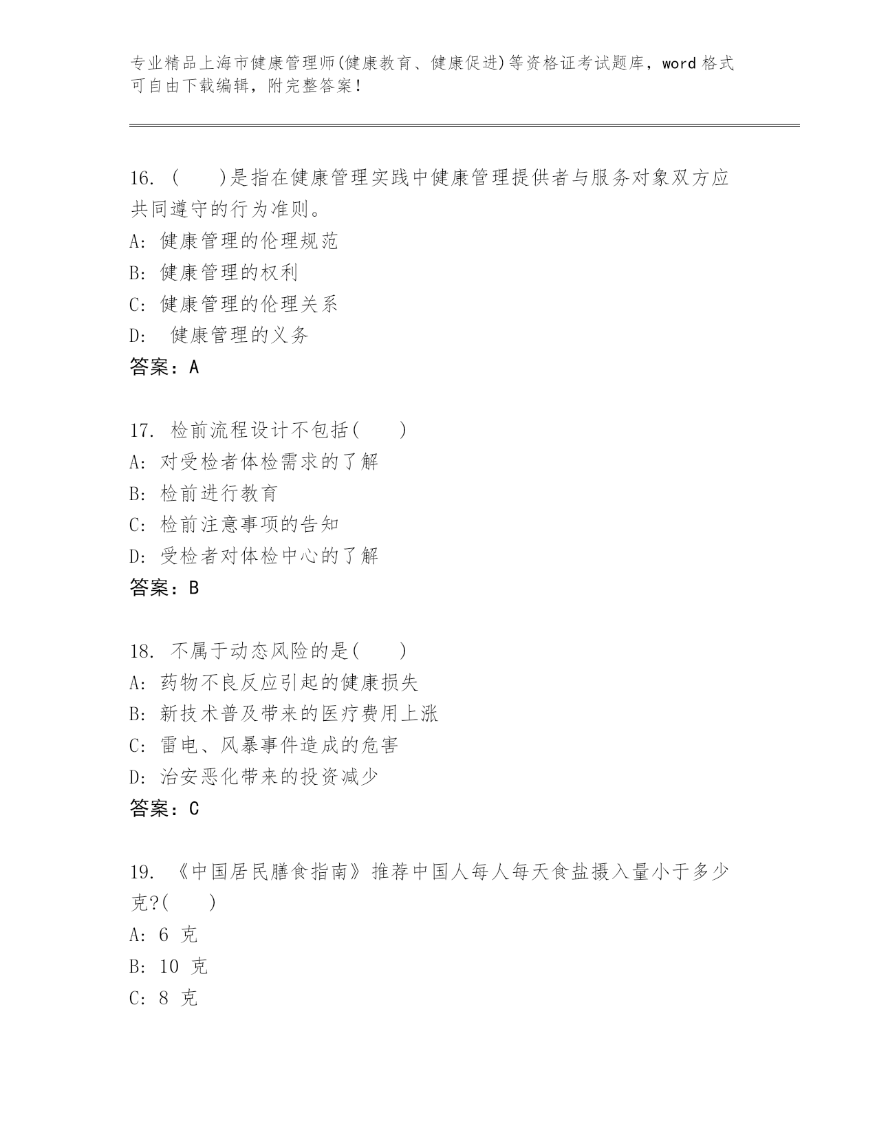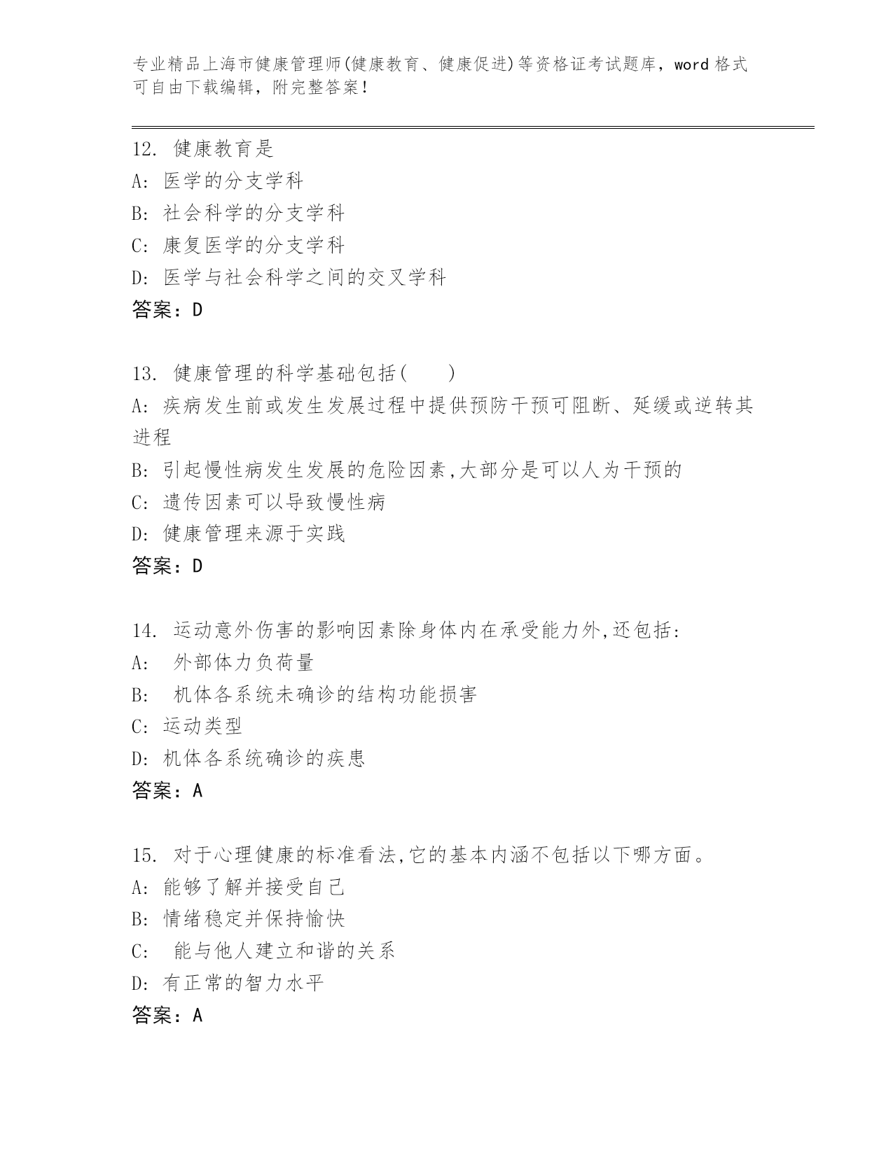 精心整理上海市健康管理师(健康教育、健康促进)等资格证考试精选题库【能力提升】