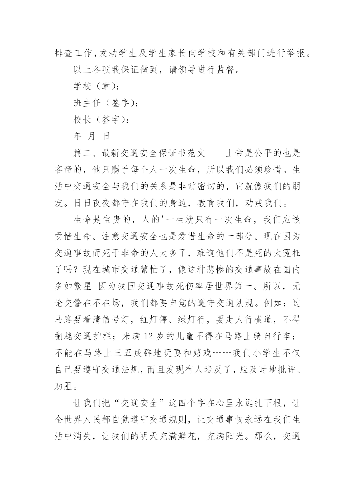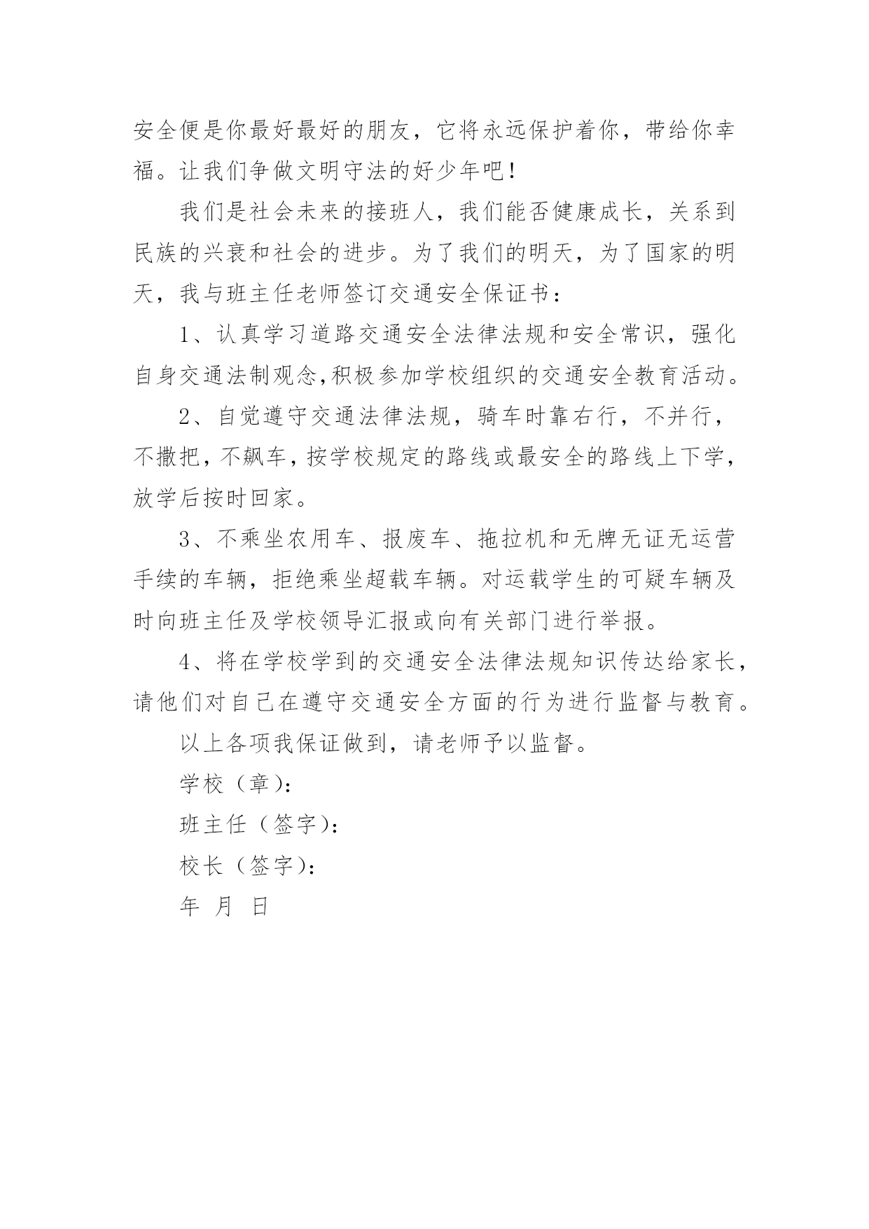 最新交通安全保证书最新交通安全保证书范文篇一、最新交通安全保证书范文为进一步加强对学生的安全教育和管理,提高学生的交通安全意识,杜绝或减少交通安全事故的发生,我与学校签订交通安全保证书。1,认真学习道路交通安全相关的法律法规知识,提高自身交通法制观念和交通安全意识,为学生树立起自觉遵守交通法律法规的良好形象。2,对学生开展经常性的交通安全教育,每周利用晨夕会,班会等时间,进行1—2次交通安全方面专项教育或专项检查总结,并要采用教学挂图,黑板报,宣传栏等形式坚持经常地对学生进行交通安全法规和交通安全常识教育,教育学生文明行路,主动防范交通安全事故,自觉拒绝乘坐农用车,报废车,拖拉机及无牌无证无运营手续和超载车辆。3,利用家长会等有利时机,搞好对学生家长的交通安全宣传教育,同时请家长配合做好学生的'交通安全教育。4,严格执行路队值班制度,在学生上学和放学时坚持值勤,疏导交通,监督引导学生按交通规则行走,并做好值班记录,确保学生交通安全。5,做好学生与班级的交通安全保证书签定工作,配合学校做好家长与学校的交通安全保证书签定工作。6,及时发现,掌握学生在交通安全方面出现的新情况,新问题,及时向学校汇报,努力进行整改。做好车辆的摸底排查工作,发动学生及学生家长向学校和有关部门进行举报。以上各项我保证做到,请领导进行监督。学校(章):班主任(签字):校长(签字):年月日篇二、最新交通安全保证书范文上帝是公平的也是吝啬的,他只赐予每个人一次生命,所以我们必须珍惜。生活中交通安全与我们的关系是非常密切的,它就像我们的朋友。日日夜夜都守在我们的身边,教育我们,劝戒我们。生命是宝贵的,人的'一生就只有一次生命,我们应该爱惜生命。注意交通安全也是爱惜生命的一部分。现在因为交通事故而死于非命的人太多了,难道他们不是死的太冤枉了吗?现在城市交通繁忙了,像这种悲惨的交通事故在国内多如繁星因为我国交通事故死伤率居世界第一。所以,无论交警在不在场,我们都要自觉的遵守交通法规。例如:过马路要看清信号灯,红灯停、绿灯行,要走人行横道,不得翻越交通护栏;未满12岁的儿童不得在马路上骑自行车;不能在马路上三五成群地玩耍和嬉戏……我们小学生不仅自己要遵守交通法规,而且发现有人违反了,应及时地批评、劝阻。让我们把“交通安全”这四个字在心里永远扎下根,让全世界人民都自觉遵守交通规则,让交通事故永远在我们生活中消失,让我们的明天充满鲜花,充满阳光。那么,交通安全便是你最好最好的朋友,它将永远保护着你,带给你幸福。让我们争做文明守法的好少年吧!我们是社会未来的接班人,我们能否健康成长,关系到民族的兴衰和社会的进步。为了我们的明天,为了国家的明天,我与班主任老师签订交通安全保证书:1、认真学习道路交通安全法律法规和安全常识,强化自身交通法制观念,积极参加学校组织的交通安全教育活动。2、自觉遵守交通法律法规,骑车时靠右行,不并行,不撒把,不飙车,按学校规定的路线或最安全的路线上下学,放学后按时回家。3、不乘坐农用车、报废车、拖拉机和无牌无证无运营手续的车辆,拒绝乘坐超载车辆。对运载学生的可疑车辆及时向班主任及学校领导汇报或向有关部门进行举报。4、将在学校学到的交通安全法律法规知识传达给家长,请他们对自己在遵守交通安全方面的行为进行监督与教育。以上各项我保证做到,请老师予以监督。学校(章):班主任(签字):校长(签字):年月日