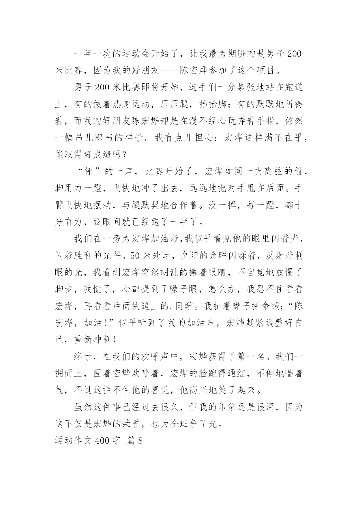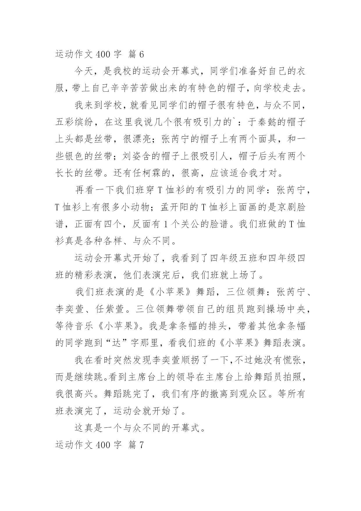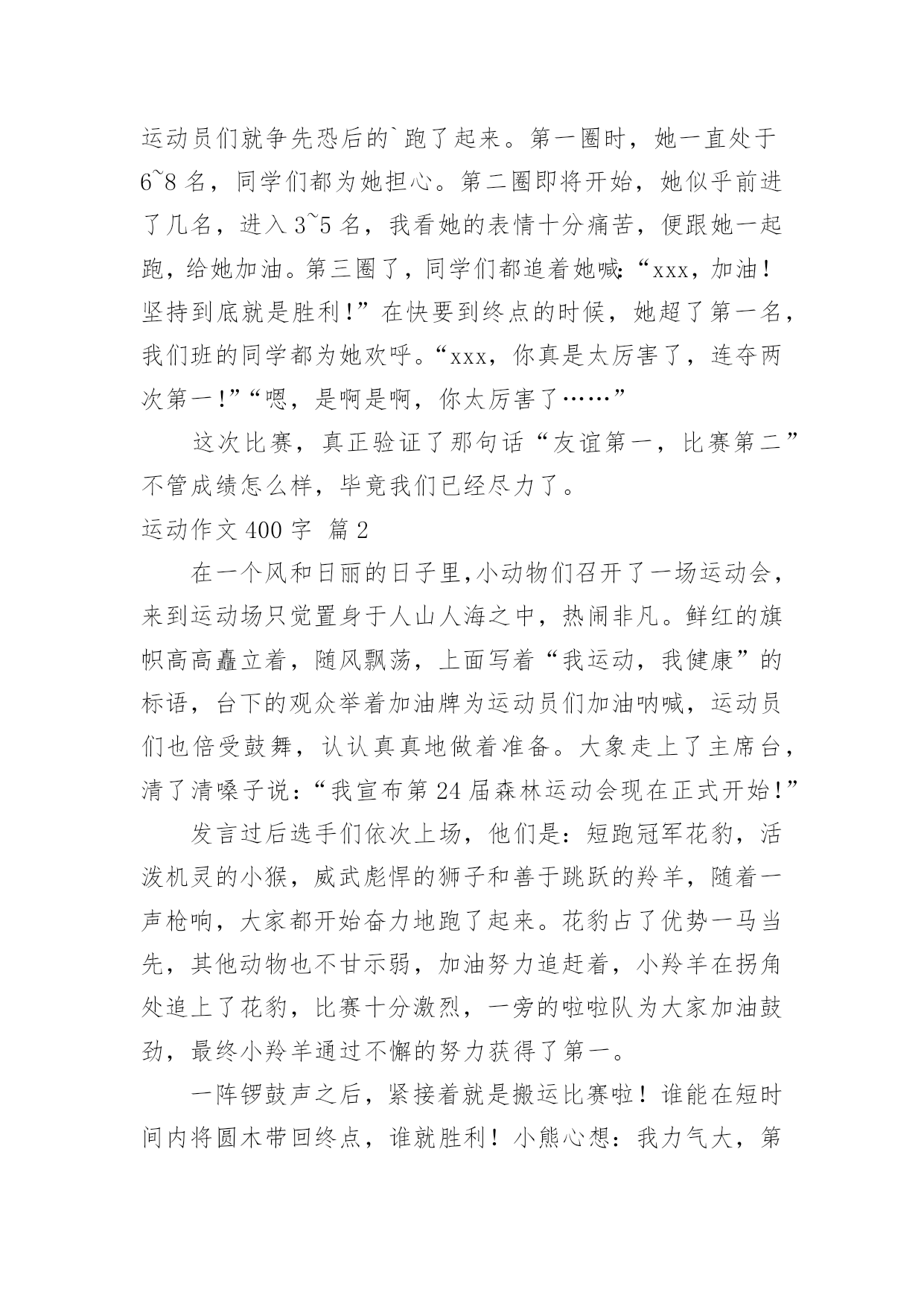运动作文400字运动作文400字(荐)在日常学习、工作抑或是生活中,大家对作文都不陌生吧,作文是人们把记忆中所存储的有关知识、经验和思想用书面形式表达出来的记叙方式。你写作文时总是无从下笔?以下是小编帮大家整理的运动作文400字8篇,欢迎阅读与收藏。运动作文400字篇1在这万物复苏的季节,我们迎着明媚的春光,展开了一场别开生面的运动会。一大早,四年级的师生们,就陆续来到操场。他们有的安排场地,有的准备道具……忙的不亦乐乎,原本一片寂静的操场变得热闹起来。运动会开始了,先是200米跑步。不一会儿,就轮到我了。发令枪一响,整个赛场顿时沸腾起来。我拼命地跑了起来,可是怎么跑也追不上了,眼看着就要到终点了,我心里更加着急了。“耶!”一听到这样的欢呼声,我就知道了,我输了。当我跑过终点时,已经来不及了。我垂头丧气的来到乒乓球台休息,我心想:虽然没能为班级争光,但是还有很多人啊。为他们加加油,说不定还能得第一呢!600米开始了,我们把所有的希望都放在了去年600米跑第一的xxx身上,看来她的压力很大呦!“砰”枪声一响,运动员们就争先恐后的`跑了起来。第一圈时,她一直处于6~8名,同学们都为她担心。第二圈即将开始,她似乎前进了几名,进入3~5名,我看她的表情十分痛苦,便跟她一起跑,给她加油。第三圈了,同学们都追着她喊:“xxx,加油!坚持到底就是胜利!”在快要到终点的时候,她超了第一名,我们班的同学都为她欢呼。“xxx,你真是太厉害了,连夺两次第一!”“嗯,是啊是啊,你太厉害了……”这次比赛,真正验证了那句话“友谊第一,比赛第二”不管成绩怎么样,毕竟我们已经尽力了。运动作文400字篇2在一个风和日丽的日子里,小动物们召开了一场运动会,来到运动场只觉置身于人山人海之中,热闹非凡。鲜红的旗帜高高矗立着,随风飘荡,上面写着“我运动,我健康”的标语,台下的观众举着加油牌为运动员们加油呐喊,运动员们也倍受鼓舞,认认真真地做着准备。大象走上了主席台,清了清嗓子说:“我宣布第24届森林运动会现在正式开始!”发言过后选手们依次上场,他们是:短跑冠军花豹,活泼机灵的小猴,威武彪悍的狮子和善于跳跃的羚羊,随着一声枪响,大家都开始奋力地跑了起来。花豹占了优势一马当先,其他动物也不甘示弱,加油努力追赶着,小羚羊在拐角处追上了花豹,比赛十分激烈,一旁的啦啦队为大家加油鼓劲,最终小羚羊通过不懈的努力获得了第一。一阵锣鼓声之后,紧接着就是搬运比赛啦!谁能在短时间内将圆木带回终点,谁就胜利!小熊心想:我力气大,第一名非我莫属!于是一咬牙,使出吃奶的劲儿用力扛着,而却不知道,小猪让圆木在草地上滚,省了不少力气。而小猴则是聪明的',他坐在圆木上,从小河顺向流了过去,第一个到达了终点。接下来的比赛更加精彩,游泳比赛,跳绳比赛,丛林冒险,友谊足球赛……动物们狂欢了一天,运动会终于结束了。傍晚,夕阳的余晖映红了天空,希望下一届运动会能够早日到来。运动作文400字篇3今天我一直无法入睡,因为我们明天是运动会,后来我左翻右翻,好不容易,终于到了早上,我非常高兴的起床,把牙刷一刷,包包整理一下,就很紧张的出们了!到了学校,我们把椅子抬置操场,等九点半一到,我们便开始进场,老师叮咛我们:“经过主席台一定要跟贵宾和校长挥手喔!”,但我不敢,因为上面坐着我爸爸,所以,我只是笑一笑走过去而已,好险没被发现!过了不久,一进场完毕,校长开始介绍贵宾,终于,校长介绍完了,便开始了我们今天的赛程,一开始,虽然不是我们五年级,但我们都很乖的观赏喔!后来,轮到五年级开始竞赛,我有参加很多喔!我们一百米去报到时,他居然没念到我的名字,害的.我当时一头雾水,但我没去跟那个老师说,我只好放弃啰!之后,终于轮到最精采的团体接力,因为我们班预赛跑最后,老师就轻视我们,说:“你们如果第一名就请饮料”,所以我们努力不懈,盼望着第一名的到来,跑完公布成绩后,我们居然第一名,团体总成绩也第二名,跟二班势均力敌,但还是让他们总成绩得第一了,真不甘心!运动会结束后,我心想:“下次一定要赢二班”!于是,结束了我们今天愉快的运动会!运动作文400字篇420xx年9月30日,在海事大学西山运动场,我们学校举行了运动会。8点钟,运动会开幕式正式开始。在运动员进行曲中学校花束队和彩旗队首先入场,然后各个班级由高年级到低年级的顺序入场。每个班级都穿着整齐的服装,迈着矫健的步伐,通过主席台检阅。我们班穿着一身迷彩服,迈着整齐的.步伐接受了学校领导的检阅,那一刻我们非常自豪。检阅完毕后,运动会比赛正式开始了。我参加了其中的一个项目,是男子个人400米。比赛快要开始了,我有点紧张,后来,我想:用自己最大的努力跑吧,没准儿对手跑得比我还慢呢。比赛开始了,我领先对手一米左右,跑到一半的时候,对手追上来了一点,快到终点的时候,我开始加速了,最后,我