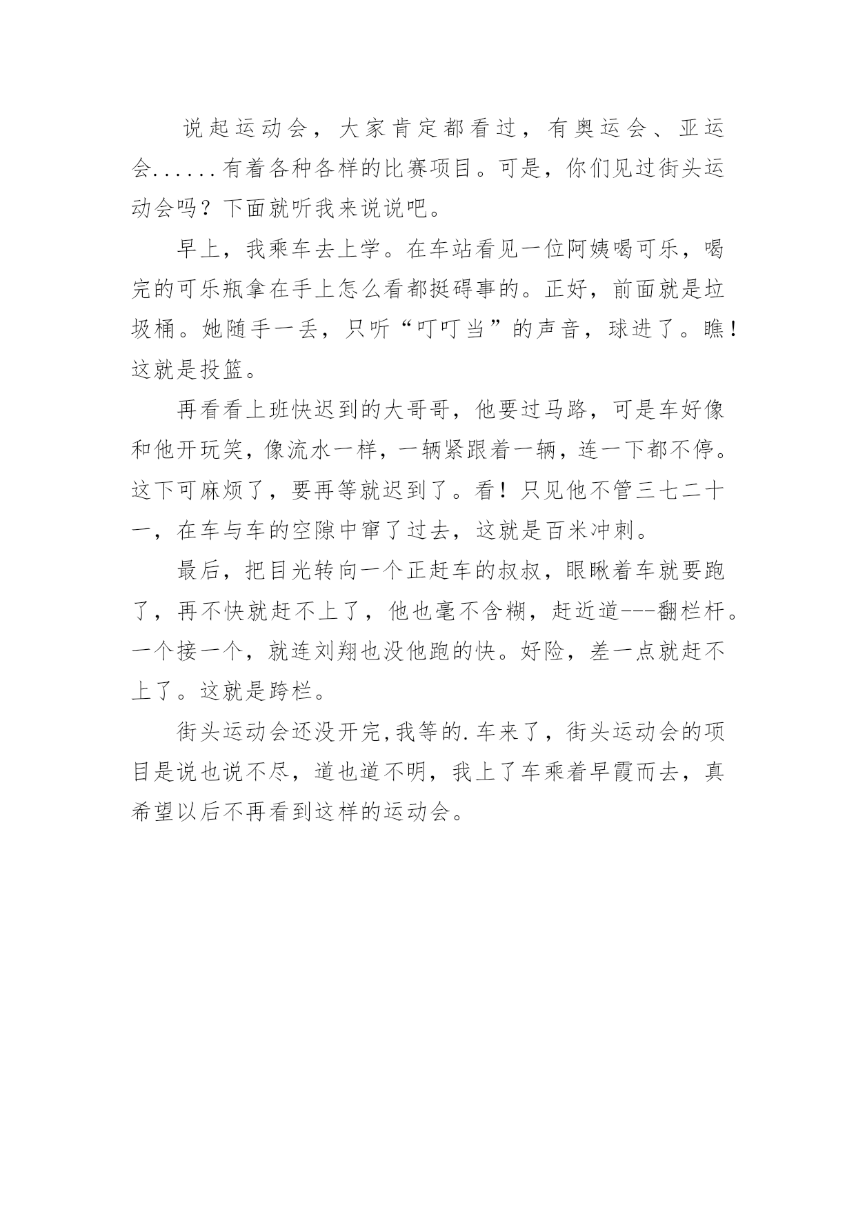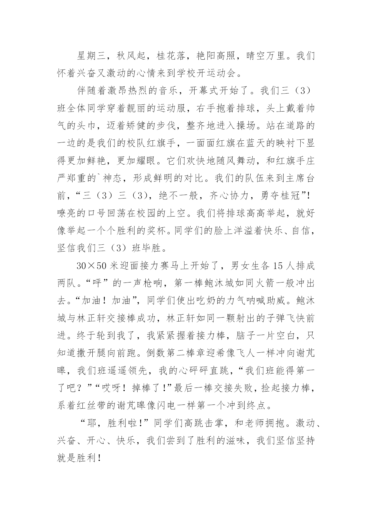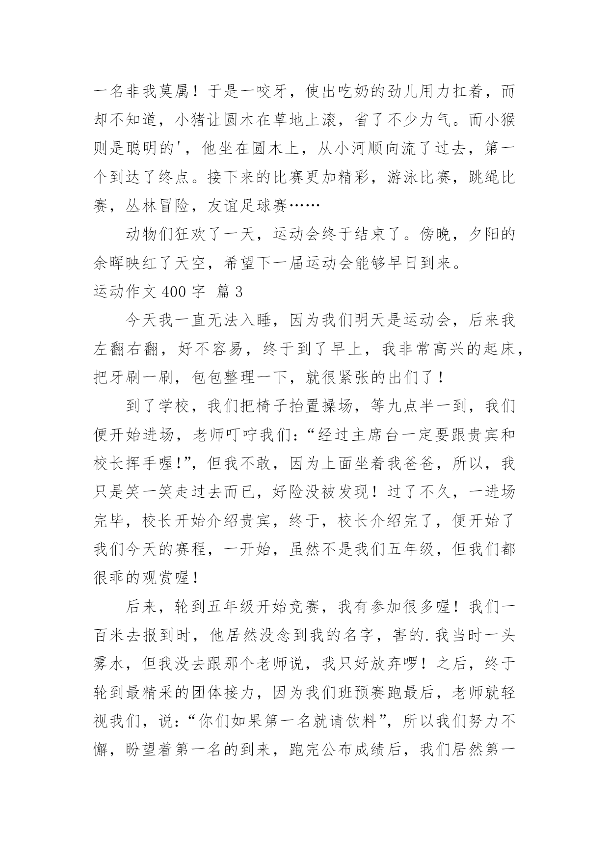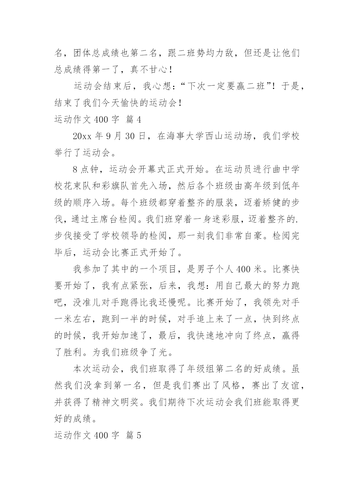 运动作文400字运动作文400字(荐)在日常学习、工作抑或是生活中,大家对作文都不陌生吧,作文是人们把记忆中所存储的有关知识、经验和思想用书面形式表达出来的记叙方式。你写作文时总是无从下笔?以下是小编帮大家整理的运动作文400字8篇,欢迎阅读与收藏。运动作文400字篇1在这万物复苏的季节,我们迎着明媚的春光,展开了一场别开生面的运动会。一大早,四年级的师生们,就陆续来到操场。他们有的安排场地,有的准备道具……忙的不亦乐乎,原本一片寂静的操场变得热闹起来。运动会开始了,先是200米跑步。不一会儿,就轮到我了。发令枪一响,整个赛场顿时沸腾起来。我拼命地跑了起来,可是怎么跑也追不上了,眼看着就要到终点了,我心里更加着急了。“耶!”一听到这样的欢呼声,我就知道了,我输了。当我跑过终点时,已经来不及了。我垂头丧气的来到乒乓球台休息,我心想:虽然没能为班级争光,但是还有很多人啊。为他们加加油,说不定还能得第一呢!600米开始了,我们把所有的希望都放在了去年600米跑第一的xxx身上,看来她的压力很大呦!“砰”枪声一响,运动员们就争先恐后的`跑了起来。第一圈时,她一直处于6~8名,同学们都为她担心。第二圈即将开始,她似乎前进了几名,进入3~5名,我看她的表情十分痛苦,便跟她一起跑,给她加油。第三圈了,同学们都追着她喊:“xxx,加油!坚持到底就是胜利!”在快要到终点的时候,她超了第一名,我们班的同学都为她欢呼。“xxx,你真是太厉害了,连夺两次第一!”“嗯,是啊是啊,你太厉害了……”这次比赛,真正验证了那句话“友谊第一,比赛第二”不管成绩怎么样,毕竟我们已经尽力了。运动作文400字篇2在一个风和日丽的日子里,小动物们召开了一场运动会,来到运动场只觉置身于人山人海之中,热闹非凡。鲜红的旗帜高高矗立着,随风飘荡,上面写着“我运动,我健康”的标语,台下的观众举着加油牌为运动员们加油呐喊,运动员们也倍受鼓舞,认认真真地做着准备。大象走上了主席台,清了清嗓子说:“我宣布第24届森林运动会现在正式开始!”发言过后选手们依次上场,他们是:短跑冠军花豹,活泼机灵的小猴,威武彪悍的狮子和善于跳跃的羚羊,随着一声枪响,大家都开始奋力地跑了起来。花豹占了优势一马当先,其他动物也不甘示弱,加油努力追赶着,小羚羊在拐角处追上了花豹,比赛十分激烈,一旁的啦啦队为大家加油鼓劲,最终小羚羊通过不懈的努力获得了第一。一阵锣鼓声之后,紧接着就是搬运比赛啦!谁能在短时间内将圆木带回终点,谁就胜利!小熊心想:我力气大,第一名非我莫属!于是一咬牙,使出吃奶的劲儿用力扛着,而却不知道,小猪让圆木在草地上滚,省了不少力气。而小猴则是聪明的',他坐在圆木上,从小河顺向流了过去,第一个到达了终点。接下来的比赛更加精彩,游泳比赛,跳绳比赛,丛林冒险,友谊足球赛……动物们狂欢了一天,运动会终于结束了。傍晚,夕阳的余晖映红了天空,希望下一届运动会能够早日到来。运动作文400字篇3今天我一直无法入睡,因为我们明天是运动会,后来我左翻右翻,好不容易,终于到了早上,我非常高兴的起床,把牙刷一刷,包包整理一下,就很紧张的出们了!到了学校,我们把椅子抬置操场,等九点半一到,我们便开始进场,老师叮咛我们:“经过主席台一定要跟贵宾和校长挥手喔!”,但我不敢,因为上面坐着我爸爸,所以,我只是笑一笑走过去而已,好险没被发现!过了不久,一进场完毕,校长开始介绍贵宾,终于,校长介绍完了,便开始了我们今天的赛程,一开始,虽然不是我们五年级,但我们都很乖的观赏喔!后来,轮到五年级开始竞赛,我有参加很多喔!我们一百米去报到时,他居然没念到我的名字,害的.我当时一头雾水,但我没去跟那个老师说,我只好放弃啰!之后,终于轮到最精采的团体接力,因为我们班预赛跑最后,老师就轻视我们,说:“你们如果第一名就请饮料”,所以我们努力不懈,盼望着第一名的到来,跑完公布成绩后,我们居然第一名,团体总成绩也第二名,跟二班势均力敌,但还是让他们总成绩得第一了,真不甘心!运动会结束后,我心想:“下次一定要赢二班”!于是,结束了我们今天愉快的运动会!运动作文400字篇420xx年9月30日,在海事大学西山运动场,我们学校举行了运动会。8点钟,运动会开幕式正式开始。在运动员进行曲中学校花束队和彩旗队首先入场,然后各个班级由高年级到低年级的顺序入场。每个班级都穿着整齐的服装,迈着矫健的步伐,通过主席台检阅。我们班穿着一身迷彩服,迈着整齐的.步伐接受了学校领导的检阅,那一刻我们非常自豪。检阅完毕后,运动会比赛正式开始了。我参加了其中的一个项目,是男子个人400米。比赛快要开始了,我有点紧张,后来,我想:用自己最大的努力跑吧,没准儿对手跑得比我还慢呢。比赛开始了,我领先对手一米左右,跑到一半的时候,对手追上来了一点,快到终点的时候,我开始加速了,最后,我