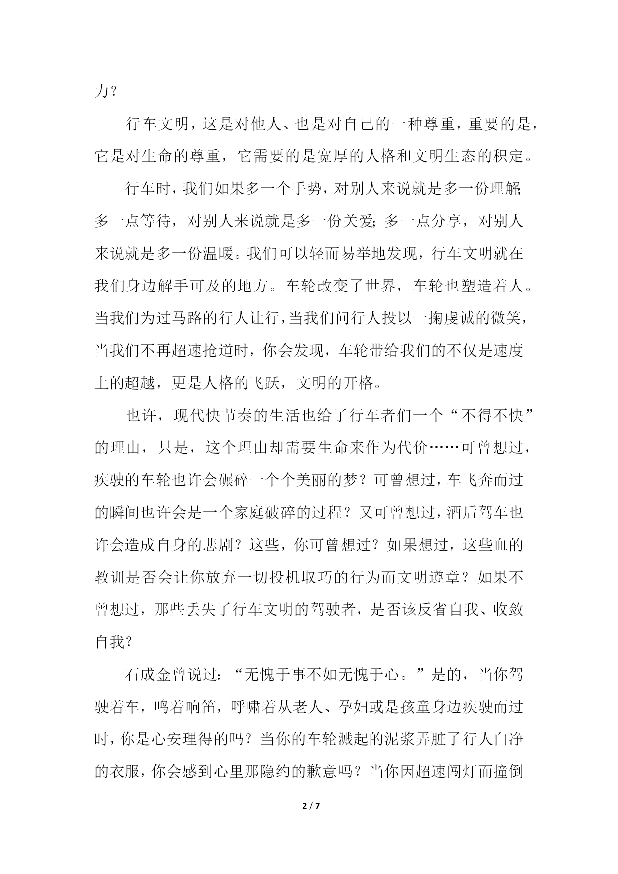 PAGE7/NUMPAGES7关于交通安全征文交通安全征文1在街道上,你是否会经常看见按着喇叭,踩着油门,从你身边呼啸而去的“奔驰”?在雨天里,你是否曾被急驶的汽车溅起的泥水弄湿了衣服?在步行街,你又是否曾被超速行驶的驾驶员破口大骂不长眼睛?有车一族,也是有“脾气”、有“个性”的一族。他们忙着抢道,忙着闯红灯,忙着速度的提升,却无暇顾及车轮下的文明。车轮改变了世界,车轮却同时地享有“特权”。那些争分夺秒的驾驶者,那些在行人面前张狂地按喇叭,横冲直撞的驾驶员,甚至示意行人为车让路的司机,他们作为行车者最基本的文明早已被践踏在车轮下。或许,在这些抛弃了行车文明的人们心里,车不仅仅是他们的一种代步工具,更是他们权力的象征以及炫耀强霸的资本。只是,那些享受着舒适的车的行车者有什么理由和行人争抢呢?曾在书上看到这样一个故事:甲和乙在一个路口等红灯,甲说,这里人少,极目左右根本没有车辆的影子,冲着红灯穿过去不会有任何危险,干吗规规矩矩地等?乙解释道:街道穿行者中,交通事故伤害最大的群落是孩子,为了孩子们,唯一正确的方法就是放弃穿越。这个故事中乙对他人的尊重以及行车文明之规范,让我肃然起敬。这是否也能给那些准备投机取巧的人一丝的压力?行车文明,这是对他人、也是对自己的一种尊重,重要的是,它是对生命的尊重,它需要的是宽厚的人格和文明生态的积定。行车时,我们如果多一个手势,对别人来说就是多一份理解;多一点等待,对别人来说就是多一份关爱;多一点分享,对别人来说就是多一份温暖。我们可以轻而易举地发现,行车文明就在我们身边解手可及的地方。车轮改变了世界,车轮也塑造着人。当我们为过马路的行人让行,当我们问行人投以一掬虔诚的微笑,当我们不再超速抢道时,你会发现,车轮带给我们的不仅是速度上的超越,更是人格的飞跃,文明的开格。也许,现代快节奏的生活也给了行车者们一个“不得不快”的理由,只是,这个理由却需要生命来作为代价……可曾想过,疾驶的车轮也许会碾碎一个个美丽的梦?可曾想过,车飞奔而过的瞬间也许会是一个家庭破碎的过程?又可曾想过,酒后驾车也许会造成自身的悲剧?这些,你可曾想过?如果想过,这些血的教训是否会让你放弃一切投机取巧的行为而文明遵章?如果不曾想过,那些丢失了行车文明的驾驶者,是否该反省自我、收敛自我?石成金曾说过:“无愧于事不如无愧于心。”是的,当你驾驶着车,鸣着响笛,呼啸着从老人、孕妇或是孩童身边疾驶而过时,你是心安理得的吗?当你的车轮溅起的泥浆弄脏了行人白净的衣服,你会感到心里那隐约的歉意吗?当你因超速闯灯而撞倒了行人,你会负起事故的责任吗?做这些的时候,你也许会认为“无愧于事”,但你是否能做到真正地“无愧于心”呢……车轮下的文明,是行车者自身深层修养的体,车轮下的文明,是真正的文明。交通安全征文2说起交通,人人都会想到两个字:车祸。是呀,有许多人就是因为不遵守交通规则酿成车祸,轻者造成残疾,重者失去宝贵的生命。其实,车祸是可以避免的。前年,我们学校几个五年级学生在放学的马路上并排骑车。转弯时,有一个学生来个突然超车,同行的伙伴还没反应过来,几辆车子已撞在了一起,他从车上重重地摔了下来。经医生检查左膀两处骨折,前后做了两次手术,共花了上万元的医药费,也落下了许多功课。假如他们遵守交通规则,不并排骑车,不超车,也就不会发生这一交通事故。有些人为了省钱,喜欢坐一些超载车、报废车,也酿成了惨祸。去年7月13日上午,在我们高邮境内淮江公路马棚段发生三车相撞特大交通事故,一共七人死亡八人受伤。这是由于一辆满载乘客的中巴车反向超车,与迎面开来的大客车相撞,大客车后面的一辆车躲闪不及,又与前面的车追尾相撞。据目击人说,当时的情景惨不忍睹:三辆车已严重变形,满地都是鲜血,哭喊声、呻吟声、求救声连成一片……这场车祸使几个家庭失去了亲人,给人们造成极大的伤害,真是车祸猛于虎呀!如果当时司机心中有交通规则,不开超载车,不强行超车,如果乘客心中有交通规则,不乘超载车,这场车祸也许就可以避免了。同学们,社会的进步离不开交通安全的发展,发展的交通企盼安全的环境,让我们自觉遵守交通规则,走文明路、骑文明车、做文明人。交通安全征文3交通安全时时刻刻伴随着我们,比如:过马路要走人行横道;不得翻越护栏;不得在马路上追逐打闹……交通安全,就像我们的朋友,日日夜夜都守候在我身边,教育我们。生命史宝贵的,我们应该珍惜。据有关资料表明,我国每年死于交通事故的大约有11万人左右,受伤的高达七十万之多。这就意味着在我们国家,平均每天有三百多个鲜活的生命因交通事故而消失,这同时也意味着每一天都有亲人的哭泣和呼唤……这组惊人的数据,提醒着我们每一个人:必须时时刻刻注意交通安全!随着经济的日益发展,马路上车辆川流不息的景象随处可见。然而,由于交通安全意识淡薄,在车水马龙的路上演