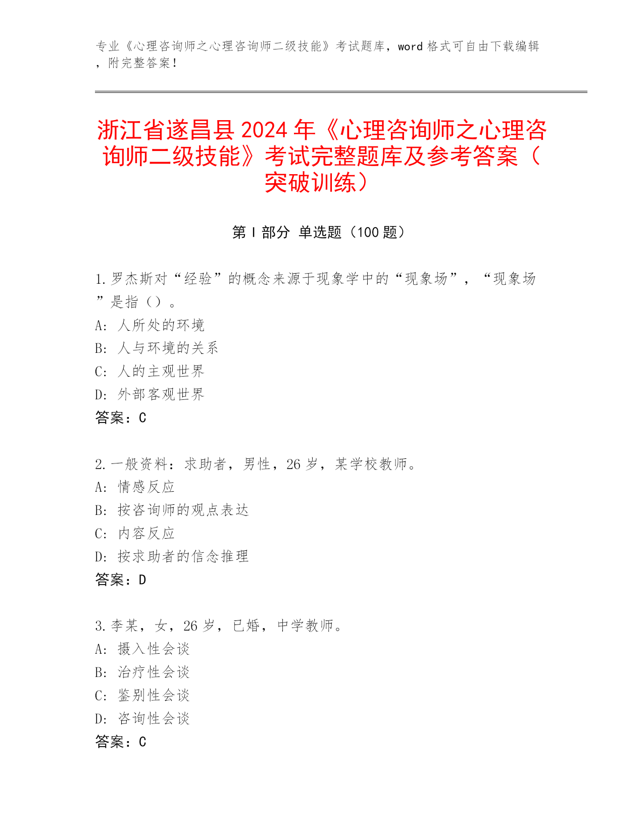 浙江省遂昌县2024年《心理咨询师之心理咨询师二级技能》考试完整题库及参考答案(突破训练)
