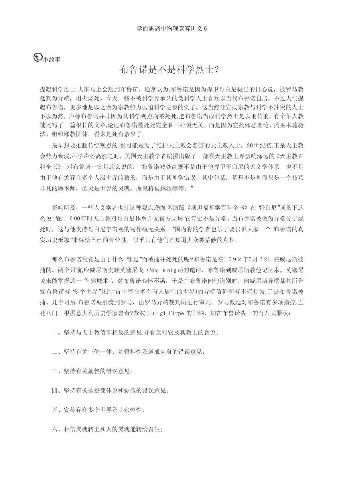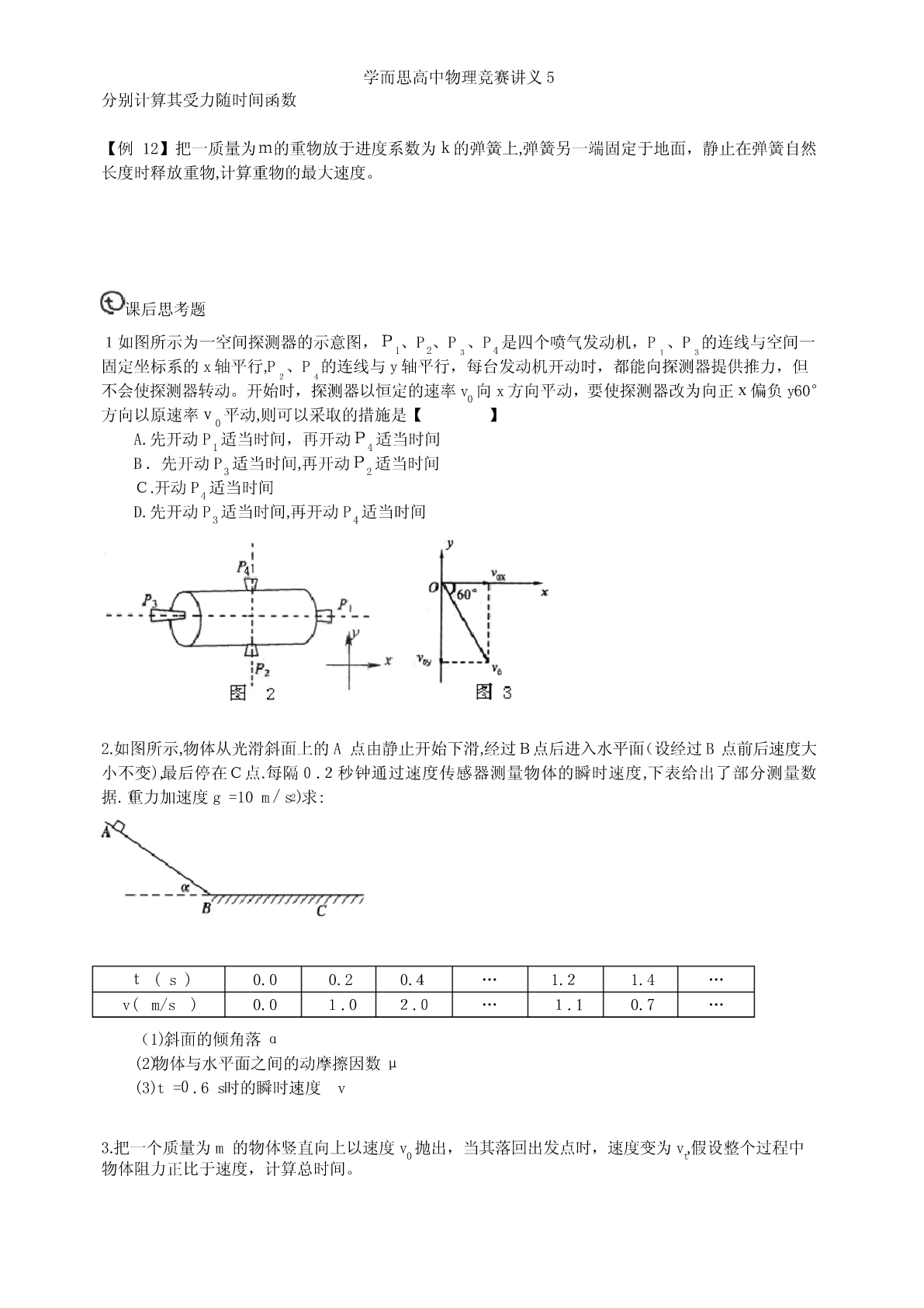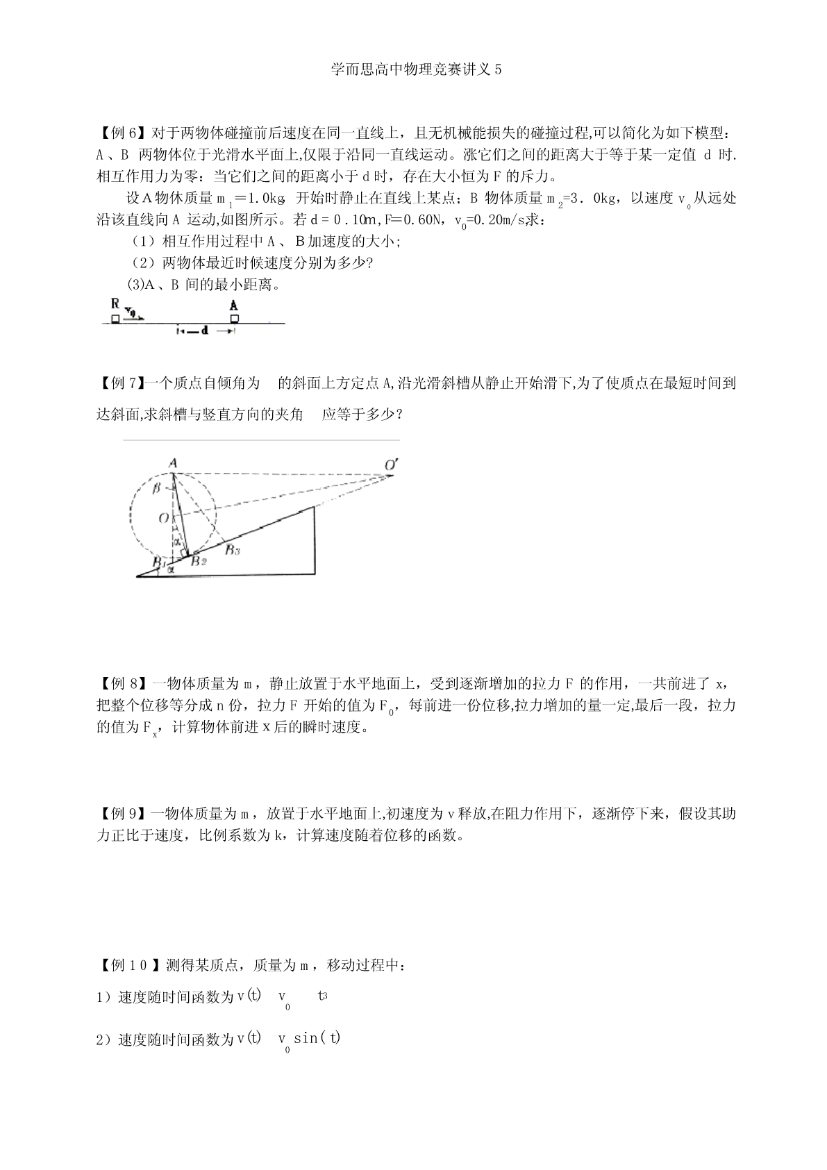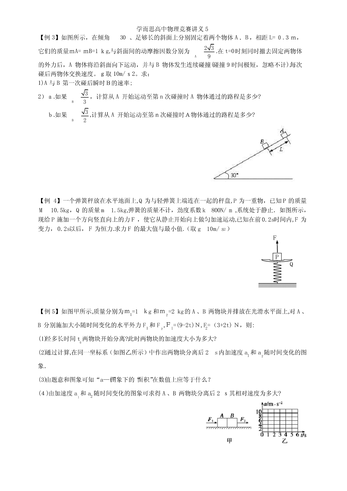 学而思高中物理竞赛讲义5第6讲动力学综合专题本讲导学1.掌握恒力下过程分析的分析过程,通过一定练习提高能力。2.对非恒力问题通过微元法列示相求解。本讲也可以不做重点讲解,适度的看一下后直接进入动量的引入。设置本讲的目的一方面是为了平时应试的时候一些“难题”,而是适当的建立起过程分析的基本思路。知识点睛1.恒力作用下匀变速运动动力学分析思路动力学的两类基本问题应用牛顿运动定律解决的问题主要可分为两类:(1)已知受力情况求运动情况,(2)已知运动情况求受力情况.分析解决这两类问题的关键是抓住受力情况和运动情况之间联系的桥梁——加速度.基本思路流程图:动力学第一类基本问题物体的受牛顿第二物体的加运动学公物体的运力情况定律速度a式动情况动力学第二类基本问题基本公式流程图为:Fav,t,v,x0tvvatt01xvtat202Fma22合vv2axt0xvvv0tvt2t2动力学问题的处理方法:(1)正确的受力分析物体进行受力分析,是求解力学问题的关键,也是学好力学的基础.学而思高中物理竞赛讲义5(2)受力分析的依据①力的产生条件是否存在,是受力分析的重要依据之一.②力的作用效果与物体的运动状态之间有相互制约的关系,结合物体的运动状态分析受力情况是不可忽视的.③由牛顿第三定律(力的相互性)出发,分析物体的受力情况,可以化难为易.解题思路(1)由物体的受力情况求解物体的运动情况的一般方法和步骤.①确定研究对象,对研究对象进行受力分析,并画出物体的受力图.②根据力的合成与分解的方法,求出物体所受合外力(包括大小和方向).③根据牛顿第二定律列方程,求出物体的加速度.④结合给定的物体运动的初始条件,选择运动学公式,求出所需的运动参量.(2)由物体的运动情况求解物体的受力情况.解决这类问题的基本思路是解决第一类问题的逆过程,具体步骤跟上面所讲的相似,但需特别注意:①由运动学规律求加速度,要特别注意加速度的方向,从而确定合力的方向,不能将速度的方向与加速度的方向混淆.②题目中求的力可能是合力,也可能是某一特定的作用力.即使是后一种情况,也必须先求出合力的大小和方向,再根据力的合成与分解知识求分力.例题精讲【例1】在水平地面上有一质量为4kg的物体,物体在水平拉力F的作用下由静止开始运动.10s后拉1力大小减为F,该物体vt图象如图所示.求:3(1)物体受到的水平拉力F的大小.(2)物体与地面间的动摩擦因数.(g取10m/s2)【例2】质量m1.5kg的物块(可视为质点),在水平恒力F作用下,从水平面上A点由静止开始运动,运动一段距离撤去该力,物块继续滑行t2.0s后停在B点,已知A、B两点间的距离x5.0m,物块与水平面间的动摩擦因数μ0.20,求恒力F多大.(g10m/s2)学而思高中物理竞赛讲义5【例3】如图所示,在倾角30、足够长的斜面上分别固定着两个物体A.B,相距L=0.3m,23它们的质量mA=mB=1kg,与斜面间的动摩擦因数分别为.在t=0时刻同时撤去固定两物体A9的外力后,A物体将沿斜面向下运动,并与B物体发生连续碰撞(碰撞9时间极短,忽略不计),每次碰后两物体交换速度。g取10m/s2。求:1)A与B第一次碰后瞬时B的速率;32)a.如果,计算从A开始运动至第n次碰撞时A物体通过的路程是多少?B33b.如果,计算从A开始运动至第n次碰撞时A物体通过的路程是多少?B2【例4】一个弹簧秤放在水平地面上,Q为与轻弹簧上端连在一起的秤盘,P为一重物,已知P的质量M10.5kg,Q的质量m1.5kg,弹簧的质量不计,劲度系数k800N/m,系统处于静止.如图所示,现给P施加一个方向竖直向上的力F,使它从静止开始向上做匀加速运动,已知在前0.2s时间内,F为变力,0.2s以后,F为恒力.求力F的最大值与最小值.(取g10m/s2)FPQ【例5】如图甲所示,质量分别为m=1kg和m=2kg的A、B两物块并排放在光滑水平面上,对A、12B分别施加大小随时间变化的水平外力F和F,F=(9-2t)N,F=(3+2t)N,则:1212(1)经多长时间t两物块开始分离?此时两物块的加速度大小为多大?0(2)通过计算,在同一坐标系(如图乙所示)中作出两物块分离后2s内加速度a和a随时间变化的图12象.(3)由题意和图象可知“a—t图”象下的“面积”在数值上应等于什么?(4)由加速度a和a随时间变化的图
