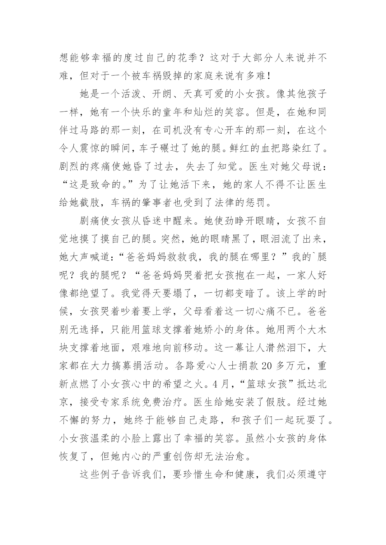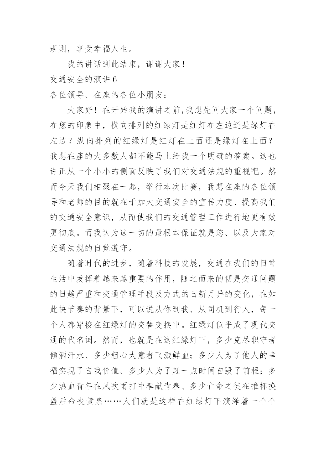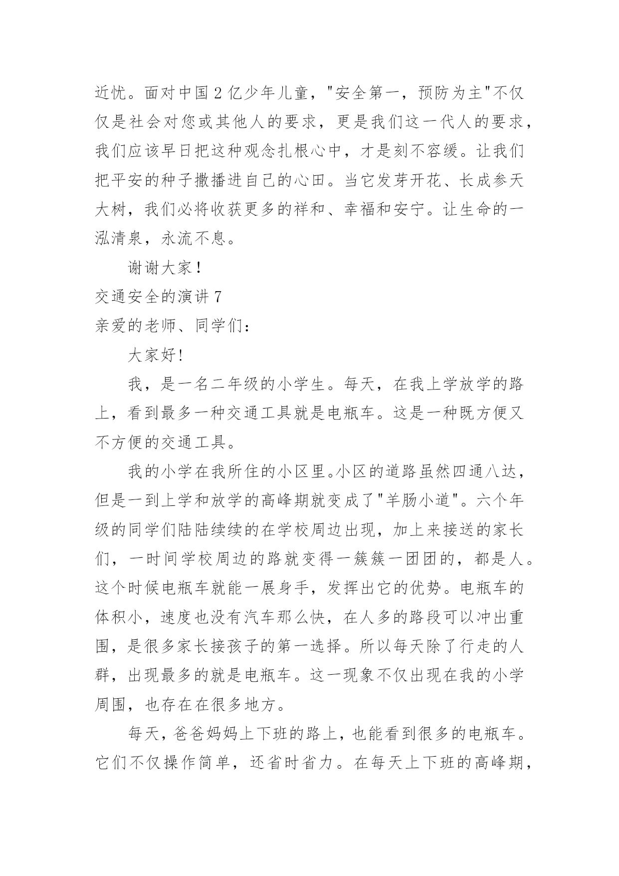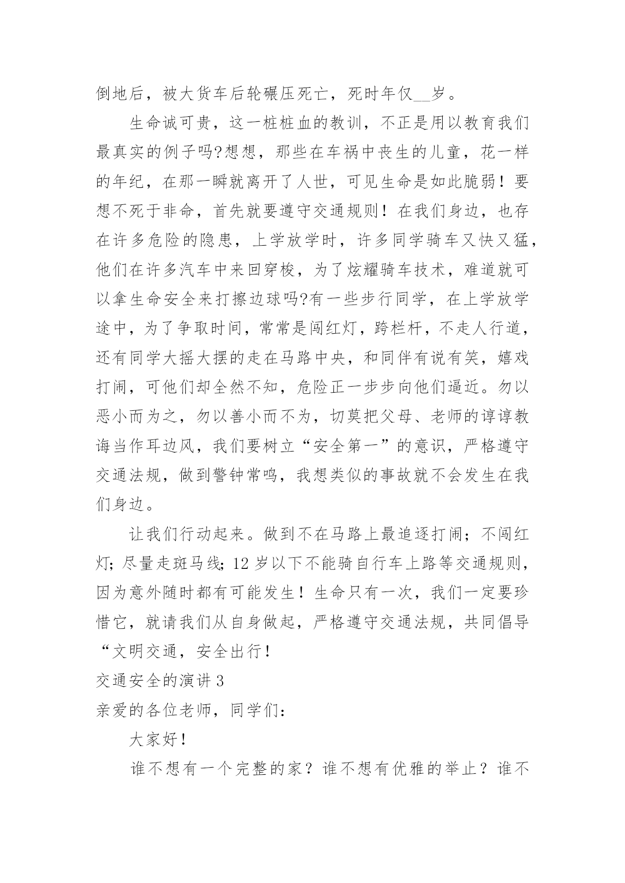 交通安全的演讲交通安全的演讲15篇交通安全的演讲1各位老师、亲爱的同学们:大家好!生命安全犹如泰山,我们必须要珍爱生命,远离危险。每年的交通事故不断发生,所以有许多人在交通事故上丢了自我的生命,这是让人多么痛哀的事情。当然,人们最不愿看到的是自我的.亲人因为不注意,在那一瞬间闭上了双眼,从此离开人世!那么,今日让我来讲一讲如何珍爱生命吧!同学们,请你们想一想,当你在马路上嬉戏玩耍、追捉打闹时,你有没有想到过他的后果是什么?我们作为小学生,必须要学习交通规则,遵守交通规则。过马路上必须要看交通指示灯。红灯停,绿灯行,黄灯亮了等一等必须要熟记心头,照做执行。上学和下学之间是最重要的,不要在路上拥挤,这样最容易发生交通事故。不仅仅我们小学生要遵守交通规则,接送我们大人也要遵守。那一件件骇人听闻的交通事故使多少人丧生?使多少人受伤?又给多少人带来痛苦?有的失去了亲爱的父母,有的失去了挚爱的儿女,有的失去了朝夕相处的亲人……这血的教训难道不值得深思、警觉吗?前些日子,在我们村里,一位三岁半的小女孩横穿马路,被三轮车给撞了,父母明白后,急忙送往医院,不幸的是这个小女孩已经奄奄一息了,那幼小的生命之火也瞬间熄灭了。父母心如刀割,哭得死去活来,但一切都无法挽回了,留给人们的仅有无尽的痛苦与愧恨。还有一件事,一位三四十岁的叔叔醉酒开车,与另一辆大车相撞,不幸死亡,车也撞坏了,真可谓是车毁人亡。这样的事情真是太多了,但仍有不少人我行我素,无视交通规则。每个人的生命都是父母给予的,人的生命仅有一次,人死不能复生。我们的生命不仅仅是自我的,它还属于父母,属于亲人,属于社会。生命对于我们太重要了,我们必须要珍爱生命!交通安全的演讲2亲爱的老师、同学们:大家好!如今的社会随着经济繁荣的发展,交通事业的发达,马路上的车辆川流不息,随着马路的日益拥挤,交通事故也出现越来越多。一桩桩血的教训,让人心痛不已。20__年x月上旬,适逢中午放学时分,__市__区__小学学前班的6岁男生__,随爷爷一起走出了学校的'大门。途中,__偶遇母亲在马路对面召唤,于是挣脱了爷爷牵着他的手,向马路对面飞奔而去。不料,在刚刚跨进马路主路两-步,路的左侧突然飞驰来了一辆北京牌吉普车,将杨某撞倒并从他幼小的身体上碾压了过去。__当场死亡。20__年夏天,初中一年级的男生__,骑着自行车上学。由于__占路中间骑行而对后面的一辆大货车鸣笛不让,最终导致其与大货车相挂。杨某被撞倒地后,被大货车后轮碾压死亡,死时年仅__岁。生命诚可贵,这一桩桩血的教训,不正是用以教育我们最真实的例子吗?想想,那些在车祸中丧生的儿童,花一样的年纪,在那一瞬就离开了人世,可见生命是如此脆弱!要想不死于非命,首先就要遵守交通规则!在我们身边,也存在许多危险的隐患,上学放学时,许多同学骑车又快又猛,他们在许多汽车中来回穿梭,为了炫耀骑车技术,难道就可以拿生命安全来打擦边球吗?有一些步行同学,在上学放学途中,为了争取时间,常常是闯红灯,跨栏杆,不走人行道,还有同学大摇大摆的走在马路中央,和同伴有说有笑,嬉戏打闹,可他们却全然不知,危险正一步步向他们逼近。勿以恶小而为之,勿以善小而不为,切莫把父母、老师的谆谆教诲当作耳边风,我们要树立“安全第一”的意识,严格遵守交通法规,做到警钟常鸣,我想类似的事故就不会发生在我们身边。让我们行动起来。做到不在马路上最追逐打闹;不闯红灯;尽量走斑马线;12岁以下不能骑自行车上路等交通规则,因为意外随时都有可能发生!生命只有一次,我们一定要珍惜它,就请我们从自身做起,严格遵守交通法规,共同倡导“文明交通,安全出行!交通安全的演讲3亲爱的各位老师,同学们:大家好!谁不想有一个完整的家?谁不想有优雅的举止?谁不想能够幸福的度过自己的花季?这对于大部分人来说并不难,但对于一个被车祸毁掉的家庭来说有多难!她是一个活泼、开朗、天真可爱的小女孩。像其他孩子一样,她有一个快乐的童年和灿烂的笑容。但是,在她和同伴过马路的那一刻,在司机没有专心开车的那一刻,在这个令人震惊的瞬间,车子碾过了她的腿。鲜红的血把路染红了。剧烈的疼痛使她昏了过去,失去了知觉。医生对她父母说:“这是致命的。”为了让她活下来,她的家人不得不让医生给她截肢,车祸的肇事者也受到了法律的惩罚。剧痛使女孩从昏迷中醒来。她使劲睁开眼睛,女孩不自觉地摸了摸自己的腿。突然,她的眼睛黑了,眼泪流了出来,她大声喊道:“爸爸妈妈救救我,我的腿在哪里?”我的`腿呢?我的腿呢?“爸爸妈妈哭着把女孩抱在一起,一家人好像都绝望了。我觉得天要塌了,一切都变暗了。该上学的时候,女孩哭着吵着要上学,父母看着这一切心痛不已。爸爸别无选择,只能用篮球支撑着她娇小的身体。她用两个大木块支撑着地面,艰难地向前移动。这一幕让人潸然泪下,大家都在大力搞募捐活动。各路爱心人士