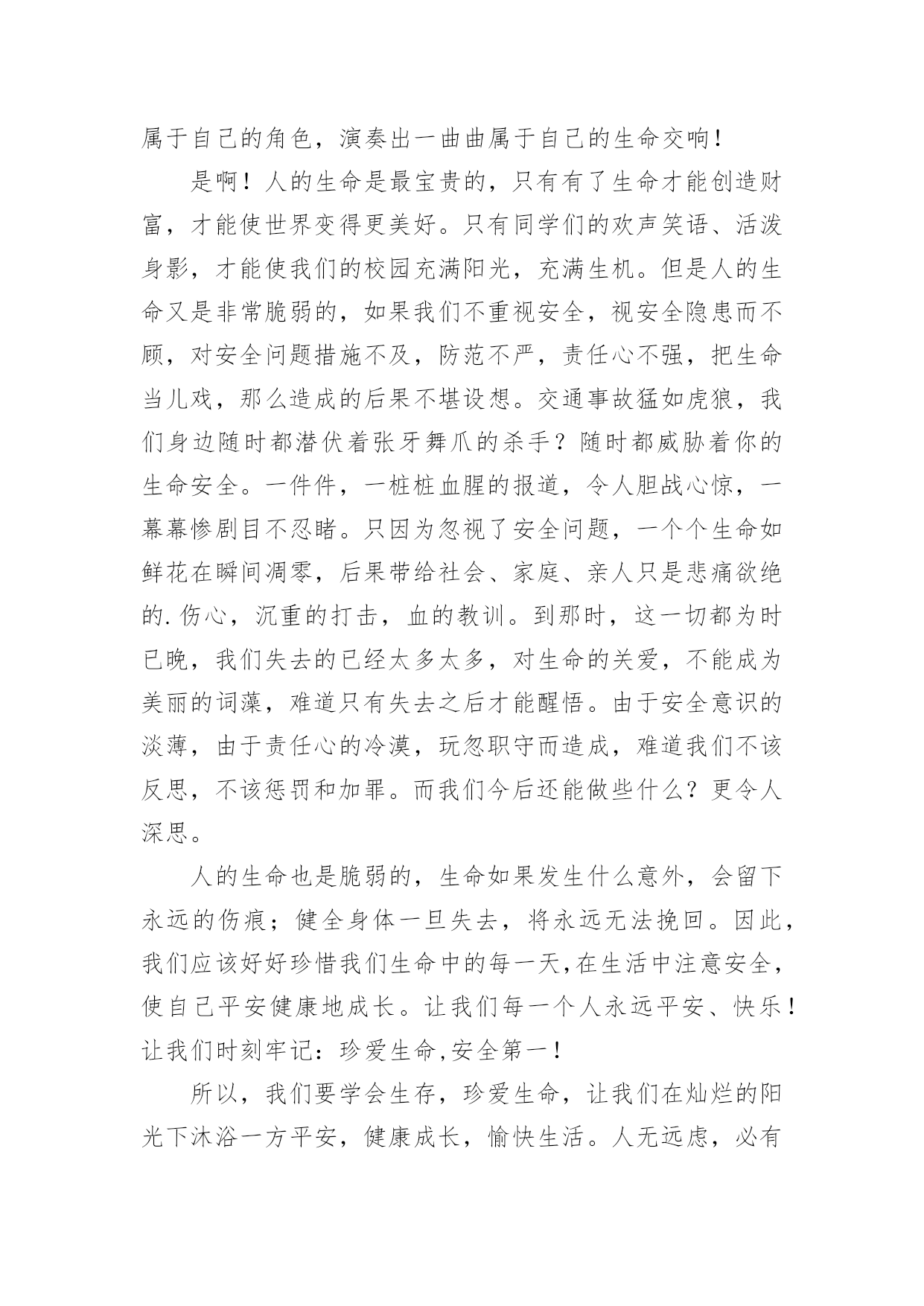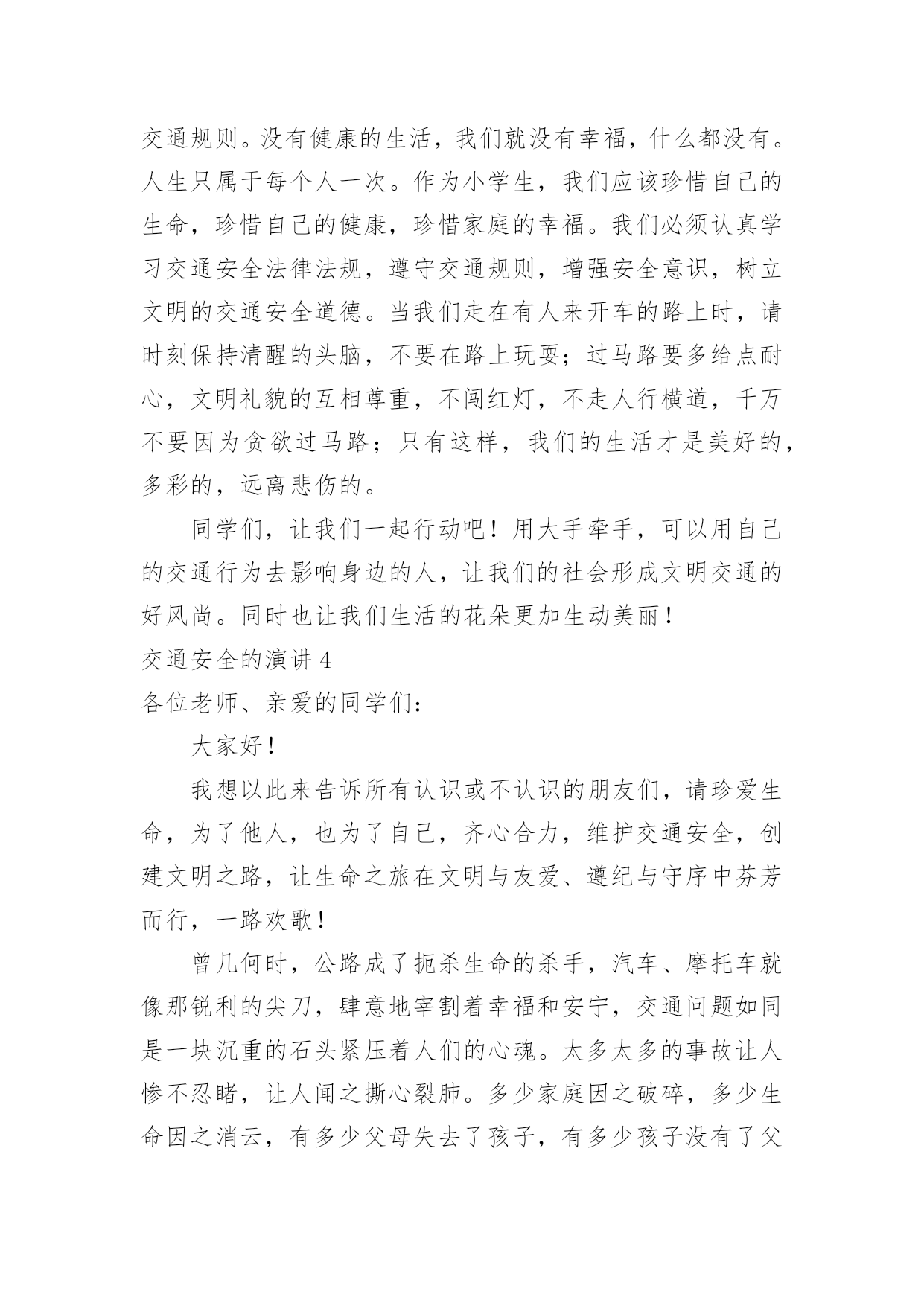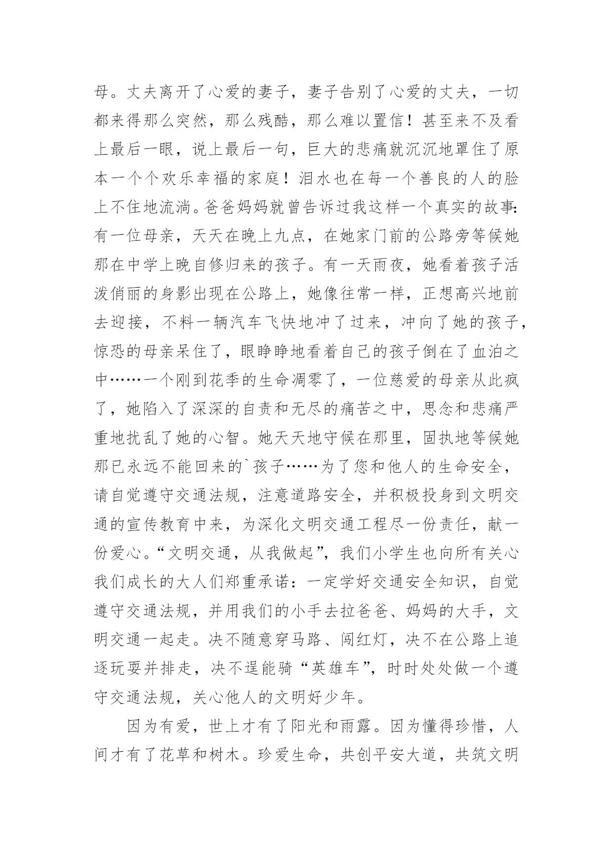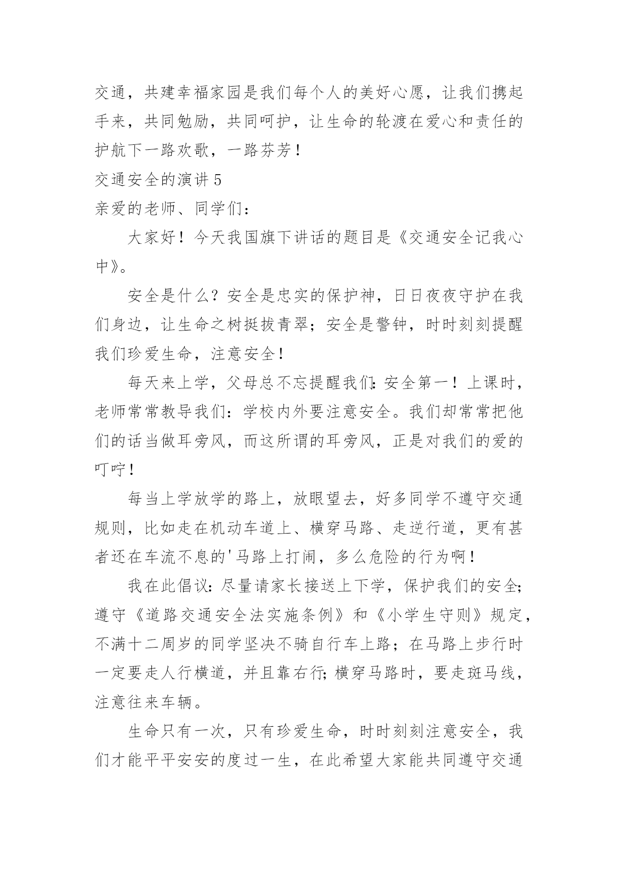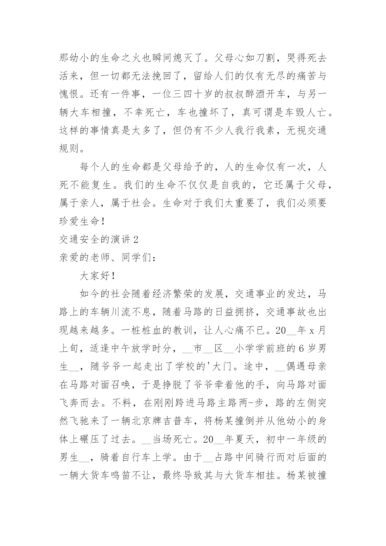 交通安全的演讲交通安全的演讲15篇交通安全的演讲1各位老师、亲爱的同学们:大家好!生命安全犹如泰山,我们必须要珍爱生命,远离危险。每年的交通事故不断发生,所以有许多人在交通事故上丢了自我的生命,这是让人多么痛哀的事情。当然,人们最不愿看到的是自我的.亲人因为不注意,在那一瞬间闭上了双眼,从此离开人世!那么,今日让我来讲一讲如何珍爱生命吧!同学们,请你们想一想,当你在马路上嬉戏玩耍、追捉打闹时,你有没有想到过他的后果是什么?我们作为小学生,必须要学习交通规则,遵守交通规则。过马路上必须要看交通指示灯。红灯停,绿灯行,黄灯亮了等一等必须要熟记心头,照做执行。上学和下学之间是最重要的,不要在路上拥挤,这样最容易发生交通事故。不仅仅我们小学生要遵守交通规则,接送我们大人也要遵守。那一件件骇人听闻的交通事故使多少人丧生?使多少人受伤?又给多少人带来痛苦?有的失去了亲爱的父母,有的失去了挚爱的儿女,有的失去了朝夕相处的亲人……这血的教训难道不值得深思、警觉吗?前些日子,在我们村里,一位三岁半的小女孩横穿马路,被三轮车给撞了,父母明白后,急忙送往医院,不幸的是这个小女孩已经奄奄一息了,那幼小的生命之火也瞬间熄灭了。父母心如刀割,哭得死去活来,但一切都无法挽回了,留给人们的仅有无尽的痛苦与愧恨。还有一件事,一位三四十岁的叔叔醉酒开车,与另一辆大车相撞,不幸死亡,车也撞坏了,真可谓是车毁人亡。这样的事情真是太多了,但仍有不少人我行我素,无视交通规则。每个人的生命都是父母给予的,人的生命仅有一次,人死不能复生。我们的生命不仅仅是自我的,它还属于父母,属于亲人,属于社会。生命对于我们太重要了,我们必须要珍爱生命!交通安全的演讲2亲爱的老师、同学们:大家好!如今的社会随着经济繁荣的发展,交通事业的发达,马路上的车辆川流不息,随着马路的日益拥挤,交通事故也出现越来越多。一桩桩血的教训,让人心痛不已。20__年x月上旬,适逢中午放学时分,__市__区__小学学前班的6岁男生__,随爷爷一起走出了学校的'大门。途中,__偶遇母亲在马路对面召唤,于是挣脱了爷爷牵着他的手,向马路对面飞奔而去。不料,在刚刚跨进马路主路两-步,路的左侧突然飞驰来了一辆北京牌吉普车,将杨某撞倒并从他幼小的身体上碾压了过去。__当场死亡。20__年夏天,初中一年级的男生__,骑着自行车上学。由于__占路中间骑行而对后面的一辆大货车鸣笛不让,最终导致其与大货车相挂。杨某被撞倒地后,被大货车后轮碾压死亡,死时年仅__岁。生命诚可贵,这一桩桩血的教训,不正是用以教育我们最真实的例子吗?想想,那些在车祸中丧生的儿童,花一样的年纪,在那一瞬就离开了人世,可见生命是如此脆弱!要想不死于非命,首先就要遵守交通规则!在我们身边,也存在许多危险的隐患,上学放学时,许多同学骑车又快又猛,他们在许多汽车中来回穿梭,为了炫耀骑车技术,难道就可以拿生命安全来打擦边球吗?有一些步行同学,在上学放学途中,为了争取时间,常常是闯红灯,跨栏杆,不走人行道,还有同学大摇大摆的走在马路中央,和同伴有说有笑,嬉戏打闹,可他们却全然不知,危险正一步步向他们逼近。勿以恶小而为之,勿以善小而不为,切莫把父母、老师的谆谆教诲当作耳边风,我们要树立“安全第一”的意识,严格遵守交通法规,做到警钟常鸣,我想类似的事故就不会发生在我们身边。让我们行动起来。做到不在马路上最追逐打闹;不闯红灯;尽量走斑马线;12岁以下不能骑自行车上路等交通规则,因为意外随时都有可能发生!生命只有一次,我们一定要珍惜它,就请我们从自身做起,严格遵守交通法规,共同倡导“文明交通,安全出行!交通安全的演讲3亲爱的各位老师,同学们:大家好!谁不想有一个完整的家?谁不想有优雅的举止?谁不想能够幸福的度过自己的花季?这对于大部分人来说并不难,但对于一个被车祸毁掉的家庭来说有多难!她是一个活泼、开朗、天真可爱的小女孩。像其他孩子一样,她有一个快乐的童年和灿烂的笑容。但是,在她和同伴过马路的那一刻,在司机没有专心开车的那一刻,在这个令人震惊的瞬间,车子碾过了她的腿。鲜红的血把路染红了。剧烈的疼痛使她昏了过去,失去了知觉。医生对她父母说:“这是致命的。”为了让她活下来,她的家人不得不让医生给她截肢,车祸的肇事者也受到了法律的惩罚。剧痛使女孩从昏迷中醒来。她使劲睁开眼睛,女孩不自觉地摸了摸自己的腿。突然,她的眼睛黑了,眼泪流了出来,她大声喊道:“爸爸妈妈救救我,我的腿在哪里?”我的`腿呢?我的腿呢?“爸爸妈妈哭着把女孩抱在一起,一家人好像都绝望了。我觉得天要塌了,一切都变暗了。该上学的时候,女孩哭着吵着要上学,父母看着这一切心痛不已。爸爸别无选择,只能用篮球支撑着她娇小的身体。她用两个大木块支撑着地面,艰难地向前移动。这一幕让人潸然泪下,大家都在大力搞募捐活动。各路爱心人士