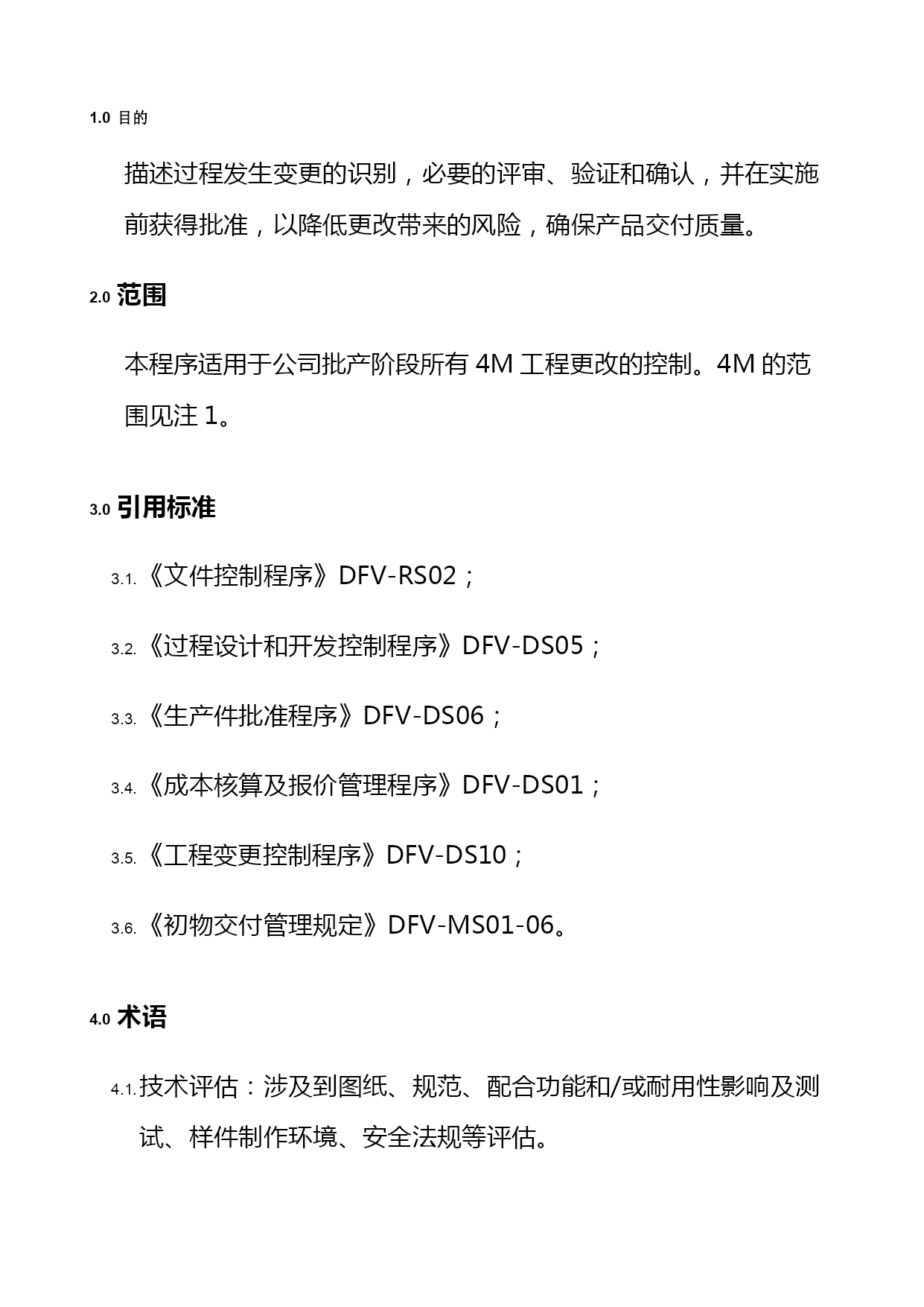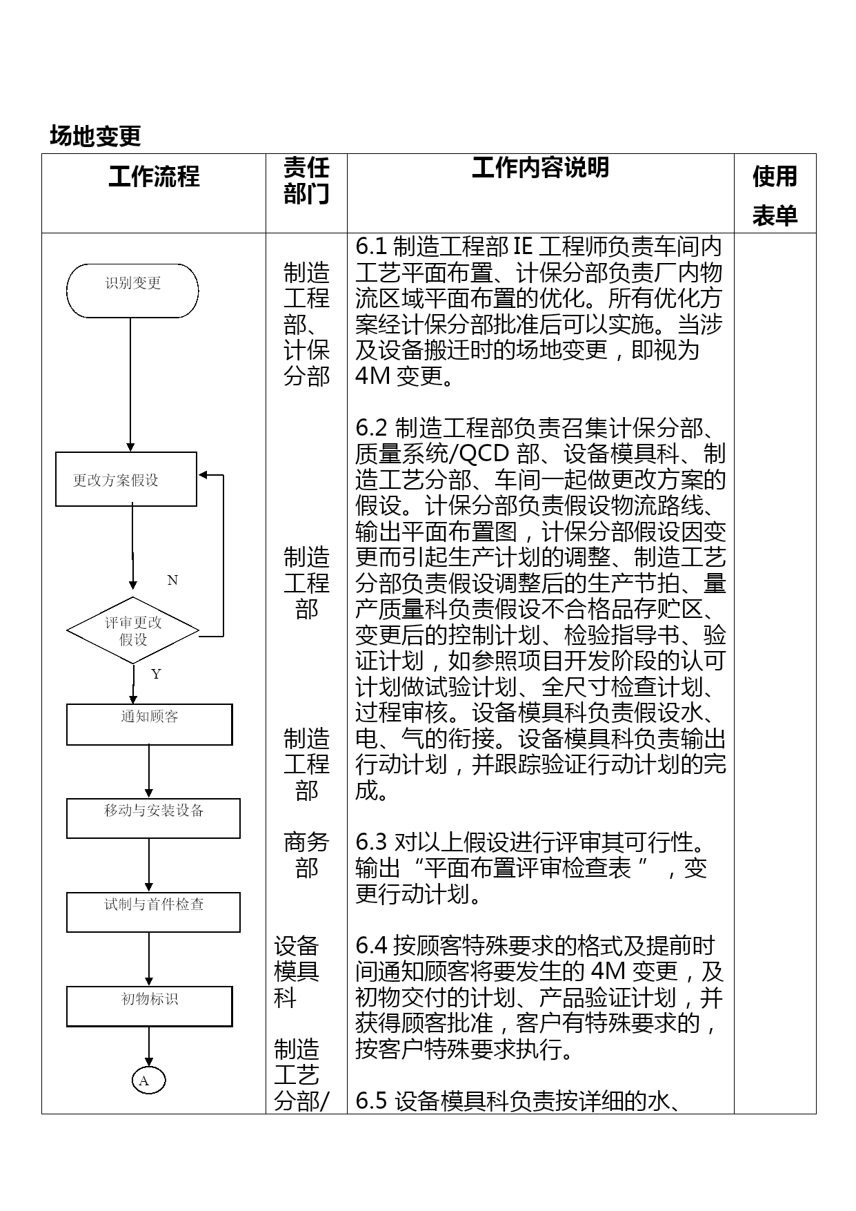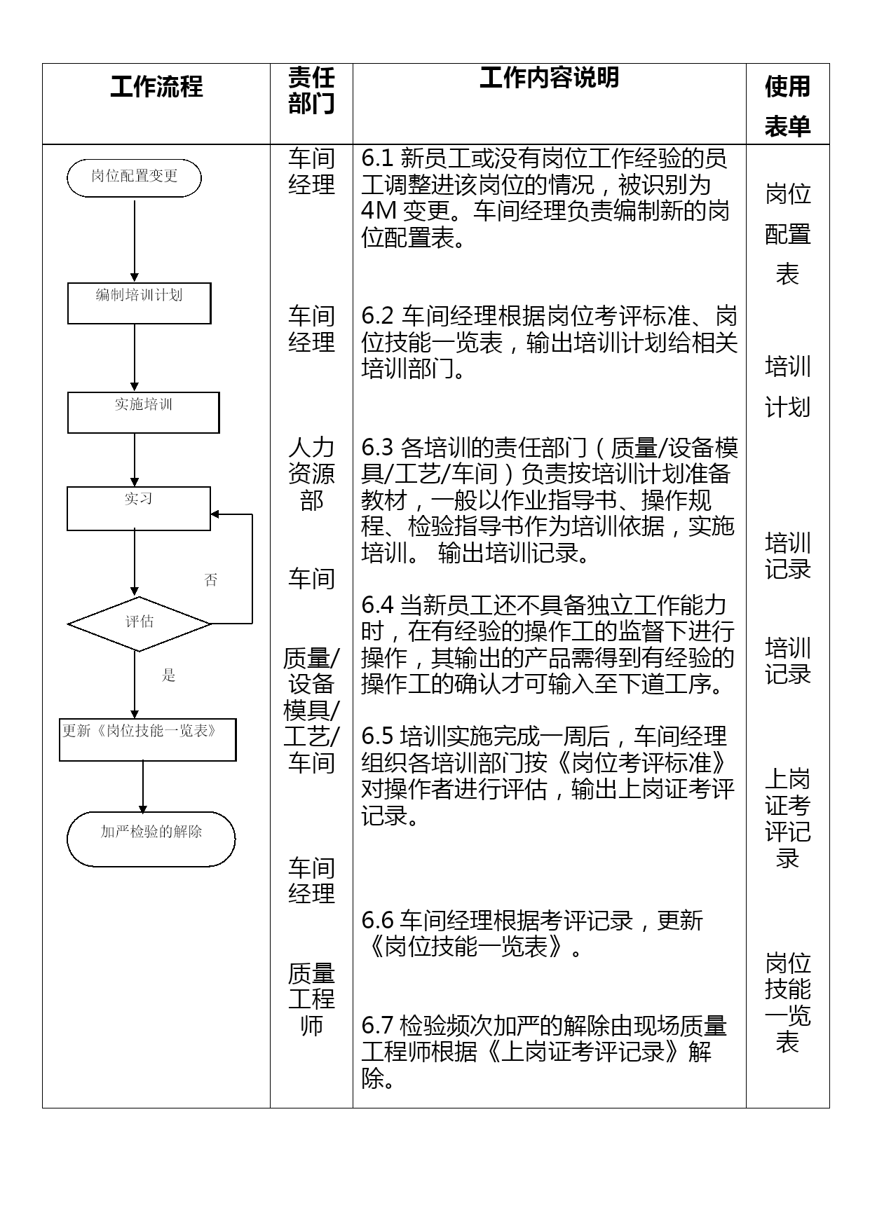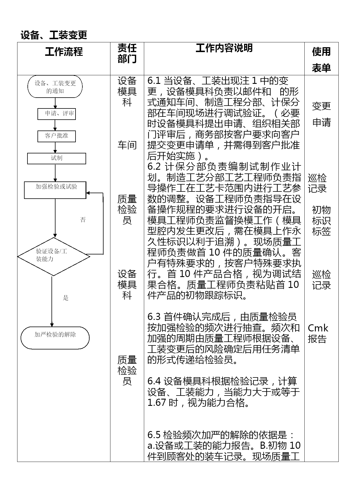 汽车生产制造公司4M变更控制程序(完整版)资料(可以直接使用,可编辑优秀版资料,欢迎下载)编制部门:制造工程部宋选鹏王涛生效日期:2013/08/01修订记录:版本号修订日期修订内容A02006/12/25根据原DFV-DS07工程变更A3版创建A12007/04/19增加供应商变更审批流程A22008/07/25增加加工方法变更导致变更时的对应流程A32021/10/30增加不同级别4M变更管理B02013/07/10依据公司部门职责变更换版,依据WDHAC新版的SQM更新B12021/4/20更新DPCA4M变更管理要求B12021/720依据SQM2021版更新变化点管理目的描述过程发生变更的识别,必要的评审、验证和确认,并在实施前获得批准,以降低更改带来的风险,确保产品交付质量。范围本程序适用于公司批产阶段所有4M工程更改的控制。4M的范围见注1。引用标准《文件控制程序》DFV-RS02;《过程设计和开发控制程序》DFV-DS05;《生产件批准程序》DFV-DS06;《成本核算及报价管理程序》DFV-DS01;《工程变更控制程序》DFV-DS10;《初物交付管理规定》DFV-MS01-06。术语技术评估:涉及到图纸、规范、配合功能和/或耐用性影响及测试、样件制作环境、安全法规等评估。商务评估:涉及到制造成本改变的评估。职责和权限制造工程部/制造工艺分部是4M变更的归口管理部门,采购部供应商管理科负责管理供应商的4M变更。流程/程序人员变更控制流程工作流程责任部门工作内容说明使用表单否是评估编制培训计划岗位配置变更实习更新《岗位技能一览表》实施培训加严检验的解除车间经理车间经理人力资源部车间质量/设备模具/工艺/车间车间经理质量工程师6.1新员工或没有岗位工作经验的员工调整进该岗位的情况,被识别为4M变更。车间经理负责编制新的岗位配置表。6.2车间经理根据岗位考评标准、岗位技能一览表,输出培训计划给相关培训部门。6.3各培训的责任部门(质量/设备模具/工艺/车间)负责按培训计划准备教材,一般以作业指导书、操作规程、检验指导书作为培训依据,实施培训。输出培训记录。6.4当新员工还不具备独立工作能力时,在有经验的操作工的监督下进行操作,其输出的产品需得到有经验的操作工的确认才可输入至下道工序。6.5培训实施完成一周后,车间经理组织各培训部门按《岗位考评标准》对操作者进行评估,输出上岗证考评记录。6.6车间经理根据考评记录,更新《岗位技能一览表》。6.7检验频次加严的解除由现场质量工程师根据《上岗证考评记录》解除。岗位配置表培训计划培训记录培训记录上岗证考评记录岗位技能一览表备注:对于顶岗的情况,顶岗人员必须是具备该岗位操作资质的人员(依据《岗位技能一览表》),无需进行脱岗培训和加严检验,由班长进行作业者观察,确认符合要求后开始生产作业,若发现操作与要求有差异的情况,由班长对顶岗人员进行在岗培训,检验员进行首件确认后开始生产作业。设备、工装变更工作流程责任部门工作内容说明使用表单试制客户批准设备、工装变更的通知申请、评审加强检验或试验是加严检验的解除否验证设备/工装能力设备模具科车间质量检验员设备模具科质量检验员6.1当设备、工装出现注1中的变更,设备模具科负责以邮件和的形式通知车间、制造工程分部、计保分部在车间现场进行调试验证。(必要时设备模具科提出申请、组织相关部门评审后,商务部按客户要求向客户提交变更申请单,并需得到客户批准后开始实施)。6.2计保分部负责编制试制作业计划。制造工艺分部工艺工程师负责指导操作工在工艺卡范围内进行工艺参数的调整。设备工程师负责指导在设备操作规程的要求进行设备的开启。模具工程师负责监督换模工作(模具型腔内发生更改后,需在模具上作永久性标识以利于追溯)。现场质量工程师负责做首10件的质量确认。客户有特殊要求的,按客户特殊要求执行。首10件产品合格,视为调试结果合格。质量工程师负责粘贴首10件产品的初物跟踪标识。6.3首件确认完成后,由质量检验员按加强检验的频次进行抽查。频次和加强的周期由质量工程师根据设备、工装变更后的风险确定后用任务清单的形式传递给检验员。6.4设备模具科根据检验记录,计算设备、工装能力,当能力大于或等于1.67时,视为能力合格。6.5检验频次加严的解除的依据是:a.设备或工装的能力报告。B.初物10件到顾客处的装车记录。现场质量工程师负责通知客服工程师跟踪初物的装车情况。客服工程师负责及时反馈装车信