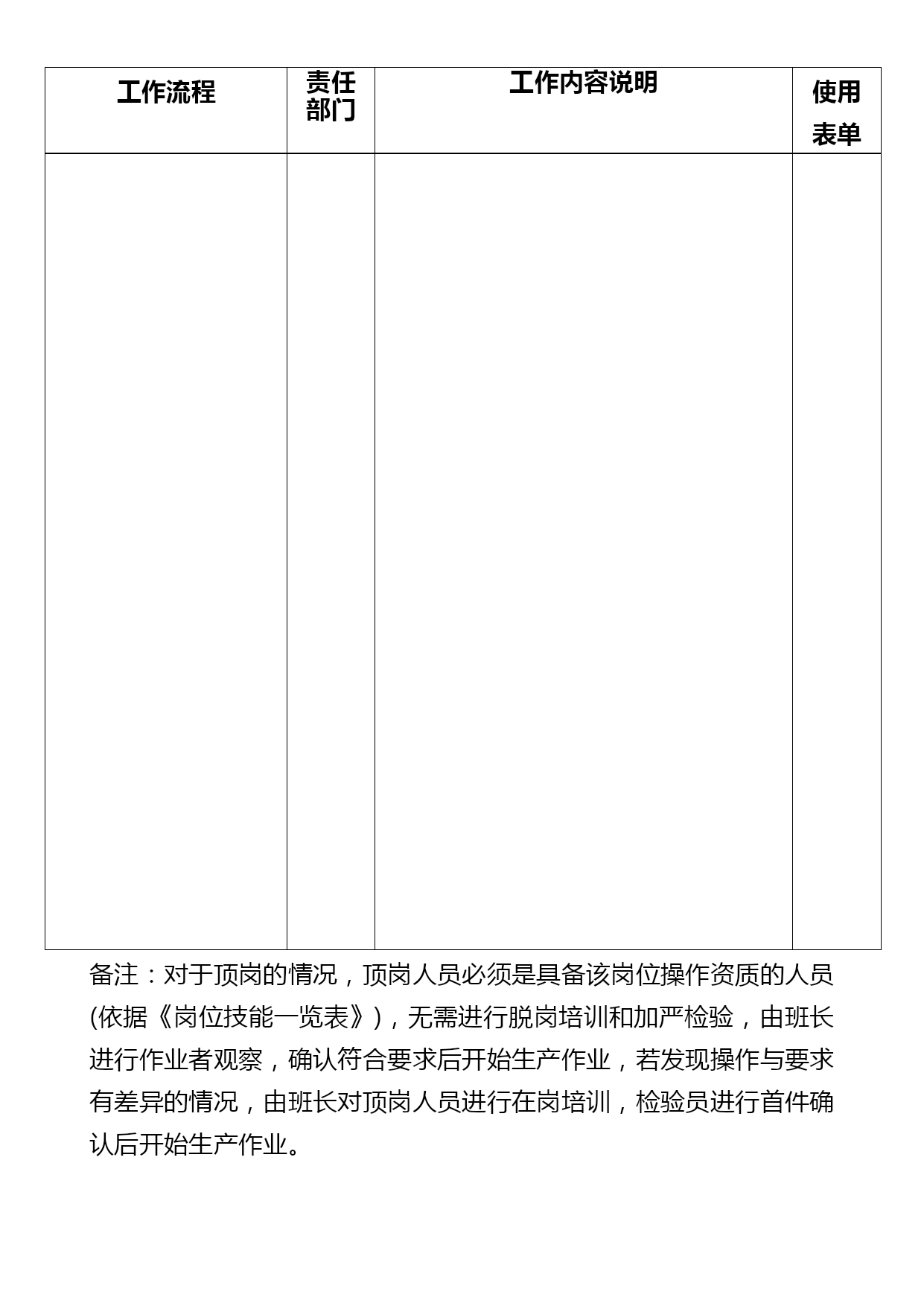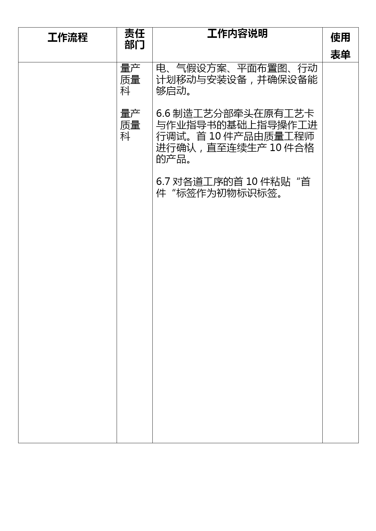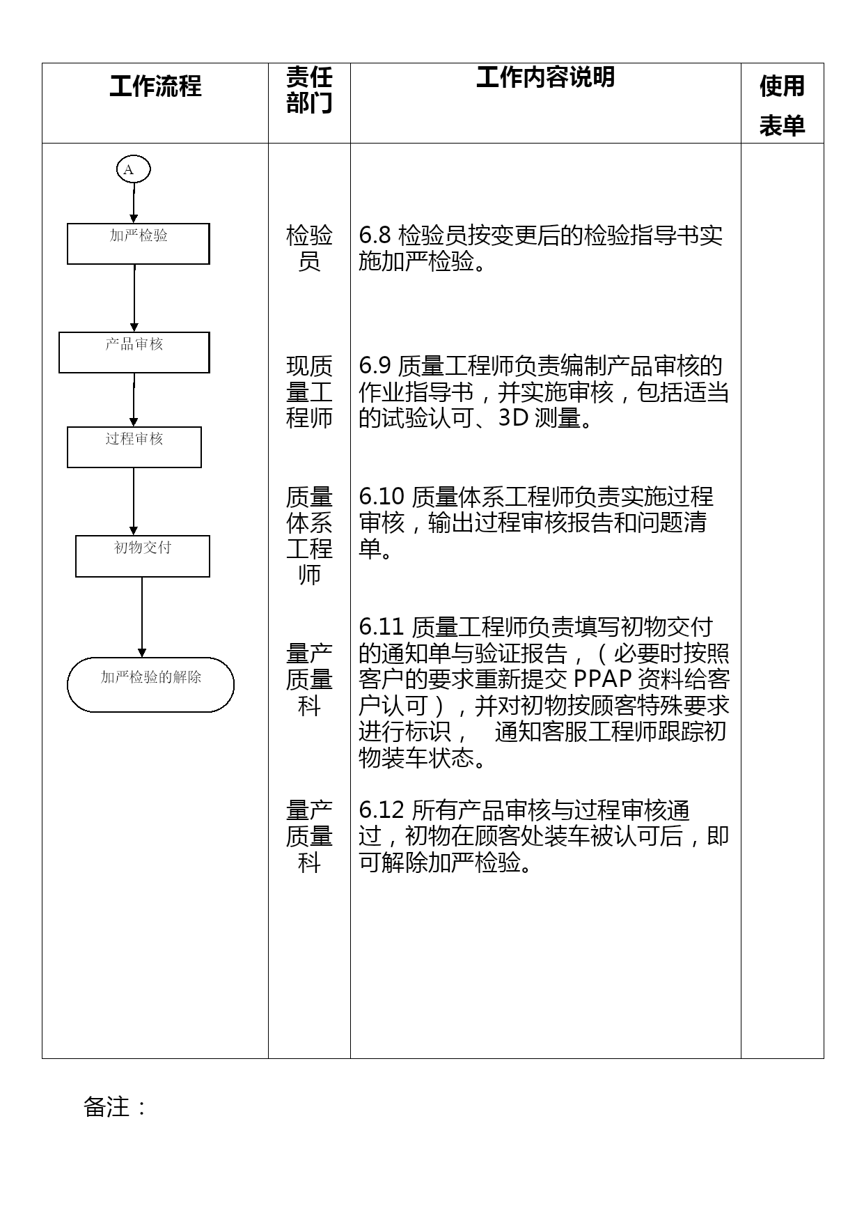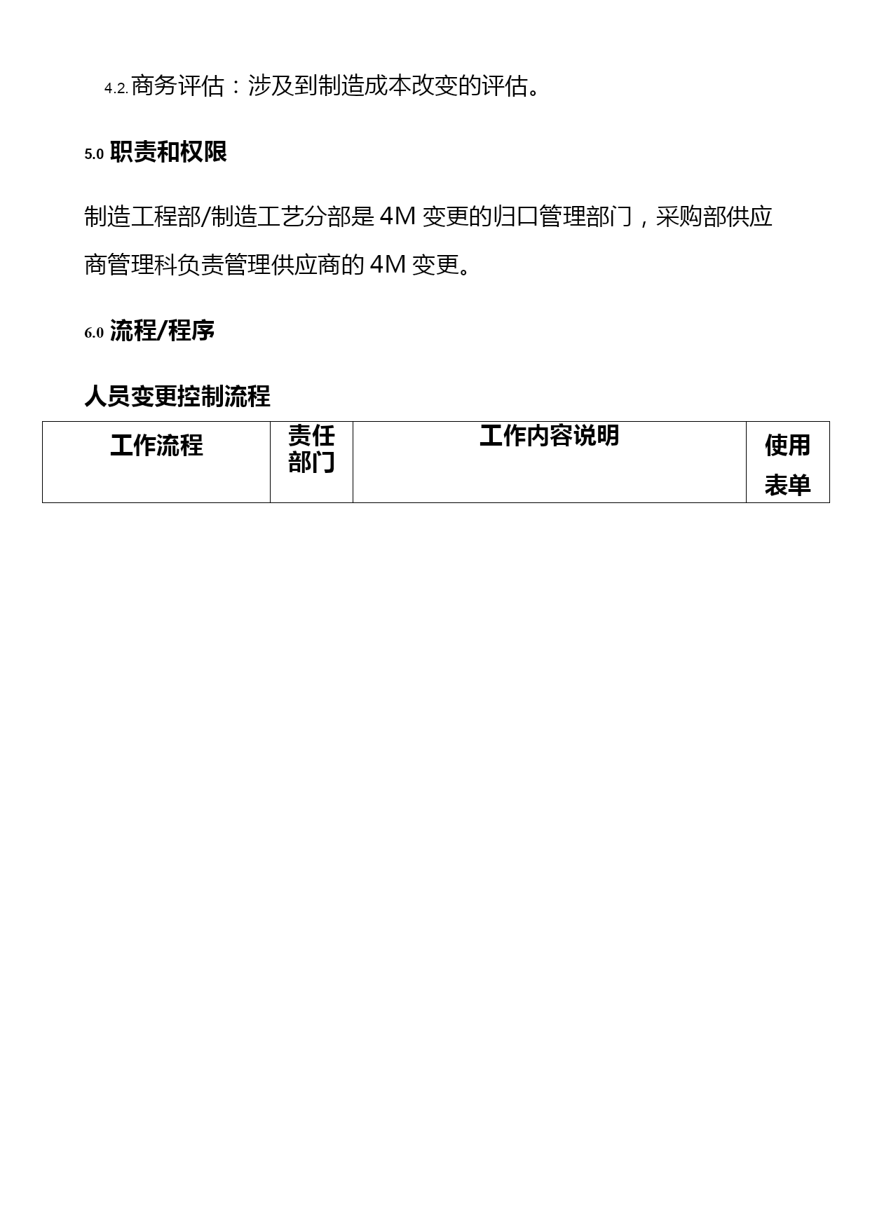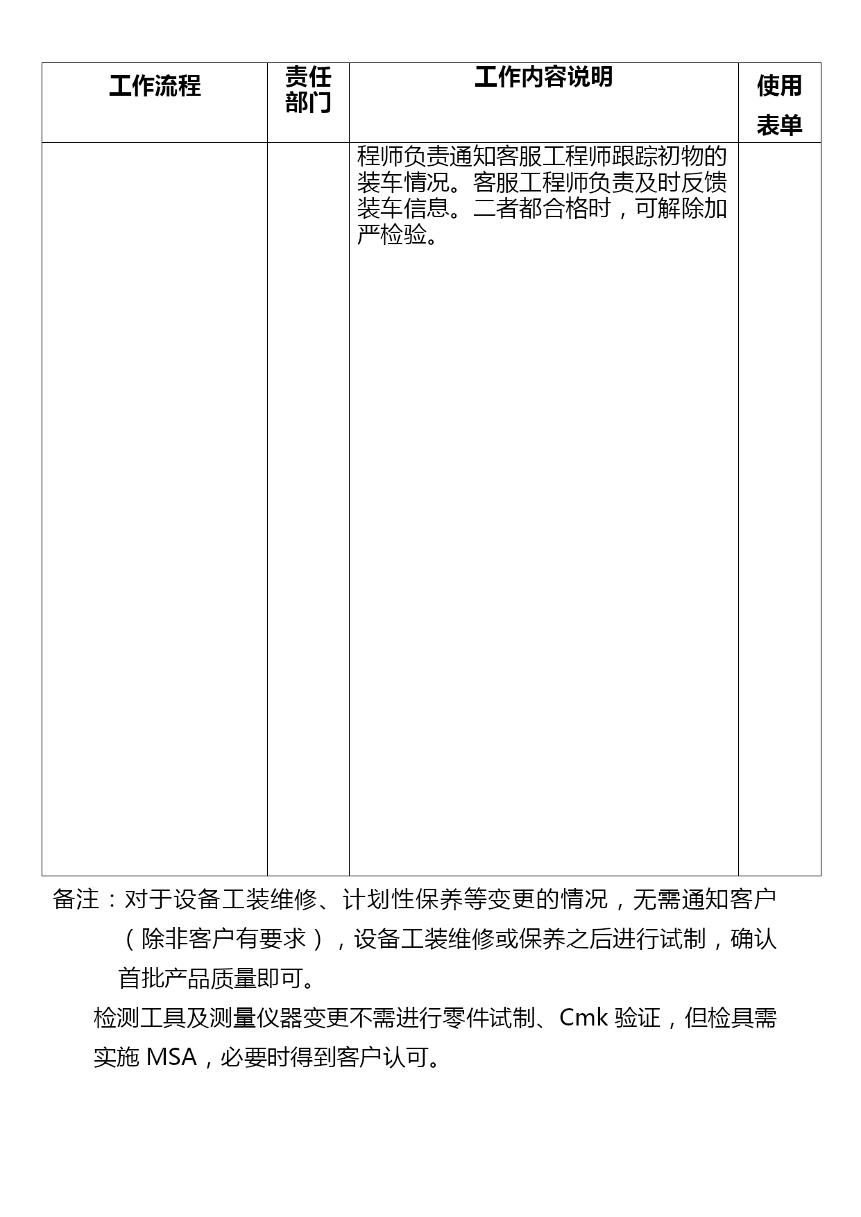 汽车生产制造公司4M变更控制程序(完整版)资料(可以直接使用,可编辑优秀版资料,欢迎下载)编制部门:制造工程部宋选鹏王涛生效日期:2013/08/01修订记录:版本号修订日期修订内容A02006/12/25根据原DFV-DS07工程变更A3版创建A12007/04/19增加供应商变更审批流程A22008/07/25增加加工方法变更导致变更时的对应流程A32021/10/30增加不同级别4M变更管理B02013/07/10依据公司部门职责变更换版,依据WDHAC新版的SQM更新B12021/4/20更新DPCA4M变更管理要求B12021/720依据SQM2021版更新变化点管理目的描述过程发生变更的识别,必要的评审、验证和确认,并在实施前获得批准,以降低更改带来的风险,确保产品交付质量。范围本程序适用于公司批产阶段所有4M工程更改的控制。4M的范围见注1。引用标准《文件控制程序》DFV-RS02;《过程设计和开发控制程序》DFV-DS05;《生产件批准程序》DFV-DS06;《成本核算及报价管理程序》DFV-DS01;《工程变更控制程序》DFV-DS10;《初物交付管理规定》DFV-MS01-06。术语技术评估:涉及到图纸、规范、配合功能和/或耐用性影响及测试、样件制作环境、安全法规等评估。商务评估:涉及到制造成本改变的评估。职责和权限制造工程部/制造工艺分部是4M变更的归口管理部门,采购部供应商管理科负责管理供应商的4M变更。流程/程序人员变更控制流程工作流程责任部门工作内容说明使用表单否是评估编制培训计划岗位配置变更实习更新《岗位技能一览表》实施培训加严检验的解除车间经理车间经理人力资源部车间质量/设备模具/工艺/车间车间经理质量工程师6.1新员工或没有岗位工作经验的员工调整进该岗位的情况,被识别为4M变更。车间经理负责编制新的岗位配置表。6.2车间经理根据岗位考评标准、岗位技能一览表,输出培训计划给相关培训部门。6.3各培训的责任部门(质量/设备模具/工艺/车间)负责按培训计划准备教材,一般以作业指导书、操作规程、检验指导书作为培训依据,实施培训。输出培训记录。6.4当新员工还不具备独立工作能力时,在有经验的操作工的监督下进行操作,其输出的产品需得到有经验的操作工的确认才可输入至下道工序。6.5培训实施完成一周后,车间经理组织各培训部门按《岗位考评标准》对操作者进行评估,输出上岗证考评记录。6.6车间经理根据考评记录,更新《岗位技能一览表》。6.7检验频次加严的解除由现场质量工程师根据《上岗证考评记录》解除。岗位配置表培训计划培训记录培训记录上岗证考评记录岗位技能一览表备注:对于顶岗的情况,顶岗人员必须是具备该岗位操作资质的人员(依据《岗位技能一览表》),无需进行脱岗培训和加严检验,由班长进行作业者观察,确认符合要求后开始生产作业,若发现操作与要求有差异的情况,由班长对顶岗人员进行在岗培训,检验员进行首件确认后开始生产作业。设备、工装变更工作流程责任部门工作内容说明使用表单试制客户批准设备、工装变更的通知申请、评审加强检验或试验是加严检验的解除否验证设备/工装能力设备模具科车间质量检验员设备模具科质量检验员6.1当设备、工装出现注1中的变更,设备模具科负责以邮件和的形式通知车间、制造工程分部、计保分部在车间现场进行调试验证。(必要时设备模具科提出申请、组织相关部门评审后,商务部按客户要求向客户提交变更申请单,并需得到客户批准后开始实施)。6.2计保分部负责编制试制作业计划。制造工艺分部工艺工程师负责指导操作工在工艺卡范围内进行工艺参数的调整。设备工程师负责指导在设备操作规程的要求进行设备的开启。模具工程师负责监督换模工作(模具型腔内发生更改后,需在模具上作永久性标识以利于追溯)。现场质量工程师负责做首10件的质量确认。客户有特殊要求的,按客户特殊要求执行。首10件产品合格,视为调试结果合格。质量工程师负责粘贴首10件产品的初物跟踪标识。6.3首件确认完成后,由质量检验员按加强检验的频次进行抽查。频次和加强的周期由质量工程师根据设备、工装变更后的风险确定后用任务清单的形式传递给检验员。6.4设备模具科根据检验记录,计算设备、工装能力,当能力大于或等于1.67时,视为能力合格。6.5检验频次加严的解除的依据是:a.设备或工装的能力报告。B.初物10件到顾客处的装车记录。现场质量工程师负责通知客服工程师跟踪初物的装车情况。客服工程师负责及时反馈装车信