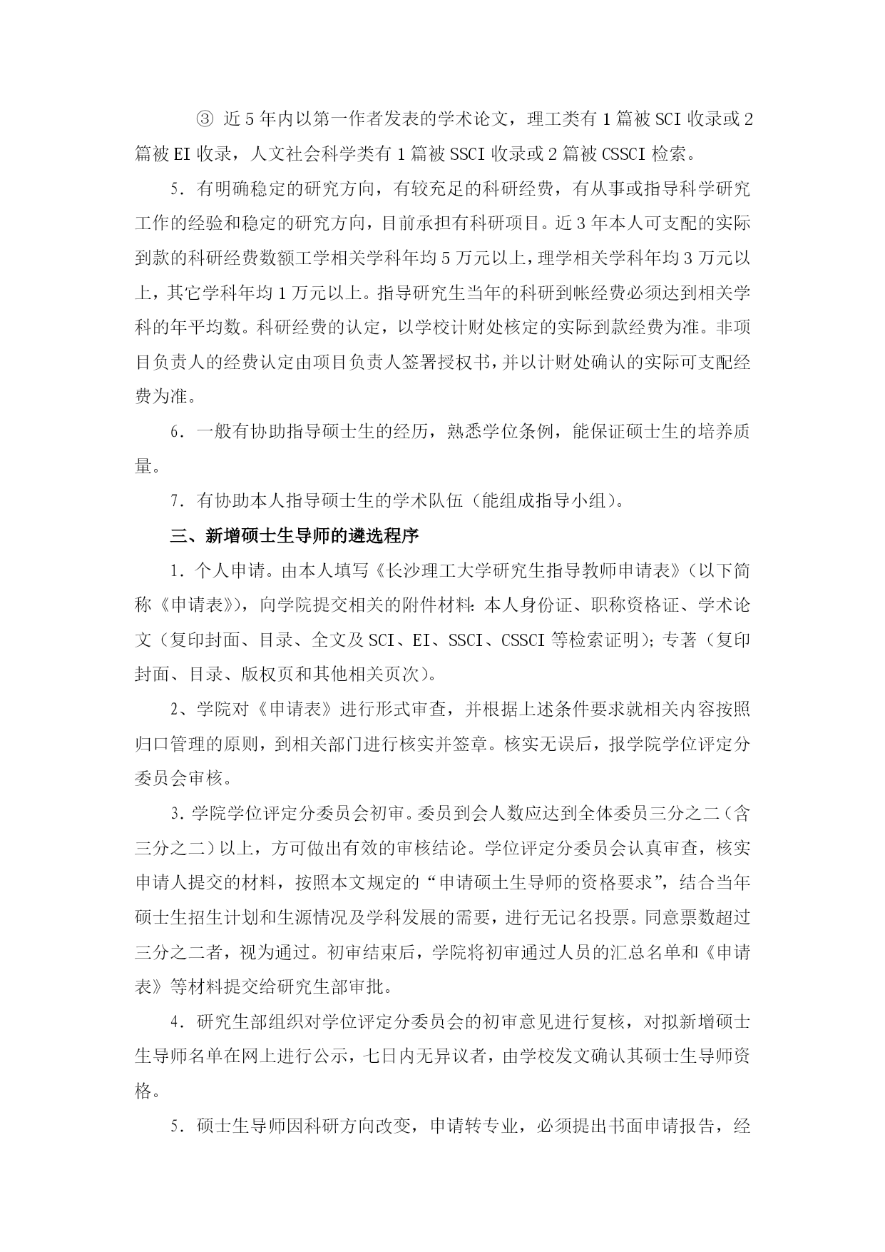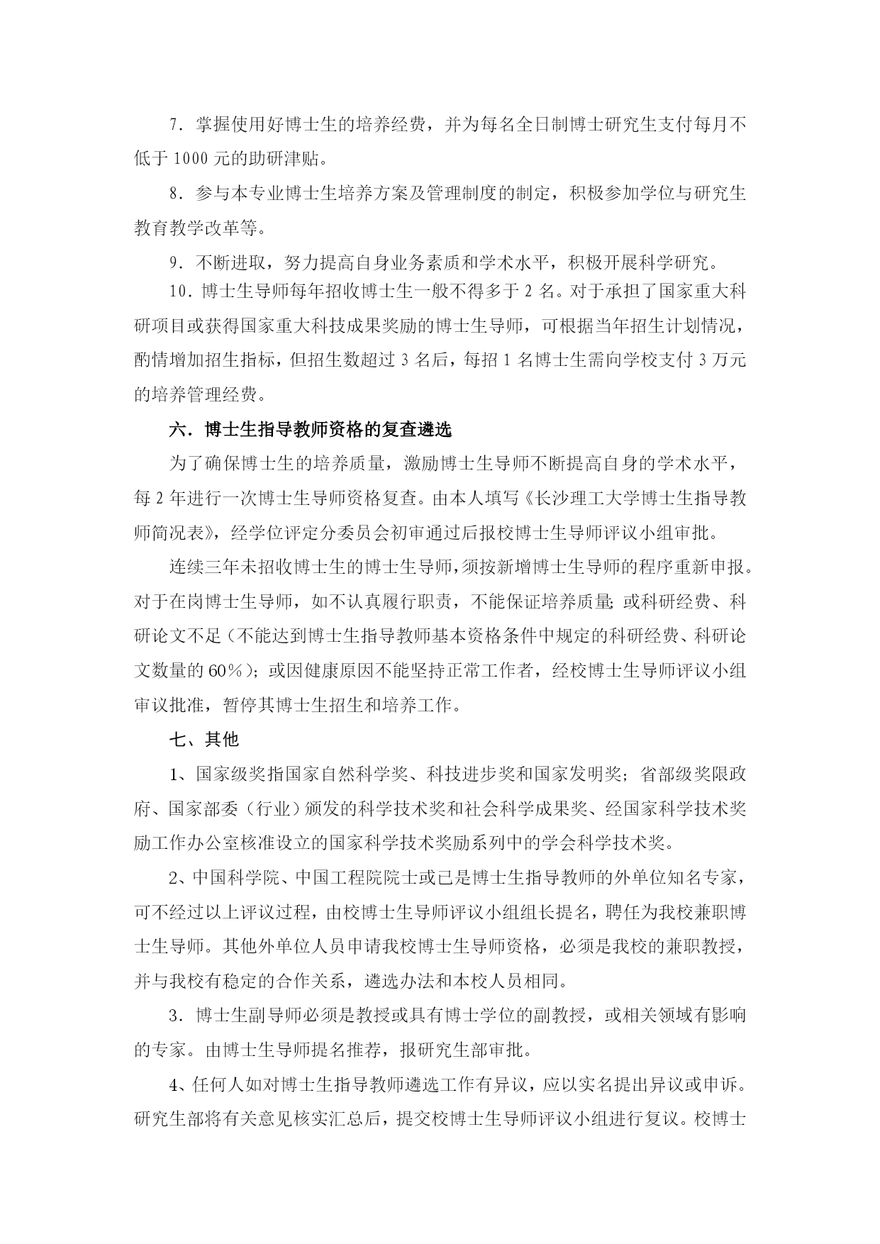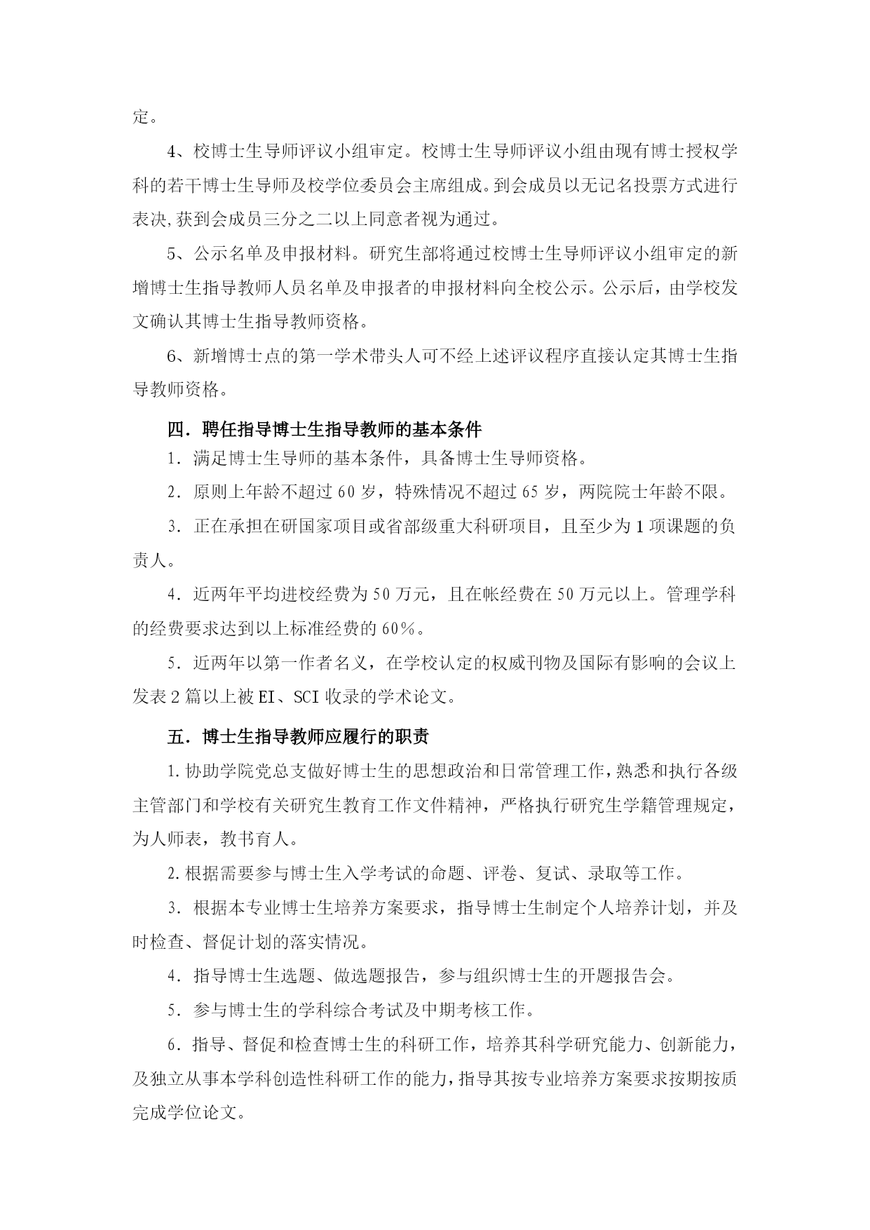 长沙理工大学研究生指导教师管理办法根据教育部教研〔2000〕1号文件《关于加强和改进研究生培养工作的几点意见》、国务院学位委员会学位[1995]20号《关于改革博士生指导教师审核办法的通知》、学位[1999]9号《关于进一步下放博士生指导教师审批权的通知》的精神,结合我校实际情况,特制订本办法。第一部分博士生指导教师管理办法一、遴选博士生指导教师的基本原则1.有利于学校学科建设和学科结构的调整,有利于为国家经济建设、科技进步和社会发展培养高层次、创新型专门人才。2.尊重专家评审意见,坚持标准,严格程序,公正合理,按需设岗。3.重视改善博士生指导教师队伍的年龄结构、知识结构及学历结构,不断提高导师队伍的整体质量。4.博士生指导教师采取评聘分离、先评后聘的模式来进行管理。先依据相关条件进行博士生导师的资格评定,再根据招生计划及导师的实际情况确定博士生导师的聘任,以确保博士研究生培养质量。二、博士生指导教师资格评选的基本条件1.热爱研究生教育事业,熟悉国家有关研究生教育的政策法规,教书育人,为人师表,具有高尚的科学道德,严谨的治学态度。能认真履行导师职责,每年能保证有半年以上的时间在国内指导博士生。2.具有教授(研究员或相当职称)专业技术职务,原则上年龄不超过57周岁(至当年8月31日止)。50岁以下的新聘博士生指导教师一般应具有博士学位。3.有较高的学术造诣和丰富的科学研究经验。学术水平应居国内本学科前列,能及时掌握本学科的前沿领域及发展趋势。近三年有重要的科研成果,达到下列条件之二:(1)近三年以第一作者名义,在核心刊物及国际有影响的会议上发表8篇学术论文,其中EI、SCI收录的论文不少于4篇,在国内外期刊上发表的论文不少于2篇,跨学科或挂靠学科申报的其主干学科的相关论文可予采纳。(2)近五年有2部学术专著公开出版(署名第一),并以第一作者名义,在学校认定的一般核心以上刊物公开发表3篇学术论文;(3)近五年获得过国家级奖(一等奖排名前8位,二等奖排名前5位),或省部级奖(一等奖排名前3位,二等奖排名前2位,三等奖排名第一)。4.近五年来承担过(或在研)国家项目或省部级重大科研项目,且至少为1项课题的负责人。有充足的科研经费,近三年每年到帐科研经费40万以上(管理类学科近三年每年到帐科研经费20万以上)。5.已完整培养过一届硕士研究生,或参加过博士生指导小组工作并完整地协助培养过一届博士生。6.有协助本人指导博士生的学术梯队或有博士生指导小组。同时具备上述6项条件者,具有担任博士生指导教师的申请资格。国家级有突出贡献的中青年专家、“百千万人才工程”国家级人选、教育部“新世纪优秀人才支持计划”人选,交通部“科技英才”、以及省部级学术(技术)带头人同等条件下可优先遴选。7.个别成绩突出但不具备第2条规定的博士学位条件者,必须具有硕士学位,获教授或相当专业技术职务满五年,同时具备第1、4、5、6条及第3条的全部条款。8.在教育部直属高校中已获博士生导师资格的本校教师,可凭相关证明材料转聘于我校相关博士点,获得博士生导师资格。三、新增博士生指导教师的遴选程序1、个人申报。填写《新增博士生指导教师资格审批表》,并提供相应的学术论文、科研成果和科研经费的有关证明材料到学科所在学位评定分委员会。2、学位评定分委员会初选。学位评定分委员会根据博士生指导教师的基本条件,采取无记名投票选出初选名单报研究生部。分委员会到会人数达到应到成员总数的三分之二以上,会议方为有效,获到会成员三分之二以上同意者视为通过。3、通讯评议。对通过初选的新申请博士生指导教师的人员,研究生部将聘请三名外单位有培养博士生经验的同行专家对其学术水平及指导博士生的能力进行通讯评议。通讯评议至少有二名通过者,方能提交校博士生导师评议小组审定。4、校博士生导师评议小组审定。校博士生导师评议小组由现有博士授权学科的若干博士生导师及校学位委员会主席组成。到会成员以无记名投票方式进行表决,获到会成员三分之二以上同意者视为通过。5、公示名单及申报材料。研究生部将通过校博士生导师评议小组审定的新增博士生指导教师人员名单及申报者的申报材料向全校公示。公示后,由学校发文确认其博士生指导教师资格。6、新增博士点的第一学术带头人可不经上述评议程序直接认定其博士生指导教师资格。四.聘任指导博士生指导教师的基本条件1.满足博士生导师的基本条件,具备博士生导师资格。2.原则上年龄不超过60岁,特殊情况不超过65岁,两院院士年龄不限。3.正在承担在研国家项目或省部级重大科研项目,且至少为1项课题的负责人。4.近两年平均进校经费为50万元,且在帐经费在50万元以上。管理学科的经费要求达到以上标准经费的60%。5.近两年以第一作者名义,在学校