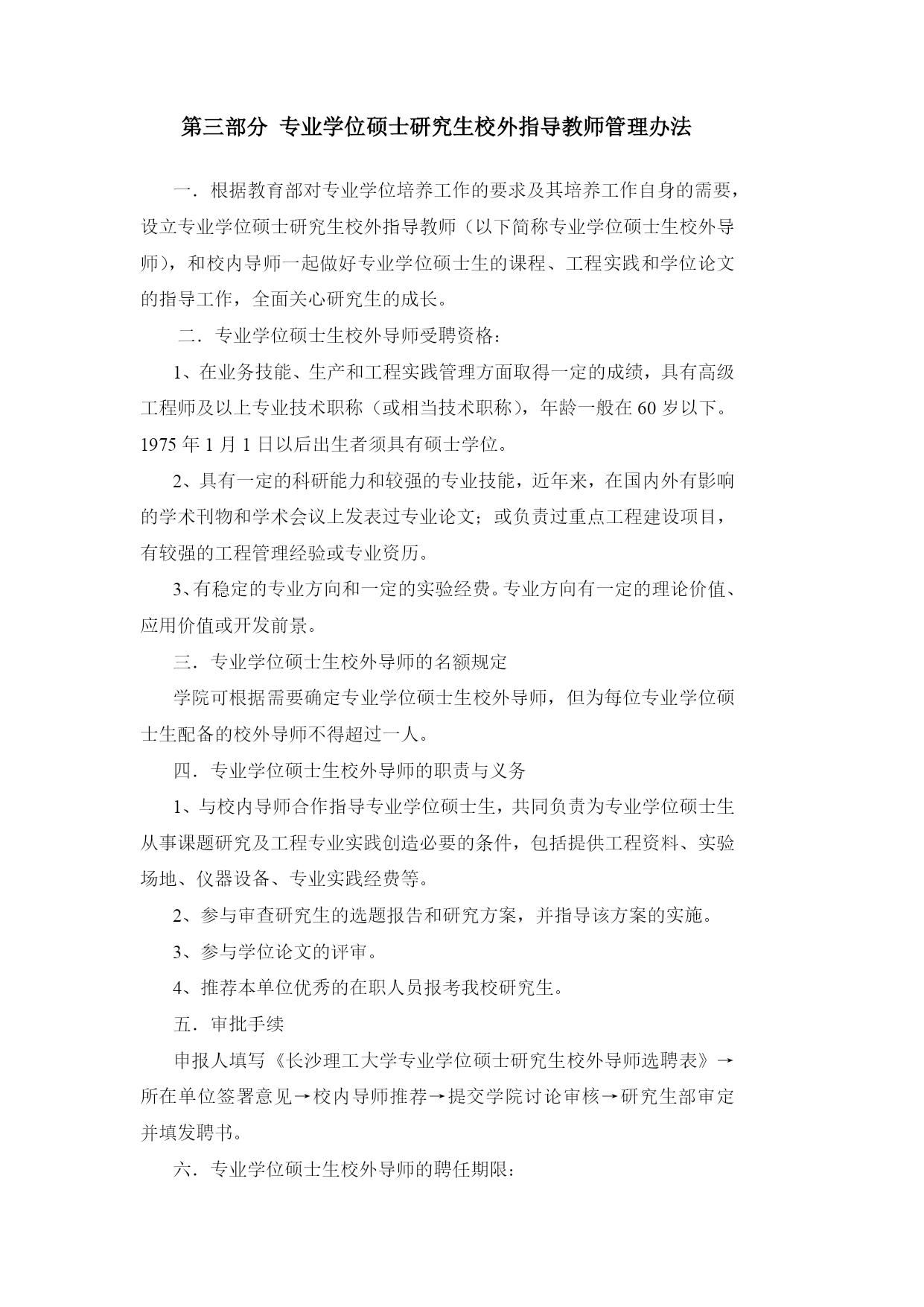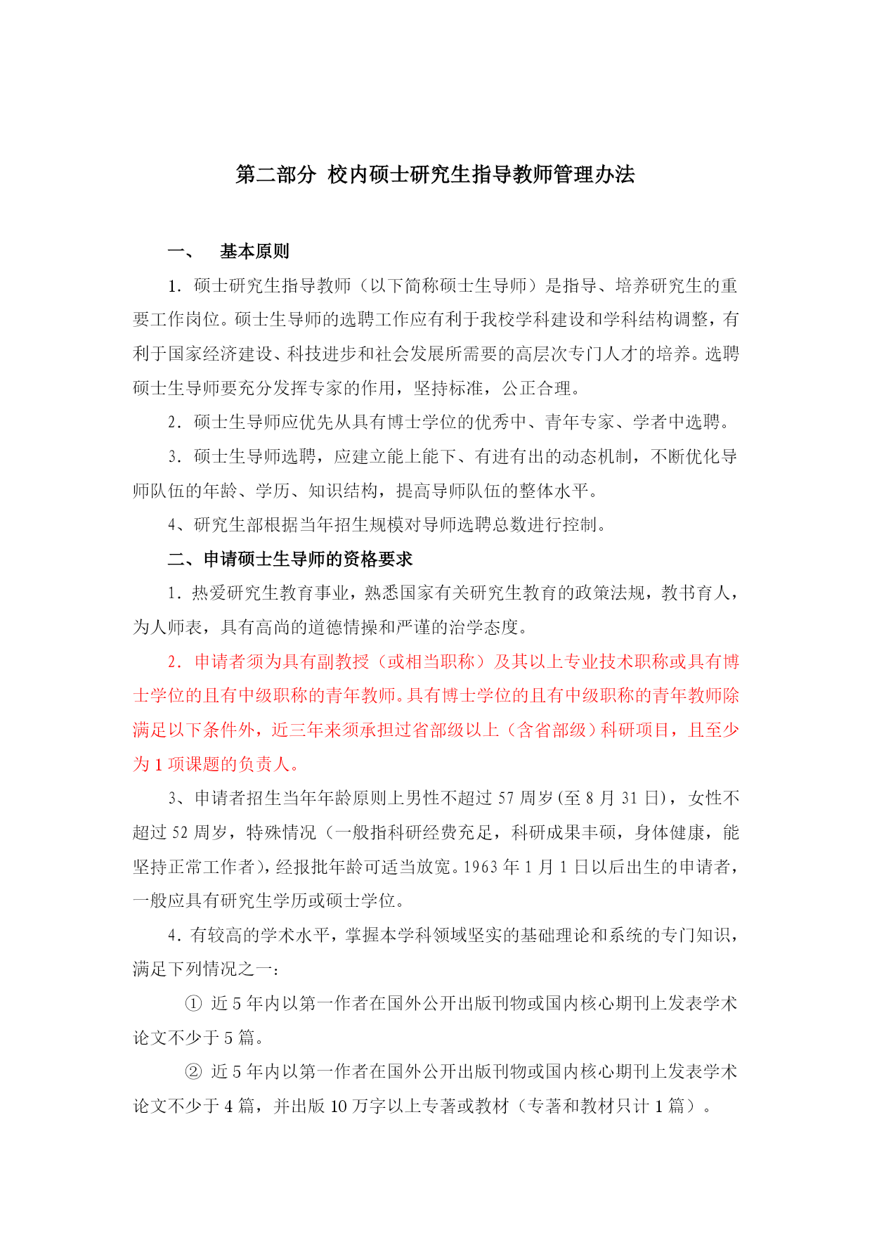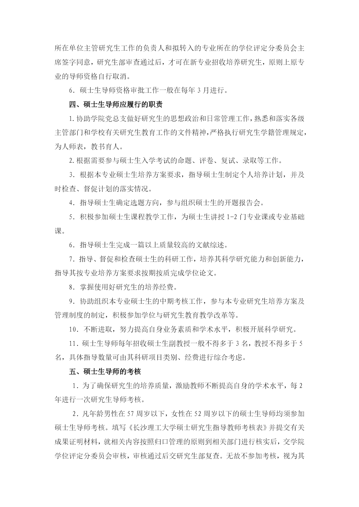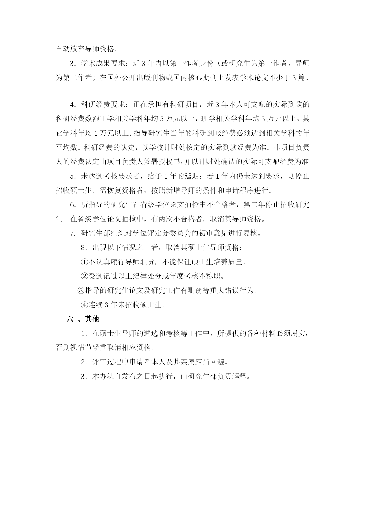 长沙理工大学研究生指导教师管理办法根据教育部教研〔2000〕1号文件《关于加强和改进研究生培养工作的几点意见》、国务院学位委员会学位[1995]20号《关于改革博士生指导教师审核办法的通知》、学位[1999]9号《关于进一步下放博士生指导教师审批权的通知》的精神,结合我校实际情况,特制订本办法。第一部分博士生指导教师管理办法一、遴选博士生指导教师的基本原则1.有利于学校学科建设和学科结构的调整,有利于为国家经济建设、科技进步和社会发展培养高层次、创新型专门人才。2.尊重专家评审意见,坚持标准,严格程序,公正合理,按需设岗。3.重视改善博士生指导教师队伍的年龄结构、知识结构及学历结构,不断提高导师队伍的整体质量。4.博士生指导教师采取评聘分离、先评后聘的模式来进行管理。先依据相关条件进行博士生导师的资格评定,再根据招生计划及导师的实际情况确定博士生导师的聘任,以确保博士研究生培养质量。二、博士生指导教师资格评选的基本条件1.热爱研究生教育事业,熟悉国家有关研究生教育的政策法规,教书育人,为人师表,具有高尚的科学道德,严谨的治学态度。能认真履行导师职责,每年能保证有半年以上的时间在国内指导博士生。2.具有教授(研究员或相当职称)专业技术职务,原则上年龄不超过57周岁(至当年8月31日止)。50岁以下的新聘博士生指导教师一般应具有博士学位。3.有较高的学术造诣和丰富的科学研究经验。学术水平应居国内本学科前列,能及时掌握本学科的前沿领域及发展趋势。近三年有重要的科研成果,达到下列条件之二:(1)近三年以第一作者名义,在核心刊物及国际有影响的会议上发表8篇学术论文,其中EI、SCI收录的论文不少于4篇,在国内外期刊上发表的论文不少于2篇,跨学科或挂靠学科申报的其主干学科的相关论文可予采纳。(2)近五年有2部学术专著公开出版(署名第一),并以第一作者名义,在学校认定的一般核心以上刊物公开发表3篇学术论文;(3)近五年获得过国家级奖(一等奖排名前8位,二等奖排名前5位),或省部级奖(一等奖排名前3位,二等奖排名前2位,三等奖排名第一)。4.近五年来承担过(或在研)国家项目或省部级重大科研项目,且至少为1项课题的负责人。有充足的科研经费,近三年每年到帐科研经费40万以上(管理类学科近三年每年到帐科研经费20万以上)。5.已完整培养过一届硕士研究生,或参加过博士生指导小组工作并完整地协助培养过一届博士生。6.有协助本人指导博士生的学术梯队或有博士生指导小组。同时具备上述6项条件者,具有担任博士生指导教师的申请资格。国家级有突出贡献的中青年专家、“百千万人才工程”国家级人选、教育部“新世纪优秀人才支持计划”人选,交通部“科技英才”、以及省部级学术(技术)带头人同等条件下可优先遴选。7.个别成绩突出但不具备第2条规定的博士学位条件者,必须具有硕士学位,获教授或相当专业技术职务满五年,同时具备第1、4、5、6条及第3条的全部条款。8.在教育部直属高校中已获博士生导师资格的本校教师,可凭相关证明材料转聘于我校相关博士点,获得博士生导师资格。三、新增博士生指导教师的遴选程序1、个人申报。填写《新增博士生指导教师资格审批表》,并提供相应的学术论文、科研成果和科研经费的有关证明材料到学科所在学位评定分委员会。2、学位评定分委员会初选。学位评定分委员会根据博士生指导教师的基本条件,采取无记名投票选出初选名单报研究生部。分委员会到会人数达到应到成员总数的三分之二以上,会议方为有效,获到会成员三分之二以上同意者视为通过。3、通讯评议。对通过初选的新申请博士生指导教师的人员,研究生部将聘请三名外单位有培养博士生经验的同行专家对其学术水平及指导博士生的能力进行通讯评议。通讯评议至少有二名通过者,方能提交校博士生导师评议小组审定。4、校博士生导师评议小组审定。校博士生导师评议小组由现有博士授权学科的若干博士生导师及校学位委员会主席组成。到会成员以无记名投票方式进行表决,获到会成员三分之二以上同意者视为通过。5、公示名单及申报材料。研究生部将通过校博士生导师评议小组审定的新增博士生指导教师人员名单及申报者的申报材料向全校公示。公示后,由学校发文确认其博士生指导教师资格。6、新增博士点的第一学术带头人可不经上述评议程序直接认定其博士生指导教师资格。四.聘任指导博士生指导教师的基本条件1.满足博士生导师的基本条件,具备博士生导师资格。2.原则上年龄不超过60岁,特殊情况不超过65岁,两院院士年龄不限。3.正在承担在研国家项目或省部级重大科研项目,且至少为1项课题的负责人。4.近两年平均进校经费为50万元,且在帐经费在50万元以上。管理学科的经费要求达到以上标准经费的60%。5.近两年以第一作者名义,在学校