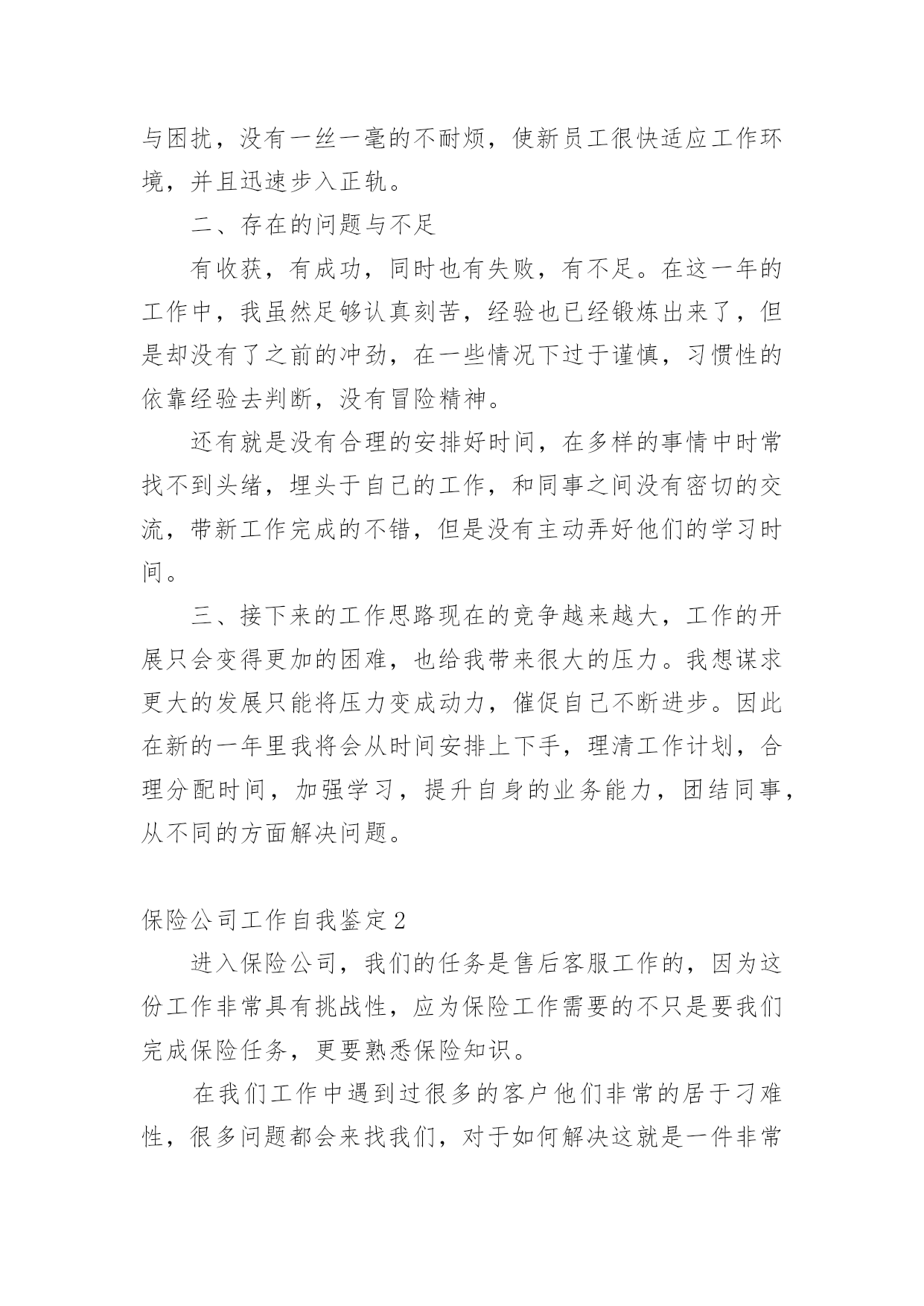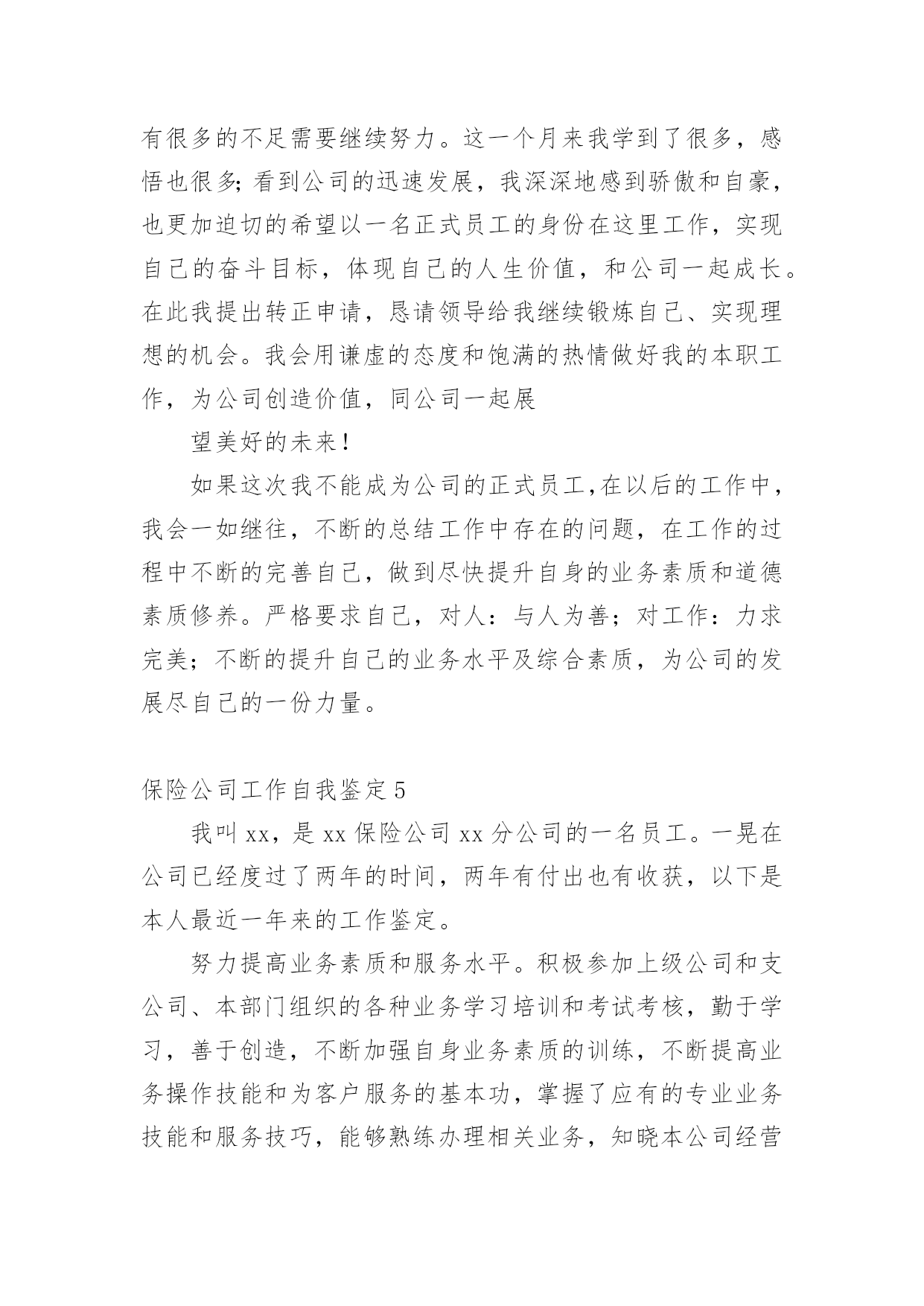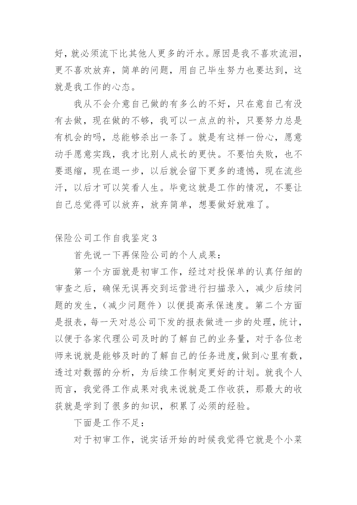 保险公司工作自我鉴定自我鉴定是个人在一个阶段的自我总结,自我鉴定使我们及时找出错误并改正,不如我们来制定一份自我鉴定吧。自我鉴定怎么写才能发挥它的作用呢?下面是小编为大家整理的保险公司工作自我鉴定,欢迎阅读与收藏。保险公司工作自我鉴定1加入xx保险公司工作已经有六年的时间,在这些时间里我的工作一年比一年有进步,一年比一年更加有动力,在过去的一年里,我不但圆满完成了上级给我布置的任务,还在不断学习专业知识,取得了不错的成绩。下面我将这一年的工作和学习的状况做一个简单的总结:一、工作和学习情况过去一年我的工作主要分为两个阶段,上半年是关于销售,下半年是服务。在这期间,我在思想上积极的向上,不断学习新的政策理论知识,坚定自己的信念。工作上,圆满的完成各项任务,在上半年拉拢客户,各个地方跑动,不仅完成了布置的任务,还有所超出。下半年,我细致认真的为客户做好服务工作,没有投诉。在这一年中,积极参加各项培训的机会,加强自身的素质。在公司的会议上,认真领会会议精神,时常提出自己对公司现有问题的建议。在基础服务上,每当客户有难题时,热情周到的做好服务工作,无论在什么时间都没有过埋怨。在公司招新期间更是对新员工做好培训工作,慷慨解答问题与困扰,没有一丝一毫的不耐烦,使新员工很快适应工作环境,并且迅速步入正轨。二、存在的问题与不足有收获,有成功,同时也有失败,有不足。在这一年的工作中,我虽然足够认真刻苦,经验也已经锻炼出来了,但是却没有了之前的冲劲,在一些情况下过于谨慎,习惯性的依靠经验去判断,没有冒险精神。还有就是没有合理的安排好时间,在多样的事情中时常找不到头绪,埋头于自己的工作,和同事之间没有密切的交流,带新工作完成的不错,但是没有主动弄好他们的学习时间。三、接下来的工作思路现在的竞争越来越大,工作的开展只会变得更加的困难,也给我带来很大的压力。我想谋求更大的发展只能将压力变成动力,催促自己不断进步。因此在新的一年里我将会从时间安排上下手,理清工作计划,合理分配时间,加强学习,提升自身的业务能力,团结同事,从不同的方面解决问题。保险公司工作自我鉴定2进入保险公司,我们的任务是售后客服工作的,因为这份工作非常具有挑战性,应为保险工作需要的不只是要我们完成保险任务,更要熟悉保险知识。在我们工作中遇到过很多的客户他们非常的居于刁难性,很多问题都会来找我们,对于如何解决这就是一件非常难的问题,我也希望自己可以做好,每天我都在自己的岗位上认真的作做着工作,但是电话从来没有断过,都是各种保险问题,比如有的客户会询问我,关于保险工作的相关赔款事宜,有什么要注意的事项吗,还有什么要做的,必须如何做好等。面对这么多询问,每天都是一个考验,而我们的业绩考察也是以服务完成一个客户为标准,我来到公司的时间不长,所以完成的数量不多,每天我都要保证自己完成至少50个工作任务,还要继续不断提升。在我们岗位上能力越大收获也就越大,当然,这还要看个人的努力,没有付出的人是在岗位上做不到多少业绩的。来到公司前,我就已经有了充足的心里准备,有了面对压力的勇气,更知道自己的缺点和不足,所以我也并没有多么在意知识希望自己可以在这个行业里面做的更好,学的更多而已。进入今后我不会认为自己是一个新人,就必须要享受更多的优厚待遇,相反在我认为,既然我是一个新人,我就必须要完成的比其他人更好,这样我才有竞争力,才能够在岗位上作出好成绩。努力压迫出了我的潜力,在我每天如一日的工作中,把自己的基础保险信息资料记下了解之后认真分析明悟后我的能力也提升的更多,有了更大的提高,不用在如同过去一样一直都犯相同的问题。就这样,我走过了一个新人需要花费六个月才能够完成的实习,我只花费了三个月时间,这是用自己的努力获取的,因为坚定的认为,一个人想要获得更好,就必须流下比其他人更多的汗水。原因是我不喜欢流泪,更不喜欢放弃,简单的问题,用自己毕生努力也要达到,这就是我工作的心态。我从不会介意自己做的有多么的不好,只在意自己有没有去做,现在做的不够,我可以一点点的补,只要努力总是有机会的吗,总能够杀出一条了。就是有这样一份心,愿意动手愿意实践,我才比别人成长的更快。不要怕失败,也不要退缩,现在退一步,以后就会留下更多的遗憾,现在流些汗,以后才可以笑看人生。毕竟这就是工作的情况,不要让自己总觉得可以放弃,放弃简单,想要做好就难了。保险公司工作自我鉴定3首先说一下再保险公司的个人成果:第一个方面就是初审工作,经过对投保单的认真仔细的审查之后,确保无误再交到运营进行扫描录入,减少后续问题的发生,(减少问题件)以便提高承保速度。第二个方面是报表,每一天对总公司下发的报表做进一步的处理,统计,以便于各家代理公司及时的了解自己的业务量,对于各位老师来说就是能够及时的了解自己的任务进度,做到心里有数,透过对数据的分析,为后续