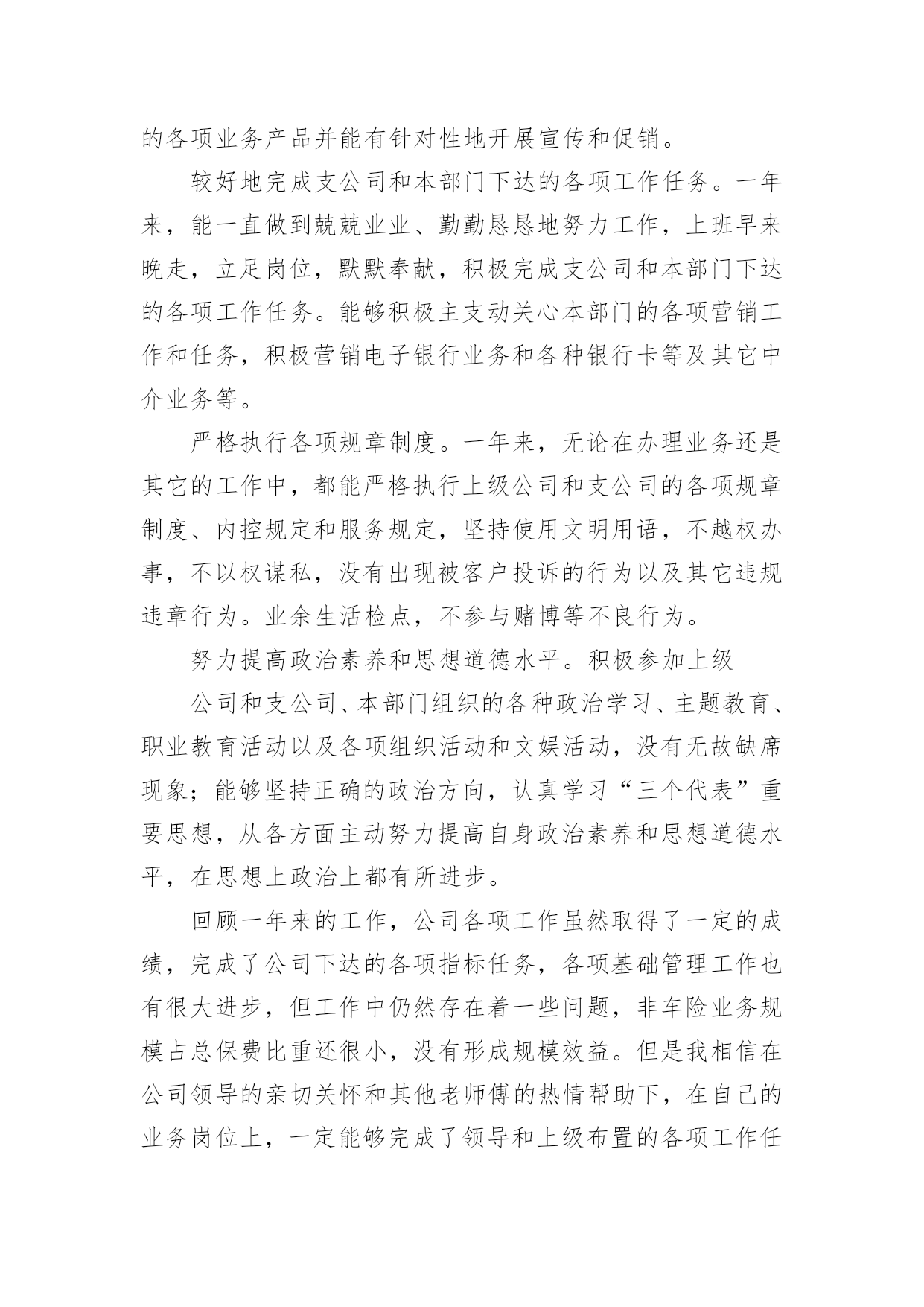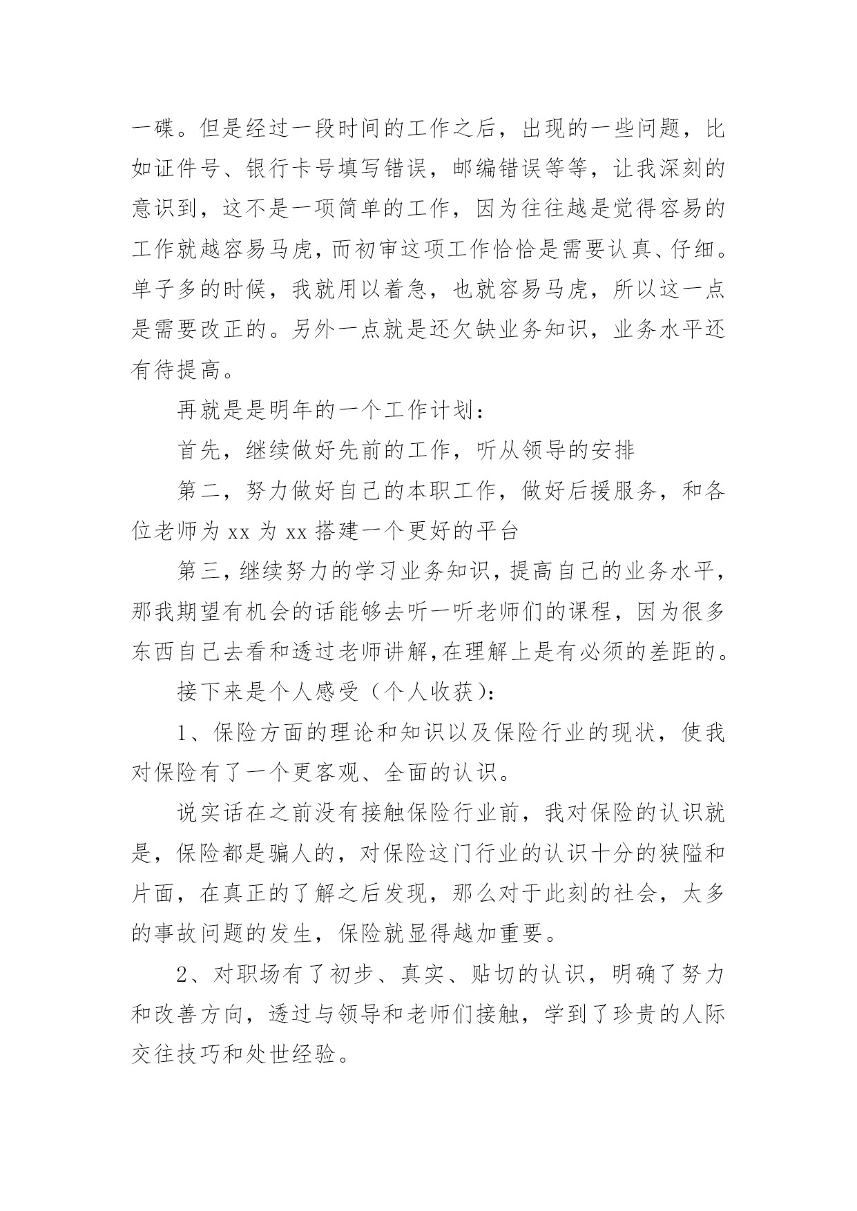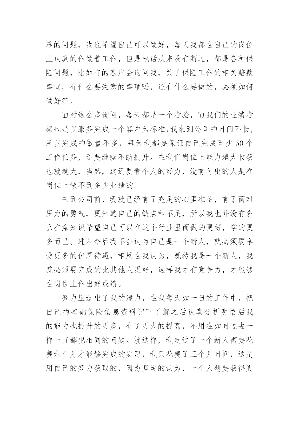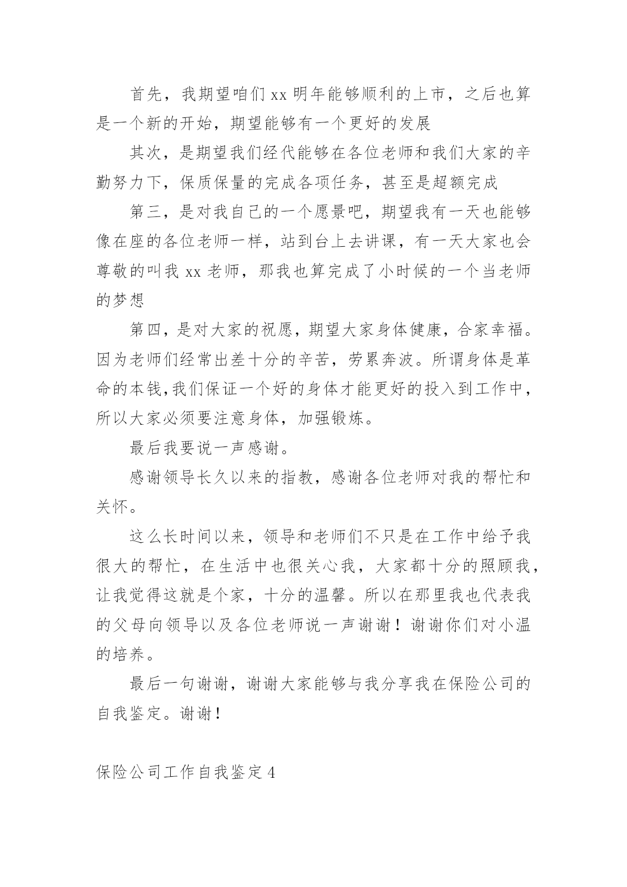 保险公司工作自我鉴定自我鉴定是个人在一个阶段的自我总结,自我鉴定使我们及时找出错误并改正,不如我们来制定一份自我鉴定吧。自我鉴定怎么写才能发挥它的作用呢?下面是小编为大家整理的保险公司工作自我鉴定,欢迎阅读与收藏。保险公司工作自我鉴定1加入xx保险公司工作已经有六年的时间,在这些时间里我的工作一年比一年有进步,一年比一年更加有动力,在过去的一年里,我不但圆满完成了上级给我布置的任务,还在不断学习专业知识,取得了不错的成绩。下面我将这一年的工作和学习的状况做一个简单的总结:一、工作和学习情况过去一年我的工作主要分为两个阶段,上半年是关于销售,下半年是服务。在这期间,我在思想上积极的向上,不断学习新的政策理论知识,坚定自己的信念。工作上,圆满的完成各项任务,在上半年拉拢客户,各个地方跑动,不仅完成了布置的任务,还有所超出。下半年,我细致认真的为客户做好服务工作,没有投诉。在这一年中,积极参加各项培训的机会,加强自身的素质。在公司的会议上,认真领会会议精神,时常提出自己对公司现有问题的建议。在基础服务上,每当客户有难题时,热情周到的做好服务工作,无论在什么时间都没有过埋怨。在公司招新期间更是对新员工做好培训工作,慷慨解答问题与困扰,没有一丝一毫的不耐烦,使新员工很快适应工作环境,并且迅速步入正轨。二、存在的问题与不足有收获,有成功,同时也有失败,有不足。在这一年的工作中,我虽然足够认真刻苦,经验也已经锻炼出来了,但是却没有了之前的冲劲,在一些情况下过于谨慎,习惯性的依靠经验去判断,没有冒险精神。还有就是没有合理的安排好时间,在多样的事情中时常找不到头绪,埋头于自己的工作,和同事之间没有密切的交流,带新工作完成的不错,但是没有主动弄好他们的学习时间。三、接下来的工作思路现在的竞争越来越大,工作的开展只会变得更加的困难,也给我带来很大的压力。我想谋求更大的发展只能将压力变成动力,催促自己不断进步。因此在新的一年里我将会从时间安排上下手,理清工作计划,合理分配时间,加强学习,提升自身的业务能力,团结同事,从不同的方面解决问题。保险公司工作自我鉴定2进入保险公司,我们的任务是售后客服工作的,因为这份工作非常具有挑战性,应为保险工作需要的不只是要我们完成保险任务,更要熟悉保险知识。在我们工作中遇到过很多的客户他们非常的居于刁难性,很多问题都会来找我们,对于如何解决这就是一件非常难的问题,我也希望自己可以做好,每天我都在自己的岗位上认真的作做着工作,但是电话从来没有断过,都是各种保险问题,比如有的客户会询问我,关于保险工作的相关赔款事宜,有什么要注意的事项吗,还有什么要做的,必须如何做好等。面对这么多询问,每天都是一个考验,而我们的业绩考察也是以服务完成一个客户为标准,我来到公司的时间不长,所以完成的数量不多,每天我都要保证自己完成至少50个工作任务,还要继续不断提升。在我们岗位上能力越大收获也就越大,当然,这还要看个人的努力,没有付出的人是在岗位上做不到多少业绩的。来到公司前,我就已经有了充足的心里准备,有了面对压力的勇气,更知道自己的缺点和不足,所以我也并没有多么在意知识希望自己可以在这个行业里面做的更好,学的更多而已。进入今后我不会认为自己是一个新人,就必须要享受更多的优厚待遇,相反在我认为,既然我是一个新人,我就必须要完成的比其他人更好,这样我才有竞争力,才能够在岗位上作出好成绩。努力压迫出了我的潜力,在我每天如一日的工作中,把自己的基础保险信息资料记下了解之后认真分析明悟后我的能力也提升的更多,有了更大的提高,不用在如同过去一样一直都犯相同的问题。就这样,我走过了一个新人需要花费六个月才能够完成的实习,我只花费了三个月时间,这是用自己的努力获取的,因为坚定的认为,一个人想要获得更好,就必须流下比其他人更多的汗水。原因是我不喜欢流泪,更不喜欢放弃,简单的问题,用自己毕生努力也要达到,这就是我工作的心态。我从不会介意自己做的有多么的不好,只在意自己有没有去做,现在做的不够,我可以一点点的补,只要努力总是有机会的吗,总能够杀出一条了。就是有这样一份心,愿意动手愿意实践,我才比别人成长的更快。不要怕失败,也不要退缩,现在退一步,以后就会留下更多的遗憾,现在流些汗,以后才可以笑看人生。毕竟这就是工作的情况,不要让自己总觉得可以放弃,放弃简单,想要做好就难了。保险公司工作自我鉴定3首先说一下再保险公司的个人成果:第一个方面就是初审工作,经过对投保单的认真仔细的审查之后,确保无误再交到运营进行扫描录入,减少后续问题的发生,(减少问题件)以便提高承保速度。第二个方面是报表,每一天对总公司下发的报表做进一步的处理,统计,以便于各家代理公司及时的了解自己的业务量,对于各位老师来说就是能够及时的了解自己的任务进度,做到心里有数,透过对数据的分析,为后续