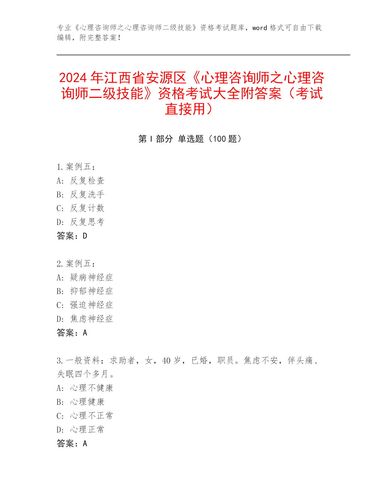 历年江西省安源区《心理咨询师之心理咨询师二级技能》资格考试大全含答案(最新)
