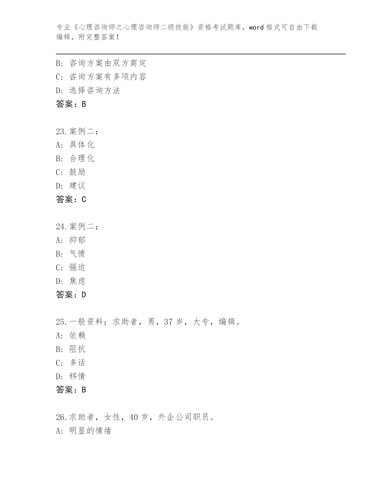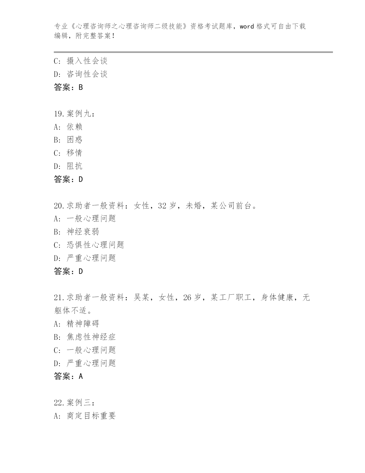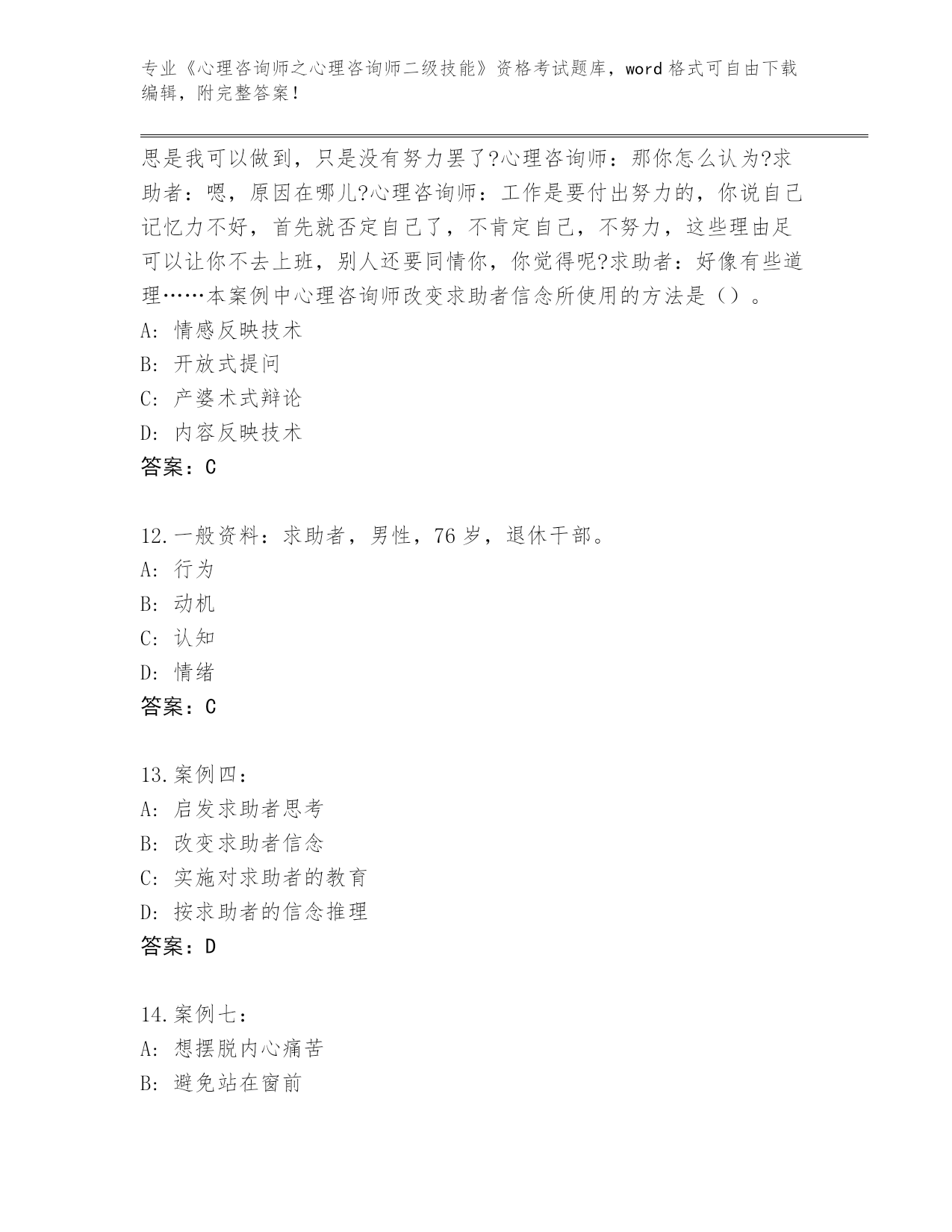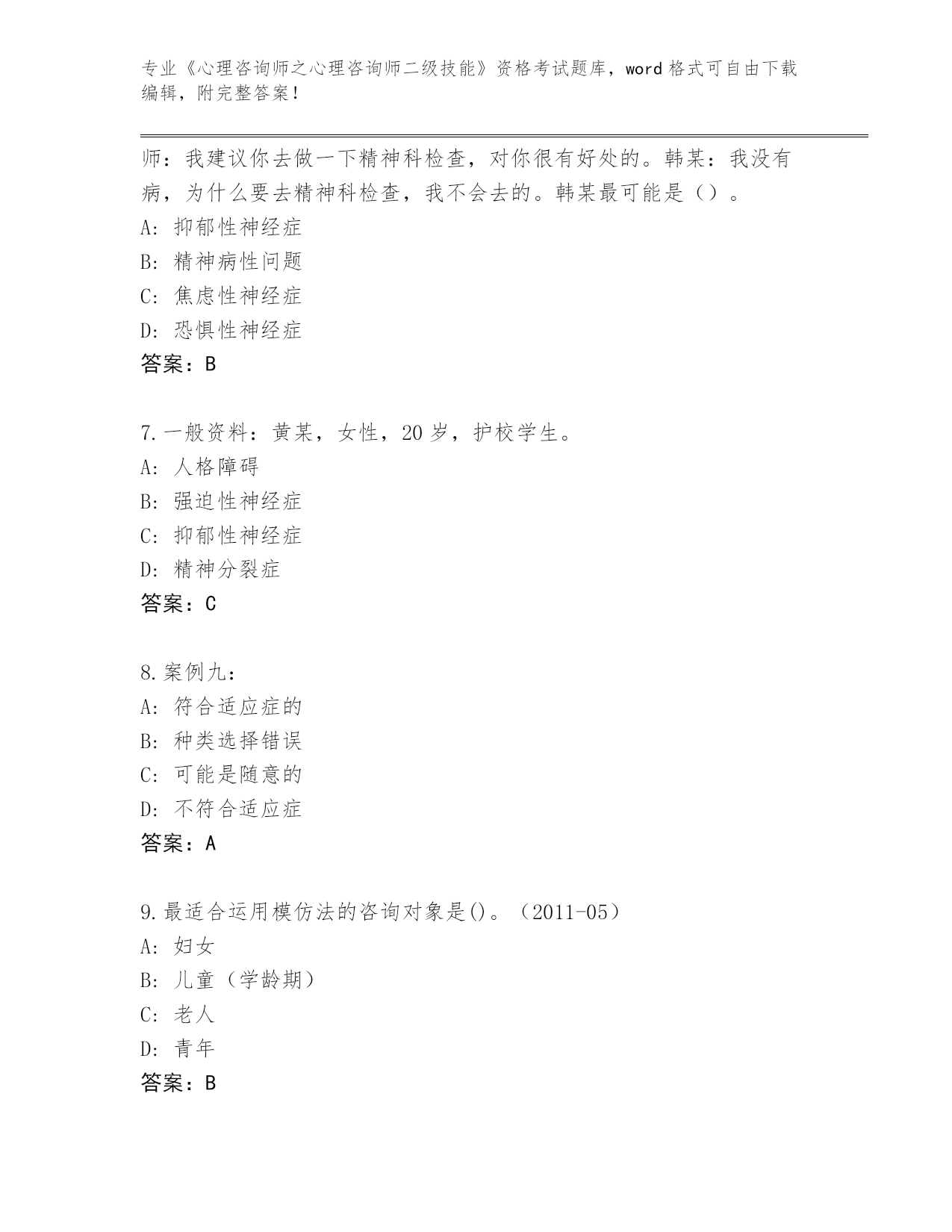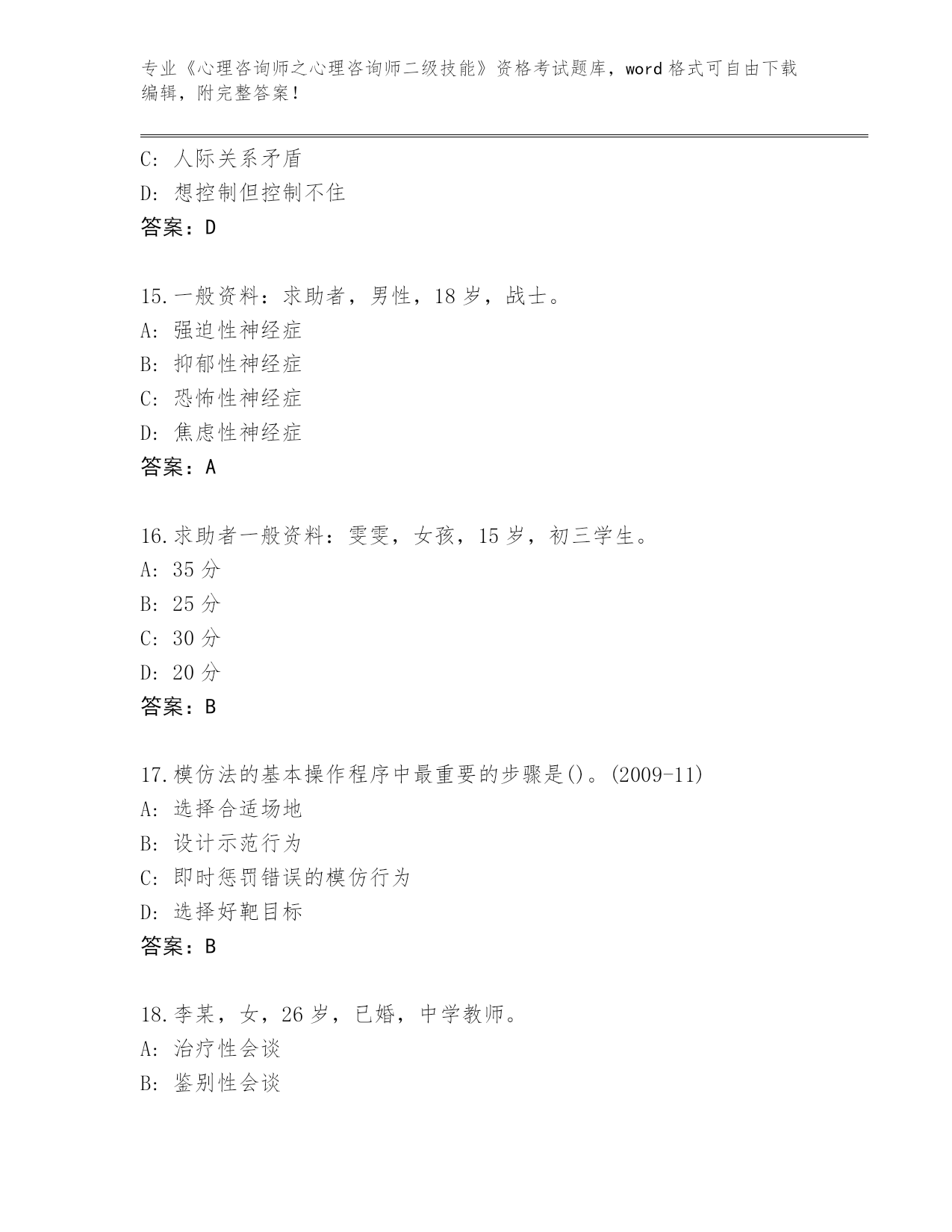 河南省《心理咨询师之心理咨询师二级技能》考试必考200题大全附答案(考试直接用)