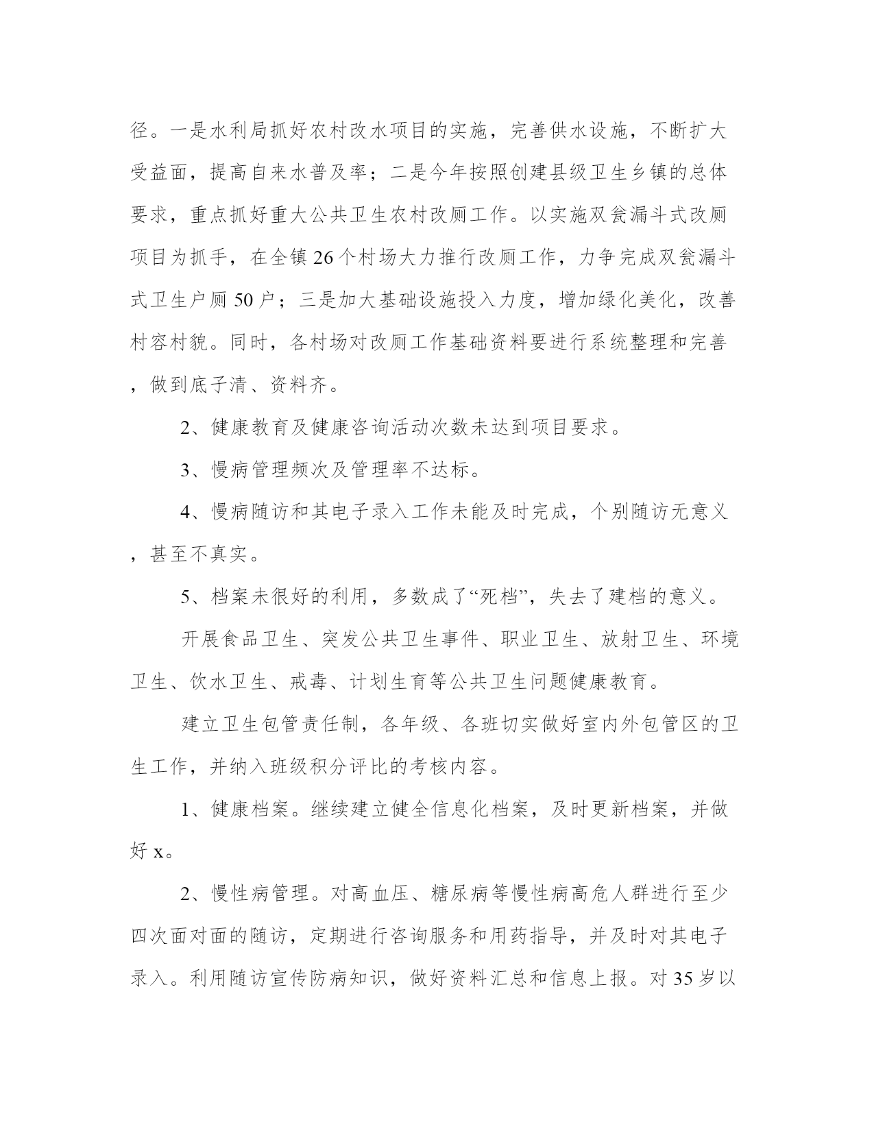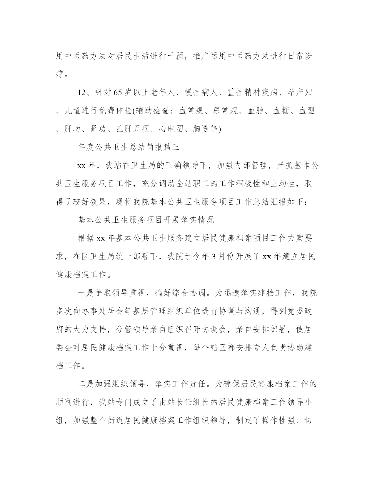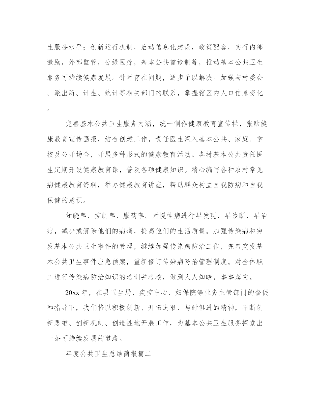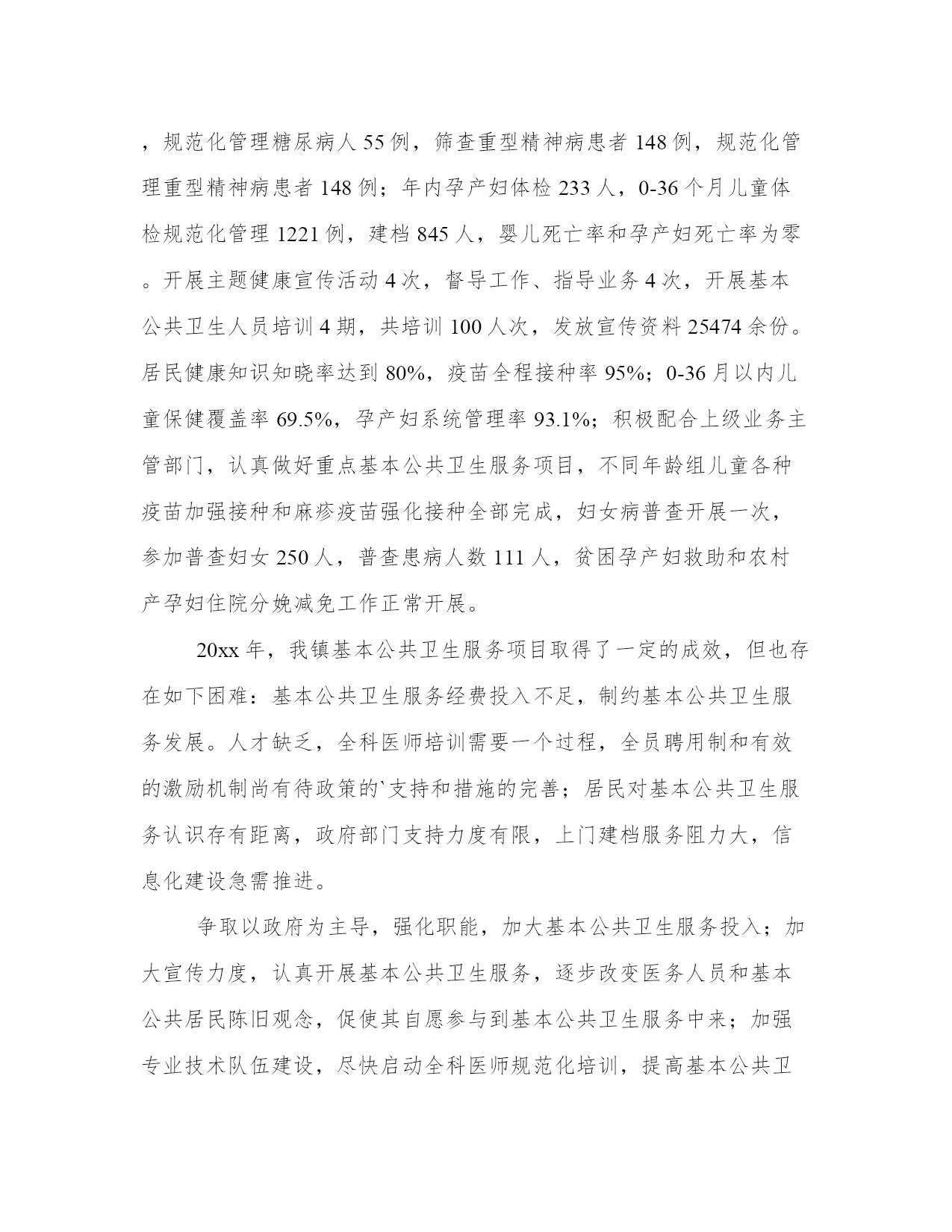 热门年度公共卫生总结简报(通用14篇)总结是一个动态过程,需要不断更新和调整,以适应不同的环境和情况。总结要突出问题的关键,找出解决问题的有效策略和方法。拿优秀的总结范文作为参考,可以提高我们的总结写作水平。年度公共卫生总结简报篇一在县卫生局、县疾控中心及县妇保院、古路镇党委政府的领导下,我院结合实际情况,加强硬件建设、完善制度、加强全科医生队伍建设,认真开展基本基本公共卫生服务项目工作,现就我院在20xx年基本基本公共卫生服务工作开展情况总结如下:全镇有中心卫生院一所,黄阳分院一所,年未共有职工37名;卫生院内设有门诊、住院、疾控、妇幼保健、妇产科、辅助检查等科室;住院部设有病床20张,其中,中心院有15张,黄阳分院有10张。全镇共有11个卫生室,共有18名乡村医生。为辖区居民提供预防、保健、康复、健康教育、基本医疗、计划生育指导等服务。医疗服务范围为古路镇区域及周边乡镇,人口约4万人。自20xx年1月起,我院基本公共卫生服务工作已全面铺开,农村基本基本公共卫生服务项目全面落实,至12月底统计,我院农村基本公共卫生服务项目基本完成,进行健康体检和采集及采集基础资料12115人,建立规范化健康档案12115份,已完成全年任务。筛查高血压患者867例,规范化管理高血压患者842例,筛查高血糖患者58例,规范化管理糖尿病人55例,筛查重型精神病患者148例,规范化管理重型精神病患者148例;年内孕产妇体检233人,0-36个月儿童体检规范化管理1221例,建档845人,婴儿死亡率和孕产妇死亡率为零。开展主题健康宣传活动4次,督导工作、指导业务4次,开展基本公共卫生人员培训4期,共培训100人次,发放宣传资料25474余份。居民健康知识知晓率达到80%,疫苗全程接种率95%;0-36月以内儿童保健覆盖率69.5%,孕产妇系统管理率93.1%;积极配合上级业务主管部门,认真做好重点基本公共卫生服务项目,不同年龄组儿童各种疫苗加强接种和麻疹疫苗强化接种全部完成,妇女病普查开展一次,参加普查妇女250人,普查患病人数111人,贫困孕产妇救助和农村产孕妇住院分娩减免工作正常开展。20xx年,我镇基本公共卫生服务项目取得了一定的成效,但也存在如下困难:基本公共卫生服务经费投入不足,制约基本公共卫生服务发展。人才缺乏,全科医师培训需要一个过程,全员聘用制和有效的激励机制尚有待政策的`支持和措施的完善;居民对基本公共卫生服务认识存有距离,政府部门支持力度有限,上门建档服务阻力大,信息化建设急需推进。争取以政府为主导,强化职能,加大基本公共卫生服务投入;加大宣传力度,认真开展基本公共卫生服务,逐步改变医务人员和基本公共居民陈旧观念,促使其自愿参与到基本公共卫生服务中来;加强专业技术队伍建设,尽快启动全科医师规范化培训,提高基本公共卫生服务水平;创新运行机制,启动信息化建设,政策配套,实行内部激励,外部监管,分级医疗,基本公共首诊制等,推动基本公共卫生服务可持续健康发展。针对存在问题,逐步予以解决。加强与村委会、派出所、计生、统计等相关部门的联系,掌握辖区内人口信息变化。完善基本公共卫生服务内涵,统一制作健康教育宣传栏,张贴健康教育宣传画报,结合创建工作,责任医生深入基本公共、家庭、学校及公开场合,开展多种形式的健康教育活动。各村基本公共责任医生定期开设健康教育课,普及各项健康知识。精心编写各种农村常见病健康教育资料,举办健康教育讲座,帮助群众树立自我防病和自我保健的意识。知晓率、控制率、服药率。对慢性病进行早发现、早诊断、早治疗,减少或解除他们的病痛,提高他们的生活质量。加强传染病和突发基本公共卫生事件的管理,继续加强传染病防治工作,完善突发基本公共卫生事件应急预案,重新修订传染病防治管理制度。对全体职工进行传染病防治知识的培训并考核,做到人人知晓,事事落实。20xx年,在县卫生局、疾控中心、妇保院等业务主管部门的督促和指导下,我们将以积极创新、开拓进取、与时俱进的精神,不断创新思维、创新机制、创造性地开展工作,为基本公共卫生服务探索出一条可持续发展的道路。年度公共卫生总结简报篇二20xx年是推进公共卫生工作进一步发展的关键之年,我院基本公共卫生服务工作思路是:深入以深化医改为主线,以提高全乡人民健康水平为目标,突出抓好基本公共卫生服务工作,努力完成上级交给的工作任务,使各项工作再上一个新的台阶,落实好党的民生工程。为了我乡公共卫生服务工作做得更好,使我乡居民真正享有均等化的基本公共卫生服务,根据相关政策以及卫生局的相关要求和指导,对公共卫生服务工作作出以下安排:公共卫生服务项目是国家切实提高城乡居民健康水平的重要方法和惠民政策,通过实施基本公共卫生服务项目和重大公共卫生服务项目,对居民健康问题实施干预,减少主要健康危险