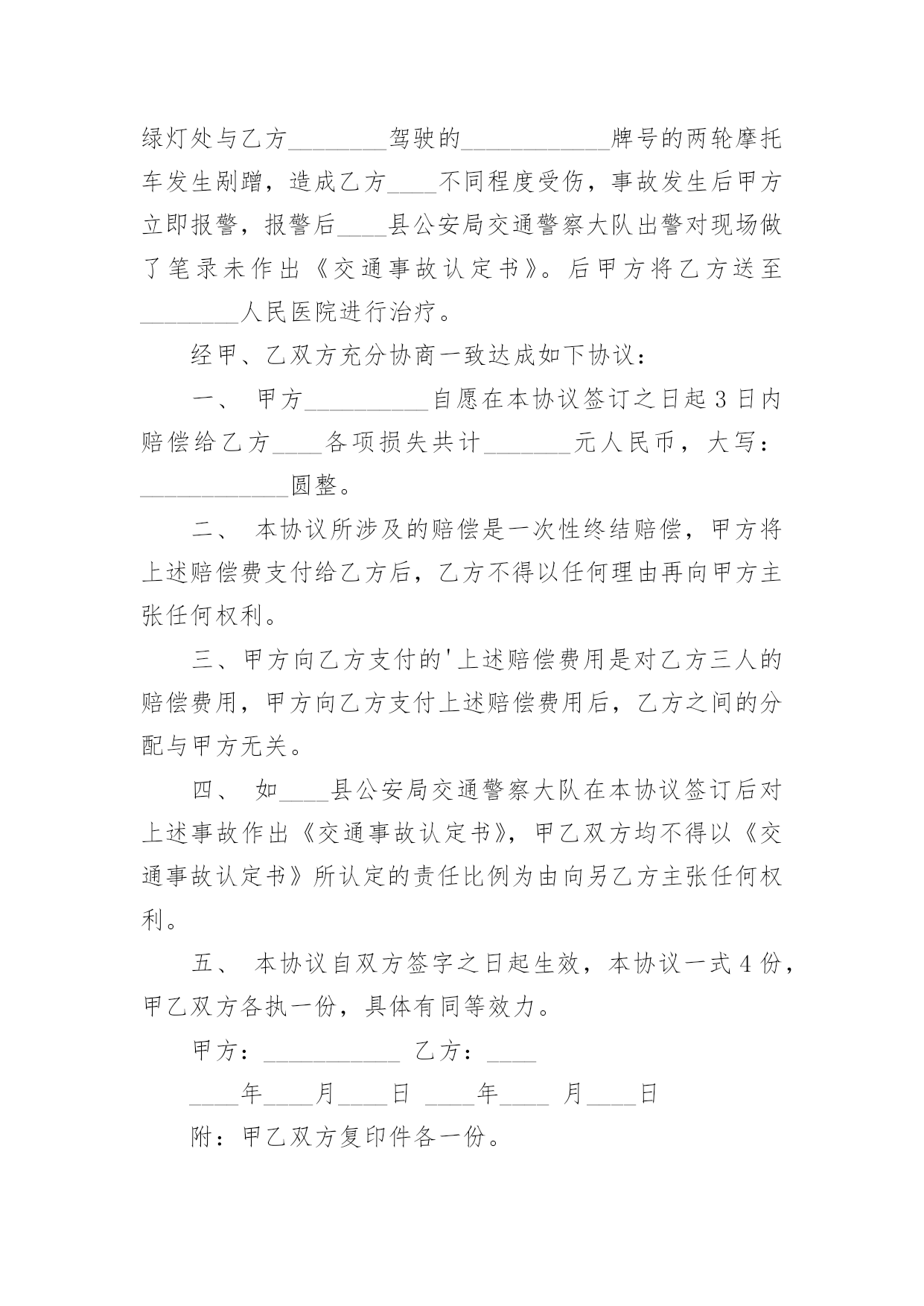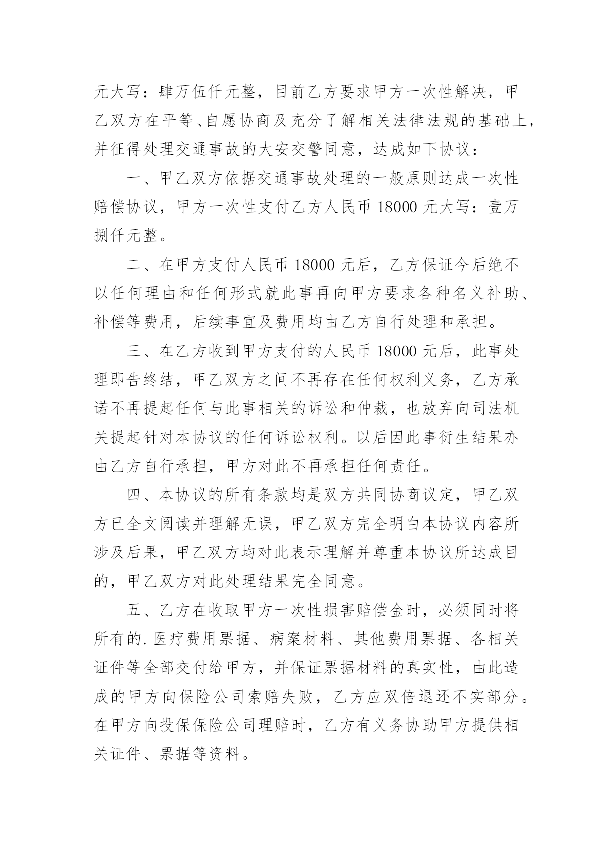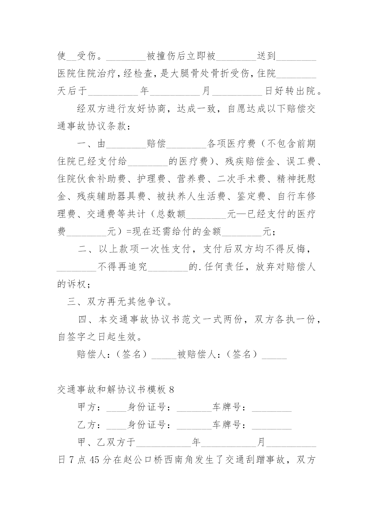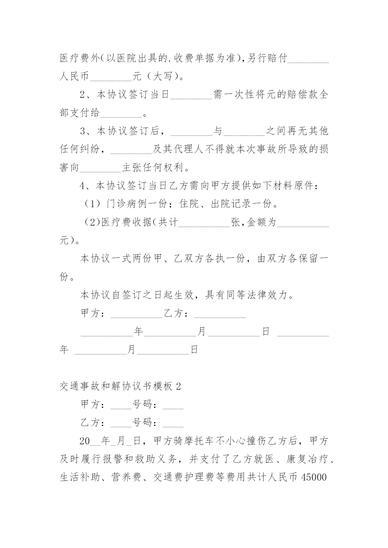 交通事故和解协议书交通事故和解协议书模板现如今,越来越多人会去使用协议,签订协议可以约束双方履行责任。那么协议的格式,你掌握了吗以下是小编精心整理的交通事故和解协议书模板,仅供参考,希望能够帮助到大家。交通事故和解协议书模板1甲方:________,身份证号:________住址:________乙方:________,身份证号:________住址:________事故经过:_____年_____月_____日_____时,________驾驶摩托车(牌号为),沿________路由________地向________地行驶,至________处时,由于下雨造成道路湿滑,________为避开行人________,但刹车不及,因此将________刮倒。________立即将________送至________医院进行检查、救治,经__________医院详细检查,确诊________并无大碍,只是(以医院的检查报告为准对伤情进行一个描述)。经过医院对________进行了一系列必要的处理后,________决定出院。现________、________双方经过充分协商,自愿达成如下和解协议:1、________除支付________年__________月__________日至__________年__________月__________日的医疗费外(以医院出具的.收费单据为准),另行赔付________人民币________元(大写)。2、本协议签订当日________需一次性将元的赔偿款全部支付给________。3、本协议签订后,________与________之间再无其他任何纠纷,________及其代理人不得就本次事故所导致的损害向________主张任何权利。4、本协议签订当日乙方需向甲方提供如下材料原件:(1)门诊病例一份;住院、出院记录一份。(2)医疗费收据(共计__________张,金额为__________元)。本协议一式两份甲、乙双方各执一份,由双方各保留一份。本协议自签订之日起生效,具有同等法律效力。甲方:__________乙方:____________________年__________月__________日__________年__________月__________日交通事故和解协议书模板2甲方:____号码:____乙方:____号码:____20__年_月_日,甲方骑摩托车不小心撞伤乙方后,甲方及时履行报警和救助义务,并支付了乙方就医、康复冶疗、生活补助、营养费、交通费护理费等费用共计人民币45000元大写:肆万伍仟元整,目前乙方要求甲方一次性解决,甲乙双方在平等、自愿协商及充分了解相关法律法规的基础上,并征得处理交通事故的大安交警同意,达成如下协议:一、甲乙双方依据交通事故处理的一般原则达成一次性赔偿协议,甲方一次性支付乙方人民币18000元大写:壹万捌仟元整。二、在甲方支付人民币18000元后,乙方保证今后绝不以任何理由和任何形式就此事再向甲方要求各种名义补助、补偿等费用,后续事宜及费用均由乙方自行处理和承担。三、在乙方收到甲方支付的人民币18000元后,此事处理即告终结,甲乙双方之间不再存在任何权利义务,乙方承诺不再提起任何与此事相关的诉讼和仲裁,也放弃向司法机关提起针对本协议的任何诉讼权利。以后因此事衍生结果亦由乙方自行承担,甲方对此不再承担任何责任。四、本协议的所有条款均是双方共同协商议定,甲乙双方已全文阅读并理解无误,甲乙双方完全明白本协议内容所涉及后果,甲乙双方均对此表示理解并尊重本协议所达成目的,甲乙双方对此处理结果完全同意。五、乙方在收取甲方一次性损害赔偿金时,必须同时将所有的.医疗费用票据、病案材料、其他费用票据、各相关证件等全部交付给甲方,并保证票据材料的真实性,由此造成的甲方向保险公司索赔失败,乙方应双倍退还不实部分。在甲方向投保保险公司理赔时,乙方有义务协助甲方提供相关证件、票据等资料。六、本协议为一次性终结处理协议,本协议为双方平等、自愿协商的结果,并且是双方真实意思表示,本协议自双方签字按手印后立即成立生效。七、本协议一式三份,甲乙双方各执一份,交管部门存档一份,具有同等的法律效力。甲方:__________乙方:__________交管部门:____________________年__________月__________日__________年__________月__________日交通事故和解协议书模板3甲方:___________代理人:___________乙方:___________事故经过:__年11月5日6时,李少飞驾驶悬挂“________”号牌的`蓝鸟轿车经南梧高速公路进入________行驶,在________处
