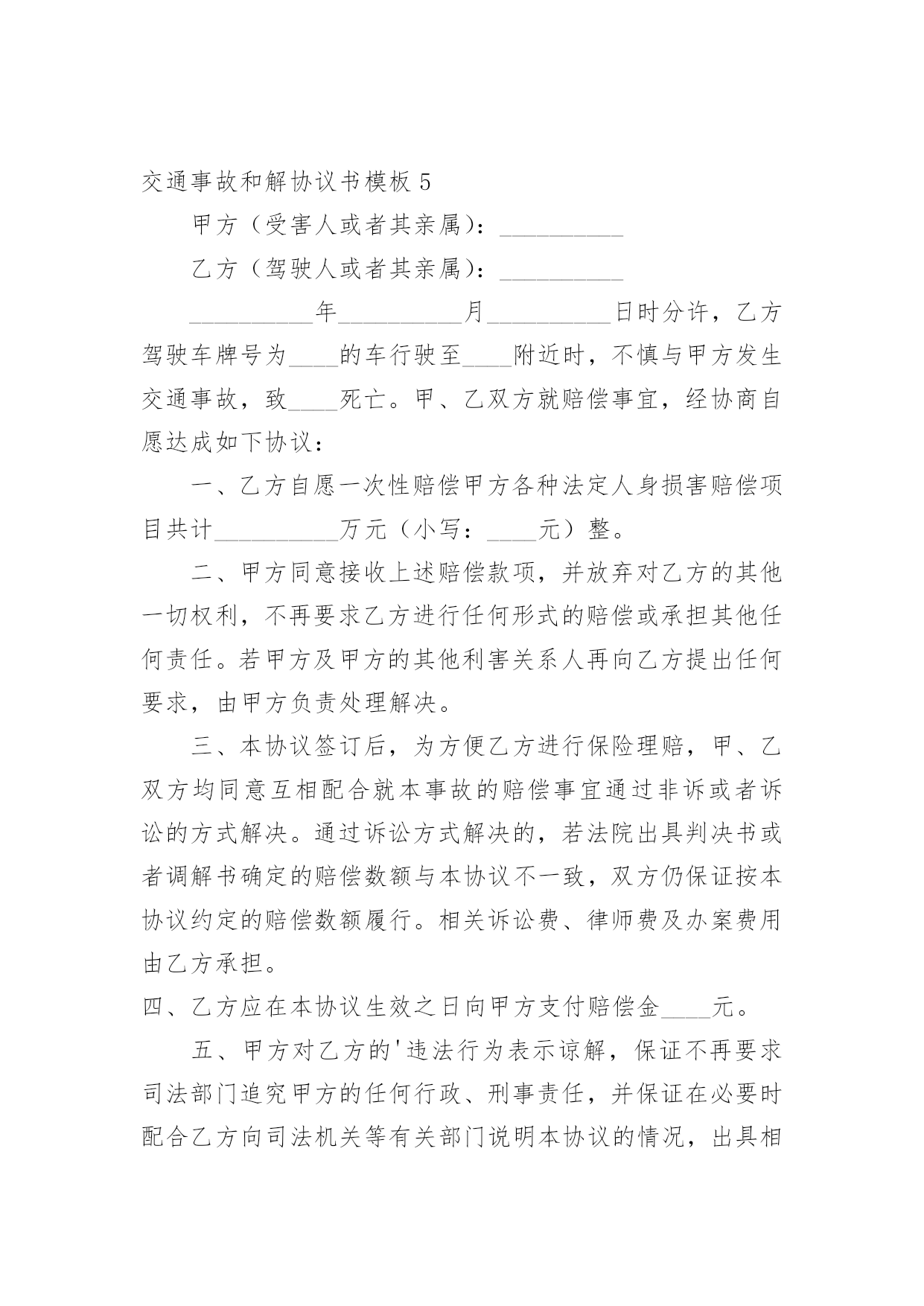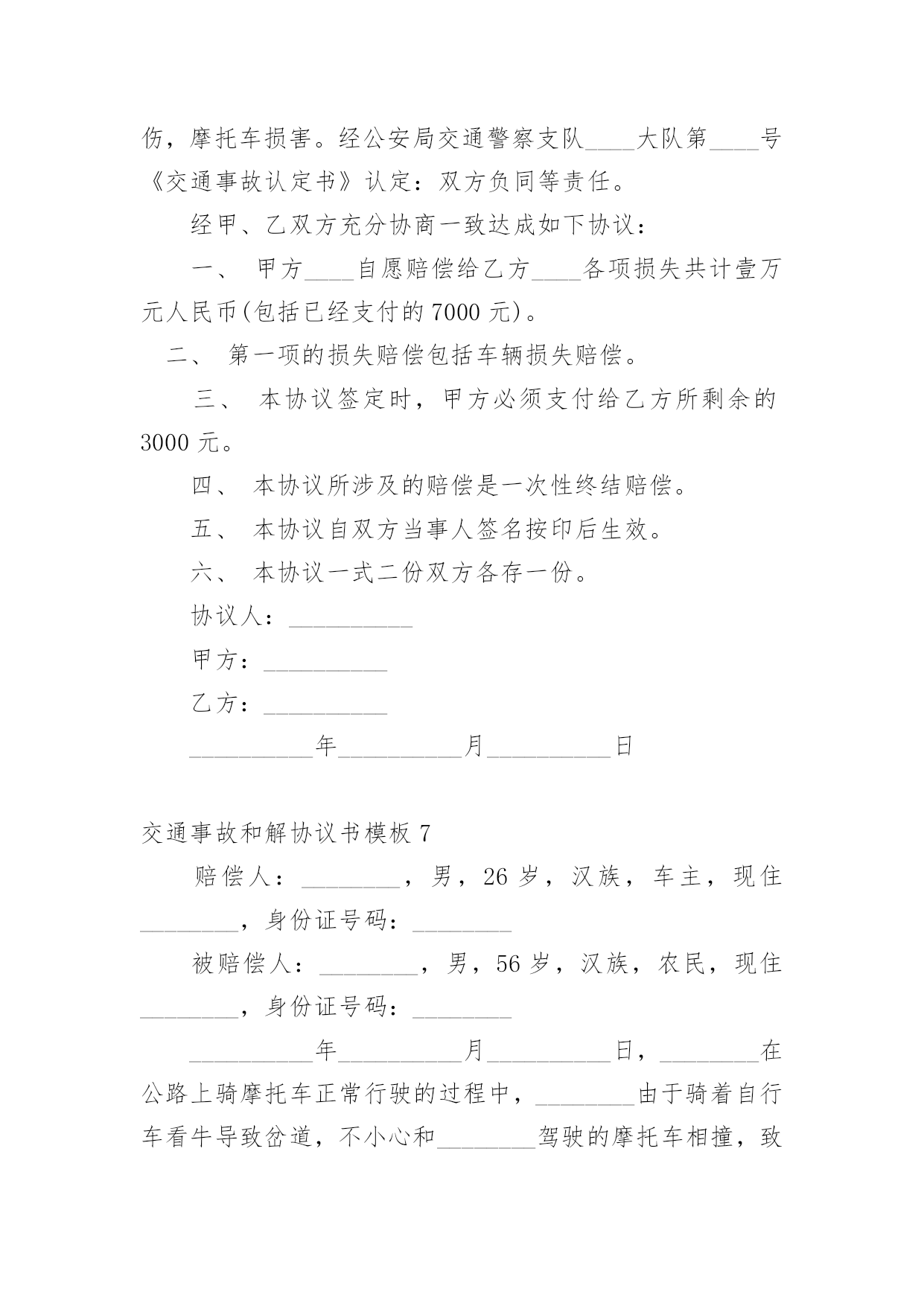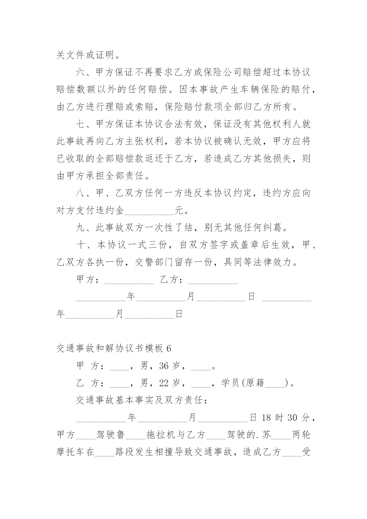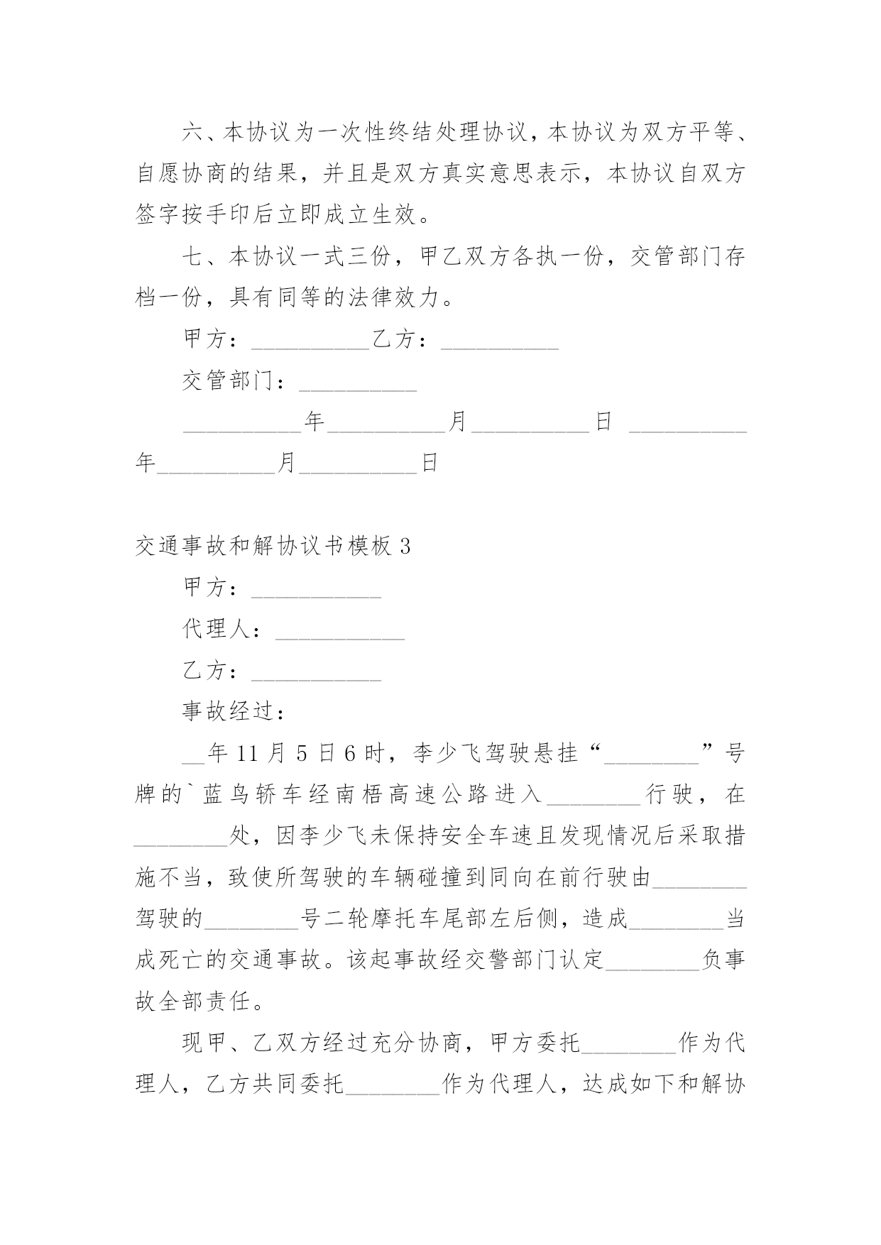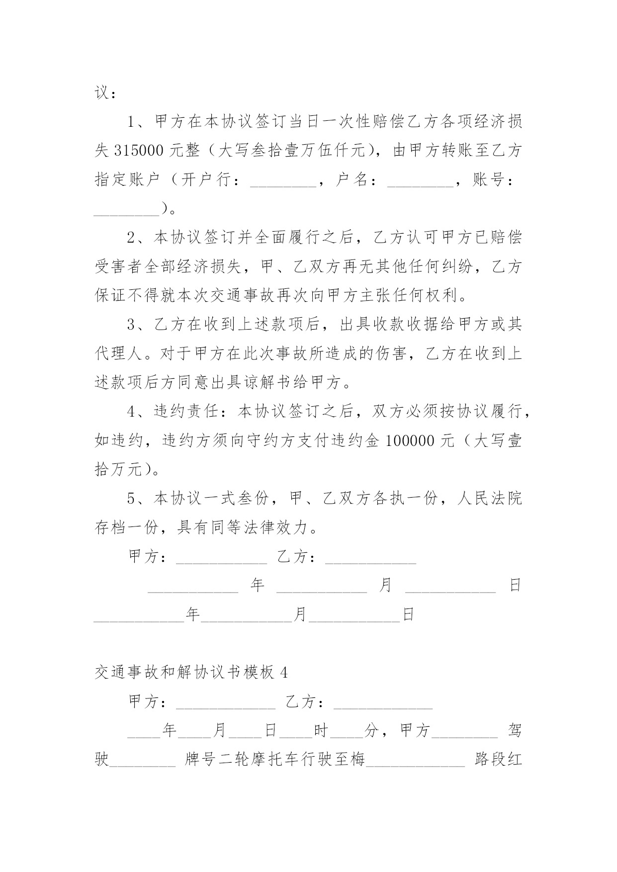 交通事故和解协议书交通事故和解协议书模板现如今,越来越多人会去使用协议,签订协议可以约束双方履行责任。那么协议的格式,你掌握了吗以下是小编精心整理的交通事故和解协议书模板,仅供参考,希望能够帮助到大家。交通事故和解协议书模板1甲方:________,身份证号:________住址:________乙方:________,身份证号:________住址:________事故经过:_____年_____月_____日_____时,________驾驶摩托车(牌号为),沿________路由________地向________地行驶,至________处时,由于下雨造成道路湿滑,________为避开行人________,但刹车不及,因此将________刮倒。________立即将________送至________医院进行检查、救治,经__________医院详细检查,确诊________并无大碍,只是(以医院的检查报告为准对伤情进行一个描述)。经过医院对________进行了一系列必要的处理后,________决定出院。现________、________双方经过充分协商,自愿达成如下和解协议:1、________除支付________年__________月__________日至__________年__________月__________日的医疗费外(以医院出具的.收费单据为准),另行赔付________人民币________元(大写)。2、本协议签订当日________需一次性将元的赔偿款全部支付给________。3、本协议签订后,________与________之间再无其他任何纠纷,________及其代理人不得就本次事故所导致的损害向________主张任何权利。4、本协议签订当日乙方需向甲方提供如下材料原件:(1)门诊病例一份;住院、出院记录一份。(2)医疗费收据(共计__________张,金额为__________元)。本协议一式两份甲、乙双方各执一份,由双方各保留一份。本协议自签订之日起生效,具有同等法律效力。甲方:__________乙方:____________________年__________月__________日__________年__________月__________日交通事故和解协议书模板2甲方:____号码:____乙方:____号码:____20__年_月_日,甲方骑摩托车不小心撞伤乙方后,甲方及时履行报警和救助义务,并支付了乙方就医、康复冶疗、生活补助、营养费、交通费护理费等费用共计人民币45000元大写:肆万伍仟元整,目前乙方要求甲方一次性解决,甲乙双方在平等、自愿协商及充分了解相关法律法规的基础上,并征得处理交通事故的大安交警同意,达成如下协议:一、甲乙双方依据交通事故处理的一般原则达成一次性赔偿协议,甲方一次性支付乙方人民币18000元大写:壹万捌仟元整。二、在甲方支付人民币18000元后,乙方保证今后绝不以任何理由和任何形式就此事再向甲方要求各种名义补助、补偿等费用,后续事宜及费用均由乙方自行处理和承担。三、在乙方收到甲方支付的人民币18000元后,此事处理即告终结,甲乙双方之间不再存在任何权利义务,乙方承诺不再提起任何与此事相关的诉讼和仲裁,也放弃向司法机关提起针对本协议的任何诉讼权利。以后因此事衍生结果亦由乙方自行承担,甲方对此不再承担任何责任。四、本协议的所有条款均是双方共同协商议定,甲乙双方已全文阅读并理解无误,甲乙双方完全明白本协议内容所涉及后果,甲乙双方均对此表示理解并尊重本协议所达成目的,甲乙双方对此处理结果完全同意。五、乙方在收取甲方一次性损害赔偿金时,必须同时将所有的.医疗费用票据、病案材料、其他费用票据、各相关证件等全部交付给甲方,并保证票据材料的真实性,由此造成的甲方向保险公司索赔失败,乙方应双倍退还不实部分。在甲方向投保保险公司理赔时,乙方有义务协助甲方提供相关证件、票据等资料。六、本协议为一次性终结处理协议,本协议为双方平等、自愿协商的结果,并且是双方真实意思表示,本协议自双方签字按手印后立即成立生效。七、本协议一式三份,甲乙双方各执一份,交管部门存档一份,具有同等的法律效力。甲方:__________乙方:__________交管部门:____________________年__________月__________日__________年__________月__________日交通事故和解协议书模板3甲方:___________代理人:___________乙方:___________事故经过:__年11月5日6时,李少飞驾驶悬挂“________”号牌的`蓝鸟轿车经南梧高速公路进入________行驶,在________处