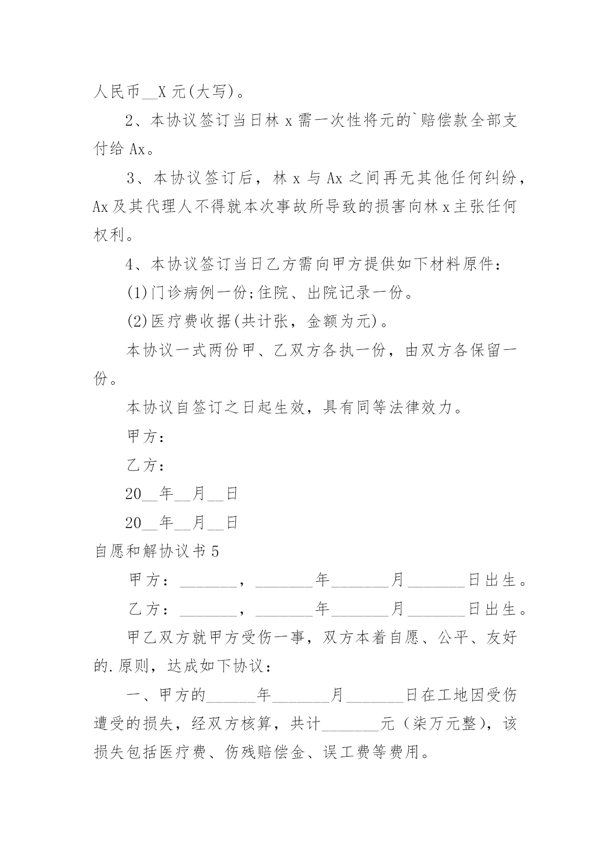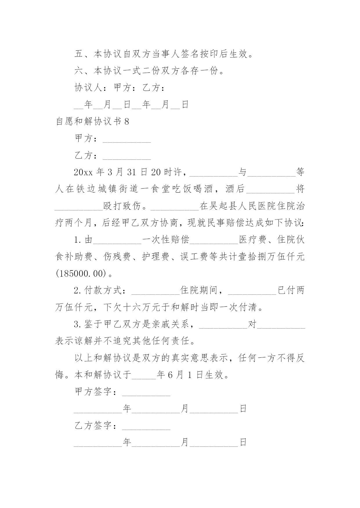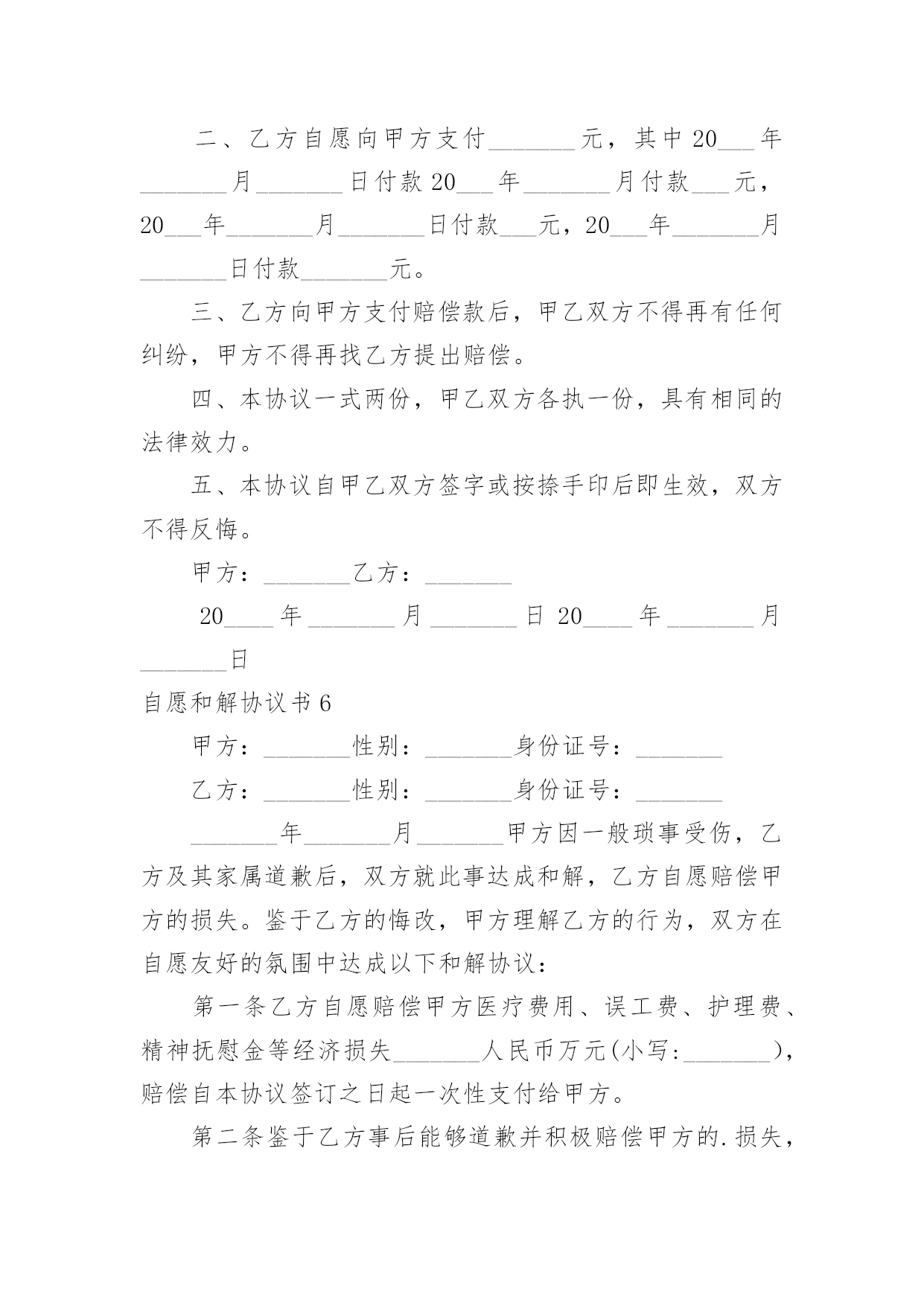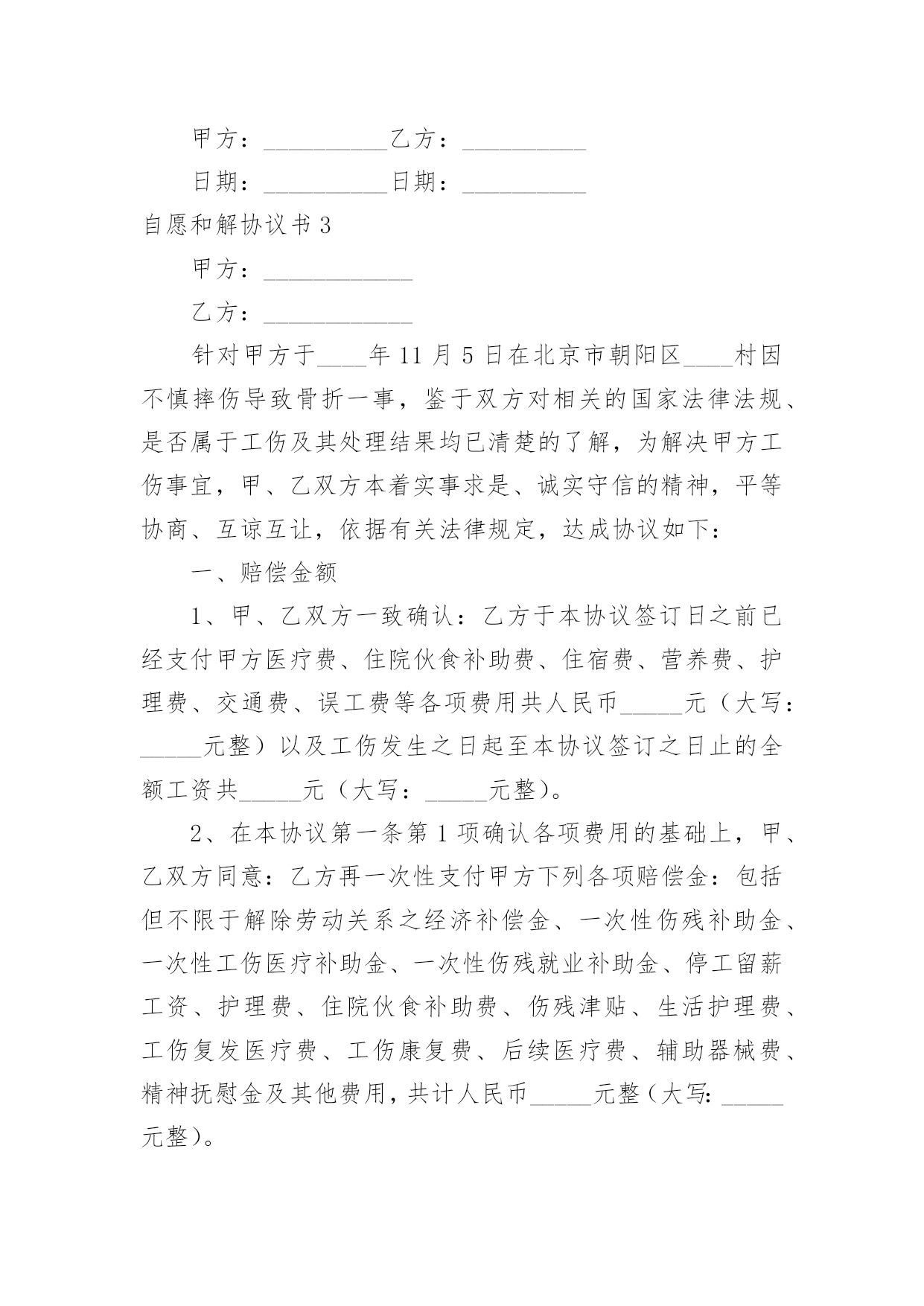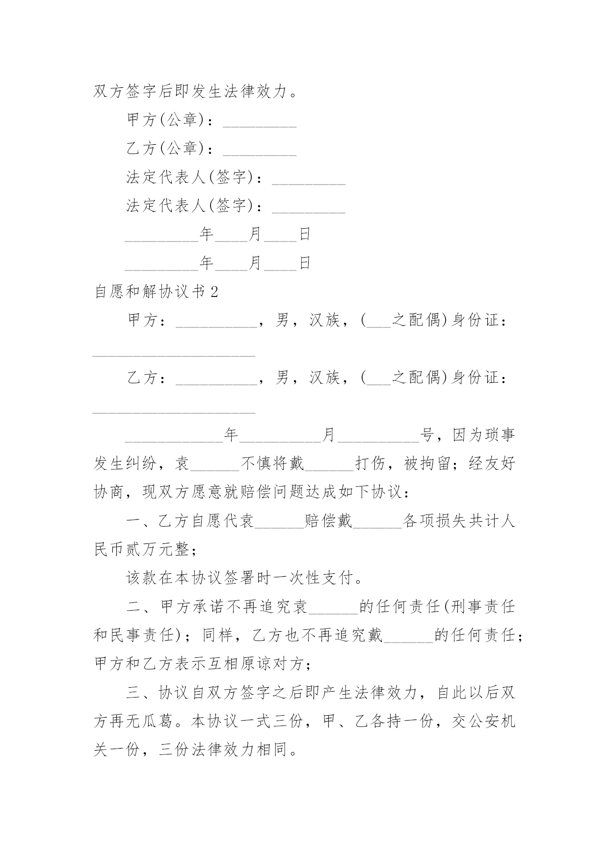自愿和解协议书自愿和解协议书在学习、工作生活中,越来越多人会去使用协议,签订协议能够保证双方合作愉快。写协议需要注意哪些问题呢?以下是小编帮大家整理的自愿和解协议书,供大家参考借鉴,希望可以帮助到有需要的朋友。自愿和解协议书1甲方:乙方:乙方陈______于______年7月17日在甲方的泰州怡和花园工地不慎受伤,现已治愈。就其医疗费,补助费等经甲乙双方协商一致,达成如下协议:一、甲方一次性支付给乙方一次性补偿金人民币35000元大写叁万伍仟元,自本协议签字生效后5日内付清。二、甲乙双方签定此协议后,甲乙双方终结有关补偿问题的一切权利义务关系,乙方不得另行向甲方主张任何权利,甲方也不再承担任何义务,双方再无任何纠纷。三、本协议为一次性终结处理协议,双方当事人应以此为断,全面切实履行合同,不得再以任何理由纠缠。乙方今后身体出现任何问题均与甲方无关。四、本协议一式两份,甲乙双方各执一份,协议自甲乙双方签字后即发生法律效力。甲方(公章):_________乙方(公章):_________法定代表人(签字):_________法定代表人(签字):__________________年____月____日_________年____月____日自愿和解协议书2甲方:__________,男,汉族,(___之配偶)身份证:____________________乙方:__________,男,汉族,(___之配偶)身份证:________________________________年__________月__________号,因为琐事发生纠纷,袁______不慎将戴______打伤,被拘留;经友好协商,现双方愿意就赔偿问题达成如下协议:一、乙方自愿代袁______赔偿戴______各项损失共计人民币贰万元整;该款在本协议签署时一次性支付。二、甲方承诺不再追究袁______的任何责任(刑事责任和民事责任);同样,乙方也不再追究戴______的任何责任;甲方和乙方表示互相原谅对方;三、协议自双方签字之后即产生法律效力,自此以后双方再无瓜葛。本协议一式三份,甲、乙各持一份,交公安机关一份,三份法律效力相同。甲方:__________乙方:__________日期:__________日期:__________自愿和解协议书3甲方:____________乙方:____________针对甲方于____年11月5日在北京市朝阳区____村因不慎摔伤导致骨折一事,鉴于双方对相关的国家法律法规、是否属于工伤及其处理结果均已清楚的了解,为解决甲方工伤事宜,甲、乙双方本着实事求是、诚实守信的精神,平等协商、互谅互让,依据有关法律规定,达成协议如下:一、赔偿金额1、甲、乙双方一致确认:乙方于本协议签订日之前已经支付甲方医疗费、住院伙食补助费、住宿费、营养费、护理费、交通费、误工费等各项费用共人民币_____元(大写:_____元整)以及工伤发生之日起至本协议签订之日止的全额工资共_____元(大写:_____元整)。2、在本协议第一条第1项确认各项费用的基础上,甲、乙双方同意:乙方再一次性支付甲方下列各项赔偿金:包括但不限于解除劳动关系之经济补偿金、一次性伤残补助金、一次性工伤医疗补助金、一次性伤残就业补助金、停工留薪工资、护理费、住院伙食补助费、伤残津贴、生活护理费、工伤复发医疗费、工伤康复费、后续医疗费、辅助器械费、精神抚慰金及其他费用,共计人民币_____元整(大写:_____元整)。二、付款期限:在本协议签订之日起,乙方通过现金方式支付上述款项。三、甲、乙双方一致同意:自本协议签订之日起,双方劳动关系解除。四、自本协议签订之日起,甲方自愿放弃赔偿差额的.权利。五、甲方自愿放弃基于双方劳动关系发生、解除所产生的各项权利。六、因为自甲方到乙方公司工作至工伤发生之日未满一个月,乙方尚未完成甲方社会保险的办理。所以,甲方自愿放弃如下权利:1、要求乙方为其办理社会保险的权利;2、依照社会保险而享有各项权益的权利。七、本协议签订后,甲、乙双方终结有关工伤事故赔偿问题的一切权利义务关系,甲方不得另行向乙方主张任何权利,乙方也不再承担任何义务,双方再无任何纠纷,并且一方放弃追究另一方的一切法律责任。同时,自签订本协议之日起,甲方自愿放弃就双方解除劳动关系及工伤赔偿事宜所享有的一切仲裁、诉讼等权利。八、违约责任1、乙方迟延付款的,甲方有权要求乙方一次性支付余款,并有权要求乙方按照人民银行同期贷款利率支付利息。2、因任何一方违约而导致仲裁、诉讼或者申请强制执行的,应当向对方支付实现债权的费用,包括但不限于调查取证费、交通费、通讯费、误工费、公证费、律师费,及其他经济损失。九、以上条款,甲、乙双方自愿遵守、履行。十、本协议自甲、乙双方签字、盖章之日起生效,本协