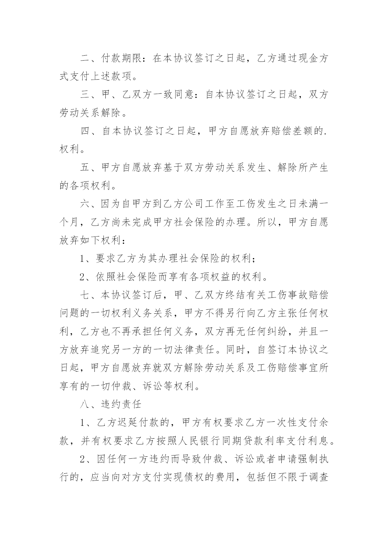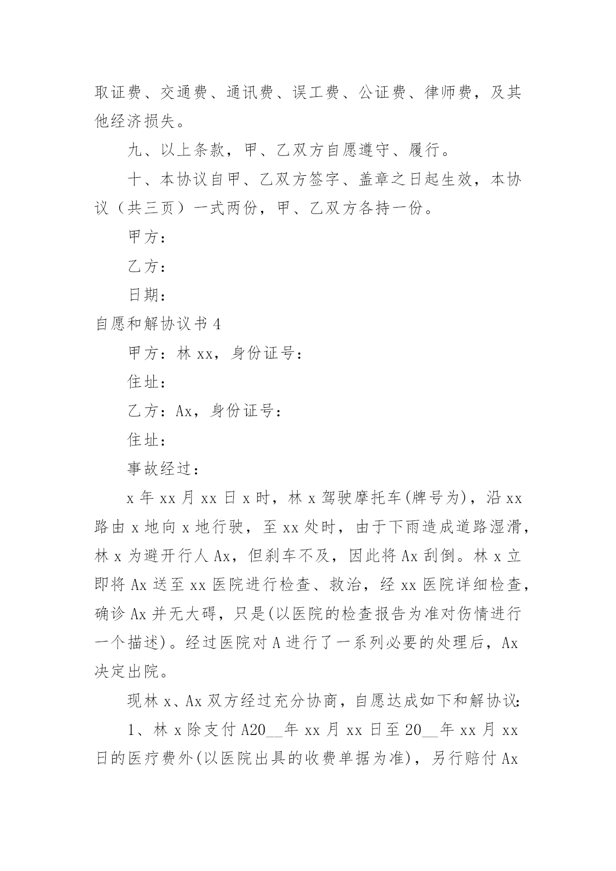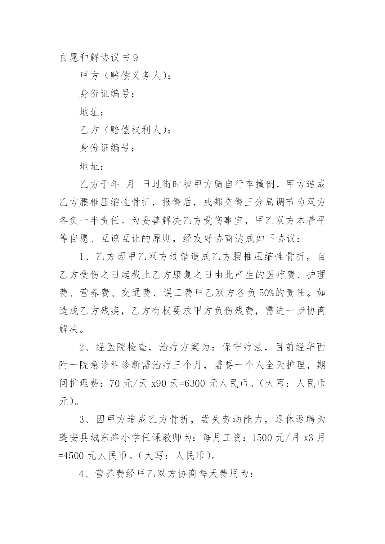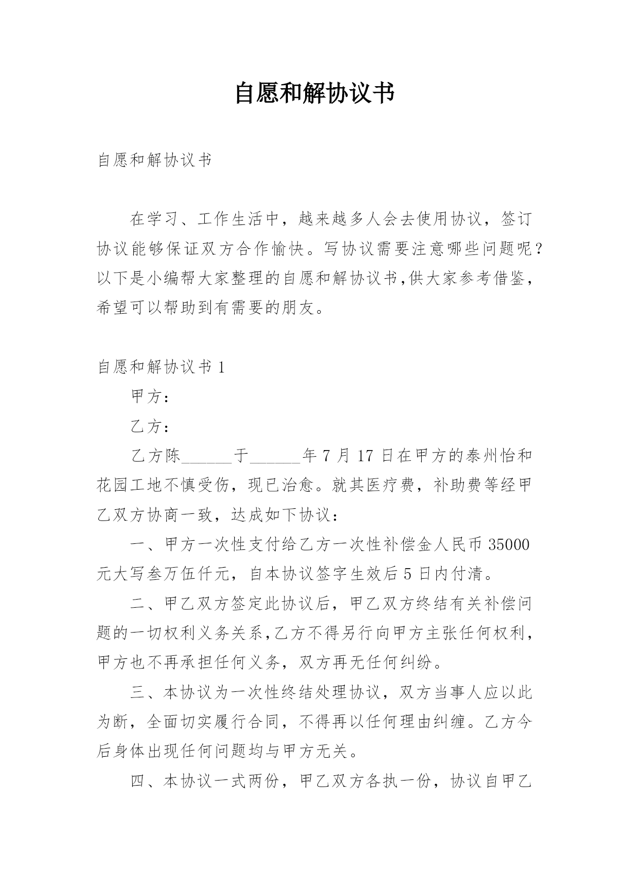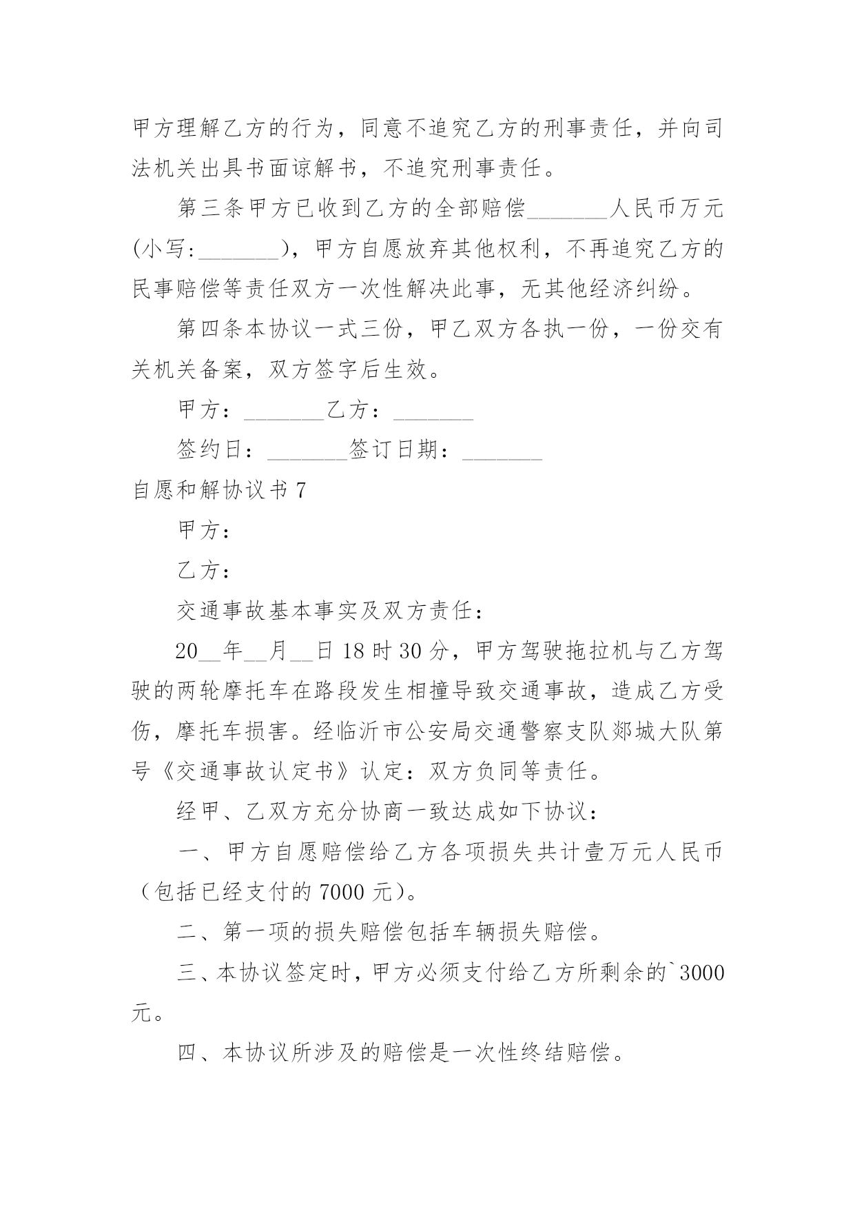 自愿和解协议书自愿和解协议书在学习、工作生活中,越来越多人会去使用协议,签订协议能够保证双方合作愉快。写协议需要注意哪些问题呢?以下是小编帮大家整理的自愿和解协议书,供大家参考借鉴,希望可以帮助到有需要的朋友。自愿和解协议书1甲方:乙方:乙方陈______于______年7月17日在甲方的泰州怡和花园工地不慎受伤,现已治愈。就其医疗费,补助费等经甲乙双方协商一致,达成如下协议:一、甲方一次性支付给乙方一次性补偿金人民币35000元大写叁万伍仟元,自本协议签字生效后5日内付清。二、甲乙双方签定此协议后,甲乙双方终结有关补偿问题的一切权利义务关系,乙方不得另行向甲方主张任何权利,甲方也不再承担任何义务,双方再无任何纠纷。三、本协议为一次性终结处理协议,双方当事人应以此为断,全面切实履行合同,不得再以任何理由纠缠。乙方今后身体出现任何问题均与甲方无关。四、本协议一式两份,甲乙双方各执一份,协议自甲乙双方签字后即发生法律效力。甲方(公章):_________乙方(公章):_________法定代表人(签字):_________法定代表人(签字):__________________年____月____日_________年____月____日自愿和解协议书2甲方:__________,男,汉族,(___之配偶)身份证:____________________乙方:__________,男,汉族,(___之配偶)身份证:________________________________年__________月__________号,因为琐事发生纠纷,袁______不慎将戴______打伤,被拘留;经友好协商,现双方愿意就赔偿问题达成如下协议:一、乙方自愿代袁______赔偿戴______各项损失共计人民币贰万元整;该款在本协议签署时一次性支付。二、甲方承诺不再追究袁______的任何责任(刑事责任和民事责任);同样,乙方也不再追究戴______的任何责任;甲方和乙方表示互相原谅对方;三、协议自双方签字之后即产生法律效力,自此以后双方再无瓜葛。本协议一式三份,甲、乙各持一份,交公安机关一份,三份法律效力相同。甲方:__________乙方:__________日期:__________日期:__________自愿和解协议书3甲方:____________乙方:____________针对甲方于____年11月5日在北京市朝阳区____村因不慎摔伤导致骨折一事,鉴于双方对相关的国家法律法规、是否属于工伤及其处理结果均已清楚的了解,为解决甲方工伤事宜,甲、乙双方本着实事求是、诚实守信的精神,平等协商、互谅互让,依据有关法律规定,达成协议如下:一、赔偿金额1、甲、乙双方一致确认:乙方于本协议签订日之前已经支付甲方医疗费、住院伙食补助费、住宿费、营养费、护理费、交通费、误工费等各项费用共人民币_____元(大写:_____元整)以及工伤发生之日起至本协议签订之日止的全额工资共_____元(大写:_____元整)。2、在本协议第一条第1项确认各项费用的基础上,甲、乙双方同意:乙方再一次性支付甲方下列各项赔偿金:包括但不限于解除劳动关系之经济补偿金、一次性伤残补助金、一次性工伤医疗补助金、一次性伤残就业补助金、停工留薪工资、护理费、住院伙食补助费、伤残津贴、生活护理费、工伤复发医疗费、工伤康复费、后续医疗费、辅助器械费、精神抚慰金及其他费用,共计人民币_____元整(大写:_____元整)。二、付款期限:在本协议签订之日起,乙方通过现金方式支付上述款项。三、甲、乙双方一致同意:自本协议签订之日起,双方劳动关系解除。四、自本协议签订之日起,甲方自愿放弃赔偿差额的.权利。五、甲方自愿放弃基于双方劳动关系发生、解除所产生的各项权利。六、因为自甲方到乙方公司工作至工伤发生之日未满一个月,乙方尚未完成甲方社会保险的办理。所以,甲方自愿放弃如下权利:1、要求乙方为其办理社会保险的权利;2、依照社会保险而享有各项权益的权利。七、本协议签订后,甲、乙双方终结有关工伤事故赔偿问题的一切权利义务关系,甲方不得另行向乙方主张任何权利,乙方也不再承担任何义务,双方再无任何纠纷,并且一方放弃追究另一方的一切法律责任。同时,自签订本协议之日起,甲方自愿放弃就双方解除劳动关系及工伤赔偿事宜所享有的一切仲裁、诉讼等权利。八、违约责任1、乙方迟延付款的,甲方有权要求乙方一次性支付余款,并有权要求乙方按照人民银行同期贷款利率支付利息。2、因任何一方违约而导致仲裁、诉讼或者申请强制执行的,应当向对方支付实现债权的费用,包括但不限于调查取证费、交通费、通讯费、误工费、公证费、律师费,及其他经济损失。九、以上条款,甲、乙双方自愿遵守、履行。十、本协议自甲、乙双方签字、盖章之日起生效,本协