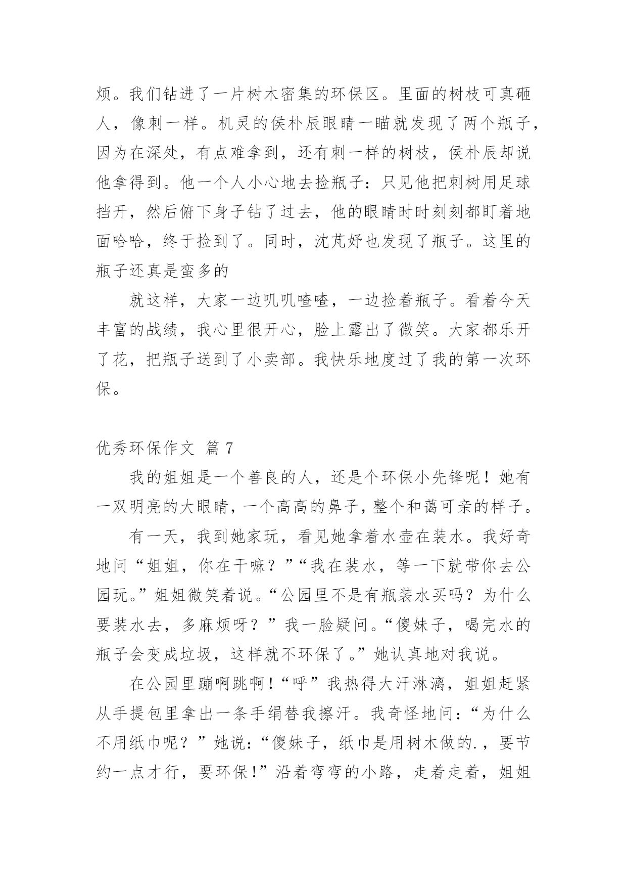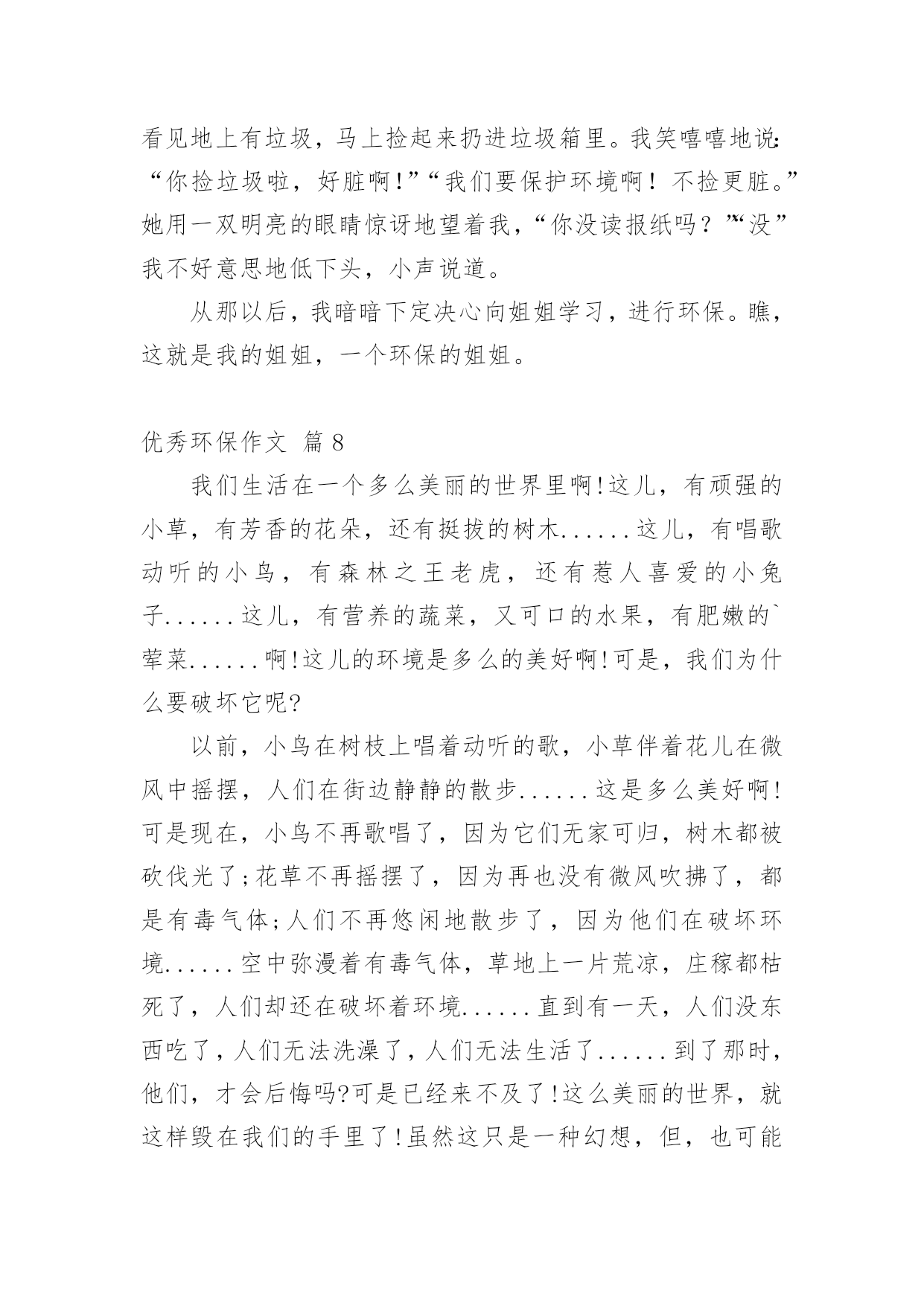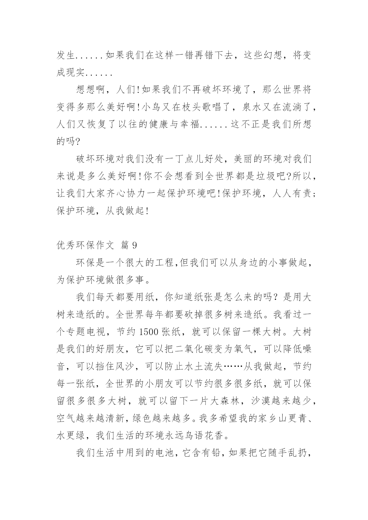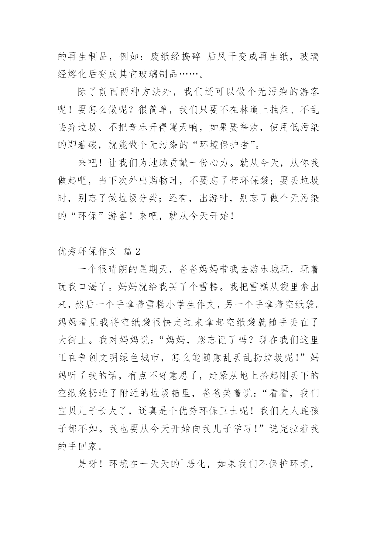 优秀环保作文【精品】优秀环保作文在日常的学习、工作、生活中,大家对作文都再熟悉不过了吧,作文是人们以书面形式表情达意的言语活动。怎么写作文才能避免踩雷呢?以下是小编为大家收集的优秀环保作文9篇,欢迎阅读与收藏。优秀环保作文篇1你是否看过大卖场内的顾客提着自备的环保袋,不再使用店内提供的塑胶袋?你知道我们地球的臭氧层破了一个洞吗?所以,你知道少用塑胶袋这么一个小小的举动,对地球有什么好处吧?任何时刻购物,请尽量不要买塑胶袋,要使用自己的环保袋喔!为什么呢?因为使用自备环保袋或用过的袋子,不但可以减少塑胶袋的用量,使环境不被这种千年不腐的物品污染,而且,别忘了,这种物质不管制造过程或用后焚烧时产生的`有毒物质,不但会污染我们的家园,还会危害人体健康呢!因此,我们应该大力提倡使用自备环保袋。除此之外,日常生活中请做好资源回收和垃圾的分类。为何要做如此麻烦的事呢?实际上,如果不做好回收的话,我们的物资、地球的矿物、能源,都会以惊人的速度逐渐减少,垃圾却会如山般堆高。但是,只要我们细心一点,把垃圾依种类放置,便可以使原来废弃的物品,变成有用又环保的再生制品,例如:废纸经捣碎后风干变成再生纸,玻璃经熔化后变成其它玻璃制品……。除了前面两种方法外,我们还可以做个无污染的游客呢!要怎么做呢?很简单,我们只要不在林道上抽烟、不乱丢弃垃圾、不把音乐开得震天响,如果要举炊,使用低污染的即着碳,就能做个无污染的“环境保护者”。来吧!让我们为地球贡献一份心力。就从今天,从你我做起吧,当下次外出购物时,不要忘了带环保袋;要丢垃圾时,别忘了做垃圾分类;还有,出游时,别忘了做个无污染的“环保”游客!来吧,就从今天开始!优秀环保作文篇2一个很晴朗的星期天,爸爸妈妈带我去游乐城玩,玩着玩我口渴了。妈妈就给我买了个雪糕。我把雪糕从袋里拿出来,然后一个手拿着雪糕小学生作文,另一个手拿着空纸袋。妈妈看见我将空纸袋很快走过来拿起空纸袋就随手丢在了大街上。我对妈妈说:“妈妈,您忘记了吗?现在我们这里正在争创文明绿色城市,怎么能随意乱丢乱扔垃圾呢!”妈妈听了我的话,有点不好意思了,赶紧从地上拾起刚丢下的空纸袋扔进了附近的垃圾箱里,爸爸笑着说:“看看,我们宝贝儿子长大了,还真是个优秀环保卫士呢!我们大人连孩子都不如。我也要从今天开始向我儿子学习!”说完拉着我的手回家。是呀!环境在一天天的`恶化,如果我们不保护环境,任由它,那么沙尘慢慢的侵入我们的生活、、、、我只是一个三年级的小学生,我的知识量也有限,但是我会用我的小手保护我周围的环境!优秀环保作文篇3环境保护是我国的一项基本国策。目前,生态环境的日趋恶化不仅造成了严重的经济损失,而且也威胁到人类的生存。环保,一个永不过时的词,一个人人口耳相传的词。环保,我在努力。如今,地球上森林的面积正在大面积减少,地球上的绿色一片片地消失,代之而来的是赤******的黄,从前变成了回忆与怀恋,而回忆又转变成忘记。锯子的声音并没有停止,树木的哭泣并没有消失。大量的一次性筷子成批地运进大大小小的餐馆,随后又被狠心地抛弃,整个事件发生的时间仅那么短短一顿饭的时间。,我们为什么不用更理智的方法解决这一问题呢?韩国人用淀粉与马铃薯做牙签的想法启发了我,牙签可以用淀粉做,那筷子也可以埃我们可以借鉴韩国人的方法,把淀粉和水按一定的比例混合在一起,再放进烘箱烘干,这样,一双新型环保筷就做好了。当然,做筷子需要更高的技术,因为筷子必须得耐高温,耐浸泡。所以,淀粉与水混合的比例相当重要,烘烤也是关键。这让我认识到了,其实看上去毫不相干的物品经过科技,经过人的大胆设想,经过人的双手是能够创造出奇迹的。下面本人结合生活和大胆的猜想,相信的在不久的生活中能够实现。餐巾纸是现代人爱洁净的表现,当然餐巾纸也因此成为生活的垃圾,能不能循环利用呢?除了的传统手帕外,可以生产一种新型的餐巾纸来替代,暂时叫循环餐巾纸。这种餐巾纸外表和其它餐巾纸没什么区别,但有着许多毛孔。当人们从地板上擦出一***灰尘时,总会用一张张餐巾纸把灰尘裹起来,扔进垃圾桶。这样既浪费纸张,而且途中不免会落下一些灰尘。可吸尘餐巾纸就不一样了,它身上的毛孔可以把灰尘吸进去,分为两类。一类是还有用的灰尘;还有一类是没有用的灰尘。之后,它会把没有用的灰尘排出去,有用的留下来慢慢用。这样既能收集一定的`资源,又能循环实现餐巾纸的利用,何乐而不为呢。现在几乎家家户户都装了防盗窗,目的就是为了防止小偷从窗户爬进来。能不能研制一种新型的防盗窗发挥更多的功能呢,暂且叫“多功能防盗窗”。这种“多功能防盗窗”不仅能有效防止小偷从窗户爬进来;而且能吸收噪音,它的内部有一个迷你吸音器,专门吸汽车发出的轰鸣声、喇叭声……等噪音,还居室一个安详宁静的环境。如果喜欢听音乐的,那么可以随心所以的把被吸进去的噪音在瞬间转化成自己喜欢