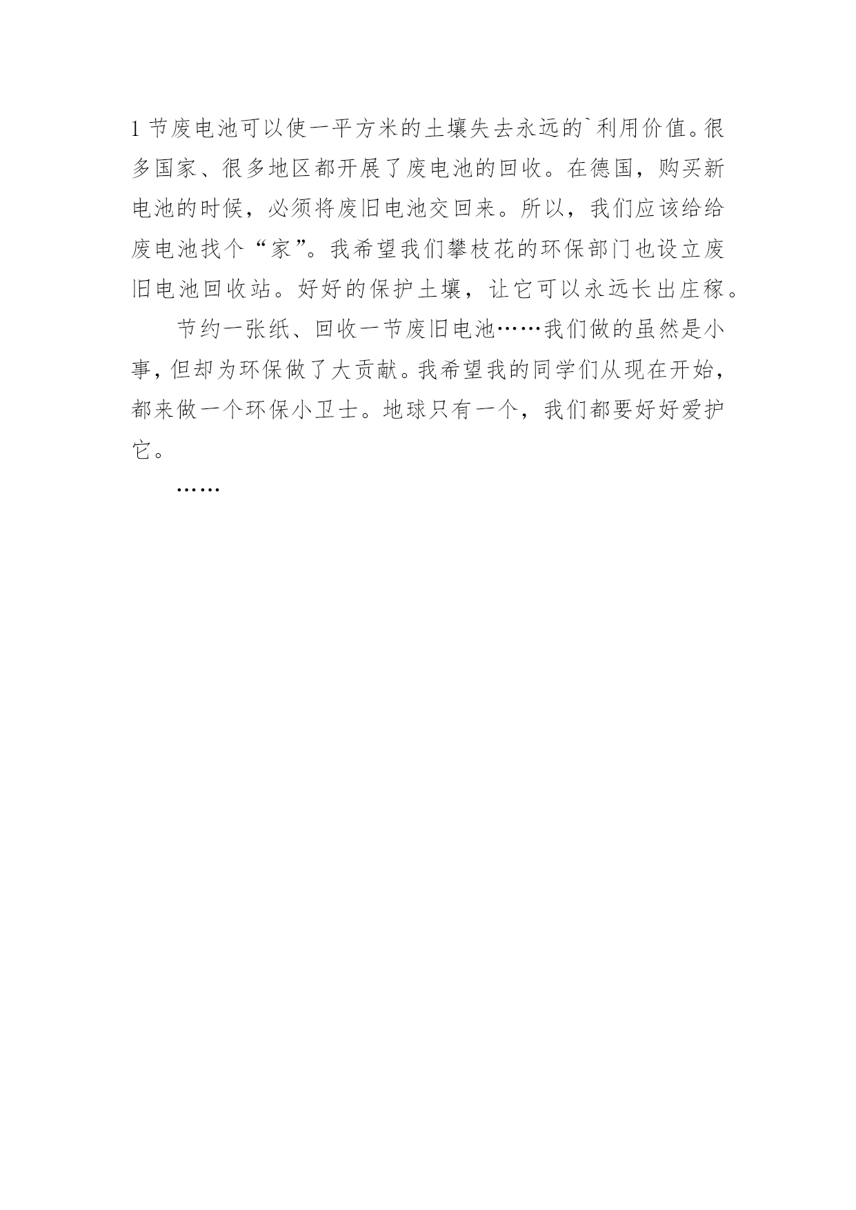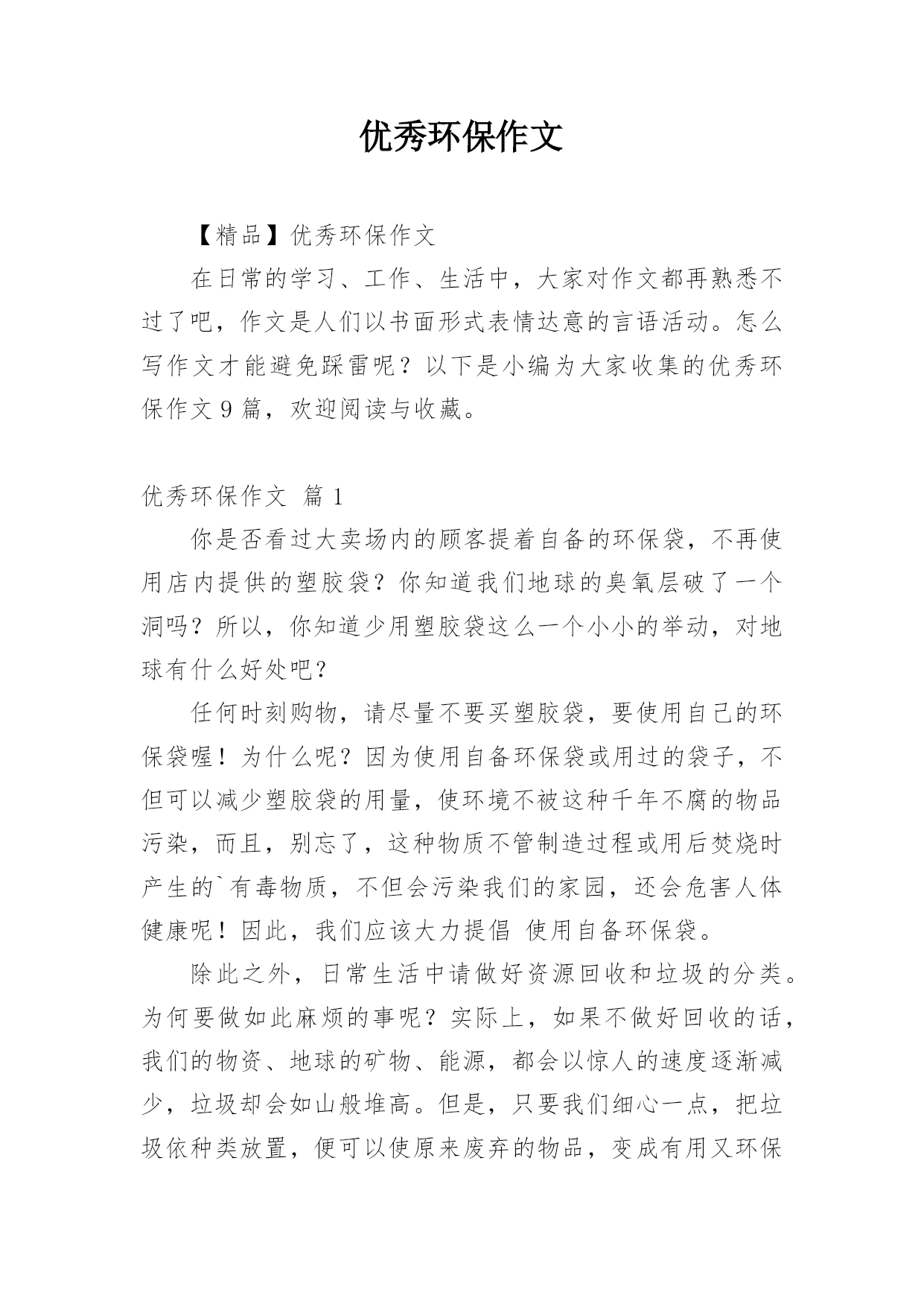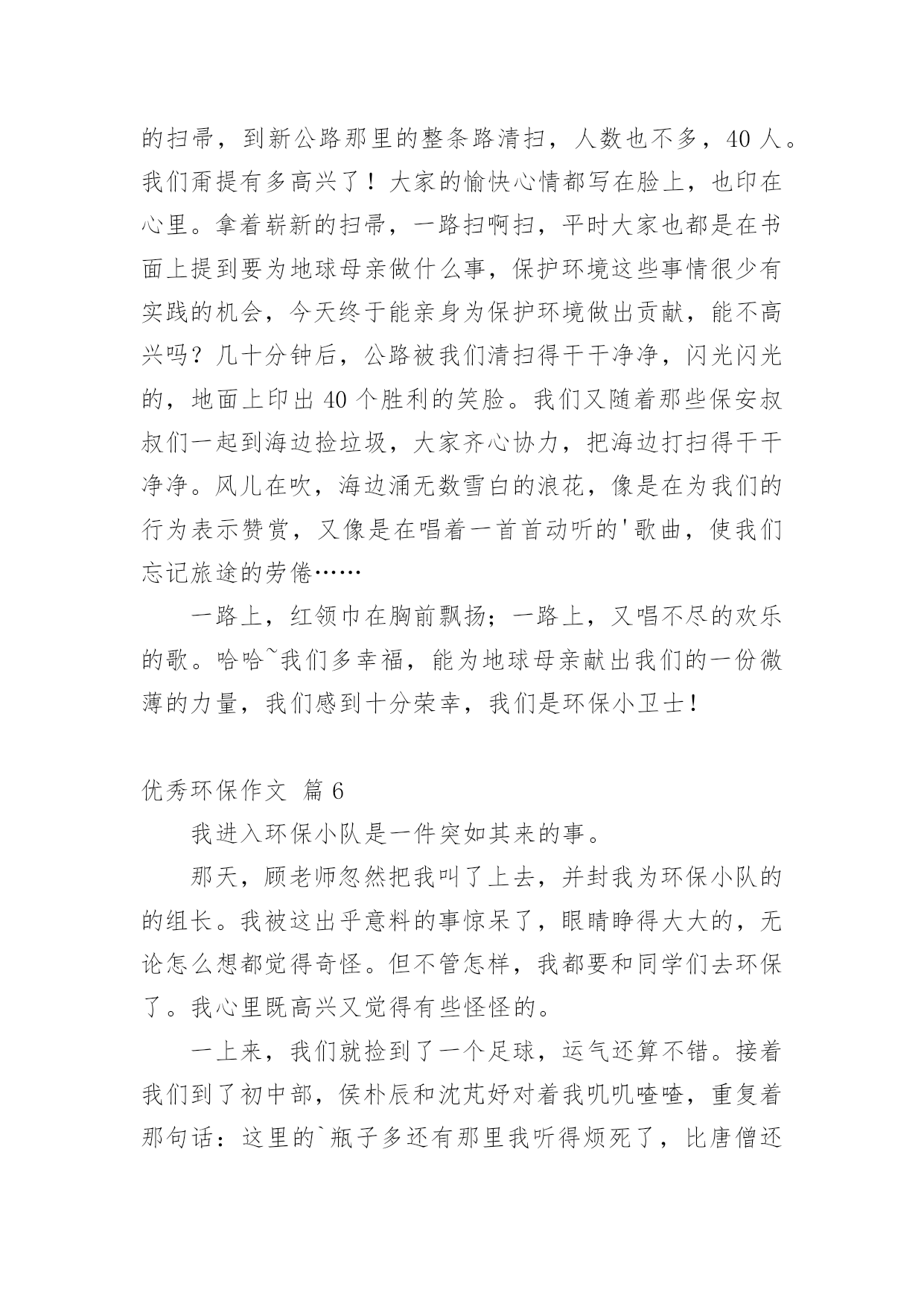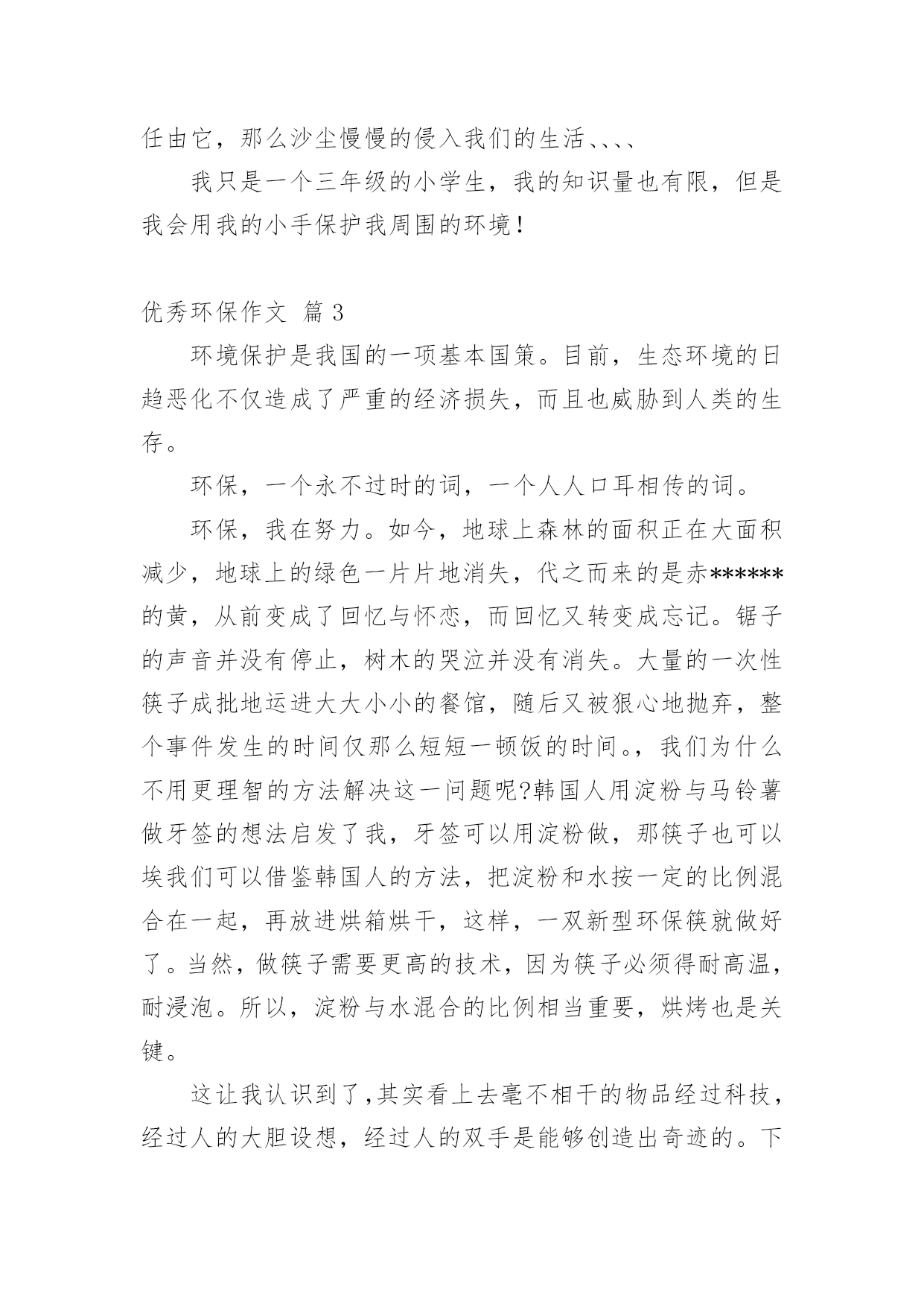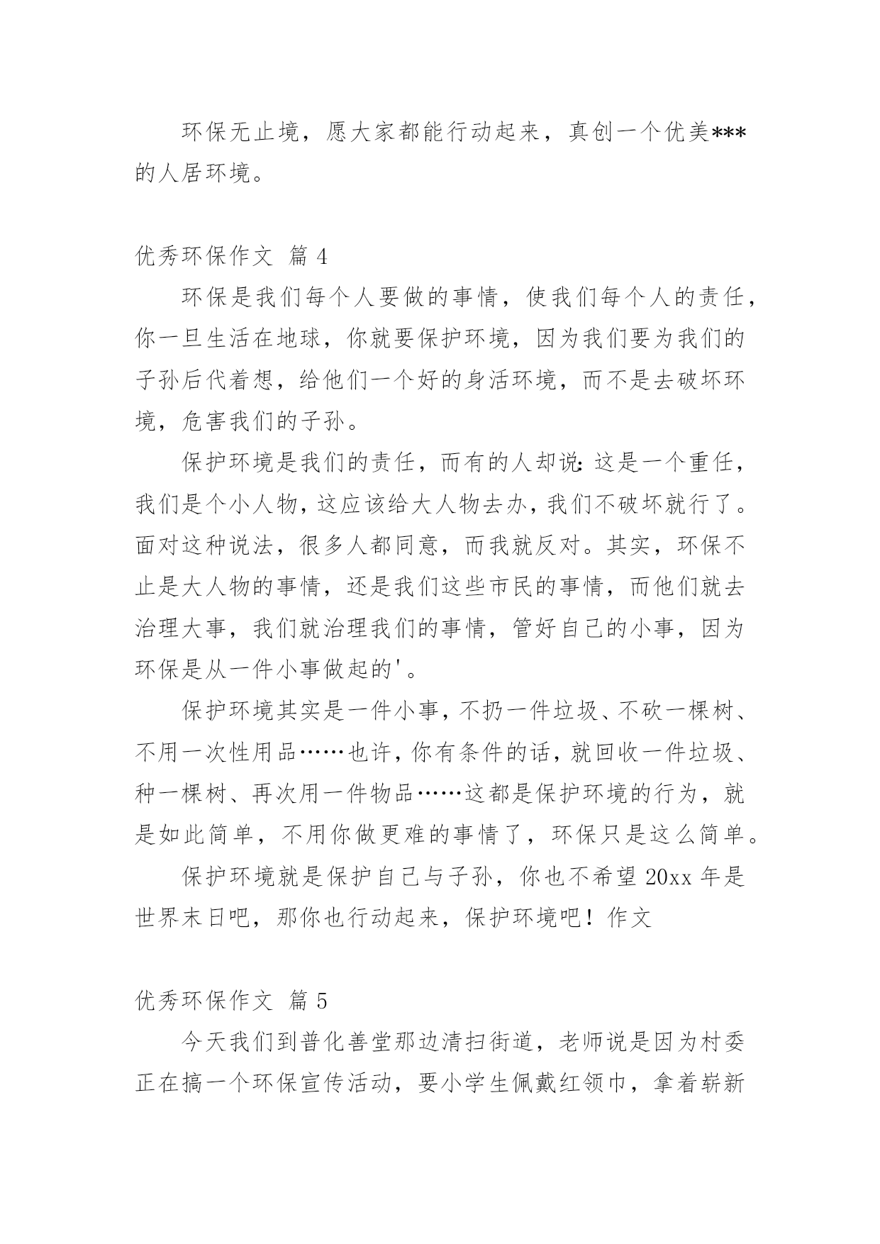 优秀环保作文【精品】优秀环保作文在日常的学习、工作、生活中,大家对作文都再熟悉不过了吧,作文是人们以书面形式表情达意的言语活动。怎么写作文才能避免踩雷呢?以下是小编为大家收集的优秀环保作文9篇,欢迎阅读与收藏。优秀环保作文篇1你是否看过大卖场内的顾客提着自备的环保袋,不再使用店内提供的塑胶袋?你知道我们地球的臭氧层破了一个洞吗?所以,你知道少用塑胶袋这么一个小小的举动,对地球有什么好处吧?任何时刻购物,请尽量不要买塑胶袋,要使用自己的环保袋喔!为什么呢?因为使用自备环保袋或用过的袋子,不但可以减少塑胶袋的用量,使环境不被这种千年不腐的物品污染,而且,别忘了,这种物质不管制造过程或用后焚烧时产生的`有毒物质,不但会污染我们的家园,还会危害人体健康呢!因此,我们应该大力提倡使用自备环保袋。除此之外,日常生活中请做好资源回收和垃圾的分类。为何要做如此麻烦的事呢?实际上,如果不做好回收的话,我们的物资、地球的矿物、能源,都会以惊人的速度逐渐减少,垃圾却会如山般堆高。但是,只要我们细心一点,把垃圾依种类放置,便可以使原来废弃的物品,变成有用又环保的再生制品,例如:废纸经捣碎后风干变成再生纸,玻璃经熔化后变成其它玻璃制品……。除了前面两种方法外,我们还可以做个无污染的游客呢!要怎么做呢?很简单,我们只要不在林道上抽烟、不乱丢弃垃圾、不把音乐开得震天响,如果要举炊,使用低污染的即着碳,就能做个无污染的“环境保护者”。来吧!让我们为地球贡献一份心力。就从今天,从你我做起吧,当下次外出购物时,不要忘了带环保袋;要丢垃圾时,别忘了做垃圾分类;还有,出游时,别忘了做个无污染的“环保”游客!来吧,就从今天开始!优秀环保作文篇2一个很晴朗的星期天,爸爸妈妈带我去游乐城玩,玩着玩我口渴了。妈妈就给我买了个雪糕。我把雪糕从袋里拿出来,然后一个手拿着雪糕小学生作文,另一个手拿着空纸袋。妈妈看见我将空纸袋很快走过来拿起空纸袋就随手丢在了大街上。我对妈妈说:“妈妈,您忘记了吗?现在我们这里正在争创文明绿色城市,怎么能随意乱丢乱扔垃圾呢!”妈妈听了我的话,有点不好意思了,赶紧从地上拾起刚丢下的空纸袋扔进了附近的垃圾箱里,爸爸笑着说:“看看,我们宝贝儿子长大了,还真是个优秀环保卫士呢!我们大人连孩子都不如。我也要从今天开始向我儿子学习!”说完拉着我的手回家。是呀!环境在一天天的`恶化,如果我们不保护环境,任由它,那么沙尘慢慢的侵入我们的生活、、、、我只是一个三年级的小学生,我的知识量也有限,但是我会用我的小手保护我周围的环境!优秀环保作文篇3环境保护是我国的一项基本国策。目前,生态环境的日趋恶化不仅造成了严重的经济损失,而且也威胁到人类的生存。环保,一个永不过时的词,一个人人口耳相传的词。环保,我在努力。如今,地球上森林的面积正在大面积减少,地球上的绿色一片片地消失,代之而来的是赤******的黄,从前变成了回忆与怀恋,而回忆又转变成忘记。锯子的声音并没有停止,树木的哭泣并没有消失。大量的一次性筷子成批地运进大大小小的餐馆,随后又被狠心地抛弃,整个事件发生的时间仅那么短短一顿饭的时间。,我们为什么不用更理智的方法解决这一问题呢?韩国人用淀粉与马铃薯做牙签的想法启发了我,牙签可以用淀粉做,那筷子也可以埃我们可以借鉴韩国人的方法,把淀粉和水按一定的比例混合在一起,再放进烘箱烘干,这样,一双新型环保筷就做好了。当然,做筷子需要更高的技术,因为筷子必须得耐高温,耐浸泡。所以,淀粉与水混合的比例相当重要,烘烤也是关键。这让我认识到了,其实看上去毫不相干的物品经过科技,经过人的大胆设想,经过人的双手是能够创造出奇迹的。下面本人结合生活和大胆的猜想,相信的在不久的生活中能够实现。餐巾纸是现代人爱洁净的表现,当然餐巾纸也因此成为生活的垃圾,能不能循环利用呢?除了的传统手帕外,可以生产一种新型的餐巾纸来替代,暂时叫循环餐巾纸。这种餐巾纸外表和其它餐巾纸没什么区别,但有着许多毛孔。当人们从地板上擦出一***灰尘时,总会用一张张餐巾纸把灰尘裹起来,扔进垃圾桶。这样既浪费纸张,而且途中不免会落下一些灰尘。可吸尘餐巾纸就不一样了,它身上的毛孔可以把灰尘吸进去,分为两类。一类是还有用的灰尘;还有一类是没有用的灰尘。之后,它会把没有用的灰尘排出去,有用的留下来慢慢用。这样既能收集一定的`资源,又能循环实现餐巾纸的利用,何乐而不为呢。现在几乎家家户户都装了防盗窗,目的就是为了防止小偷从窗户爬进来。能不能研制一种新型的防盗窗发挥更多的功能呢,暂且叫“多功能防盗窗”。这种“多功能防盗窗”不仅能有效防止小偷从窗户爬进来;而且能吸收噪音,它的内部有一个迷你吸音器,专门吸汽车发出的轰鸣声、喇叭声……等噪音,还居室一个安详宁静的环境。如果喜欢听音乐的,那么可以随心所以的把被吸进去的噪音在瞬间转化成自己喜欢