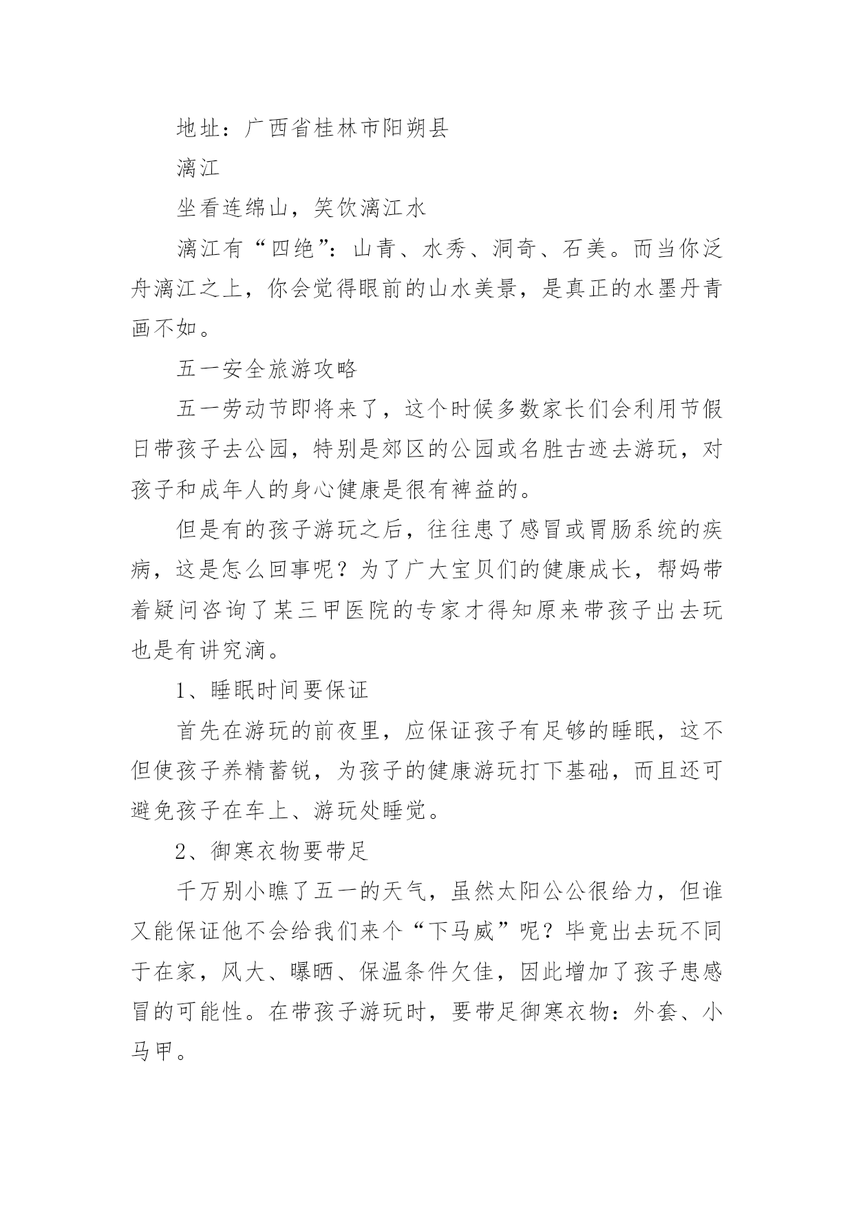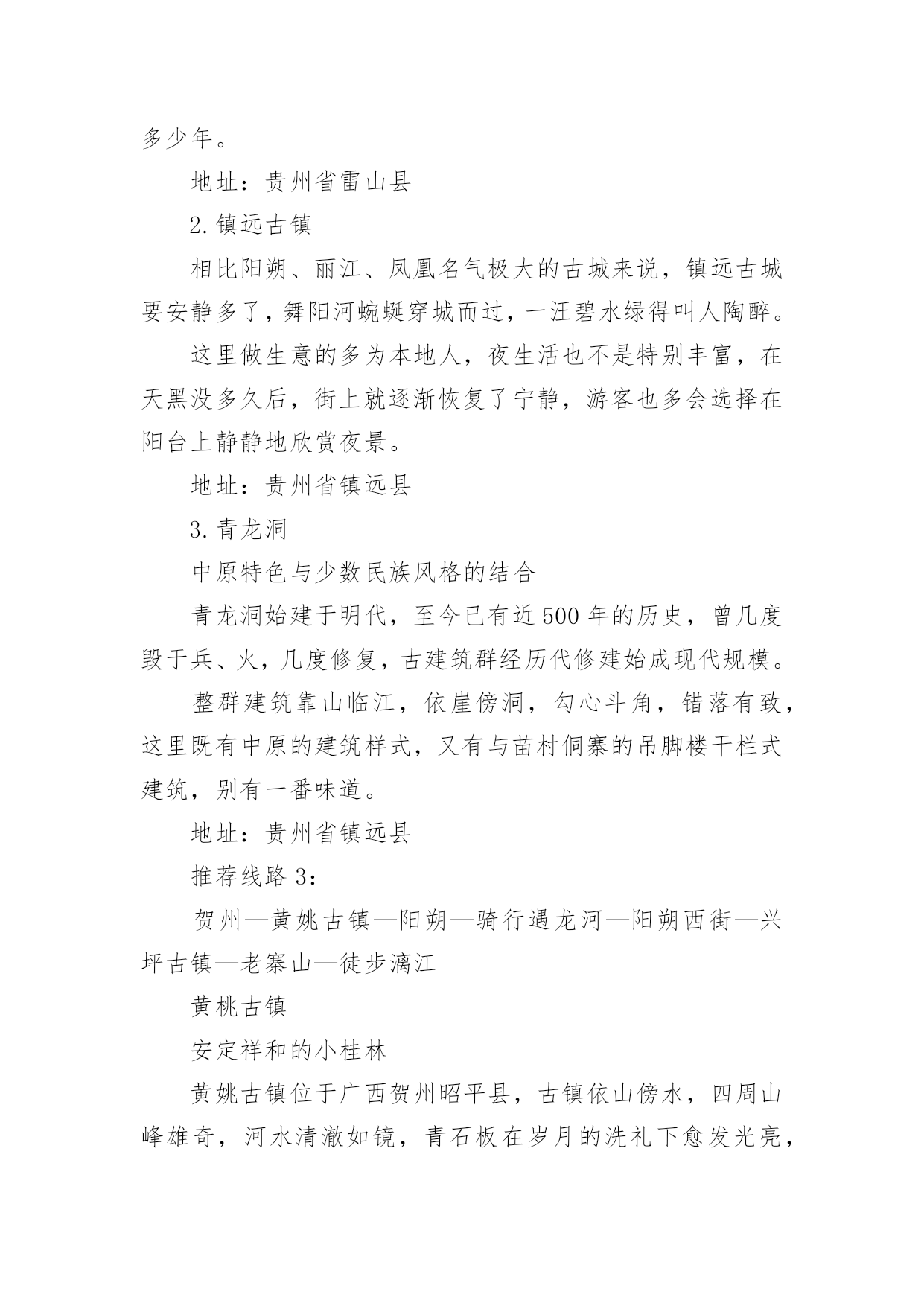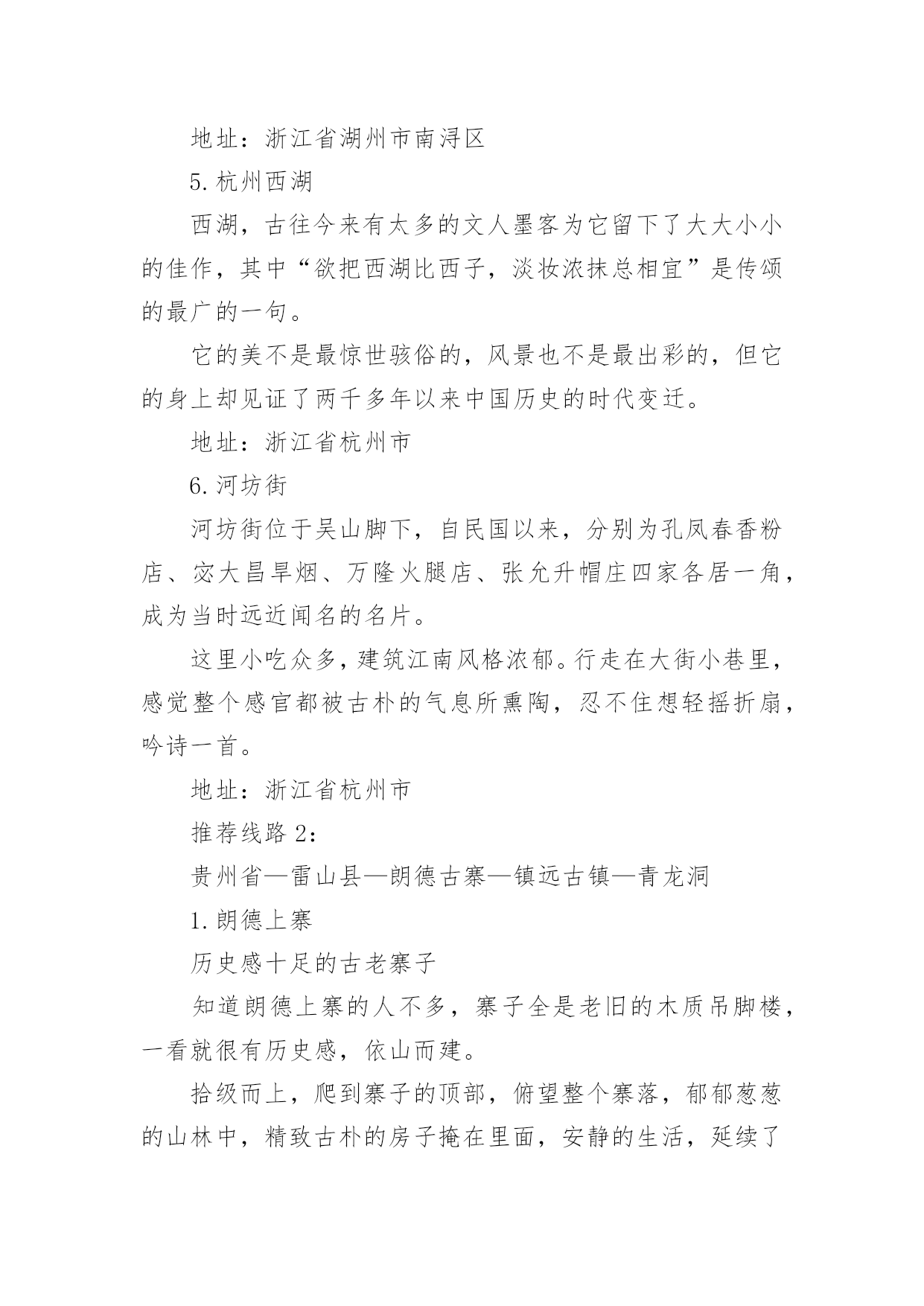 五一假期旅游攻略旅游本是享受,然而传统旅游的一成不变的模式,千篇一律的线路,成为游客集中抱怨的焦点,市场需要创新的、更适合中国人的旅游产品,颠覆传统旅游便成为一种必然。五一假期去哪里,以下是小编整理的五一假期旅游攻略,供大家参考借鉴,希望可以帮助到有需要的朋友。古镇篇每个人心中都有个古镇梦,而3日小长假也很适合去古镇走走逛逛。小编在这里给大家推荐了3条线路,这3条线路都浓缩了古镇的精华,风景的曼妙不在话下。推荐线路1:咸宁—周庄—苏州—南浔—杭州—咸宁沿途亮点:1.周庄古镇“上有天堂,下有苏杭,中间有个周庄”。周庄有着天下第一水乡的名头。因水成路的周庄,几千年来,被这水侵染的十分通透,就像一块养了许久的碧玉般,越发美丽了。这里全镇依河成街,桥街相连,一派古朴幽静。古朴秀雅的明清民居,素淡的青瓦白墙,完美的和水流结合在了一起。地址:江苏省昆山市周庄古镇2.留园有人说:即使搞不懂建筑空间的艺术魅力,但当你身在其中,却一定能够感受得到其精妙所在。赋有“不出城郭,而获山林之趣”之称的留园,就是世界闻名的建筑空间艺术处理的典范。以建筑艺术精湛著称,厅堂宏敞华丽,庭院富有变化,太湖石以冠云峰为最,造园家运用各种艺术手法,构成了有节奏有韵律的园林空间体系。地址:苏州阊门外留园路338号3.同里古镇同里,算是真正的旧时江南、醇正水乡。这里水多桥多,明清建筑多,名人雅士多。同里有独到的一面,气质散漫,看似保守,骨子里则自信。同里也有智慧的一面,后现代的结构,却又动静结合。在这里,你可以欣赏退思园的独到,踏着脚下光滑的条石走过窄到只剩一人身宽的穿心弄,坐在南园茶社中品茗听曲;走三桥,坐游船,享受生活中的同里。一切都是鲜活而让人亲近的。地址:江苏省苏州市吴江区4.南浔古镇有人曾说,若把西塘比作小家碧玉,把乌镇比作大家闺秀,南浔则是留洋归来的十三姨,透着中西合璧的理念。这里的商业化并不浓厚。小镇上,只有安静生活的当地居民和三三两两的游人过客,放眼望去皆是一片白墙灰瓦垂柳碧水,一份悠闲宁静仿佛是与生俱来的。地址:浙江省湖州市南浔区5.杭州西湖西湖,古往今来有太多的文人墨客为它留下了大大小小的佳作,其中“欲把西湖比西子,淡妆浓抹总相宜”是传颂的最广的一句。它的美不是最惊世骇俗的,风景也不是最出彩的,但它的身上却见证了两千多年以来中国历史的时代变迁。地址:浙江省杭州市6.河坊街河坊街位于吴山脚下,自民国以来,分别为孔凤春香粉店、宓大昌旱烟、万隆火腿店、张允升帽庄四家各居一角,成为当时远近闻名的名片。这里小吃众多,建筑江南风格浓郁。行走在大街小巷里,感觉整个感官都被古朴的气息所熏陶,忍不住想轻摇折扇,吟诗一首。地址:浙江省杭州市推荐线路2:贵州省—雷山县—朗德古寨—镇远古镇—青龙洞1.朗德上寨历史感十足的古老寨子知道朗德上寨的人不多,寨子全是老旧的木质吊脚楼,一看就很有历史感,依山而建。拾级而上,爬到寨子的顶部,俯望整个寨落,郁郁葱葱的山林中,精致古朴的房子掩在里面,安静的生活,延续了多少年。地址:贵州省雷山县2.镇远古镇相比阳朔、丽江、凤凰名气极大的古城来说,镇远古城要安静多了,舞阳河蜿蜒穿城而过,一汪碧水绿得叫人陶醉。这里做生意的多为本地人,夜生活也不是特别丰富,在天黑没多久后,街上就逐渐恢复了宁静,游客也多会选择在阳台上静静地欣赏夜景。地址:贵州省镇远县3.青龙洞中原特色与少数民族风格的结合青龙洞始建于明代,至今已有近500年的历史,曾几度毁于兵、火,几度修复,古建筑群经历代修建始成现代规模。整群建筑靠山临江,依崖傍洞,勾心斗角,错落有致,这里既有中原的建筑样式,又有与苗村侗寨的吊脚楼干栏式建筑,别有一番味道。地址:贵州省镇远县推荐线路3:贺州—黄姚古镇—阳朔—骑行遇龙河—阳朔西街—兴坪古镇—老寨山—徒步漓江黄桃古镇安定祥和的小桂林黄姚古镇位于广西贺州昭平县,古镇依山傍水,四周山峰雄奇,河水清澈如镜,青石板在岁月的洗礼下愈发光亮,在曲径幽处默默享受着一份安定祥和。景色的美丽,又使她被誉为“小桂林”。宋时,镇上人家有黄、姚两姓,所以得名“黄姚”,并沿用至今。地址:广西省贺州市昭平县遇龙河“小家碧玉”的幽静小河如果说漓江是“大家闺秀”,那么遇龙河就是“小家碧玉”了。这儿最好的玩法就是坐竹筏漂流,泛舟江流,满目青山,耳畔是此起彼伏的鸟鸣。地址:广西桂林市阳朔县阳朔西街不可错过的阳朔风景来阳朔,绝对不可能错过的就是西街。历经1400多年的西街,是阳朔最古老最繁华的街道,也是阳朔重要的旅游景点之一。这条不足1km的街道,由石板砌成,呈弯曲的S形。两旁房屋古朴典雅,各种肤色的年轻人骑着自行车,背着双肩包穿梭于小镇的街口巷尾,显得十分惬意。地址:广西省桂林市阳朔县兴平古镇比西街更多了一分沧桑兴坪古镇位于漓江东岸,它是20元人民币背面的图案就是兴坪实景。相比热闹的