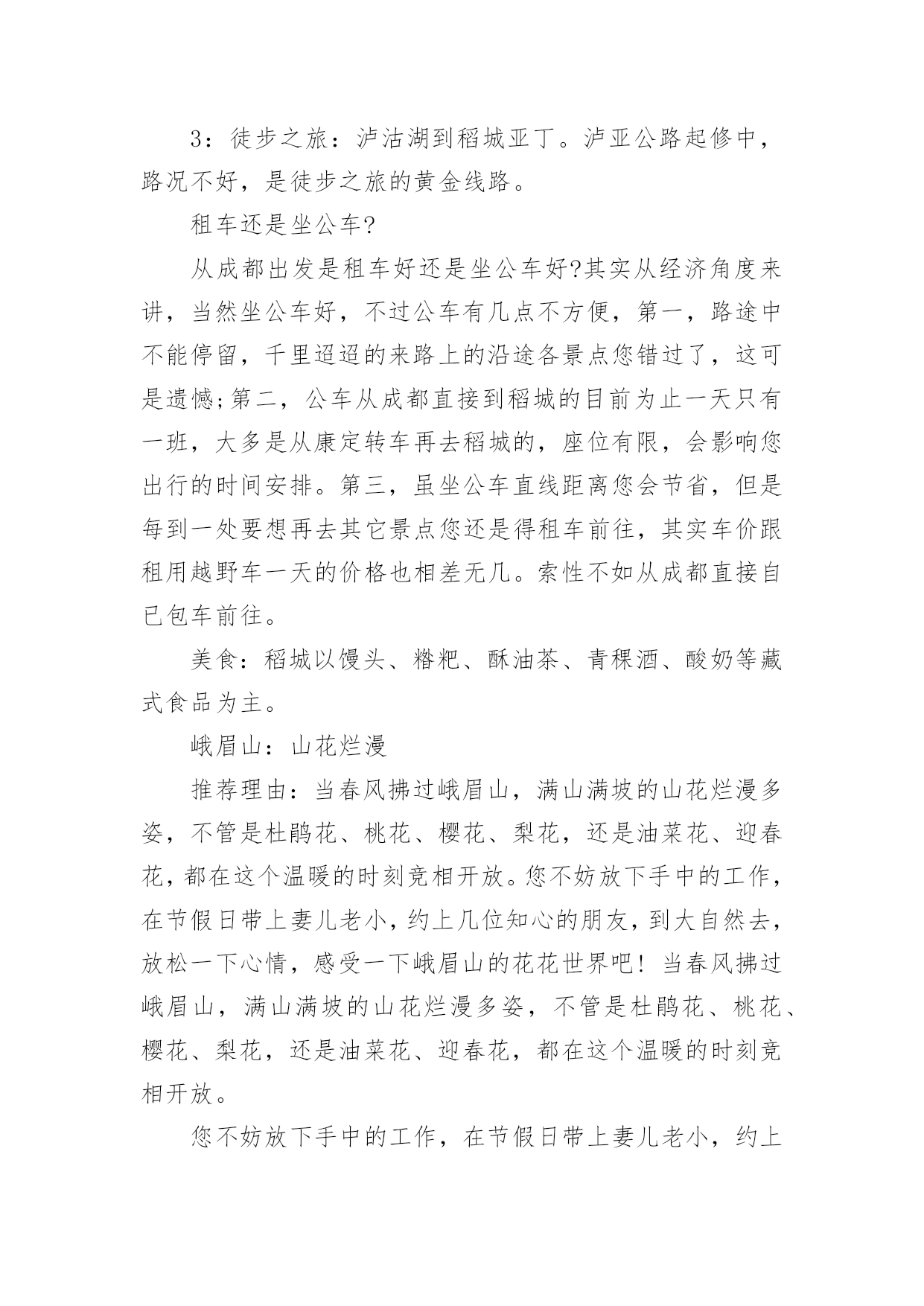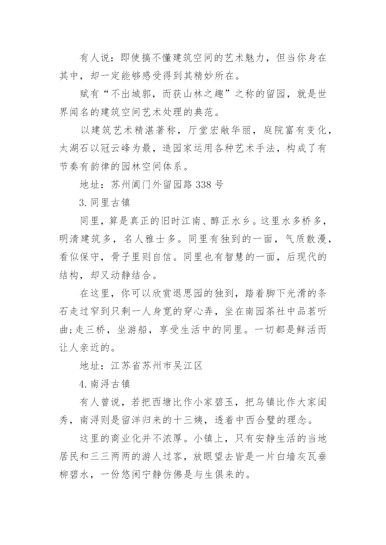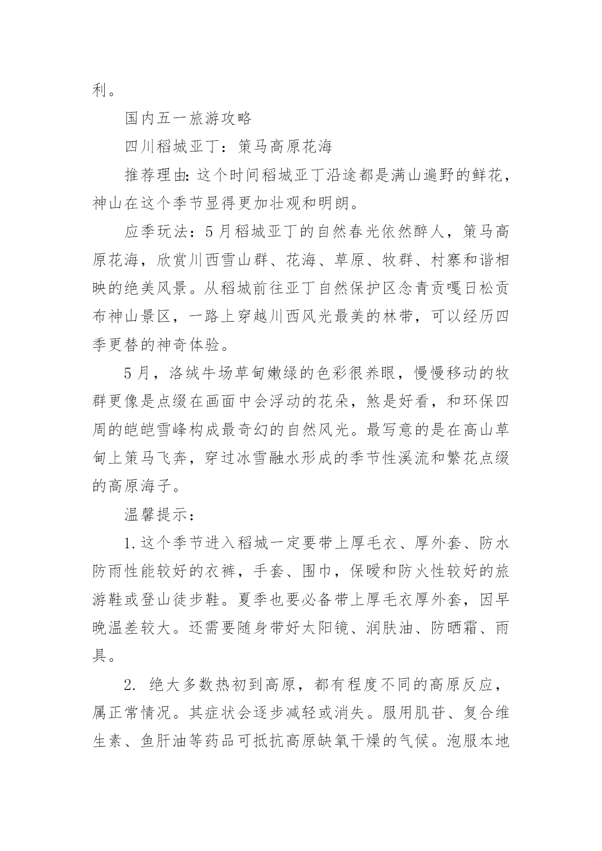 五一假期旅游攻略旅游本是享受,然而传统旅游的一成不变的模式,千篇一律的线路,成为游客集中抱怨的焦点,市场需要创新的、更适合中国人的旅游产品,颠覆传统旅游便成为一种必然。五一假期去哪里,以下是小编整理的五一假期旅游攻略,供大家参考借鉴,希望可以帮助到有需要的朋友。古镇篇每个人心中都有个古镇梦,而3日小长假也很适合去古镇走走逛逛。小编在这里给大家推荐了3条线路,这3条线路都浓缩了古镇的精华,风景的曼妙不在话下。推荐线路1:咸宁—周庄—苏州—南浔—杭州—咸宁沿途亮点:1.周庄古镇“上有天堂,下有苏杭,中间有个周庄”。周庄有着天下第一水乡的名头。因水成路的周庄,几千年来,被这水侵染的十分通透,就像一块养了许久的碧玉般,越发美丽了。这里全镇依河成街,桥街相连,一派古朴幽静。古朴秀雅的明清民居,素淡的青瓦白墙,完美的和水流结合在了一起。地址:江苏省昆山市周庄古镇2.留园有人说:即使搞不懂建筑空间的艺术魅力,但当你身在其中,却一定能够感受得到其精妙所在。赋有“不出城郭,而获山林之趣”之称的留园,就是世界闻名的建筑空间艺术处理的典范。以建筑艺术精湛著称,厅堂宏敞华丽,庭院富有变化,太湖石以冠云峰为最,造园家运用各种艺术手法,构成了有节奏有韵律的园林空间体系。地址:苏州阊门外留园路338号3.同里古镇同里,算是真正的旧时江南、醇正水乡。这里水多桥多,明清建筑多,名人雅士多。同里有独到的一面,气质散漫,看似保守,骨子里则自信。同里也有智慧的一面,后现代的结构,却又动静结合。在这里,你可以欣赏退思园的独到,踏着脚下光滑的条石走过窄到只剩一人身宽的穿心弄,坐在南园茶社中品茗听曲;走三桥,坐游船,享受生活中的同里。一切都是鲜活而让人亲近的。地址:江苏省苏州市吴江区4.南浔古镇有人曾说,若把西塘比作小家碧玉,把乌镇比作大家闺秀,南浔则是留洋归来的十三姨,透着中西合璧的理念。这里的商业化并不浓厚。小镇上,只有安静生活的当地居民和三三两两的游人过客,放眼望去皆是一片白墙灰瓦垂柳碧水,一份悠闲宁静仿佛是与生俱来的。地址:浙江省湖州市南浔区5.杭州西湖西湖,古往今来有太多的文人墨客为它留下了大大小小的佳作,其中“欲把西湖比西子,淡妆浓抹总相宜”是传颂的最广的一句。它的美不是最惊世骇俗的,风景也不是最出彩的,但它的身上却见证了两千多年以来中国历史的时代变迁。地址:浙江省杭州市6.河坊街河坊街位于吴山脚下,自民国以来,分别为孔凤春香粉店、宓大昌旱烟、万隆火腿店、张允升帽庄四家各居一角,成为当时远近闻名的名片。这里小吃众多,建筑江南风格浓郁。行走在大街小巷里,感觉整个感官都被古朴的气息所熏陶,忍不住想轻摇折扇,吟诗一首。地址:浙江省杭州市推荐线路2:贵州省—雷山县—朗德古寨—镇远古镇—青龙洞1.朗德上寨历史感十足的古老寨子知道朗德上寨的人不多,寨子全是老旧的木质吊脚楼,一看就很有历史感,依山而建。拾级而上,爬到寨子的顶部,俯望整个寨落,郁郁葱葱的山林中,精致古朴的房子掩在里面,安静的生活,延续了多少年。地址:贵州省雷山县2.镇远古镇相比阳朔、丽江、凤凰名气极大的古城来说,镇远古城要安静多了,舞阳河蜿蜒穿城而过,一汪碧水绿得叫人陶醉。这里做生意的多为本地人,夜生活也不是特别丰富,在天黑没多久后,街上就逐渐恢复了宁静,游客也多会选择在阳台上静静地欣赏夜景。地址:贵州省镇远县3.青龙洞中原特色与少数民族风格的结合青龙洞始建于明代,至今已有近500年的历史,曾几度毁于兵、火,几度修复,古建筑群经历代修建始成现代规模。整群建筑靠山临江,依崖傍洞,勾心斗角,错落有致,这里既有中原的建筑样式,又有与苗村侗寨的吊脚楼干栏式建筑,别有一番味道。地址:贵州省镇远县推荐线路3:贺州—黄姚古镇—阳朔—骑行遇龙河—阳朔西街—兴坪古镇—老寨山—徒步漓江黄桃古镇安定祥和的小桂林黄姚古镇位于广西贺州昭平县,古镇依山傍水,四周山峰雄奇,河水清澈如镜,青石板在岁月的洗礼下愈发光亮,在曲径幽处默默享受着一份安定祥和。景色的美丽,又使她被誉为“小桂林”。宋时,镇上人家有黄、姚两姓,所以得名“黄姚”,并沿用至今。地址:广西省贺州市昭平县遇龙河“小家碧玉”的幽静小河如果说漓江是“大家闺秀”,那么遇龙河就是“小家碧玉”了。这儿最好的玩法就是坐竹筏漂流,泛舟江流,满目青山,耳畔是此起彼伏的鸟鸣。地址:广西桂林市阳朔县阳朔西街不可错过的阳朔风景来阳朔,绝对不可能错过的就是西街。历经1400多年的西街,是阳朔最古老最繁华的街道,也是阳朔重要的旅游景点之一。这条不足1km的街道,由石板砌成,呈弯曲的S形。两旁房屋古朴典雅,各种肤色的年轻人骑着自行车,背着双肩包穿梭于小镇的街口巷尾,显得十分惬意。地址:广西省桂林市阳朔县兴平古镇比西街更多了一分沧桑兴坪古镇位于漓江东岸,它是20元人民币背面的图案就是兴坪实景。相比热闹的