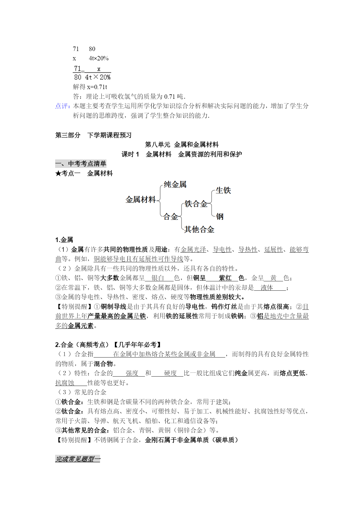 寒假初三化学对教学辅导讲义(完整版)(文档可以直接使用,也可根据实际需要修改使用,可编辑欢迎下载)寒假初三化学1对1教学辅导讲义(一)第一部分情况了解了解基本情况2、制定复习方案第二部分质检试卷复习1、实验题2、计算题3、部分选择题小试牛刀16.(13分)(2021•漳州质检)根据实验装置图回答问题.(1)写出标号仪器名称:①铁架台;②量筒.(2)写出A装置试管中发生反应的化学方程式2KMnO4\frac{\underline{\;\;△\;\;}}{\;}K2MnO4+MnO2+O2↑.(3)若要制取氧气并测定体积,需将上述A、B、C装置进行组装,则导管口的连接顺序为a→d→e→b;能用C装置收集氧气,是因为氧气不易溶于水.(4)将产生的氧气分别通入D、E装置中,观察到D中的白磷燃烧,E中的白磷不燃烧;这一事实说明可燃物燃烧必备的条件是达到可燃物的着火点.考点:氧气的制取装置;量气装置;氧气的收集方法;书写化学方程式、文字表达式、电离方程式;燃烧与燃烧的条件.专题:常见气体的实验室制法、检验、干燥与净化.分析:(1)依据实验室常用仪器的认识解决此题;(2)高锰酸钾受热分解生成锰酸钾和二氧化锰和氧气,据此书写方程式;(3)若要制取氧气并通过排水量来测定所收集到氧气的体积,整套实验装置接口的正确连接顺序为a→d→e→b;(4)根据实验现象结合图中提供的信息分析燃烧需要的条件.解答:解:(1)依据实验室常用仪器的认识解决此题,①是铁架台,②是量筒,故答案为:铁架台;量筒;(2)高锰酸钾受热分解生成锰酸钾和二氧化锰和氧气,化学反应方程式是2KMnO4\frac{\underline{\;\;△\;\;}}{\;}K2MnO4+MnO2+O2↑,故答案为:2KMnO4\frac{\underline{\;\;△\;\;}}{\;}K2MnO4+MnO2+O2↑;(3)若要制取氧气并通过排水量来测定所收集到氧气的体积,整套实验装置接口的正确连接顺序为a→d→e→b;因为氧气不易溶于水,因此可以用C装置收集氧气;故答案为:d;e;不易溶于水;(4)D中的白磷燃烧,E中的白磷不燃烧,除温度外白磷所处环境一样,只能说明是温度达不到的原因,即说明可燃物燃烧必备的条件是达到可燃物的着火点,故答案为:燃烧;不燃烧;达到可燃物的着火点.点评:掌握常见仪器的名称;高锰酸钾制取氧气的原理;要掌握燃烧的条件,具有可燃物、温度达到该物质的着火点、与氧气接触,知道控制变量的实验的设计方法,只允许有一个变量.17.(11分)(2021•漳州)某化学兴趣小组的同学往氢氧化钠溶液中滴加稀盐酸时,没有看到明显现象.【提出问题】氢氧化钠与盐酸是否发生了化学反应?【查阅资料】酸与碱发生中和反应会放出热量.【实验设计】甲、乙、丙三位同学分别设计了如下实验方案,请你帮他们完成实验报告.同学实验操作现象结论甲溶液由红色变成无色氢氧化钠与盐酸发生了化学反应,反应的化学方程式为HCl+NaOH=NaCl+H2O乙U型玻璃管中左边的红墨水液面下降(所加稀盐酸的体积忽略不计)氢氧化钠与盐酸发生了化学反应丙用pH试纸测定氢氧化钠溶液的pH,向其中滴加足量稀盐酸,再测定溶液的pH最后溶液的pH≤7(填“≥7”、“≤7”、“不变”氢氧化钠与盐酸发生了化学反应【评价反思】你认为实验设计方案不合理的同学是乙,理由是氢氧化钠固体溶于水也会放出热量..【拓展延伸】另有一位同学向自己配制的氢氧化钠溶液中滴加酚酞试液时,溶液变红色,可是红色即可消失了,出现此意外情况的原因是B(填以下序号).A.所用的酚酞试液是变质的B.所用的氢氧化钠溶液浓度太小C.氢氧化钠溶液吸收了空气中二氧化碳.考点:中和反应及其应用;溶液的酸碱度测定;酸碱指示剂及其性质;书写化学方程式、文字表达式、电离方程式.专题:常见的酸酸的通性.分析:酚酞试液遇到碱溶液变红,遇到中性溶液或酸性溶液不变色,所以氢氧化钠中滴加盐酸使,当把氢氧化钠反应完了,溶液就会变为无色,根据方程式的书写注意事项写出方程式;氢氧化钠固体溶于水会放出大量的热,由于热胀冷缩,所以U型玻璃管中左侧下降右侧上升;测定溶液的pH最简单的方法是使用pH试纸;中性溶液或酸性溶液都不能使酚酞试液变色;由于乙同学用的是氢氧化钠固体溶于水,由于氢氧化钠固体溶于水会放出热量,到底热量是氢氧化钠与盐酸反应放出的,还是氢氧化钠固体溶于水放出的,无法判断,所以说法错误;由于氢氧化钠溶液浓度太小会造成,开始滴加酚酞变红,可是红色即可消失了.解答:解:【实验设计】酚酞试液遇到碱溶液变红,遇到中性溶液或酸性溶液不变色,所以氢氧化钠中滴加盐酸使,当把氢氧化钠反应完了,溶液就会变为无色;反应物是氢氧化钠和盐酸,生成物是氯化钠和水,所以方程