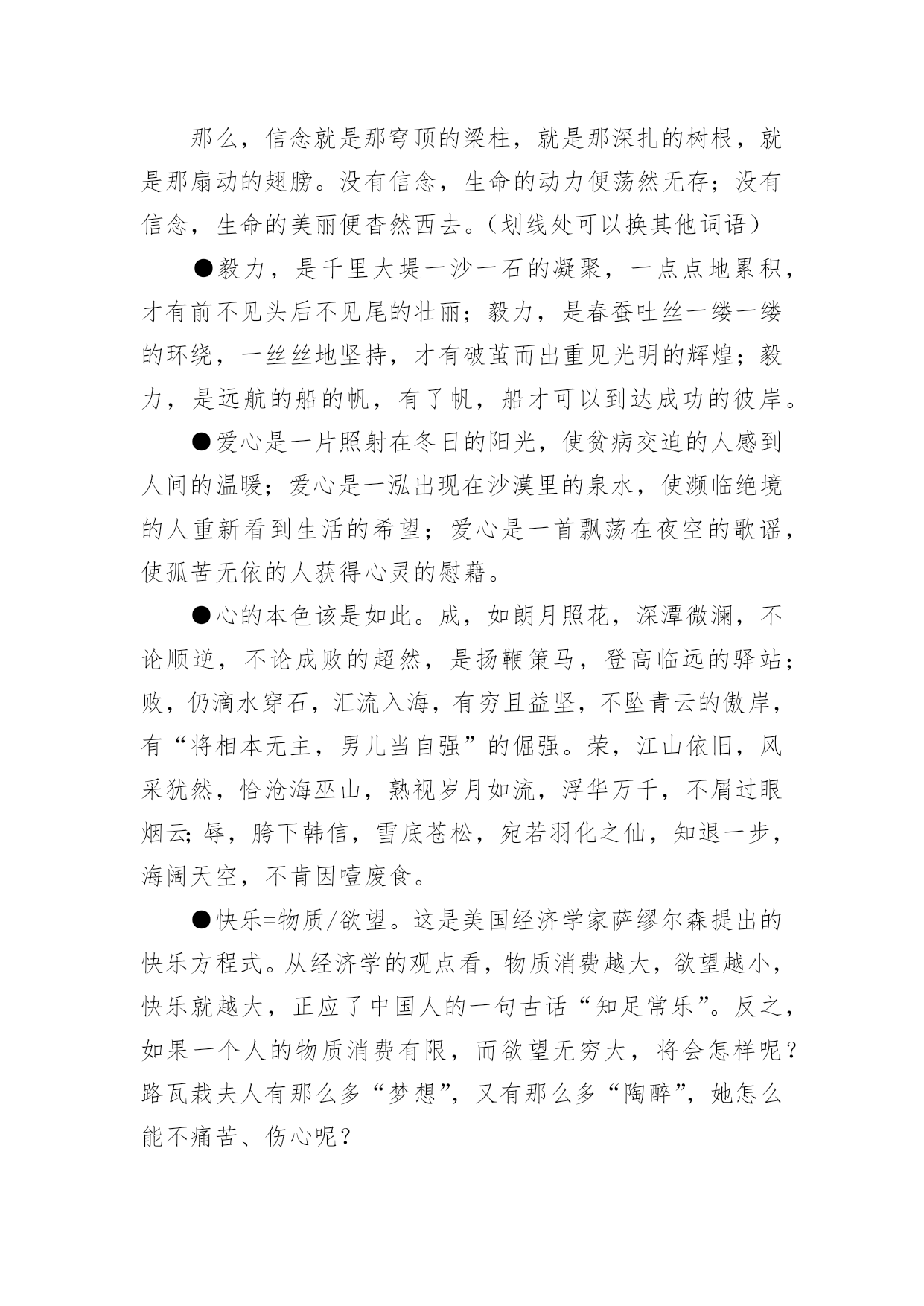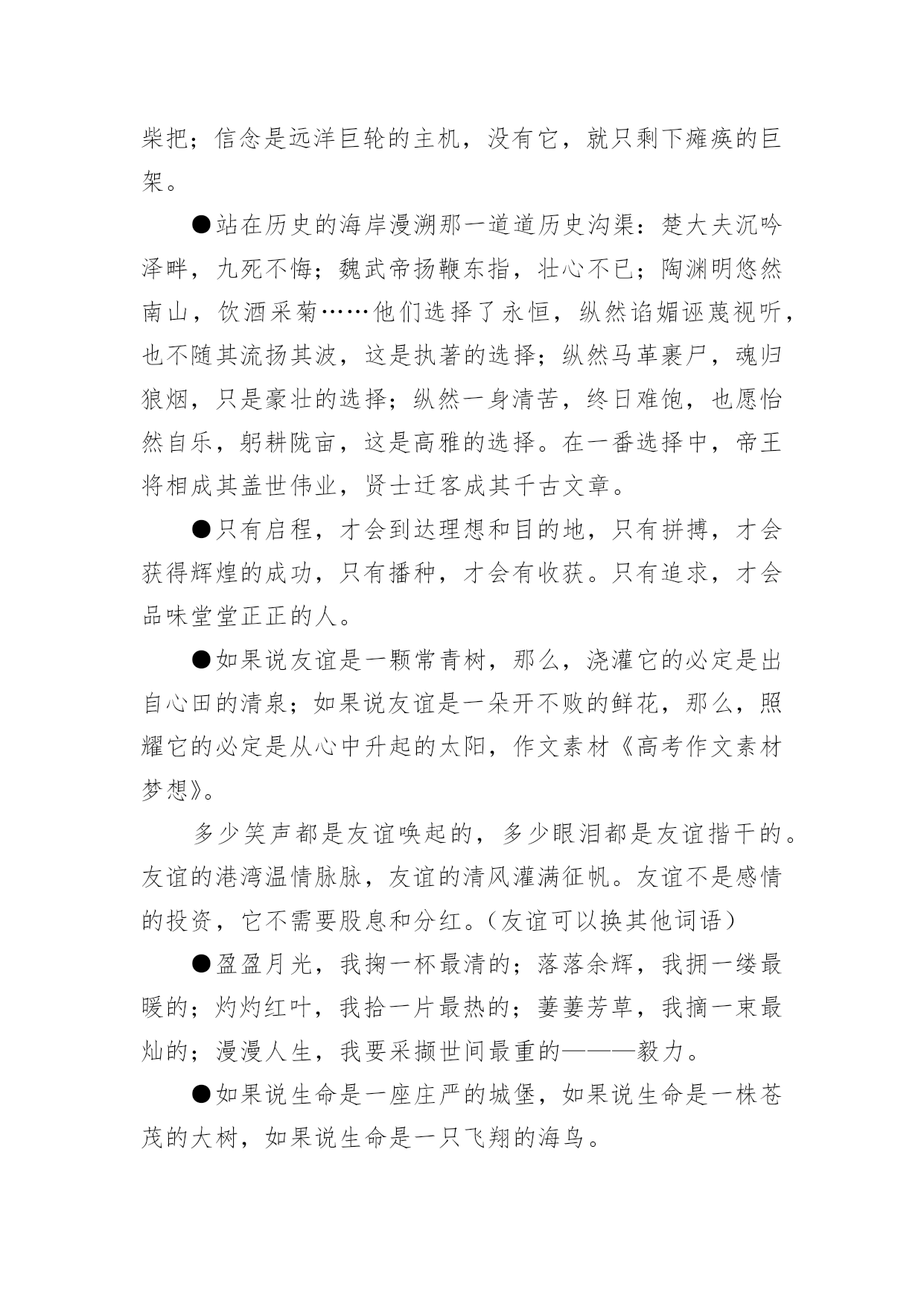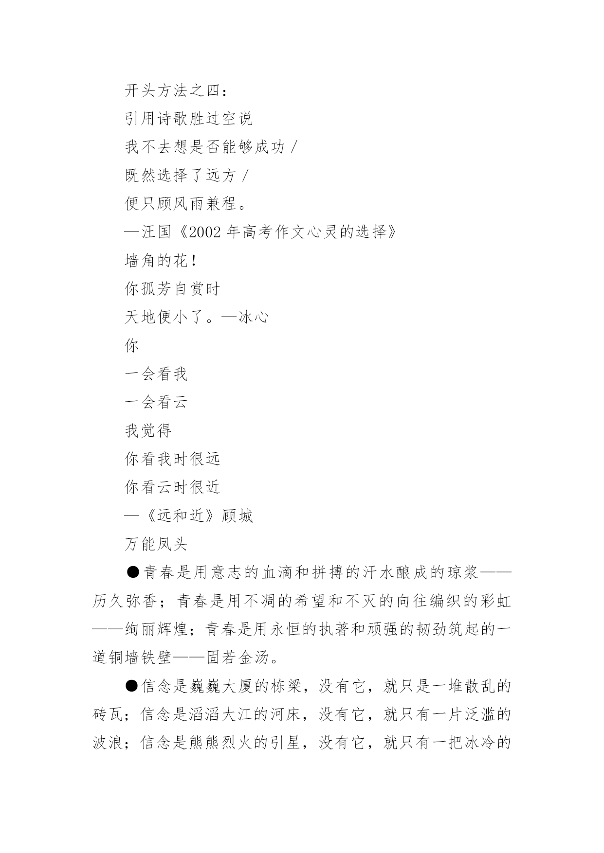 高考作文素材高考作文素材大全开头方法之一:引用名言文采凸现如果事业中掺杂了感情因素那事业注定要不成功的;我们的公司的管理人员决于能长着相似的脸。心睛的时候,雨也是睛;心时候,睛也是雨。——汪国真哈姆莱特曾高呼:“人啊,看清你自己!”而我要说:“人啊,看清这个世界。”《2003年高考作文擦亮眼睛看世界》美学大师罗丹曾经说过:“美是到处都有的,对于我们的眼睛,不是缺少美,而是缺少发现。”《智慧的眼睛》马克吐温说过,“一只脚踩编了紫罗兰,它却把香味留在了你的脚上。这就是宽容。”《宽容,从这里开始》开头方法之二:排比点题铺排文气种子冲破岩层的禁锢影响;迎向光明;雄鹰风暴的阴遏影响,飞向云霄;骏马突破缰绳的束缚影响,奔驰原野;海燕则冲向更猛烈的暴风雨。《自由》是什么,来得悄无声息,走得不留痕迹,却激起所有色彩的轻舞飞扬?是什么,走得不留痕迹,来得悄无声息,可留下穿越一季的倾情歌唱?是什么,轻轻地来了,又悄悄地走了,在收获的季节留下飘垂的金黄?是什么,悄悄地走了,又轻轻地来了,为沉寂的大地纺出洁白的梦想?哲人对着蓝天微笑:“是时间。”孩童握着风筝拍手:“是风。”流浪者说:“什么都不是,只是一个梦。”(《拥有答案的幸福》)开头方法之三:故事寓言倍感新鲜有位母亲总是认为自己的儿子是个天才。即使他在做服务员时打碎了不下十个碟子,做售票员第二次出车就丢了钱夹,做邮递员时竟把别人邮寄的信件给人家全关了回去。终于儿子去当兵了。三年后母亲自豪地去参加儿子的检阅仪式。人们望着走过的队伍哈哈大笑之时,母亲却激动地放声高喊,“哦-----亲爱的保罗!他们都走错了,只有你走对了!”《感情亲疏影响对事物的认知》19XX年,75位诺贝尔奖金获得者在巴黎聚会。有人问一位诺贝尔奖金获得者:“您在哪所大学、哪个实验室学到了您认为最主要的东西呢?”出人意料,这位白发苍苍的学者回答说:“是在幼儿园。”这位学者的答话得到了与会科学家的赞同。《智慧的起点》开头方法之四:引用诗歌胜过空说我不去想是否能够成功/既然选择了远方/便只顾风雨兼程。—汪国《2002年高考作文心灵的选择》墙角的花!你孤芳自赏时天地便小了。—冰心你一会看我一会看云我觉得你看我时很远你看云时很近—《远和近》顾城万能凤头●青春是用意志的血滴和拼搏的汗水酿成的琼浆——历久弥香;青春是用不凋的希望和不灭的向往编织的彩虹——绚丽辉煌;青春是用永恒的执著和顽强的韧劲筑起的一道铜墙铁壁——固若金汤。●信念是巍巍大厦的栋梁,没有它,就只是一堆散乱的砖瓦;信念是滔滔大江的河床,没有它,就只有一片泛滥的波浪;信念是熊熊烈火的引星,没有它,就只有一把冰冷的柴把;信念是远洋巨轮的主机,没有它,就只剩下瘫痪的巨架。●站在历史的海岸漫溯那一道道历史沟渠:楚大夫沉吟泽畔,九死不悔;魏武帝扬鞭东指,壮心不已;陶渊明悠然南山,饮酒采菊……他们选择了永恒,纵然谄媚诬蔑视听,也不随其流扬其波,这是执著的选择;纵然马革裹尸,魂归狼烟,只是豪壮的选择;纵然一身清苦,终日难饱,也愿怡然自乐,躬耕陇亩,这是高雅的选择。在一番选择中,帝王将相成其盖世伟业,贤士迁客成其千古文章。●只有启程,才会到达理想和目的地,只有拼搏,才会获得辉煌的成功,只有播种,才会有收获。只有追求,才会品味堂堂正正的人。●如果说友谊是一颗常青树,那么,浇灌它的必定是出自心田的清泉;如果说友谊是一朵开不败的鲜花,那么,照耀它的必定是从心中升起的太阳,作文素材《高考作文素材梦想》。多少笑声都是友谊唤起的,多少眼泪都是友谊揩干的。友谊的港湾温情脉脉,友谊的清风灌满征帆。友谊不是感情的投资,它不需要股息和分红。(友谊可以换其他词语)●盈盈月光,我掬一杯最清的;落落余辉,我拥一缕最暖的;灼灼红叶,我拾一片最热的;萋萋芳草,我摘一束最灿的;漫漫人生,我要采撷世间最重的———毅力。●如果说生命是一座庄严的城堡,如果说生命是一株苍茂的大树,如果说生命是一只飞翔的海鸟。那么,信念就是那穹顶的梁柱,就是那深扎的树根,就是那扇动的翅膀。没有信念,生命的动力便荡然无存;没有信念,生命的美丽便杳然西去。(划线处可以换其他词语)●毅力,是千里大堤一沙一石的凝聚,一点点地累积,才有前不见头后不见尾的壮丽;毅力,是春蚕吐丝一缕一缕的环绕,一丝丝地坚持,才有破茧而出重见光明的辉煌;毅力,是远航的船的帆,有了帆,船才可以到达成功的彼岸。●爱心是一片照射在冬日的阳光,使贫病交迫的人感到人间的温暖;爱心是一泓出现在沙漠里的泉水,使濒临绝境的人重新看到生活的希望;爱心是一首飘荡在夜空的歌谣,使孤苦无依的人获得心灵的慰藉。●心的本色该是如此。成,如朗月照花,深潭微澜,不论顺逆,不论成败的超然,是扬鞭策马,登高临远的驿站;败,仍滴水穿石,汇流入海,有穷且益坚,不坠青云的傲岸,有“将相本无主,男儿当自强”的倔强。荣,江山依旧,