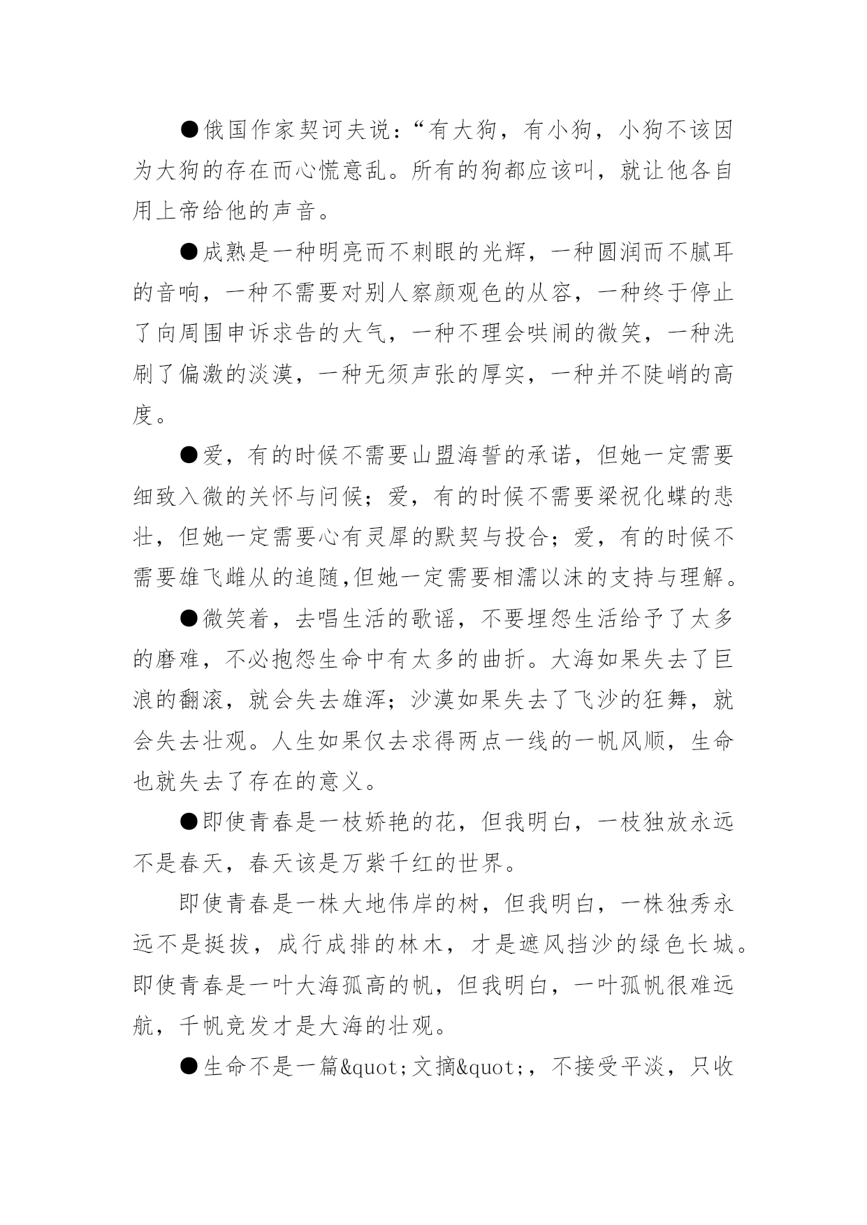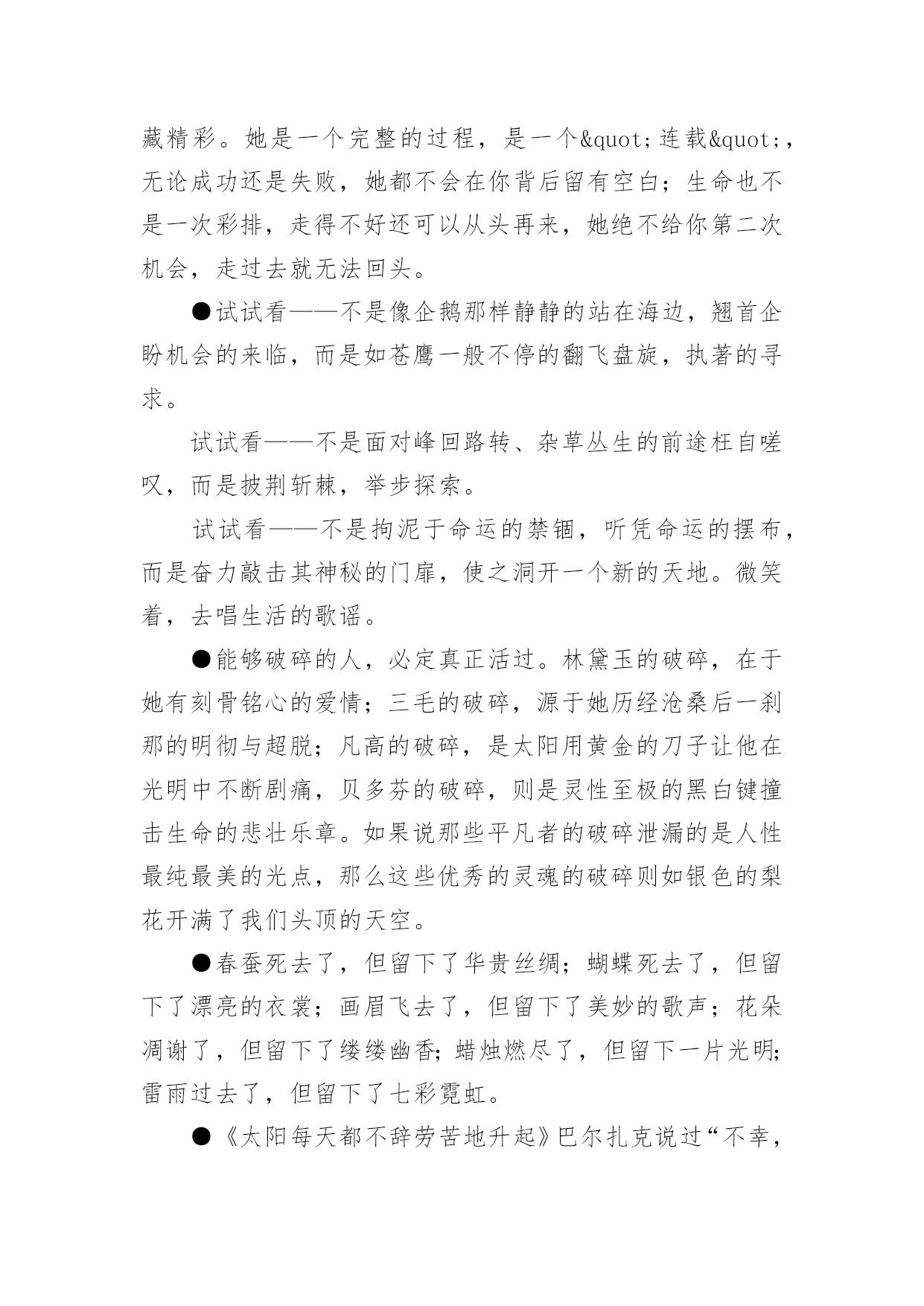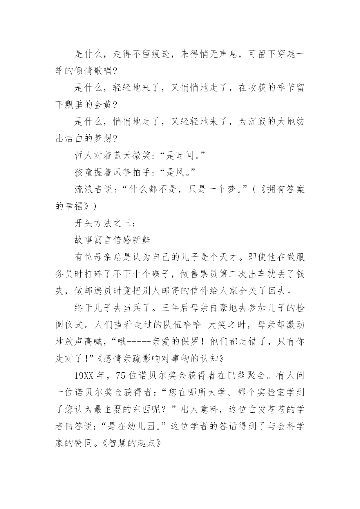高考作文素材高考作文素材大全开头方法之一:引用名言文采凸现如果事业中掺杂了感情因素那事业注定要不成功的;我们的公司的管理人员决于能长着相似的脸。心睛的时候,雨也是睛;心时候,睛也是雨。——汪国真哈姆莱特曾高呼:“人啊,看清你自己!”而我要说:“人啊,看清这个世界。”《2003年高考作文擦亮眼睛看世界》美学大师罗丹曾经说过:“美是到处都有的,对于我们的眼睛,不是缺少美,而是缺少发现。”《智慧的眼睛》马克吐温说过,“一只脚踩编了紫罗兰,它却把香味留在了你的脚上。这就是宽容。”《宽容,从这里开始》开头方法之二:排比点题铺排文气种子冲破岩层的禁锢影响;迎向光明;雄鹰风暴的阴遏影响,飞向云霄;骏马突破缰绳的束缚影响,奔驰原野;海燕则冲向更猛烈的暴风雨。《自由》是什么,来得悄无声息,走得不留痕迹,却激起所有色彩的轻舞飞扬?是什么,走得不留痕迹,来得悄无声息,可留下穿越一季的倾情歌唱?是什么,轻轻地来了,又悄悄地走了,在收获的季节留下飘垂的金黄?是什么,悄悄地走了,又轻轻地来了,为沉寂的大地纺出洁白的梦想?哲人对着蓝天微笑:“是时间。”孩童握着风筝拍手:“是风。”流浪者说:“什么都不是,只是一个梦。”(《拥有答案的幸福》)开头方法之三:故事寓言倍感新鲜有位母亲总是认为自己的儿子是个天才。即使他在做服务员时打碎了不下十个碟子,做售票员第二次出车就丢了钱夹,做邮递员时竟把别人邮寄的信件给人家全关了回去。终于儿子去当兵了。三年后母亲自豪地去参加儿子的检阅仪式。人们望着走过的队伍哈哈大笑之时,母亲却激动地放声高喊,“哦-----亲爱的保罗!他们都走错了,只有你走对了!”《感情亲疏影响对事物的认知》19XX年,75位诺贝尔奖金获得者在巴黎聚会。有人问一位诺贝尔奖金获得者:“您在哪所大学、哪个实验室学到了您认为最主要的东西呢?”出人意料,这位白发苍苍的学者回答说:“是在幼儿园。”这位学者的答话得到了与会科学家的赞同。《智慧的起点》开头方法之四:引用诗歌胜过空说我不去想是否能够成功/既然选择了远方/便只顾风雨兼程。—汪国《2002年高考作文心灵的选择》墙角的花!你孤芳自赏时天地便小了。—冰心你一会看我一会看云我觉得你看我时很远你看云时很近—《远和近》顾城万能凤头●青春是用意志的血滴和拼搏的汗水酿成的琼浆——历久弥香;青春是用不凋的希望和不灭的向往编织的彩虹——绚丽辉煌;青春是用永恒的执著和顽强的韧劲筑起的一道铜墙铁壁——固若金汤。●信念是巍巍大厦的栋梁,没有它,就只是一堆散乱的砖瓦;信念是滔滔大江的河床,没有它,就只有一片泛滥的波浪;信念是熊熊烈火的引星,没有它,就只有一把冰冷的柴把;信念是远洋巨轮的主机,没有它,就只剩下瘫痪的巨架。●站在历史的海岸漫溯那一道道历史沟渠:楚大夫沉吟泽畔,九死不悔;魏武帝扬鞭东指,壮心不已;陶渊明悠然南山,饮酒采菊……他们选择了永恒,纵然谄媚诬蔑视听,也不随其流扬其波,这是执著的选择;纵然马革裹尸,魂归狼烟,只是豪壮的选择;纵然一身清苦,终日难饱,也愿怡然自乐,躬耕陇亩,这是高雅的选择。在一番选择中,帝王将相成其盖世伟业,贤士迁客成其千古文章。●只有启程,才会到达理想和目的地,只有拼搏,才会获得辉煌的成功,只有播种,才会有收获。只有追求,才会品味堂堂正正的人。●如果说友谊是一颗常青树,那么,浇灌它的必定是出自心田的清泉;如果说友谊是一朵开不败的鲜花,那么,照耀它的必定是从心中升起的太阳,作文素材《高考作文素材梦想》。多少笑声都是友谊唤起的,多少眼泪都是友谊揩干的。友谊的港湾温情脉脉,友谊的清风灌满征帆。友谊不是感情的投资,它不需要股息和分红。(友谊可以换其他词语)●盈盈月光,我掬一杯最清的;落落余辉,我拥一缕最暖的;灼灼红叶,我拾一片最热的;萋萋芳草,我摘一束最灿的;漫漫人生,我要采撷世间最重的———毅力。●如果说生命是一座庄严的城堡,如果说生命是一株苍茂的大树,如果说生命是一只飞翔的海鸟。那么,信念就是那穹顶的梁柱,就是那深扎的树根,就是那扇动的翅膀。没有信念,生命的动力便荡然无存;没有信念,生命的美丽便杳然西去。(划线处可以换其他词语)●毅力,是千里大堤一沙一石的凝聚,一点点地累积,才有前不见头后不见尾的壮丽;毅力,是春蚕吐丝一缕一缕的环绕,一丝丝地坚持,才有破茧而出重见光明的辉煌;毅力,是远航的船的帆,有了帆,船才可以到达成功的彼岸。●爱心是一片照射在冬日的阳光,使贫病交迫的人感到人间的温暖;爱心是一泓出现在沙漠里的泉水,使濒临绝境的人重新看到生活的希望;爱心是一首飘荡在夜空的歌谣,使孤苦无依的人获得心灵的慰藉。●心的本色该是如此。成,如朗月照花,深潭微澜,不论顺逆,不论成败的超然,是扬鞭策马,登高临远的驿站;败,仍滴水穿石,汇流入海,有穷且益坚,不坠青云的傲岸,有“将相本无主,男儿当自强”的倔强。荣,江山依旧,