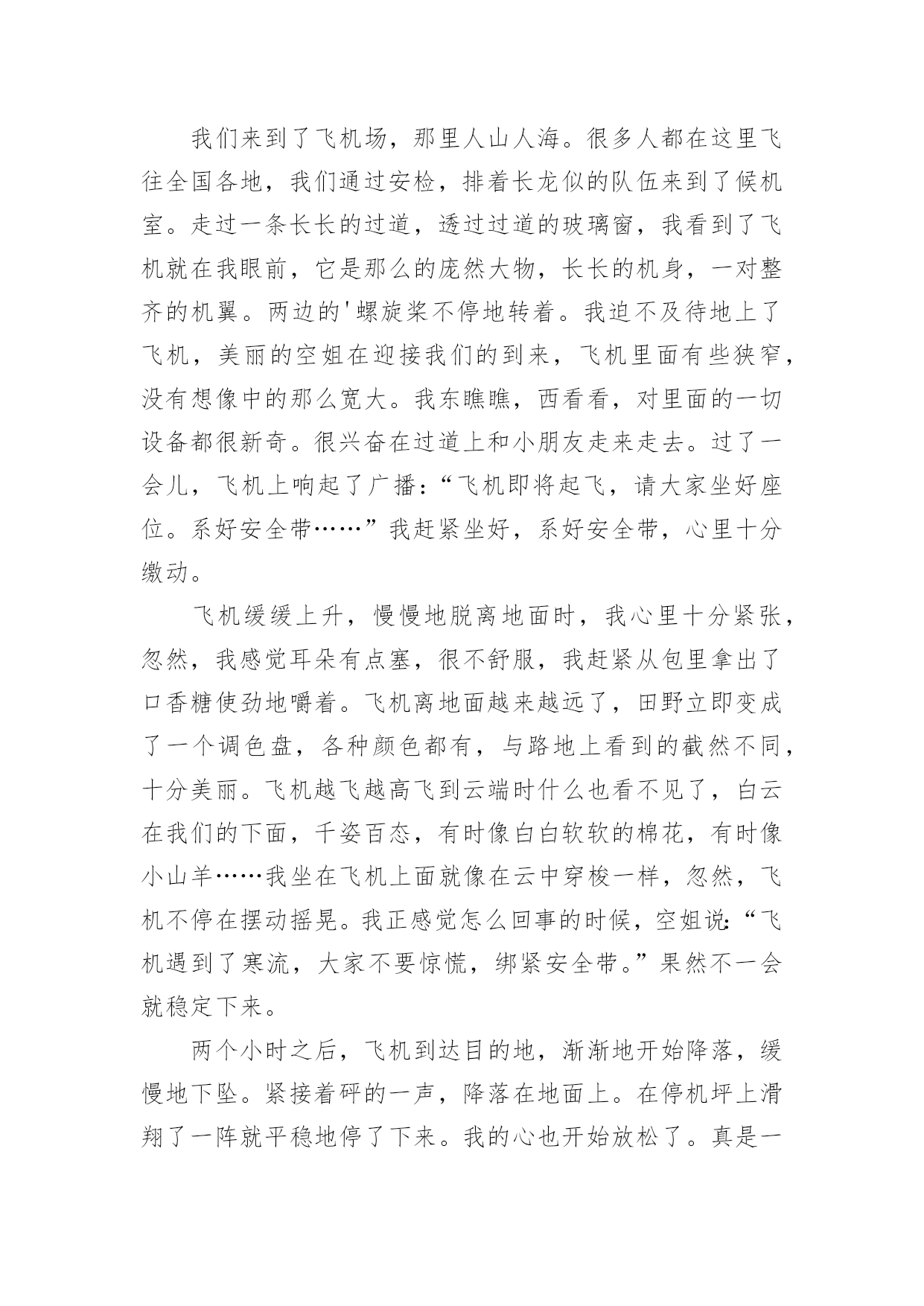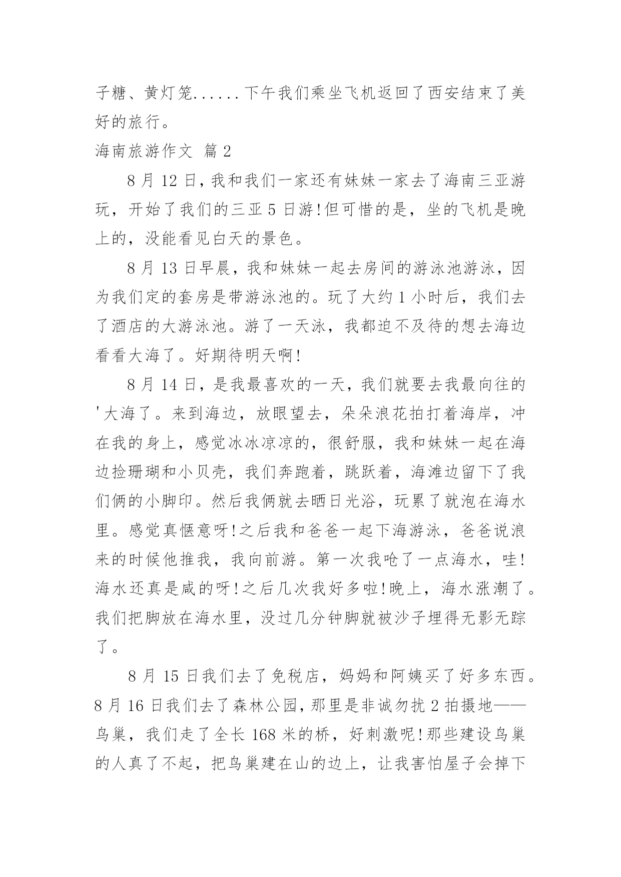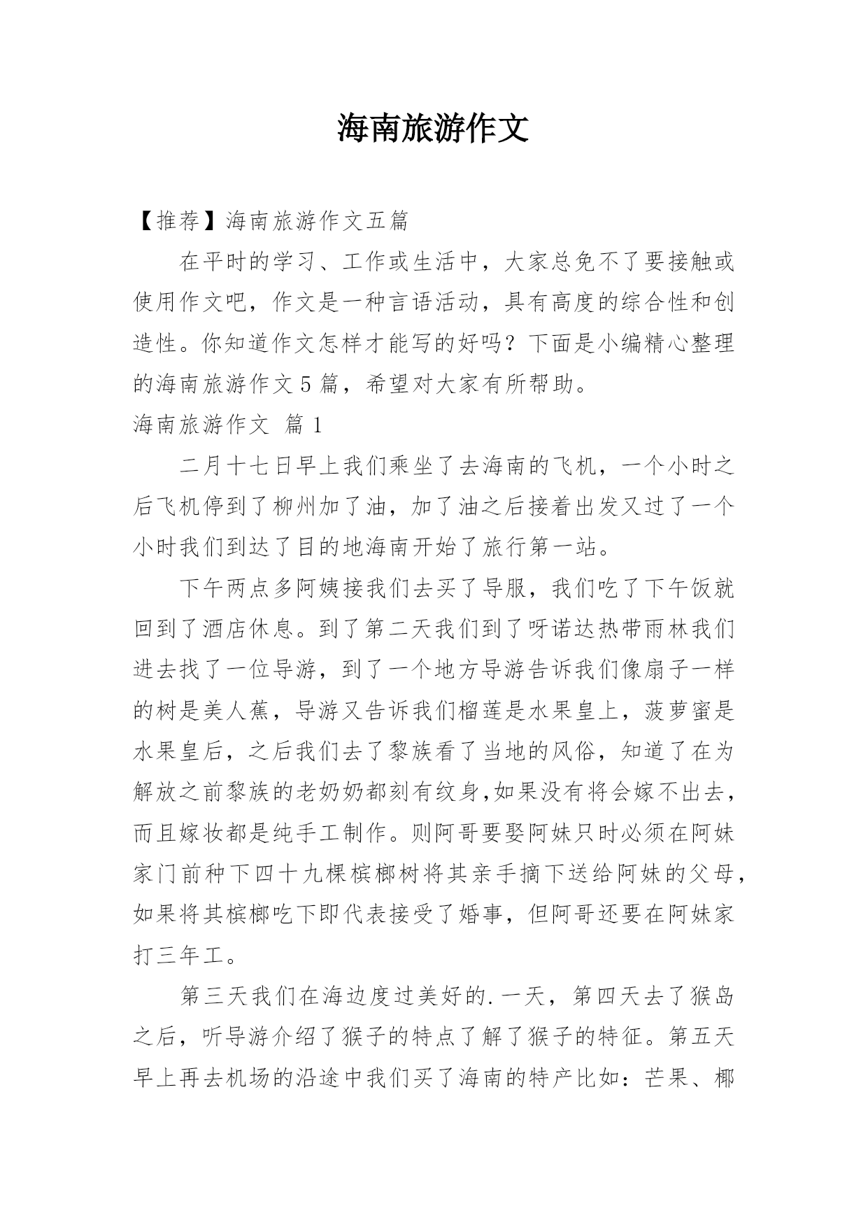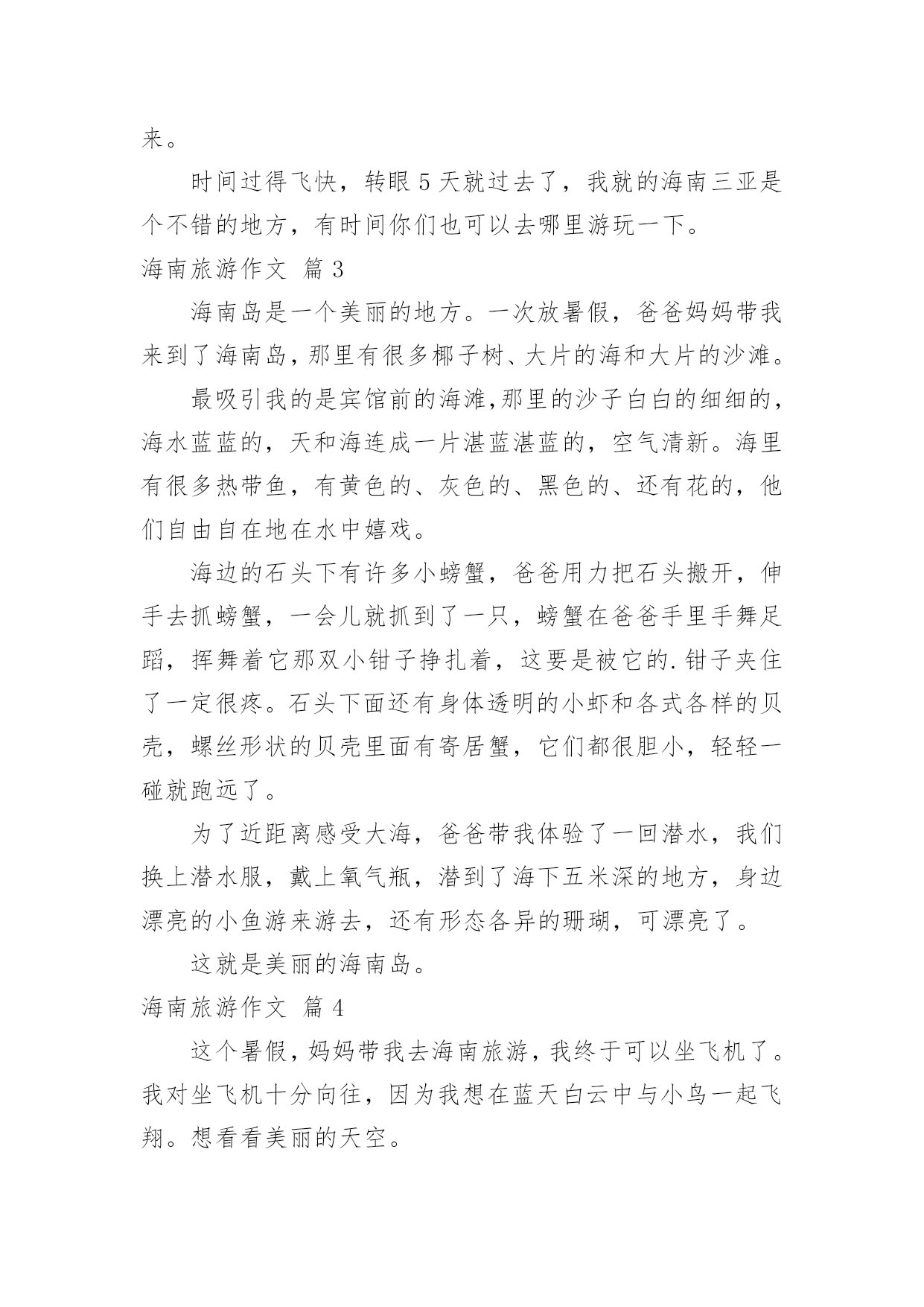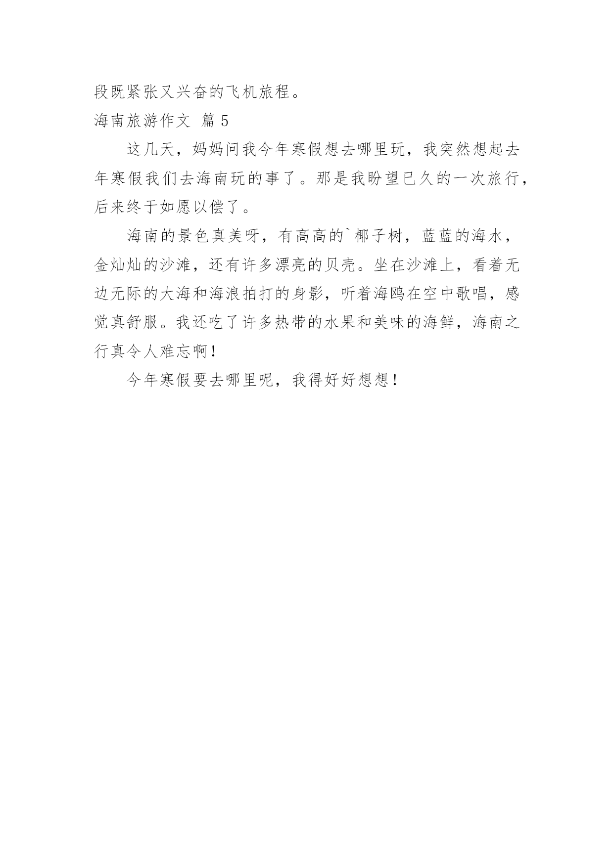 海南旅游作文【推荐】海南旅游作文五篇在平时的学习、工作或生活中,大家总免不了要接触或使用作文吧,作文是一种言语活动,具有高度的综合性和创造性。你知道作文怎样才能写的好吗?下面是小编精心整理的海南旅游作文5篇,希望对大家有所帮助。海南旅游作文篇1二月十七日早上我们乘坐了去海南的飞机,一个小时之后飞机停到了柳州加了油,加了油之后接着出发又过了一个小时我们到达了目的地海南开始了旅行第一站。下午两点多阿姨接我们去买了导服,我们吃了下午饭就回到了酒店休息。到了第二天我们到了呀诺达热带雨林我们进去找了一位导游,到了一个地方导游告诉我们像扇子一样的树是美人蕉,导游又告诉我们榴莲是水果皇上,菠萝蜜是水果皇后,之后我们去了黎族看了当地的风俗,知道了在为解放之前黎族的老奶奶都刻有纹身,如果没有将会嫁不出去,而且嫁妆都是纯手工制作。则阿哥要娶阿妹只时必须在阿妹家门前种下四十九棵槟榔树将其亲手摘下送给阿妹的父母,如果将其槟榔吃下即代表接受了婚事,但阿哥还要在阿妹家打三年工。第三天我们在海边度过美好的.一天,第四天去了猴岛之后,听导游介绍了猴子的特点了解了猴子的特征。第五天早上再去机场的沿途中我们买了海南的特产比如:芒果、椰子糖、黄灯笼......下午我们乘坐飞机返回了西安结束了美好的旅行。海南旅游作文篇28月12日,我和我们一家还有妹妹一家去了海南三亚游玩,开始了我们的三亚5日游!但可惜的是,坐的飞机是晚上的,没能看见白天的景色。8月13日早晨,我和妹妹一起去房间的游泳池游泳,因为我们定的套房是带游泳池的。玩了大约1小时后,我们去了酒店的大游泳池。游了一天泳,我都迫不及待的想去海边看看大海了。好期待明天啊!8月14日,是我最喜欢的一天,我们就要去我最向往的'大海了。来到海边,放眼望去,朵朵浪花拍打着海岸,冲在我的身上,感觉冰冰凉凉的,很舒服,我和妹妹一起在海边捡珊瑚和小贝壳,我们奔跑着,跳跃着,海滩边留下了我们俩的小脚印。然后我俩就去晒日光浴,玩累了就泡在海水里。感觉真惬意呀!之后我和爸爸一起下海游泳,爸爸说浪来的时候他推我,我向前游。第一次我呛了一点海水,哇!海水还真是咸的呀!之后几次我好多啦!晚上,海水涨潮了。我们把脚放在海水里,没过几分钟脚就被沙子埋得无影无踪了。8月15日我们去了免税店,妈妈和阿姨买了好多东西。8月16日我们去了森林公园,那里是非诚勿扰2拍摄地——鸟巢,我们走了全长168米的桥,好刺激呢!那些建设鸟巢的人真了不起,把鸟巢建在山的边上,让我害怕屋子会掉下来。时间过得飞快,转眼5天就过去了,我就的海南三亚是个不错的地方,有时间你们也可以去哪里游玩一下。海南旅游作文篇3海南岛是一个美丽的地方。一次放暑假,爸爸妈妈带我来到了海南岛,那里有很多椰子树、大片的海和大片的沙滩。最吸引我的是宾馆前的海滩,那里的沙子白白的细细的,海水蓝蓝的,天和海连成一片湛蓝湛蓝的,空气清新。海里有很多热带鱼,有黄色的、灰色的、黑色的、还有花的,他们自由自在地在水中嬉戏。海边的石头下有许多小螃蟹,爸爸用力把石头搬开,伸手去抓螃蟹,一会儿就抓到了一只,螃蟹在爸爸手里手舞足蹈,挥舞着它那双小钳子挣扎着,这要是被它的.钳子夹住了一定很疼。石头下面还有身体透明的小虾和各式各样的贝壳,螺丝形状的贝壳里面有寄居蟹,它们都很胆小,轻轻一碰就跑远了。为了近距离感受大海,爸爸带我体验了一回潜水,我们换上潜水服,戴上氧气瓶,潜到了海下五米深的地方,身边漂亮的小鱼游来游去,还有形态各异的珊瑚,可漂亮了。这就是美丽的海南岛。海南旅游作文篇4这个暑假,妈妈带我去海南旅游,我终于可以坐飞机了。我对坐飞机十分向往,因为我想在蓝天白云中与小鸟一起飞翔。想看看美丽的天空。我们来到了飞机场,那里人山人海。很多人都在这里飞往全国各地,我们通过安检,排着长龙似的队伍来到了候机室。走过一条长长的过道,透过过道的玻璃窗,我看到了飞机就在我眼前,它是那么的庞然大物,长长的机身,一对整齐的机翼。两边的'螺旋桨不停地转着。我迫不及待地上了飞机,美丽的空姐在迎接我们的到来,飞机里面有些狭窄,没有想像中的那么宽大。我东瞧瞧,西看看,对里面的一切设备都很新奇。很兴奋在过道上和小朋友走来走去。过了一会儿,飞机上响起了广播:“飞机即将起飞,请大家坐好座位。系好安全带……”我赶紧坐好,系好安全带,心里十分缴动。飞机缓缓上升,慢慢地脱离地面时,我心里十分紧张,忽然,我感觉耳朵有点塞,很不舒服,我赶紧从包里拿出了口香糖使劲地嚼着。飞机离地面越来越远了,田野立即变成了一个调色盘,各种颜色都有,与路地上看到的截然不同,十分美丽。飞机越飞越高飞到云端时什么也看不见了,白云在我们的下面,千姿百态,有时像白白软软的棉花,有时像小山羊……我坐在飞机上面就像在云中穿梭一样,忽然,飞机不停在摆动摇晃。我正感觉怎么回事的时候,空姐说:“飞