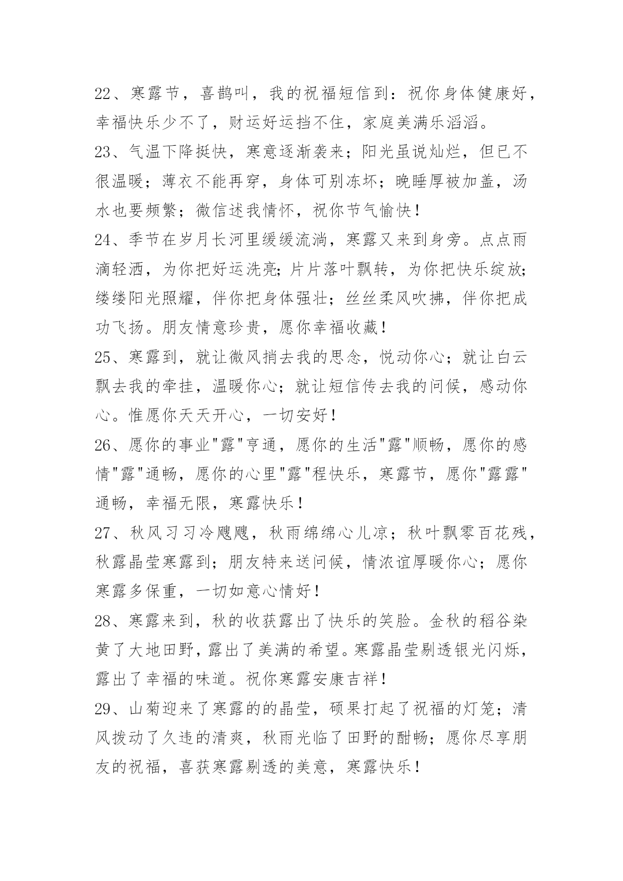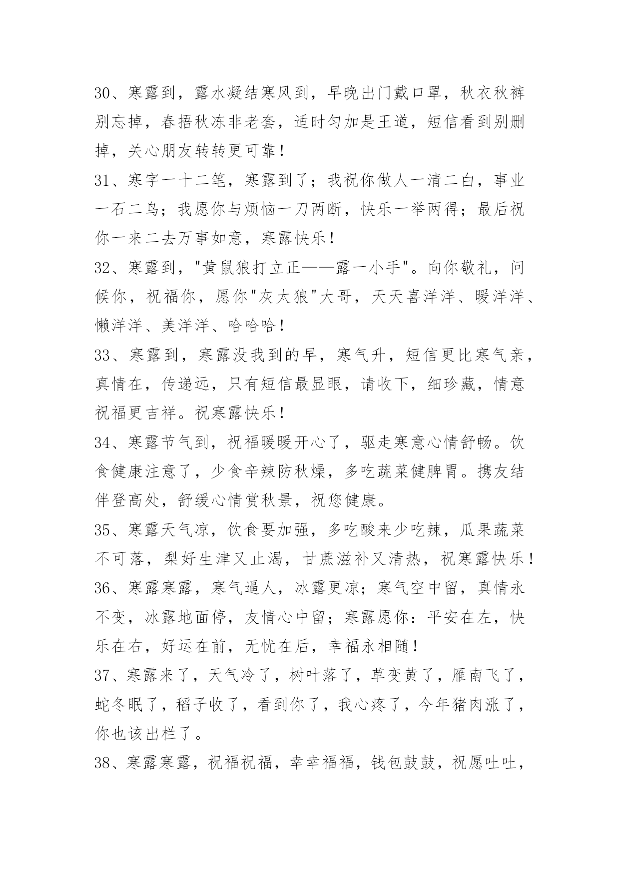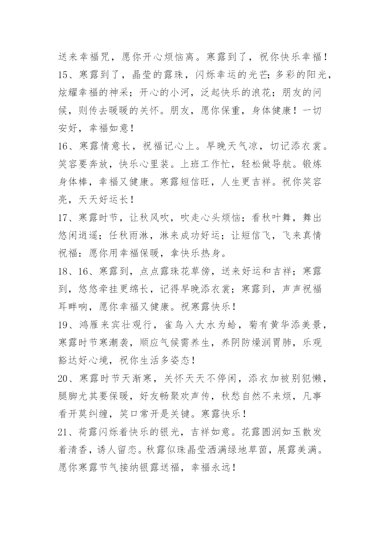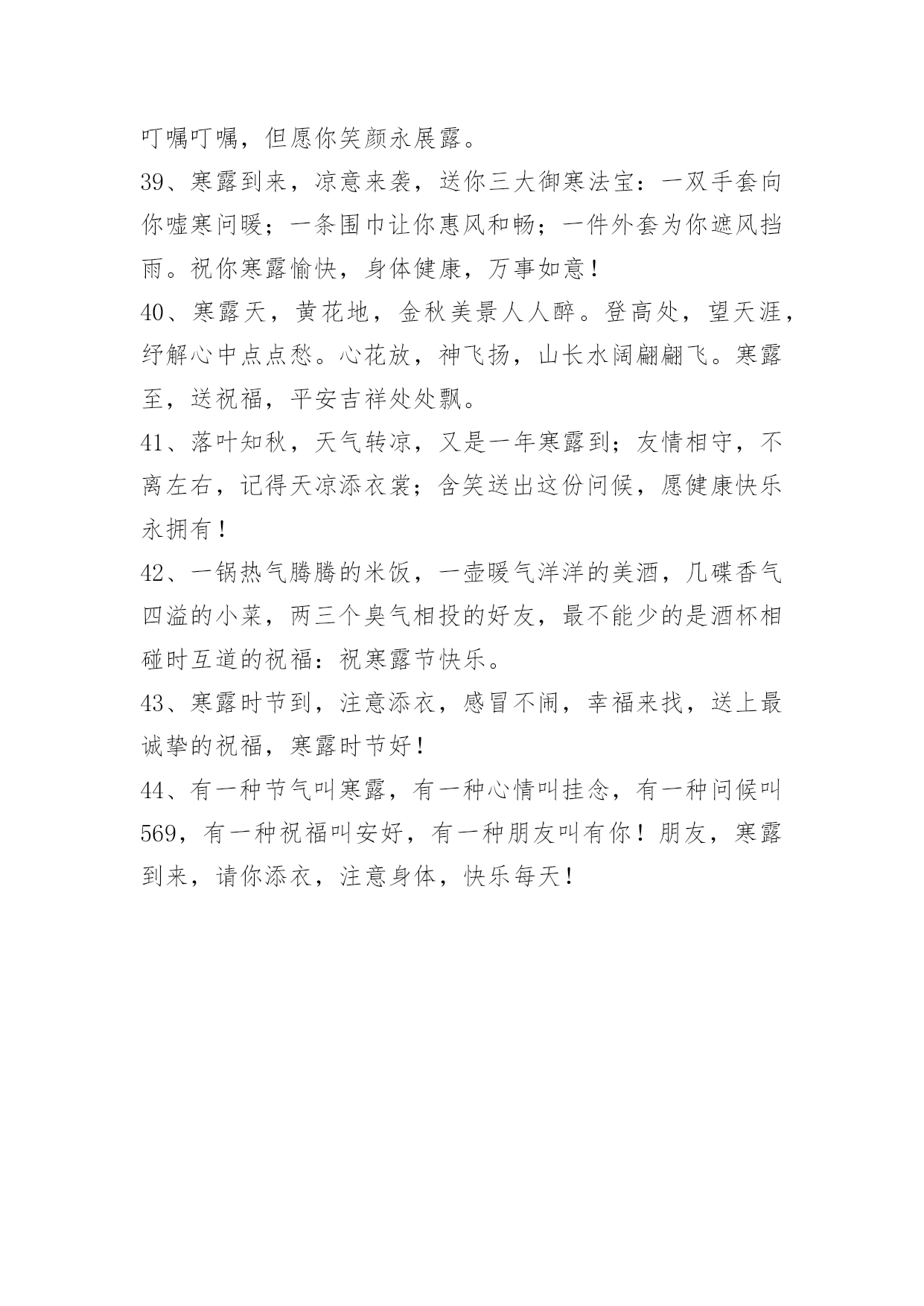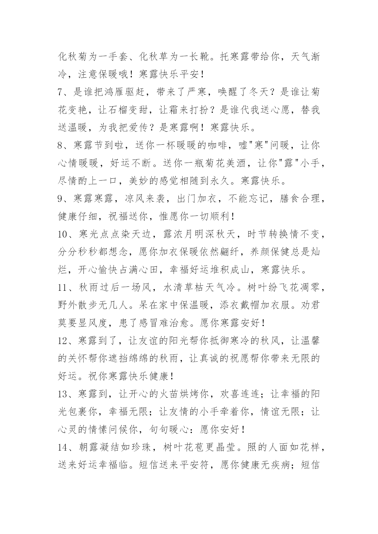 寒露问候语44条寒露问候语锦集44条短信价值是轻度的,祝福情意是重度的,天气寒冷是轻度的,你的快乐是重度的,距离遥远是轻度的,送的关心的重度的,寒露来了,注意保暖。下面是小编给各位读者分享的寒露问候语44条,欢迎阅读。1、寒意入晚秋,露重夜更凉,添衣又添被,要把感冒防,愿得健康人,一生莫相忘。亲爱的,寒露至,天转凉,注意防寒保暖。寒露快乐!2、以问候为礼,为你奉上绵绵关怀;以真诚的心,给你传递深深思念;以文字喻情,为你谱写点点挂念;以快乐为愿,祝你天天快乐,降温多添衣!3、寒露到到到,温度又降了,冻走烦恼,冷跑忙碌,凝聚快乐,开怀大笑,让成功伴你每一天,让好运陪你每一秒,从此幸福把你绕,愿你健康直到老,日子更美妙。4、秋雁当头叫,必有大风到,晚稻就怕霜来早。寒露早,立冬迟,霜降收薯正适宜。棉是秋后草,就怕霜来早。霜降农谚,经典回味,与人分享,智慧一生。5、寒露时节寒意至,露寒霜冷空山静;一衣一裤把体护,勤加运动体魄强;水果蔬菜不能少,多喝开水无病扰;饮食均匀睡眠足,精神积极心开朗;短信相思把情传,愿你快乐体健安。寒露快乐!6、化秋阳为一顶帽、化秋风为一件衣、化秋雨为一围巾、化秋菊为一手套、化秋草为一长靴。托寒露带给你,天气渐冷,注意保暖哦!寒露快乐平安!7、是谁把鸿雁驱赶,带来了严寒,唤醒了冬天?是谁让菊花变艳,让石榴变甜,让霜来打扮?是谁代我送心愿,替我送温暖,为我把爱传?是寒露啊!寒露快乐。8、寒露节到啦,送你一杯暖暖的咖啡,嘘"寒"问暖,让你心情暖暖,好运不断。送你一瓶菊花美酒,让你"露"小手,尽情酌上一口,美妙的感觉相随到永久。寒露快乐。9、寒露寒露,凉风来袭,出门加衣,不能忘记,膳食合理,健康仔细,祝福送你,惟愿你一切顺利!10、寒光点点染天边,露浓月明深秋天,时节转换情不变,分分秒秒都想念,愿你加衣保暖依然翩纤,养颜保健总是灿烂,开心愉快占满心田,幸福好运堆积成山,寒露快乐。11、秋雨过后一场风,水清草枯天气冷。树叶纷飞花凋零,野外散步无几人。呆在家中保温暖,添衣戴帽加衣服。劝君莫要显风度,患了感冒难治愈。愿你寒露安好!12、寒露到了,让友谊的阳光帮你抵御寒冷的秋风,让温馨的关怀帮你遮挡绵绵的秋雨,让真诚的祝愿帮你带来无限的好运。祝你寒露快乐健康!13、寒露到,让开心的火苗烘烤你,欢喜连连;让幸福的阳光包裹你,幸福无限;让友情的小手牵着你,情谊无限;让心灵的情愫问候你,句句暖心:愿你安好!14、朝露凝结如珍珠,树叶花苞更晶莹。照的人面如花样,送来好运幸福临。短信送来平安符,愿你健康无疾病;短信送来幸福咒,愿你开心烦恼离。寒露到了,祝你快乐幸福!15、寒露到了,晶莹的露珠,闪烁幸运的光芒;多彩的阳光,炫耀幸福的神采;开心的小河,泛起快乐的浪花;朋友的问候,则传去暖暖的关怀。朋友,愿你保重,身体健康!一切安好,幸福如意!16、寒露情意长,祝福记心上。早晚天气凉,切记添衣裳。笑容要奔放,快乐心里装。上班工作忙,轻松做导航。锻炼身体棒,幸福又健康。寒露短信旺,人生更吉祥。祝你笑容亮,天天好运长!17、寒露时节,让秋风吹,吹走心头烦恼;看秋叶舞,舞出悠闲逍遥;任秋雨淋,淋来成功好运;让短信飞,飞来真情祝福:愿你用幸福保暖,拿快乐热身。18、16、寒露到,点点露珠花草傍,送来好运和吉祥;寒露到,悠悠牵挂更绵长,记得早晚添衣裳;寒露到,声声祝福耳畔响,愿你幸福又健康。祝寒露快乐!19、鸿雁来宾壮观行,雀鸟入大水为蛤,菊有黄华添美景,寒露时节寒潮袭,顺应气候需养生,养阴防燥润胃肺,乐观豁达好心境,祝你生活多姿态!20、寒露时节天渐寒,关怀天天不停闲,添衣加被别犯懒,腿脚尤其要保暖,好友畅聚欢声传,秋愁自然不来烦,凡事看开莫纠缠,笑口常开是关键。寒露快乐!21、荷露闪烁着快乐的银光,吉祥如意。花露圆润如玉散发着清香,诱人留恋。秋露似珠晶莹洒满绿地草茵,展露美满。愿你寒露节气接纳银露送福,幸福永远!22、寒露节,喜鹊叫,我的祝福短信到:祝你身体健康好,幸福快乐少不了,财运好运挡不住,家庭美满乐滔滔。23、气温下降挺快,寒意逐渐袭来;阳光虽说灿烂,但已不很温暖;薄衣不能再穿,身体可别冻坏;晚睡厚被加盖,汤水也要频繁;微信述我情怀,祝你节气愉快!24、季节在岁月长河里缓缓流淌,寒露又来到身旁。点点雨滴轻洒,为你把好运洗亮;片片落叶飘转,为你把快乐绽放;缕缕阳光照耀,伴你把身体强壮;丝丝柔风吹拂,伴你把成功飞扬。朋友情意珍贵,愿你幸福收藏!25、寒露到,就让微风捎去我的思念,悦动你心;就让白云飘去我的牵挂,温暖你心;就让短信传去我的问候,感动你心。惟愿你天天开心,一切安好!26、愿你的事业"露"亨通,愿你的生活"露"顺畅,愿你的感情"露"通畅,愿你的心里"露"程快乐,寒露节,愿你"露露"通畅,幸福无限,寒露快乐!27、秋风习习冷飕飕,秋