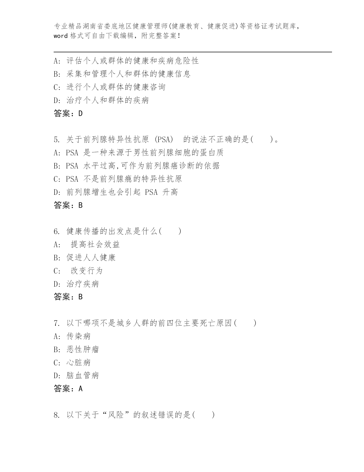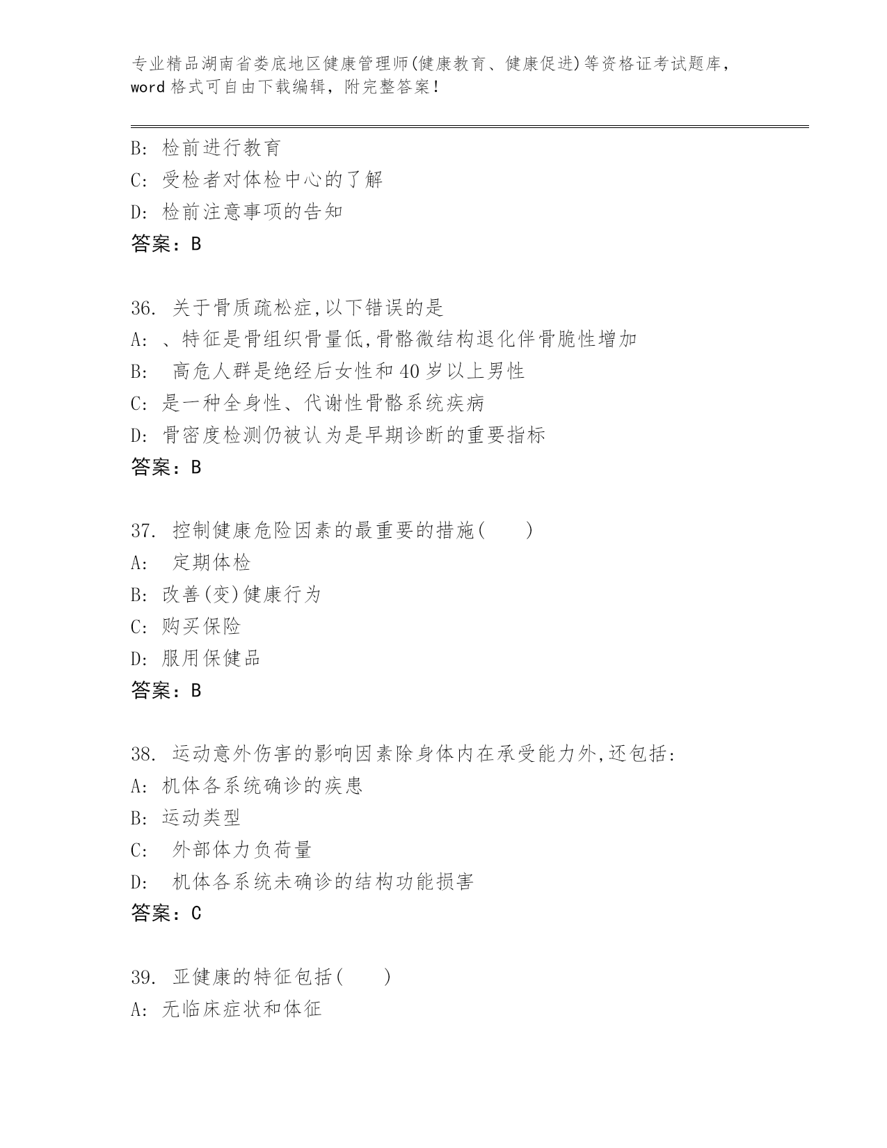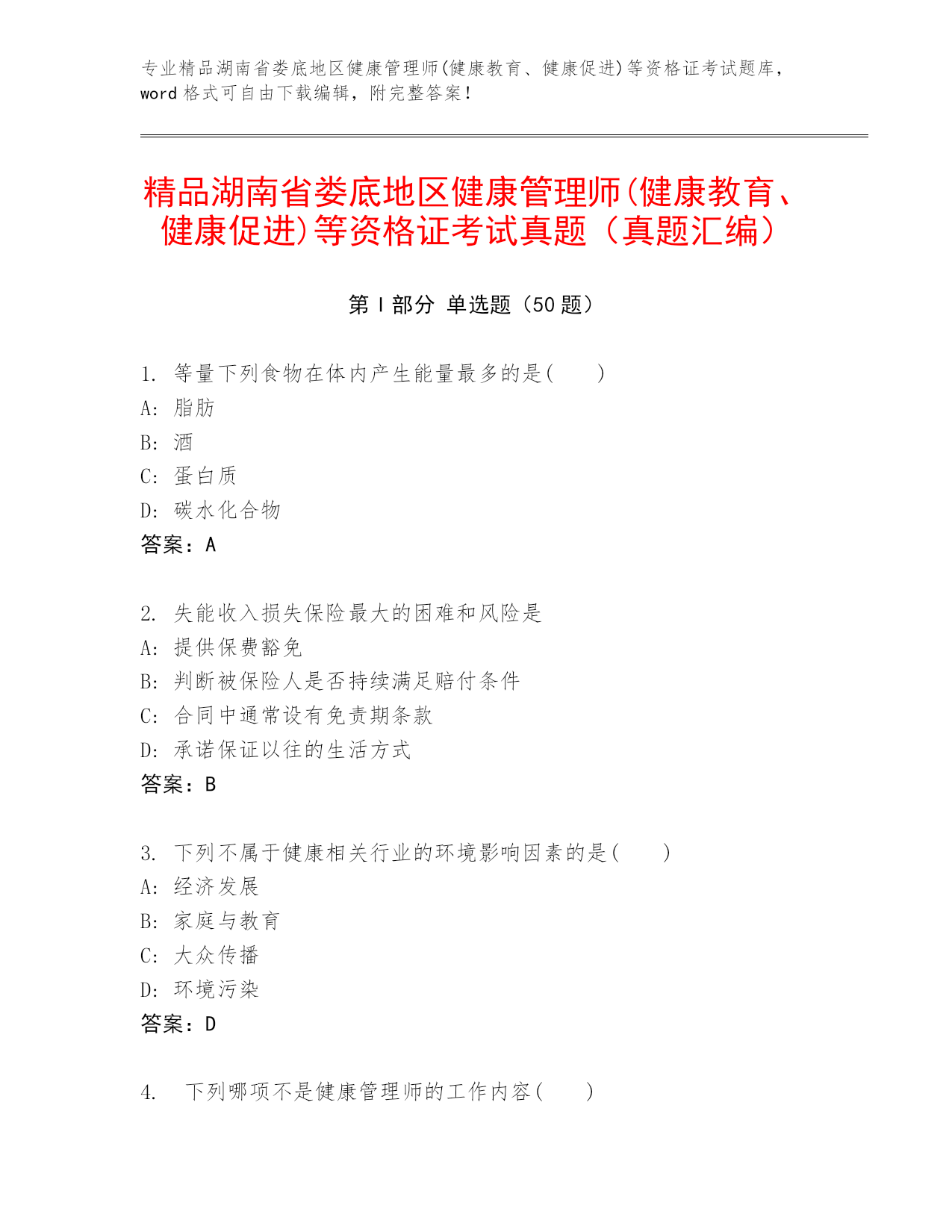 精品湖南省娄底地区健康管理师(健康教育、健康促进)等资格证考试真题(真题汇编).docx