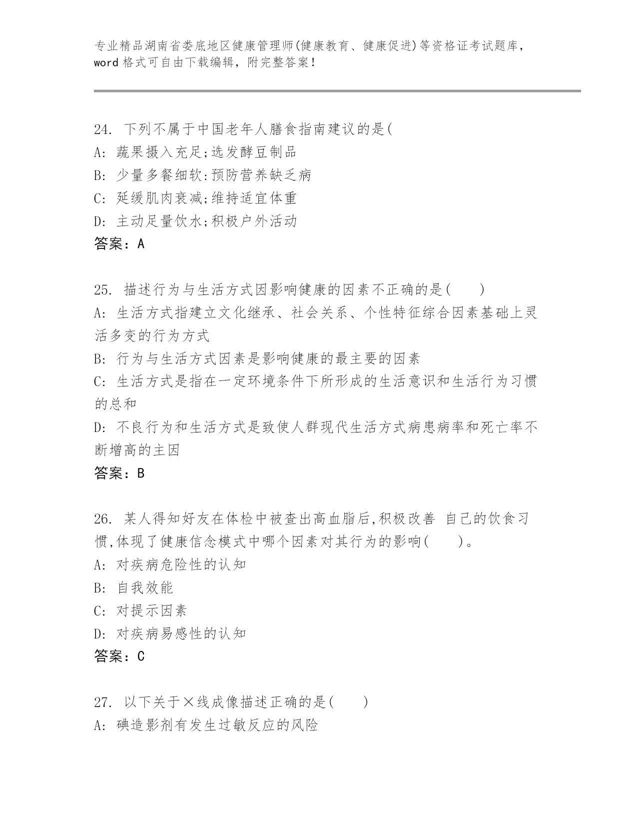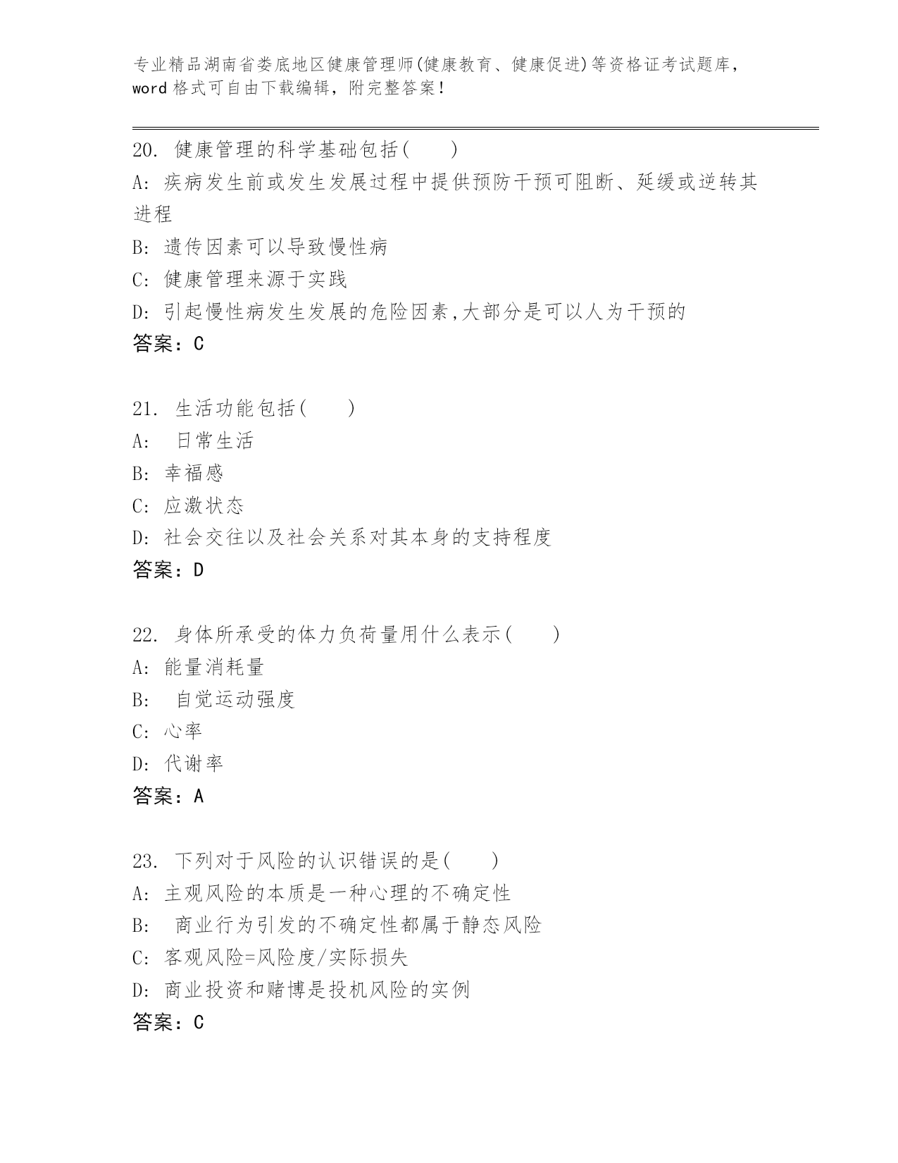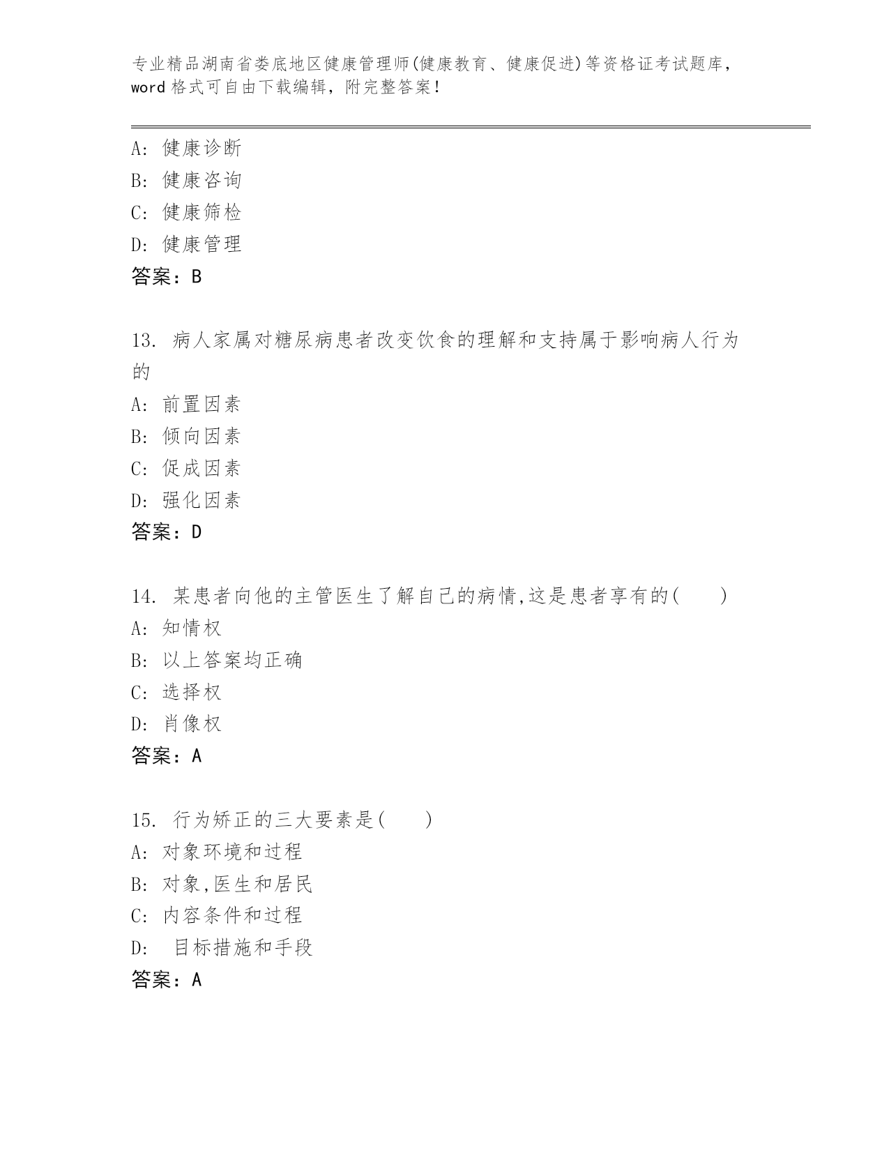 精品湖南省娄底地区健康管理师(健康教育、健康促进)等资格证考试真题(真题汇编)